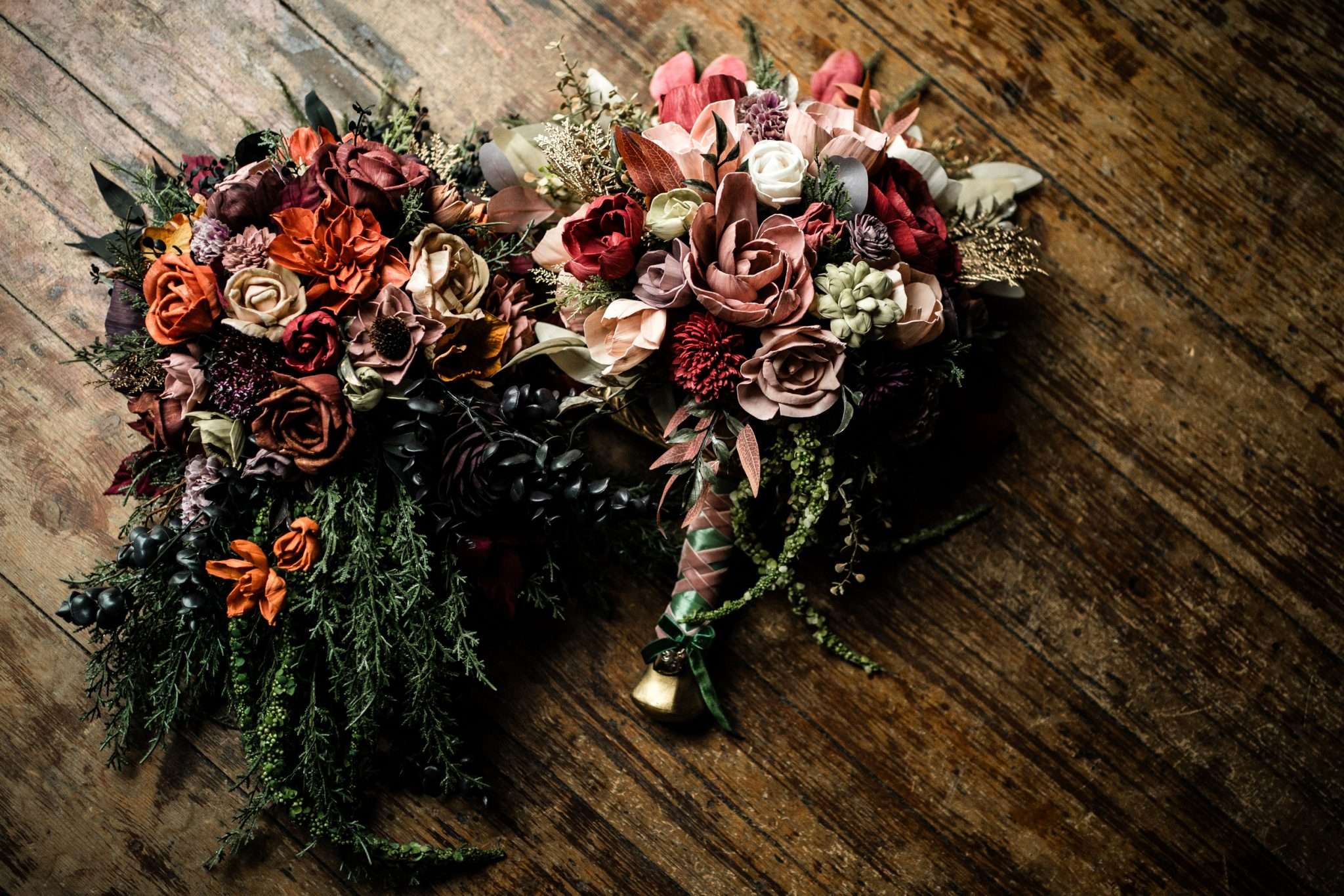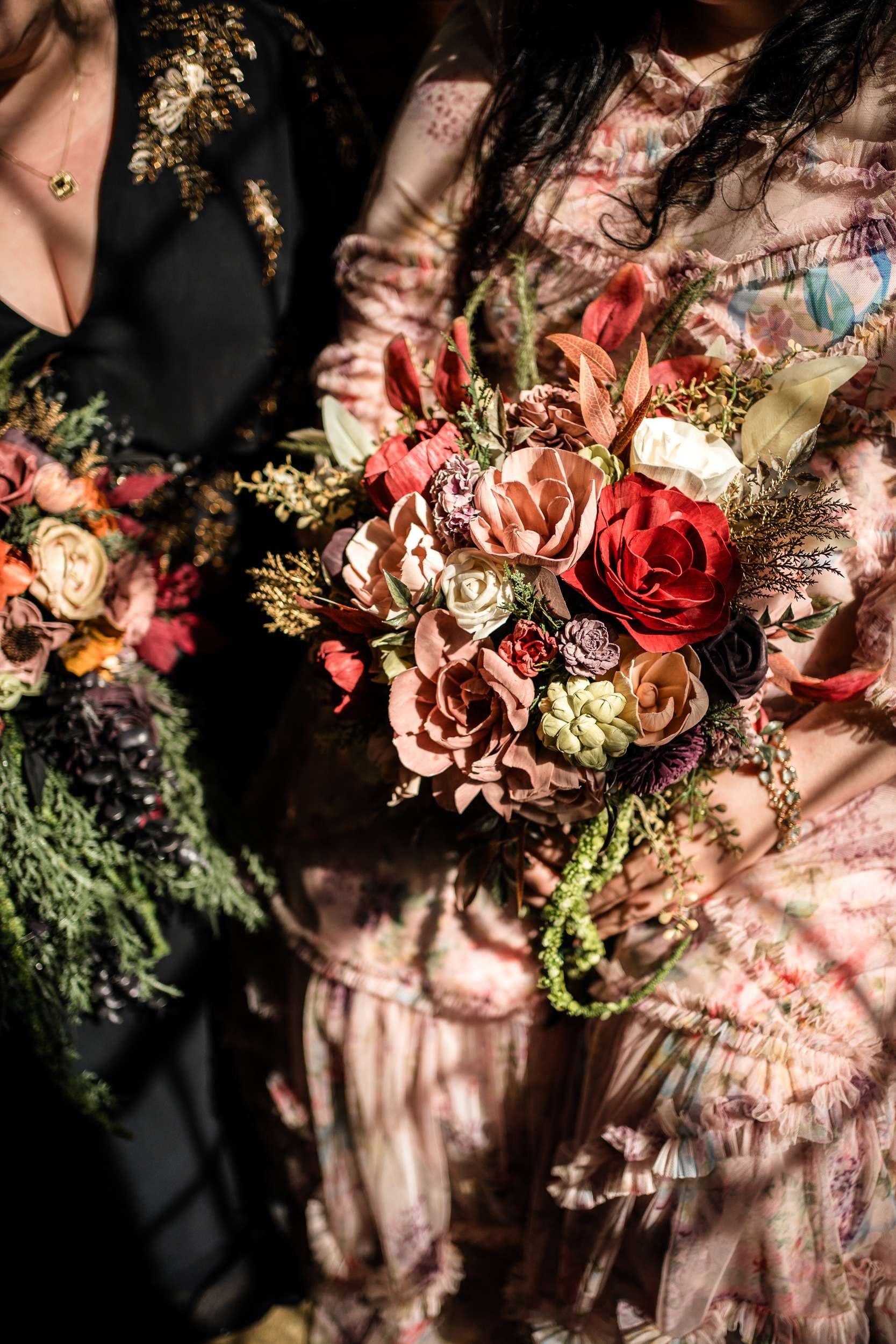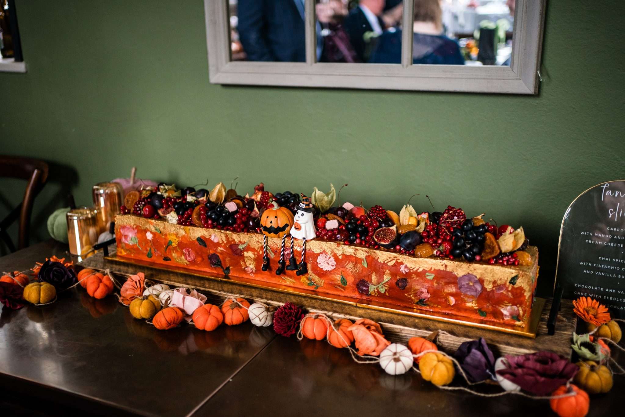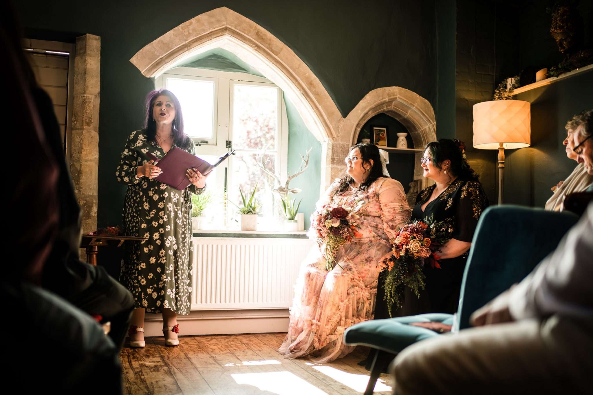“We took a lot of guidance from our celebrant for the ceremony”, Cally told us. “We knew we didn’t want traditional vows, but Sarah really steered us towards a story style with readings, a speech from my mum, and handfasting ceremony with a very special handfasting cord crocheted by my grandmother (now an item we’ll treasure forever). We’re laid back, cosy and quiet as a couple so we just let her take the lead on structure and what we were comfortable with.” After the ceremony came a confetti toss which was made from dried flower petals and leaves that came from places they’d been together or flowers they’d sent each other over the years.