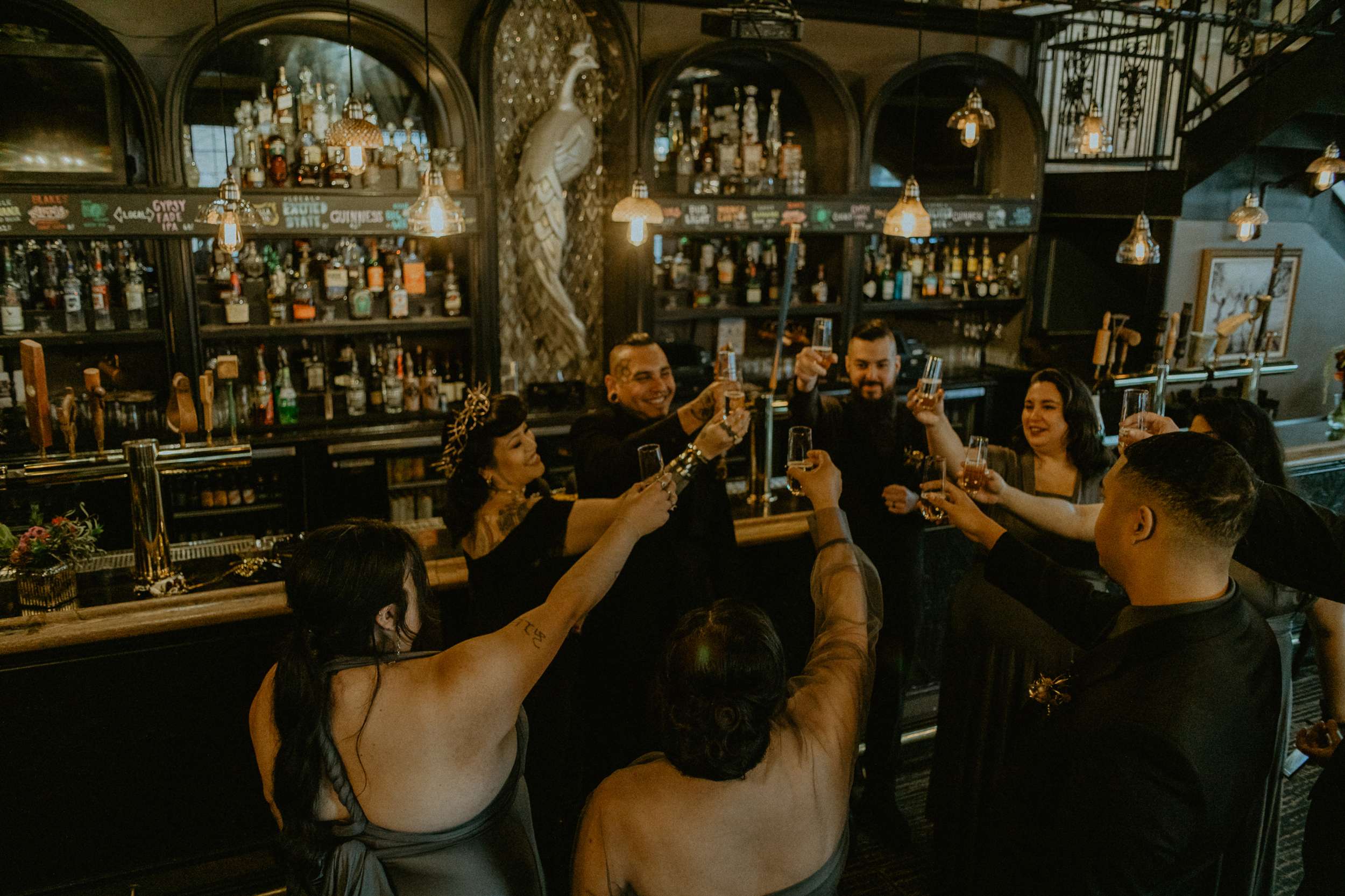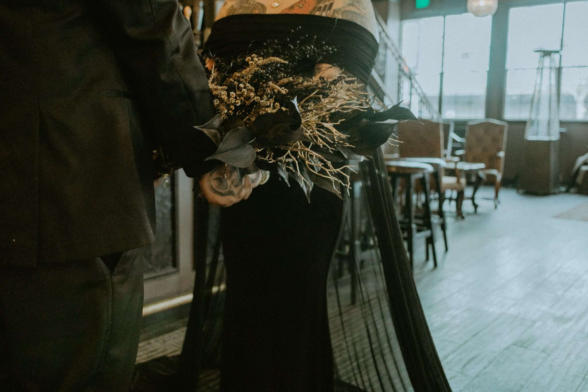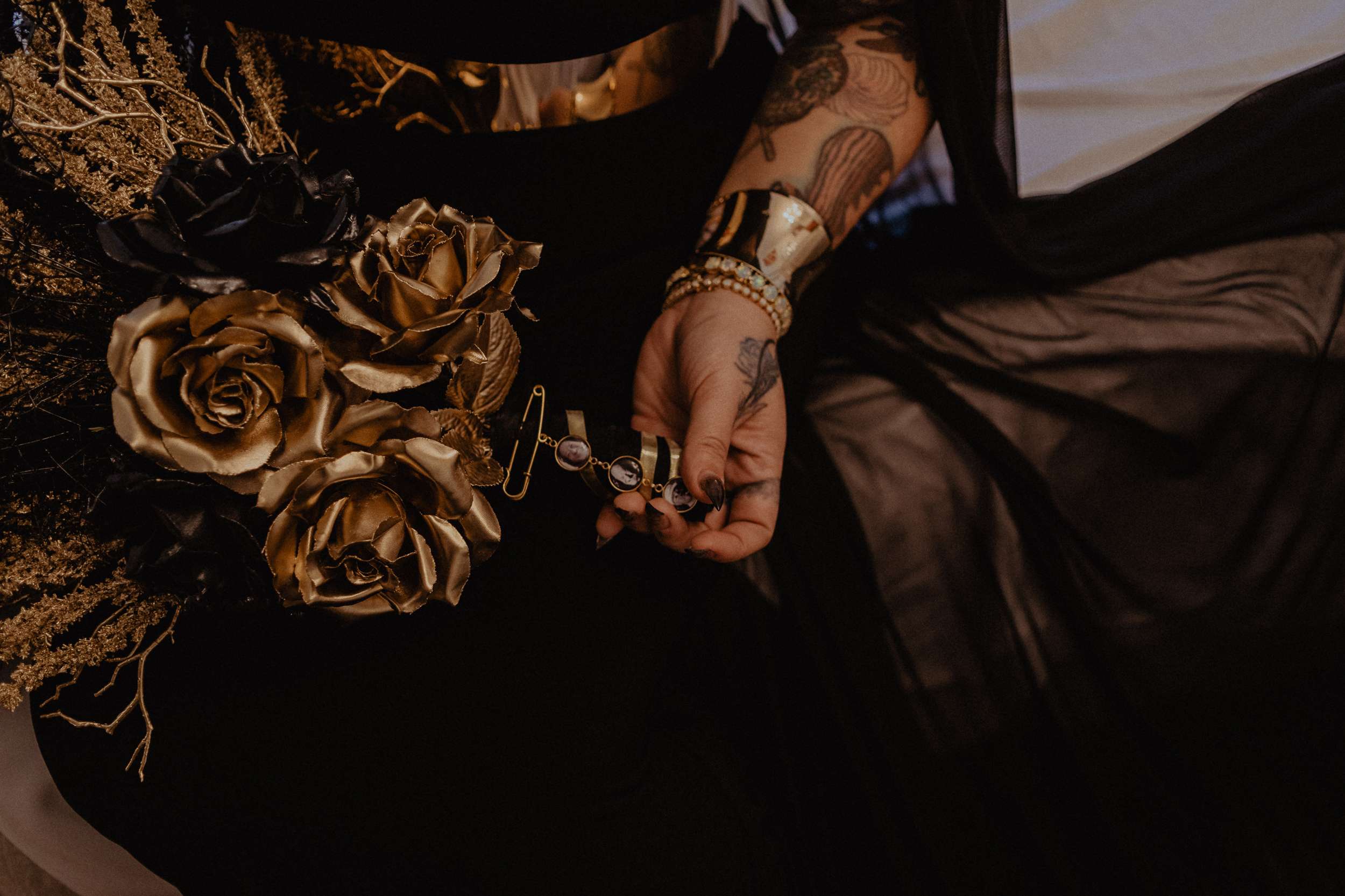 Hellbent Hitchings coordinated the day, allowing the couple to arrive without stress and really enjoy the experience. Trusting someone else with the details did not come easily to the self confessed Type A bride, but hiring them was the best decision. They could handle the logistics, while the couple could focus on the DIY and their outfits. “One of the best parts of wedding planning was all the DIY projects”, she explained. “From the moment we we became engaged, we started crafting! Our invitations were severed fingers made of wax with a ribbon tied on it – which actually catapulted us into starting our own CBD infused candle company. I also made my bridesmaids proposal boxes and after my bouquet came in destroyed after traveling overseas, my husband helped me salvage it and spray painted all the flowers we bought from Michaels.”