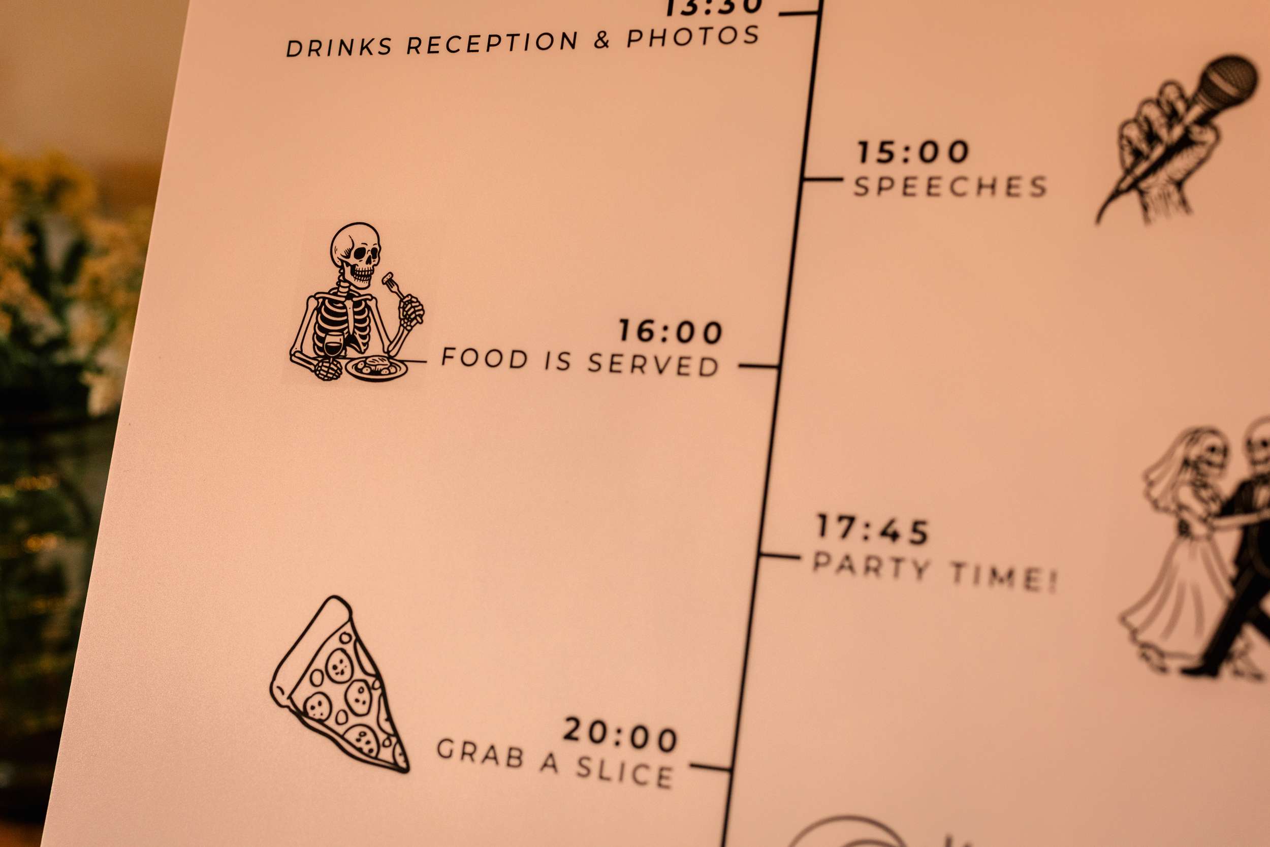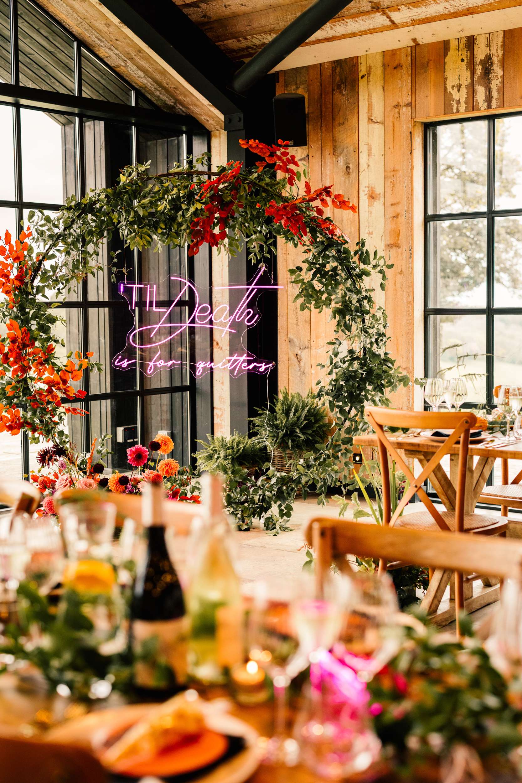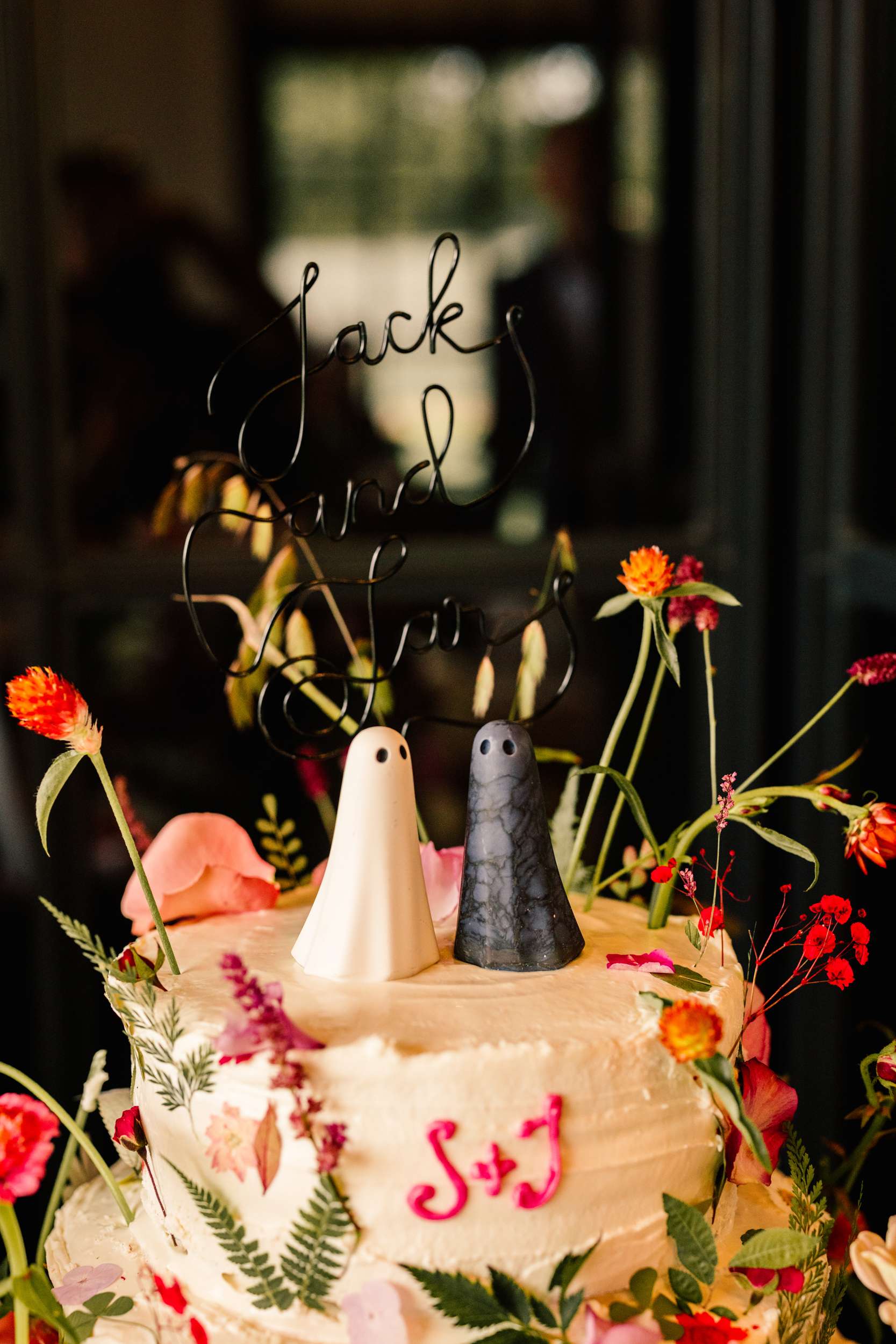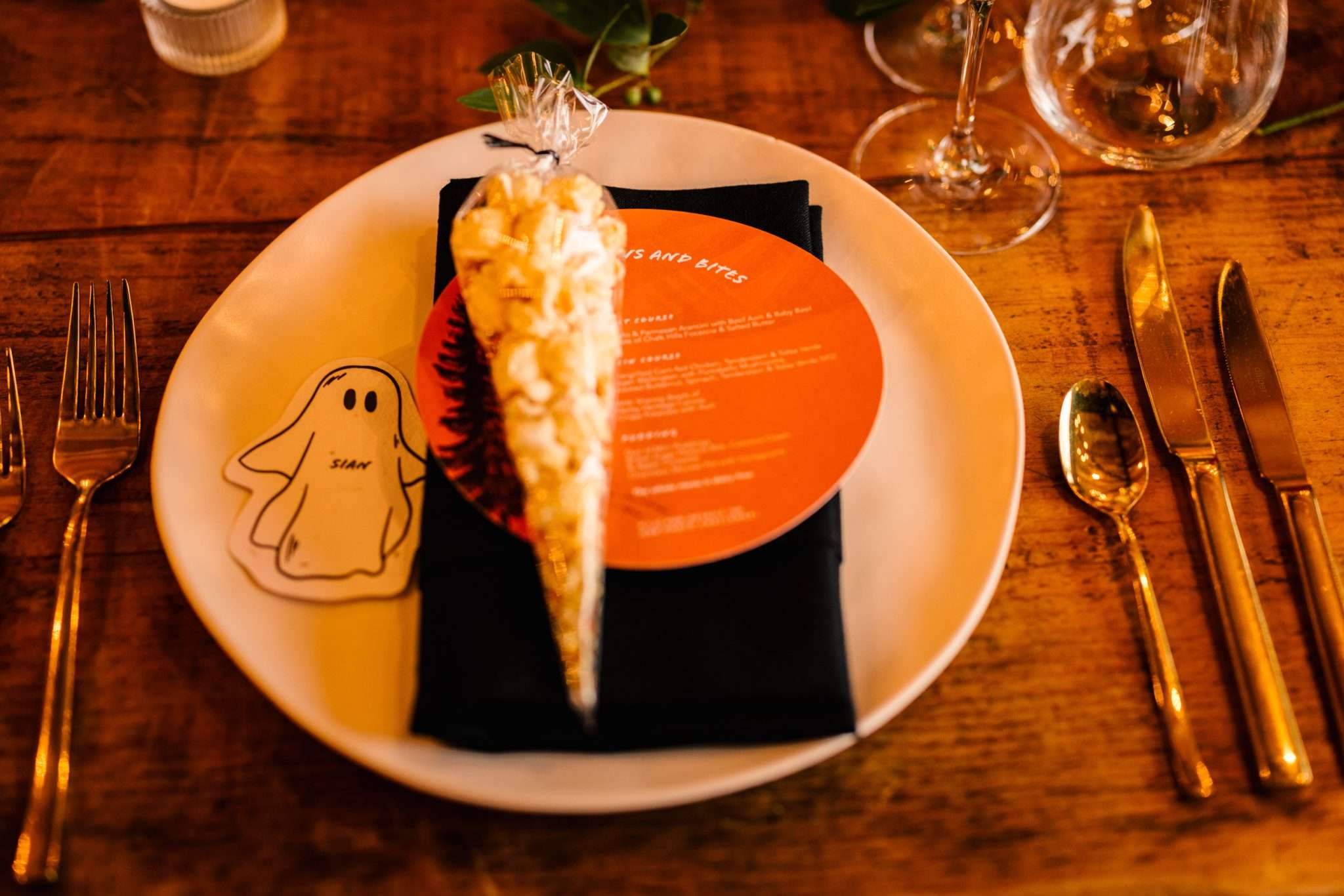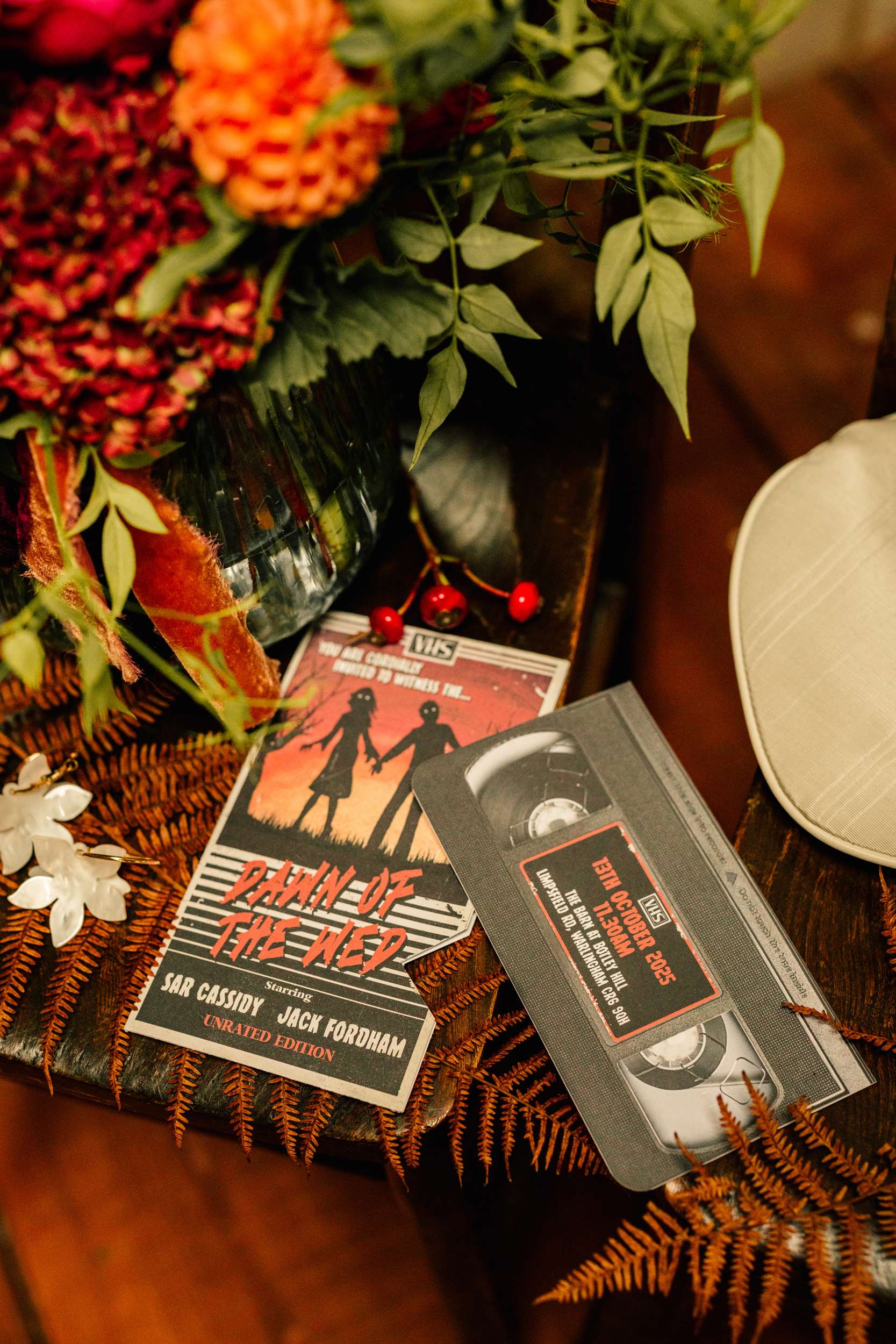 Sar and Jack’s September wedding pulled together autumn vibes with spooky 80s and 90s pop culture references. They wanted it to feel elegant rather than a Halloween themed costume party.