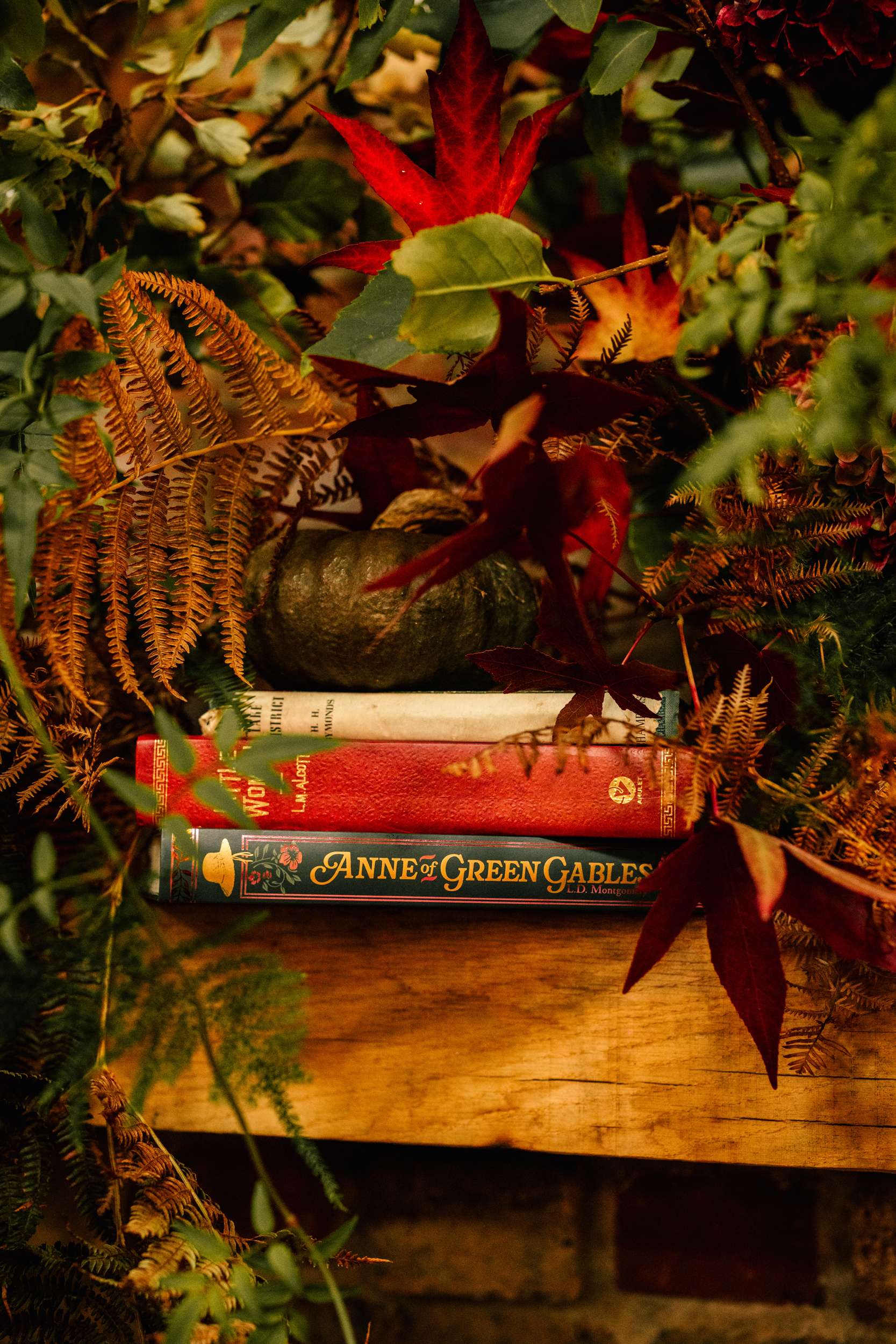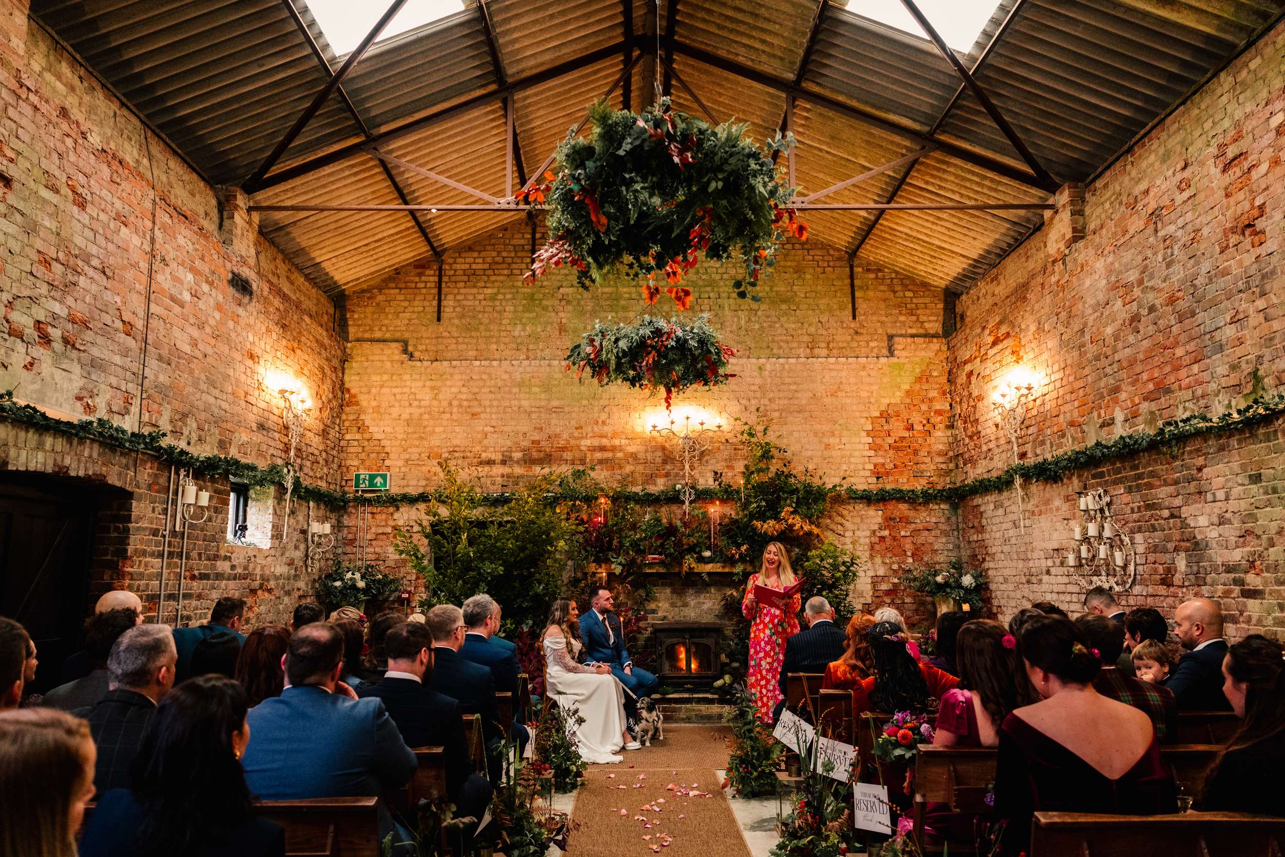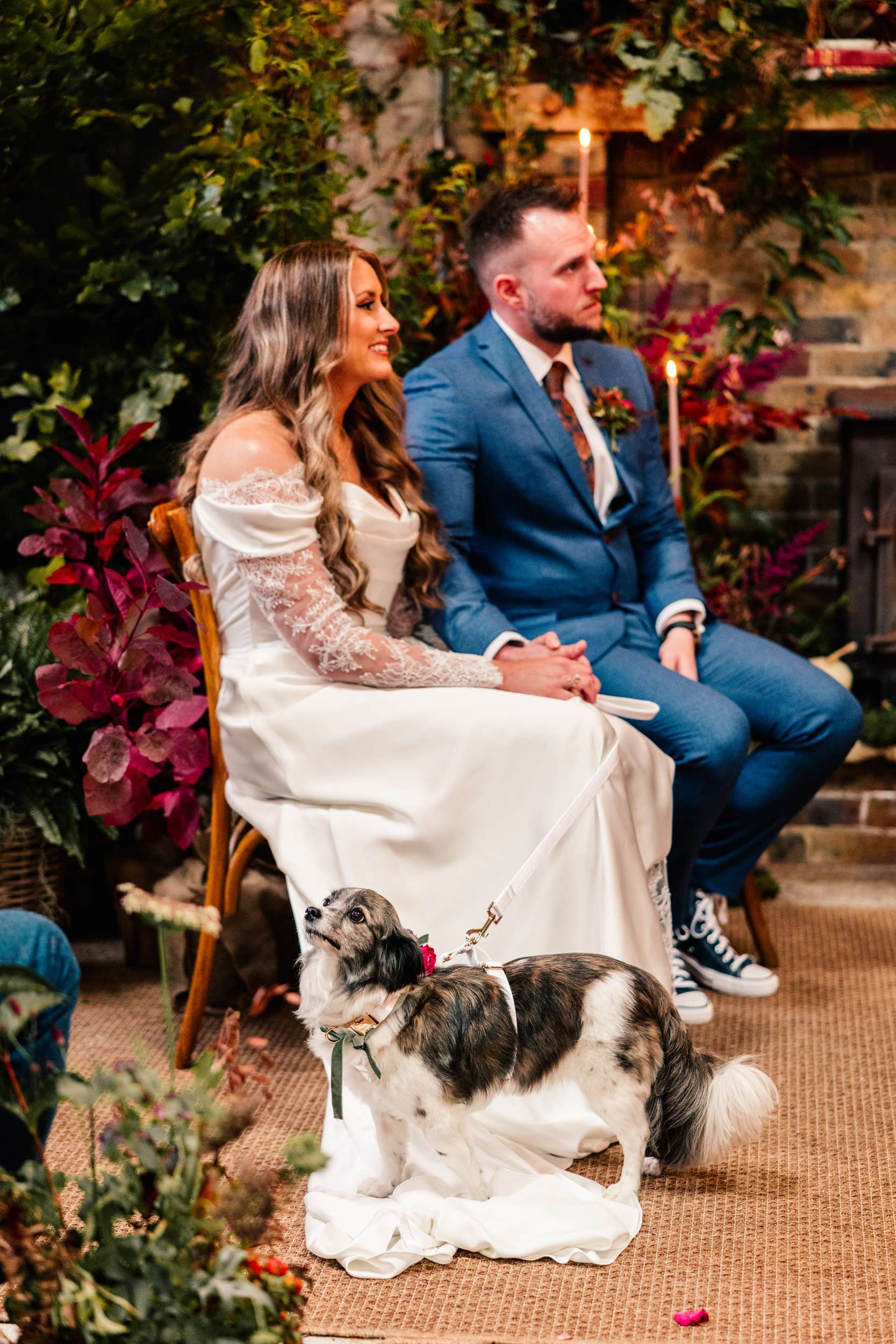 The ceremony space was built to feel immersive and full of florals, greenery, pumpkins, candles and and well-worn novels surrounding a lit fireplace. Their florist transformed the barn into something that more closely resembled a forest clearing. Guests arrived as starting Concerning Hobbits played. Sar then walked down the aisle with her dad and their dog, Rocket, to Test Drive from How to Train Your Dragon.