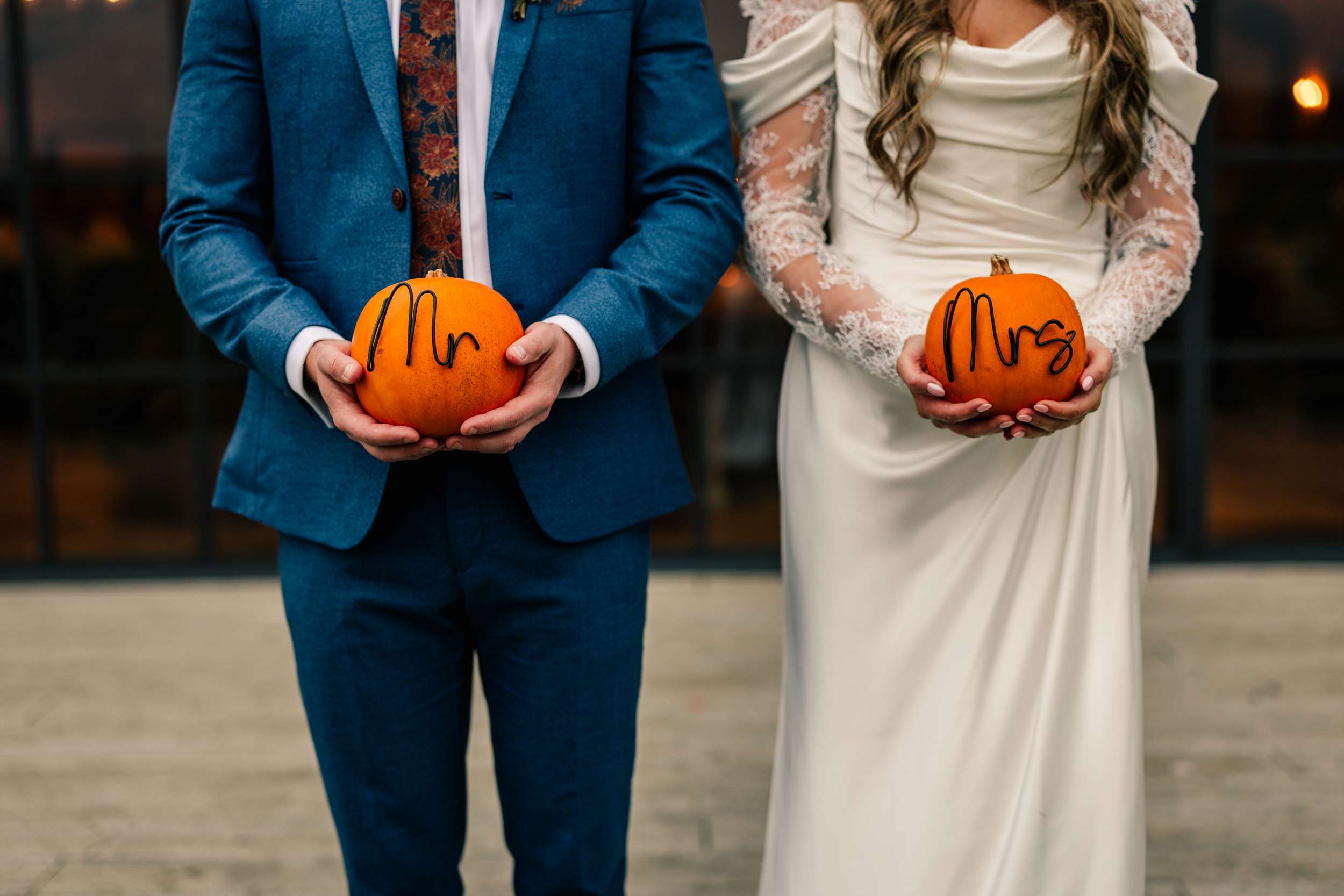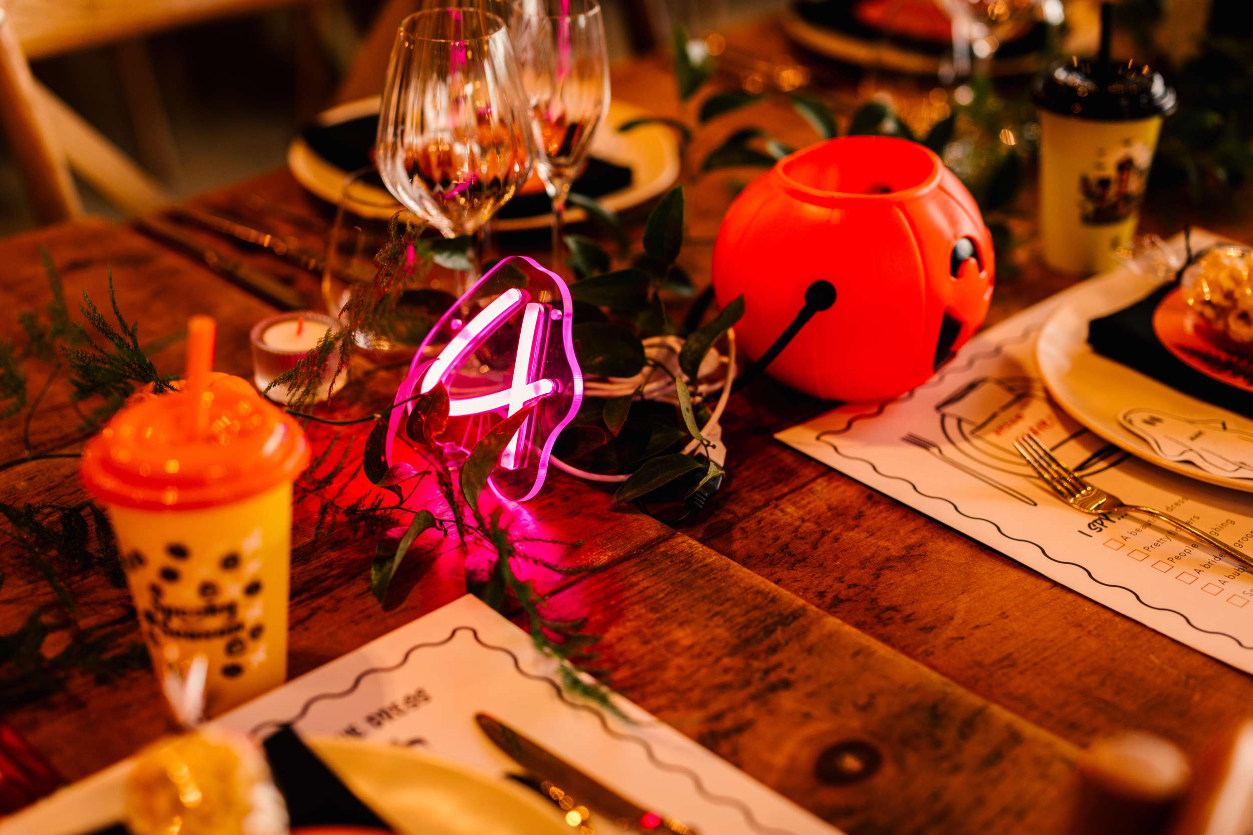 Welcome drinks included Winter Pimm’s and a locally brewed ale. Halloween décor details appeared throughout without taking over. They had neon table numbers and a ‘Til Death’ sign, finished with “is for quitters”, on top of their cake were two ghosts from York Ghost Merchants. Small gourds and pumpkins were dotted around the venue and the photo booth props included Slimer from Ghostbusters and shrunken head Bob from Beetlejuice.