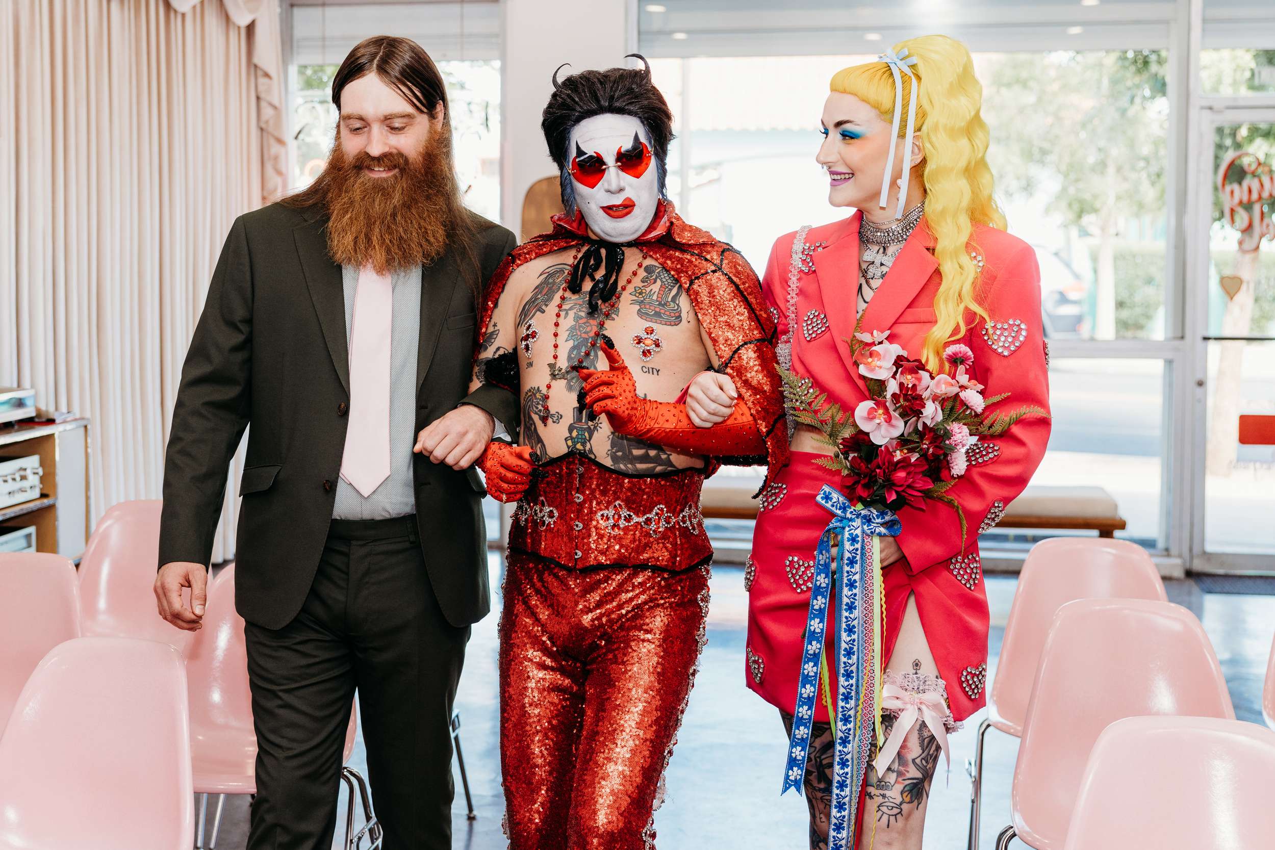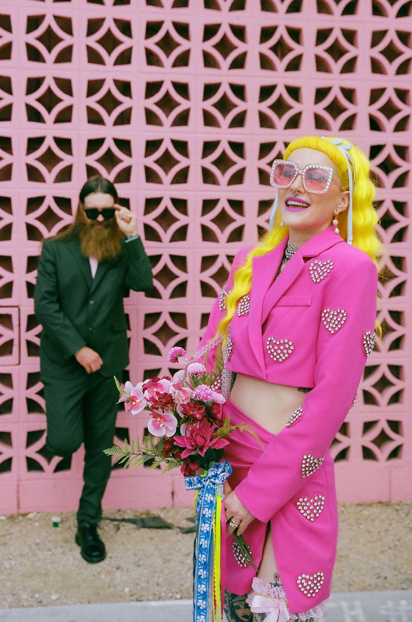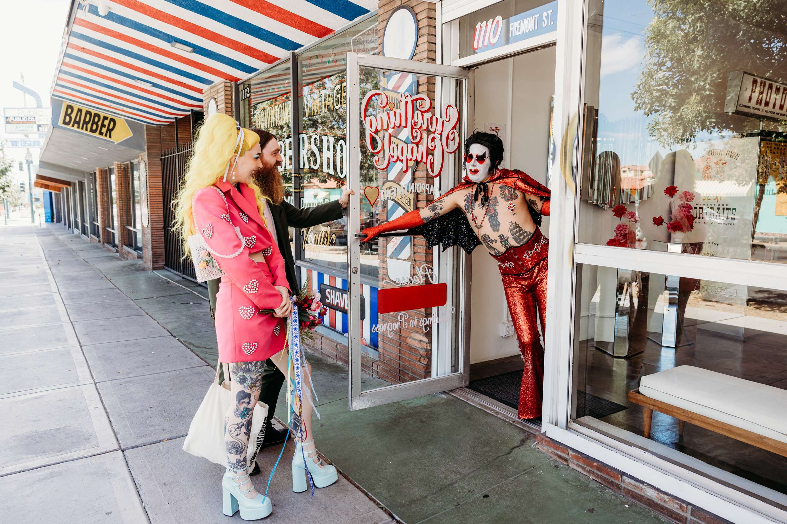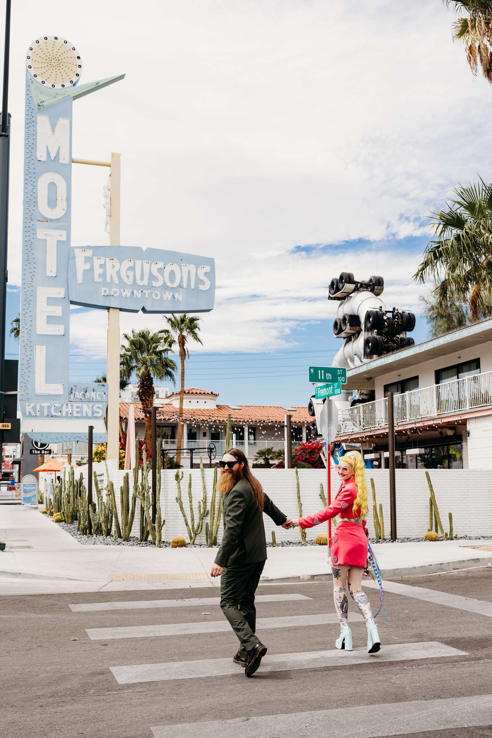 They wanted a wedding that felt light and personal. They wanted mismatching, bold choices and zero interest in doing things correctly. Fun was the priority. “We wanted to stay true to our individual styles, mismatching, colour clashing, non-traditional”, Jess continued. “We wanted the day to be filled with laughter, and this was captured in our photographs perfectly. The vibes we gave our photographers were inspired by the motel signs, the colourful back drops of east Fremont Street. Dolly Parton meets Mars Attacks with a Wes Anderson spin. The photographs were the most important thing for us to take away with us as mementos of the experience, especially considering we did not have close friends and family in attendance. We had found Shevelle and Nick through the Instagram and as soon as we saw their work we knew they were our kind of people. They understood what we were looking for and were able to make us feel incredibly comfortable straight away.”