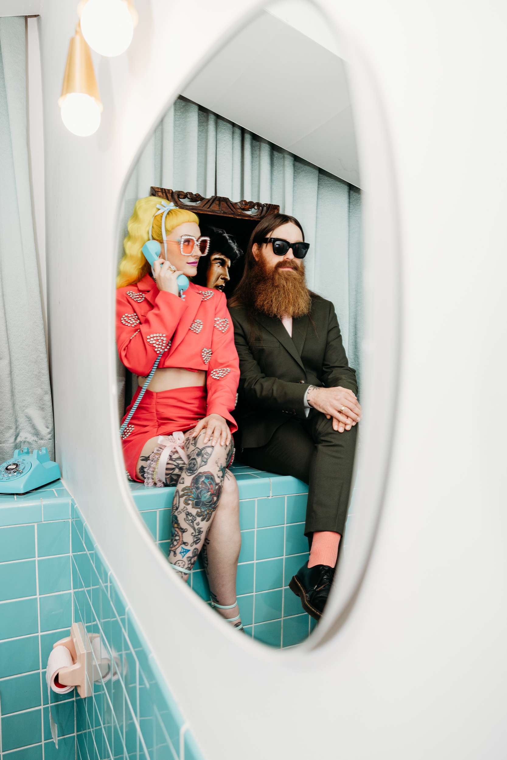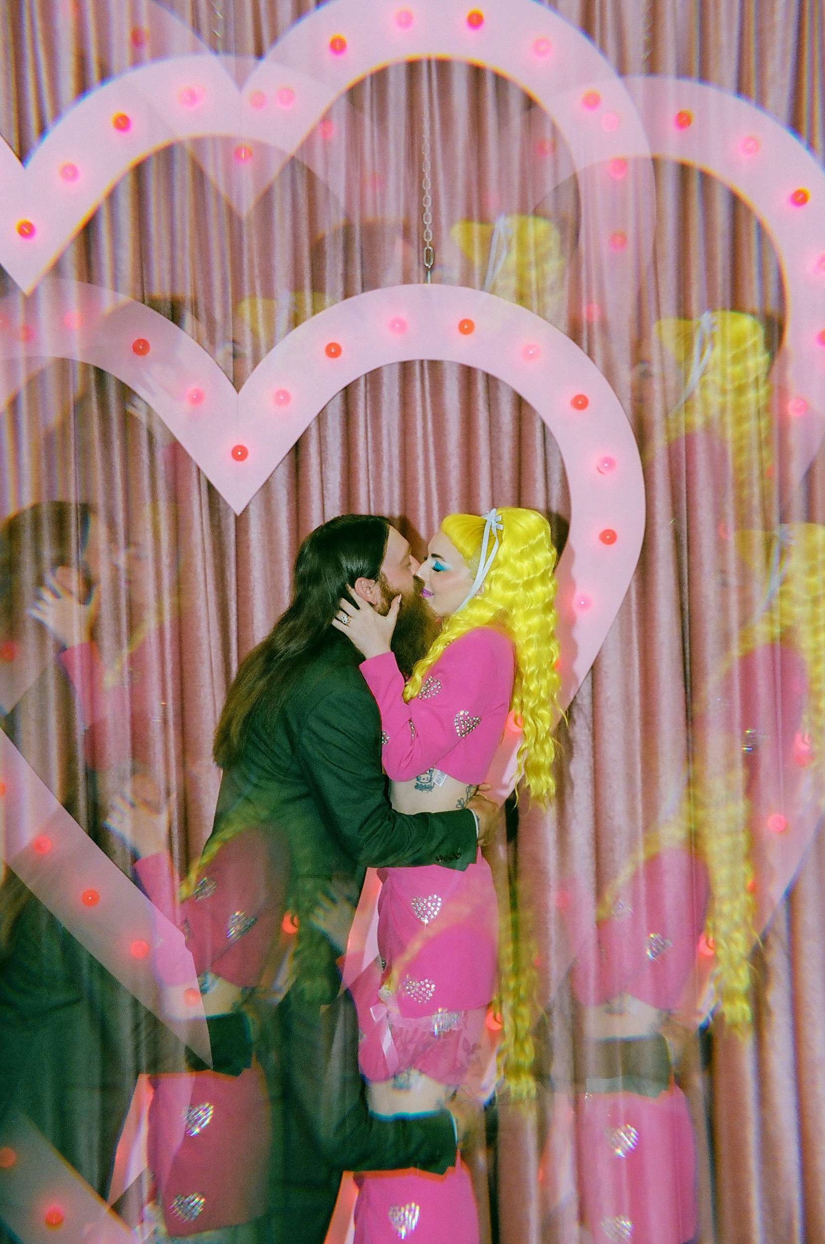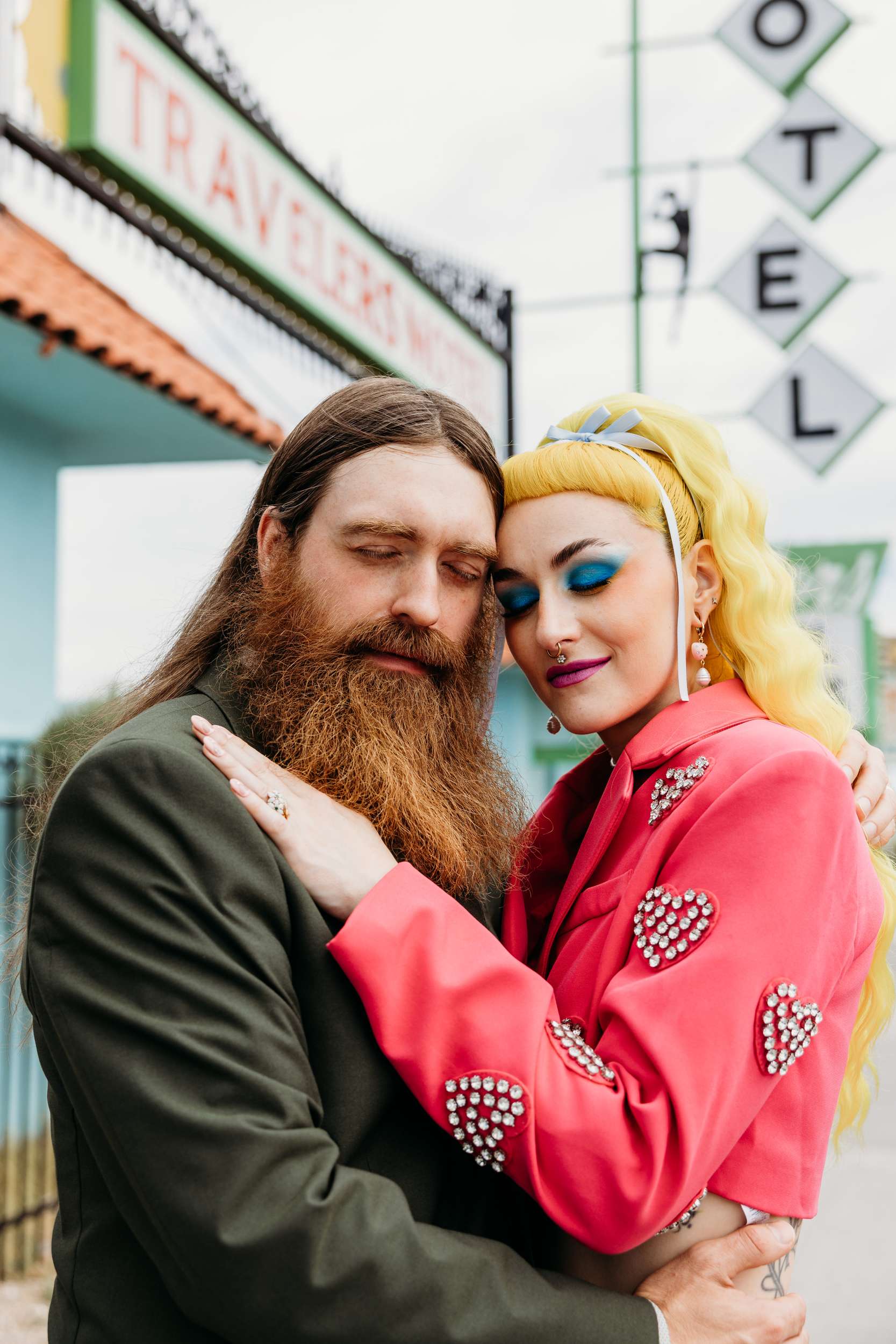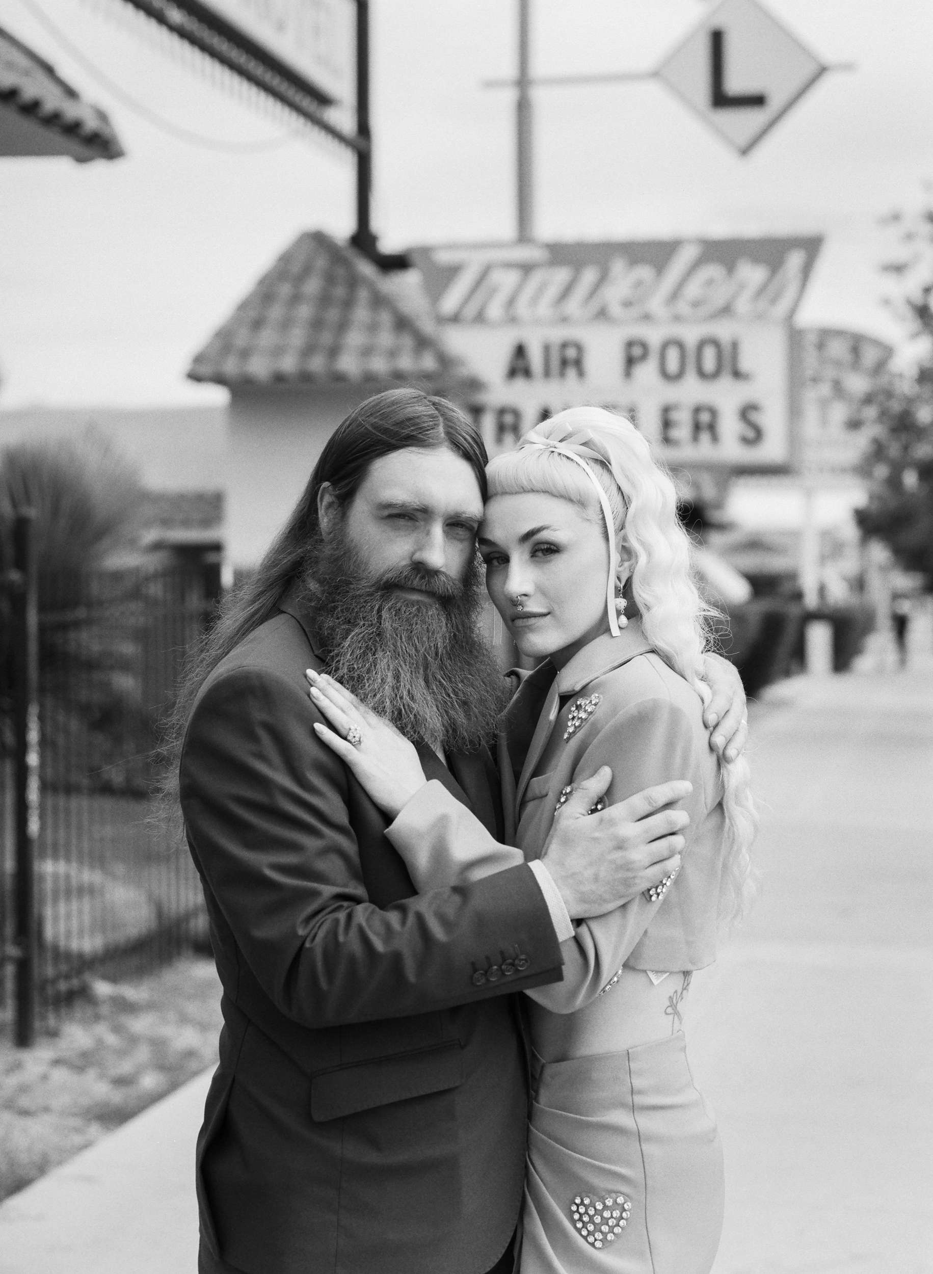 They wanted a wedding that felt light and personal. They wanted mismatching, bold choices and zero interest in doing things correctly. Fun was the priority. “We wanted to stay true to our individual styles, mismatching, colour clashing, non-traditional”, Jess continued. “We wanted the day to be filled with laughter, and this was captured in our photographs perfectly. The vibes we gave our photographers were inspired by the motel signs, the colourful back drops of east Fremont Street. Dolly Parton meets Mars Attacks with a Wes Anderson spin. The photographs were the most important thing for us to take away with us as mementos of the experience, especially considering we did not have close friends and family in attendance. We had found Shevelle and Nick through the Instagram and as soon as we saw their work we knew they were our kind of people. They understood what we were looking for and were able to make us feel incredibly comfortable straight away.”