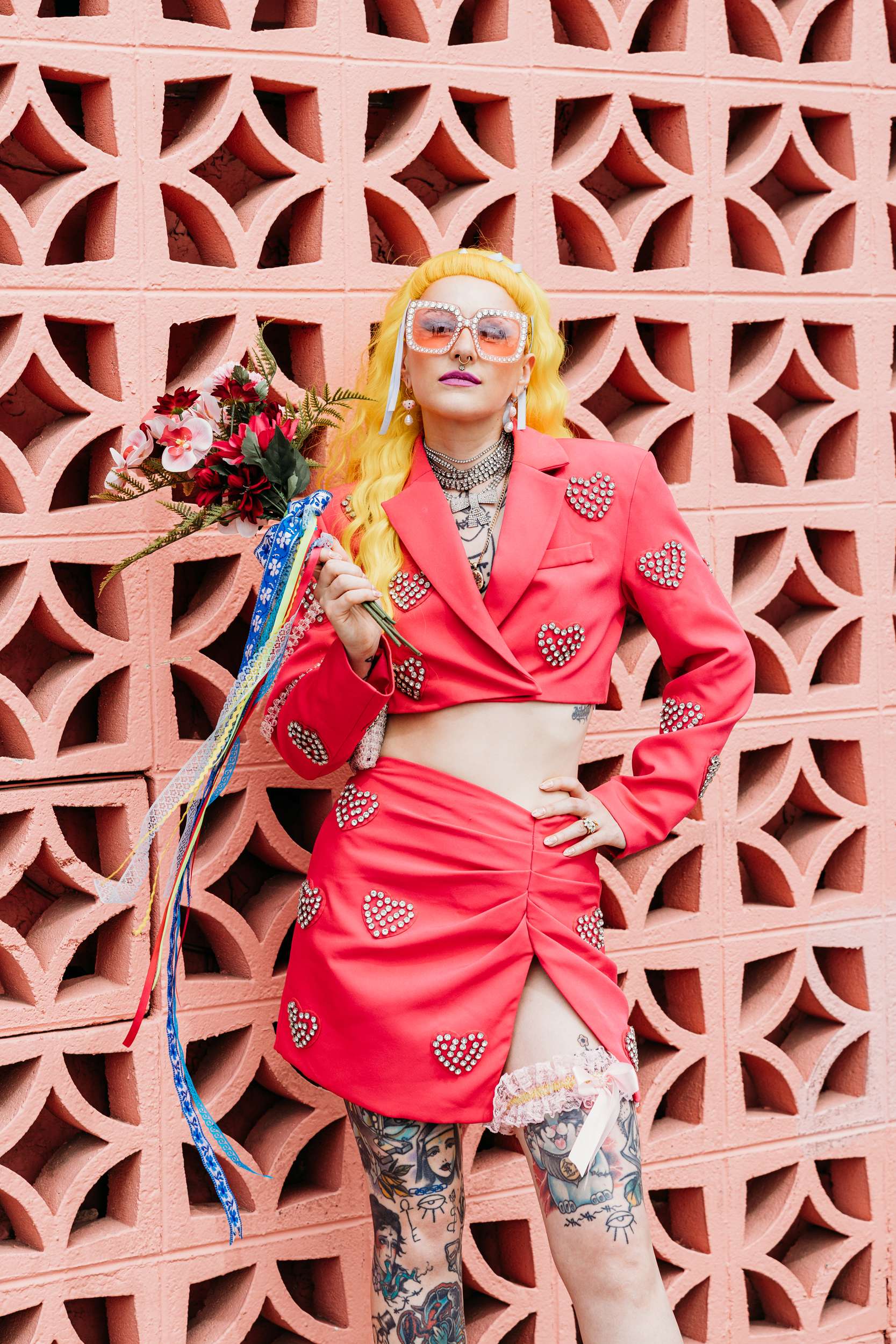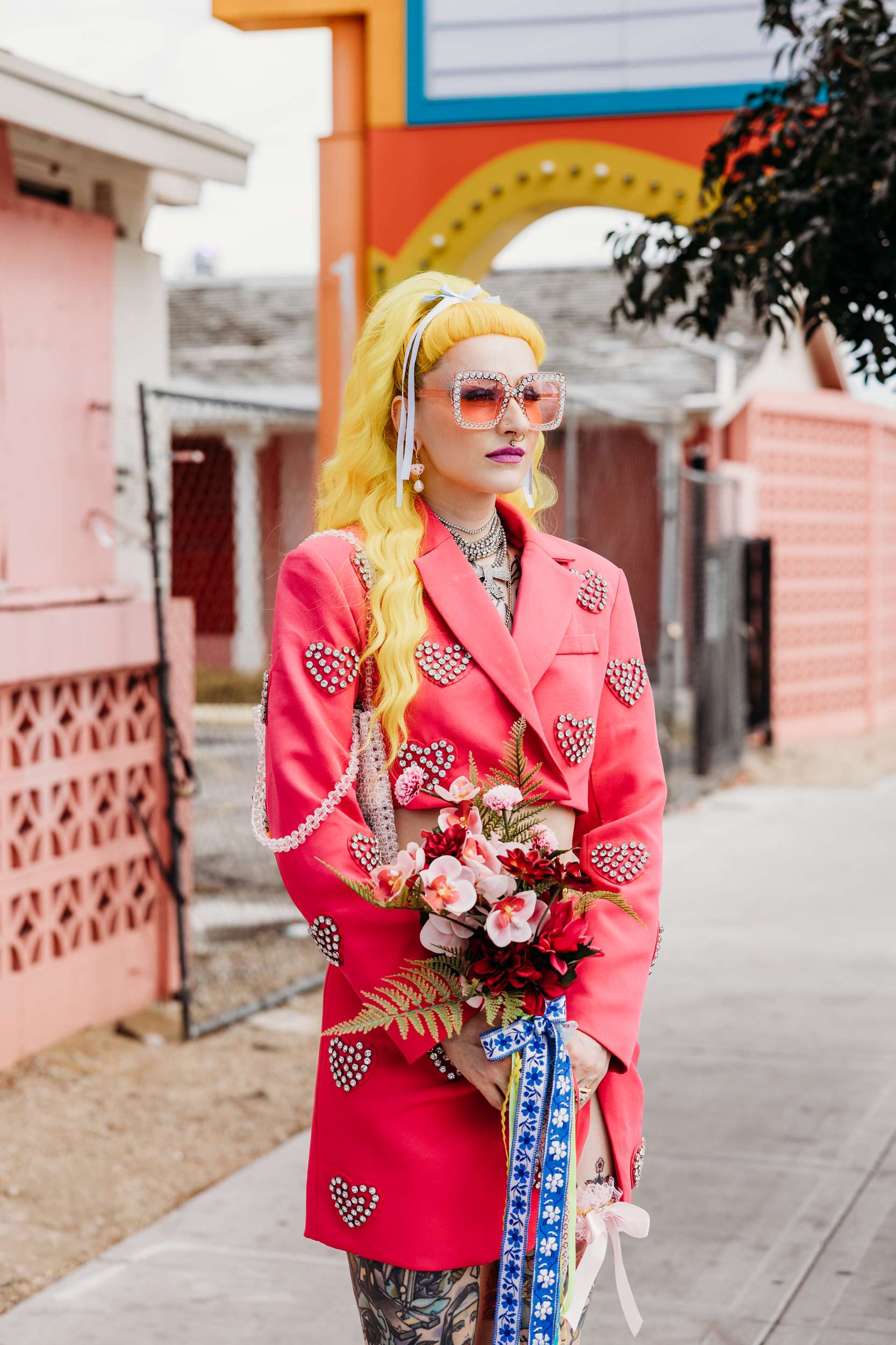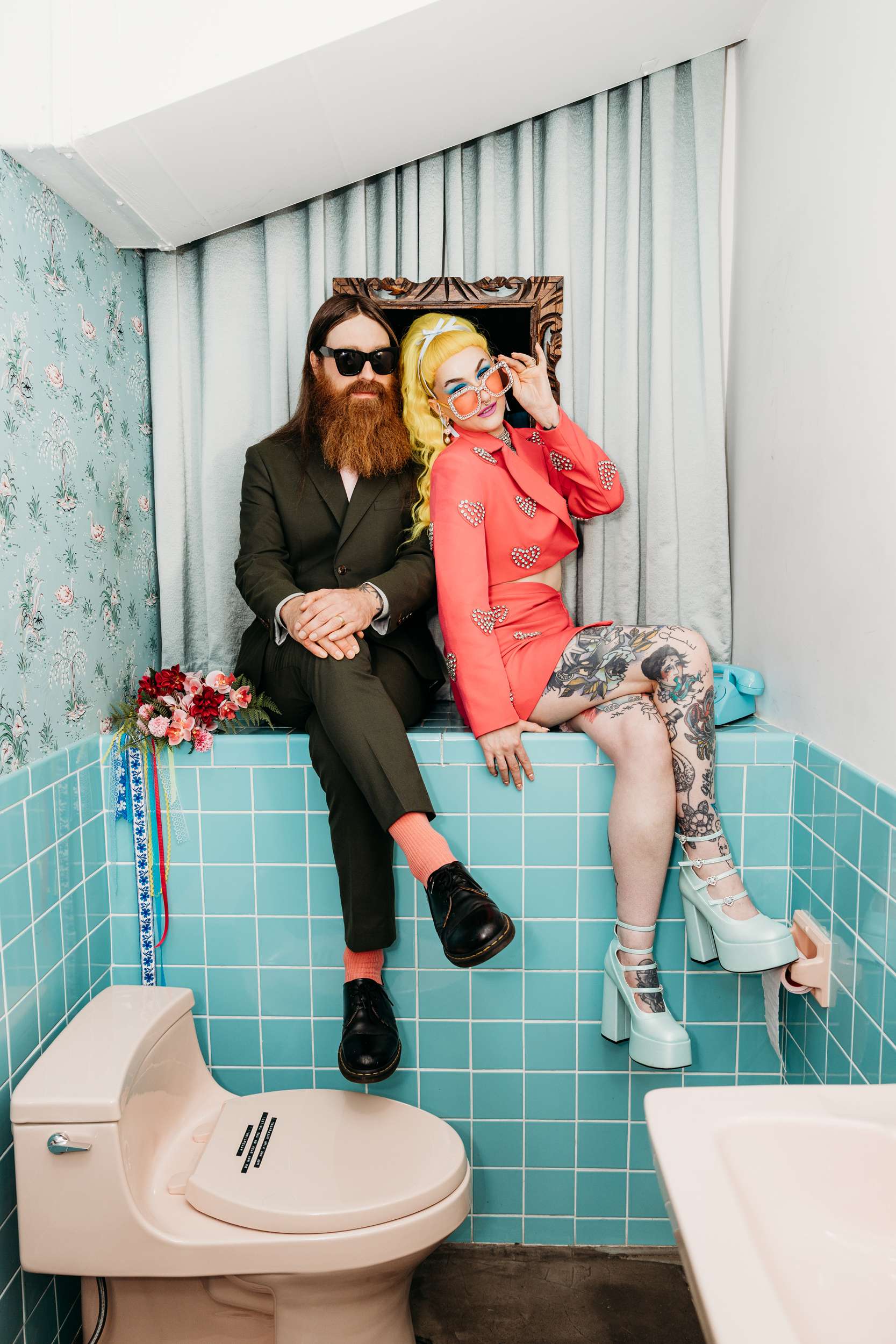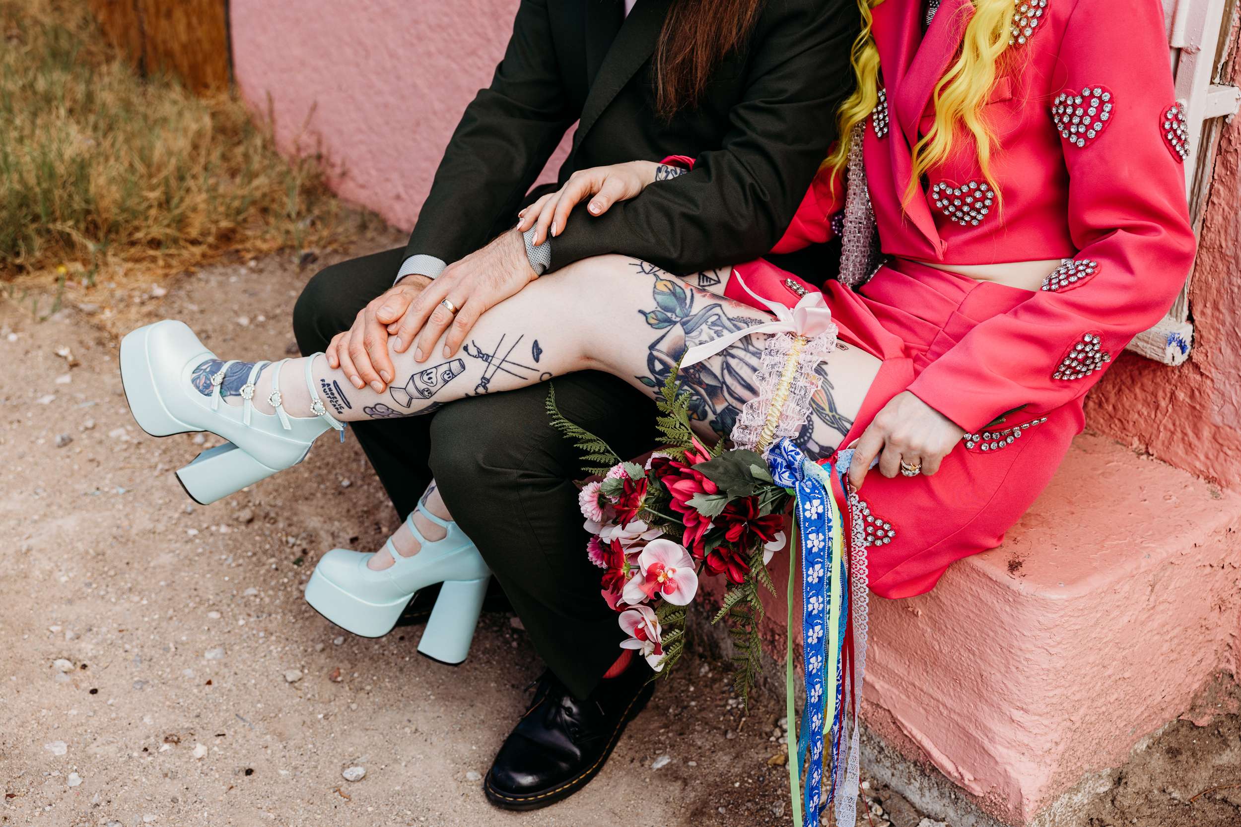 They wanted a wedding that felt light and personal. They wanted mismatching, bold choices and zero interest in doing things correctly. Fun was the priority. “We wanted to stay true to our individual styles, mismatching, colour clashing, non-traditional”, Jess continued. “We wanted the day to be filled with laughter, and this was captured in our photographs perfectly. The vibes we gave our photographers were inspired by the motel signs, the colourful back drops of east Fremont Street. Dolly Parton meets Mars Attacks with a Wes Anderson spin. The photographs were the most important thing for us to take away with us as mementos of the experience, especially considering we did not have close friends and family in attendance. We had found Shevelle and Nick through the Instagram and as soon as we saw their work we knew they were our kind of people. They understood what we were looking for and were able to make us feel incredibly comfortable straight away.”