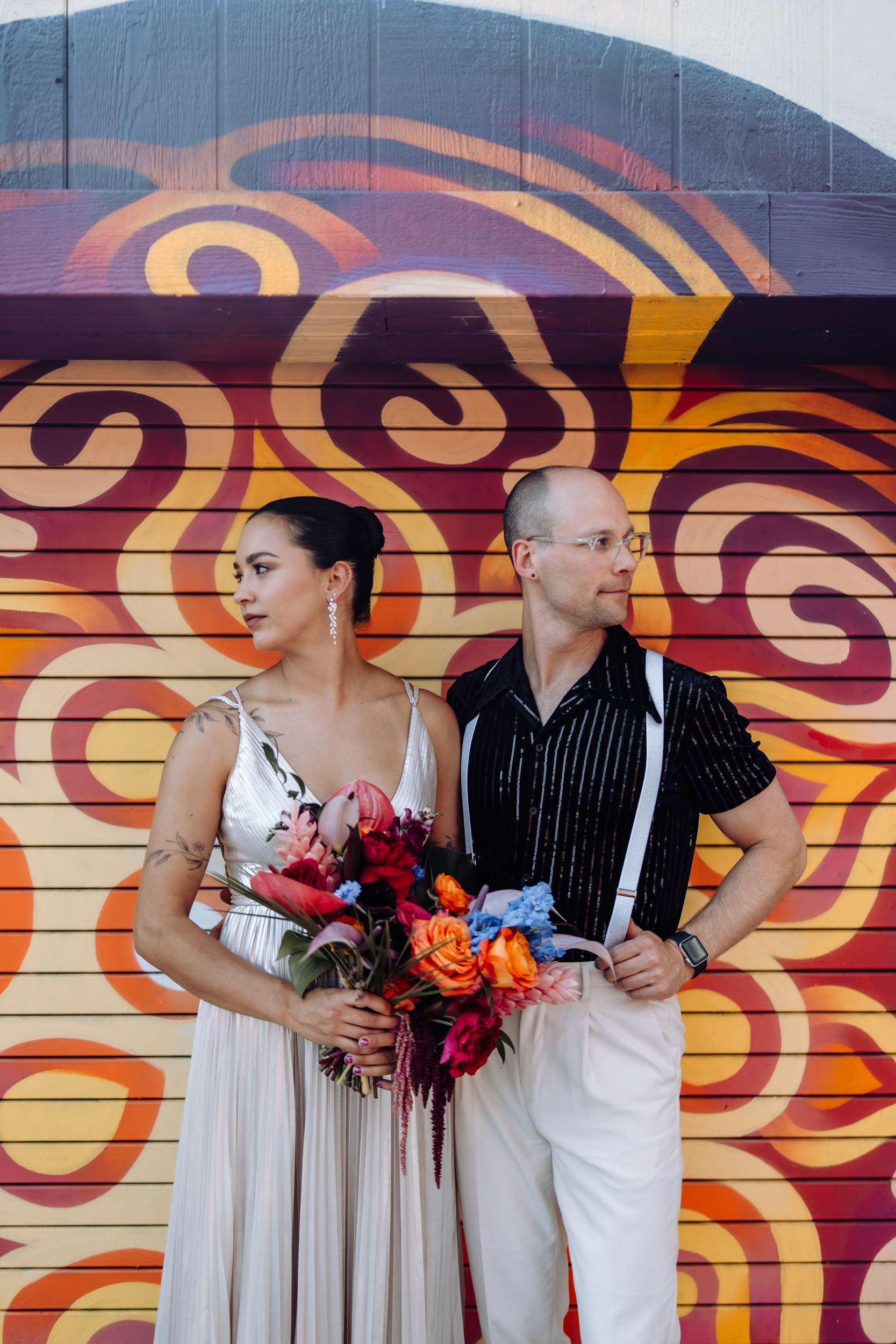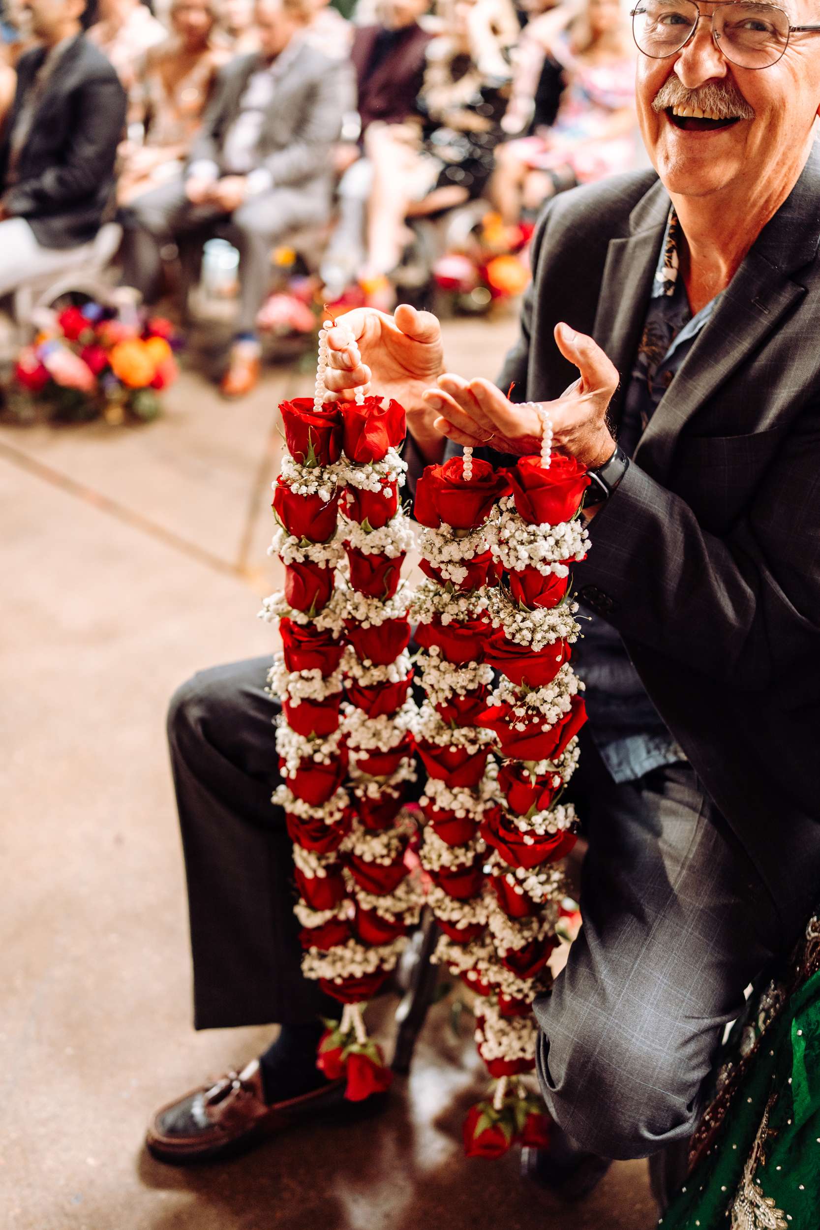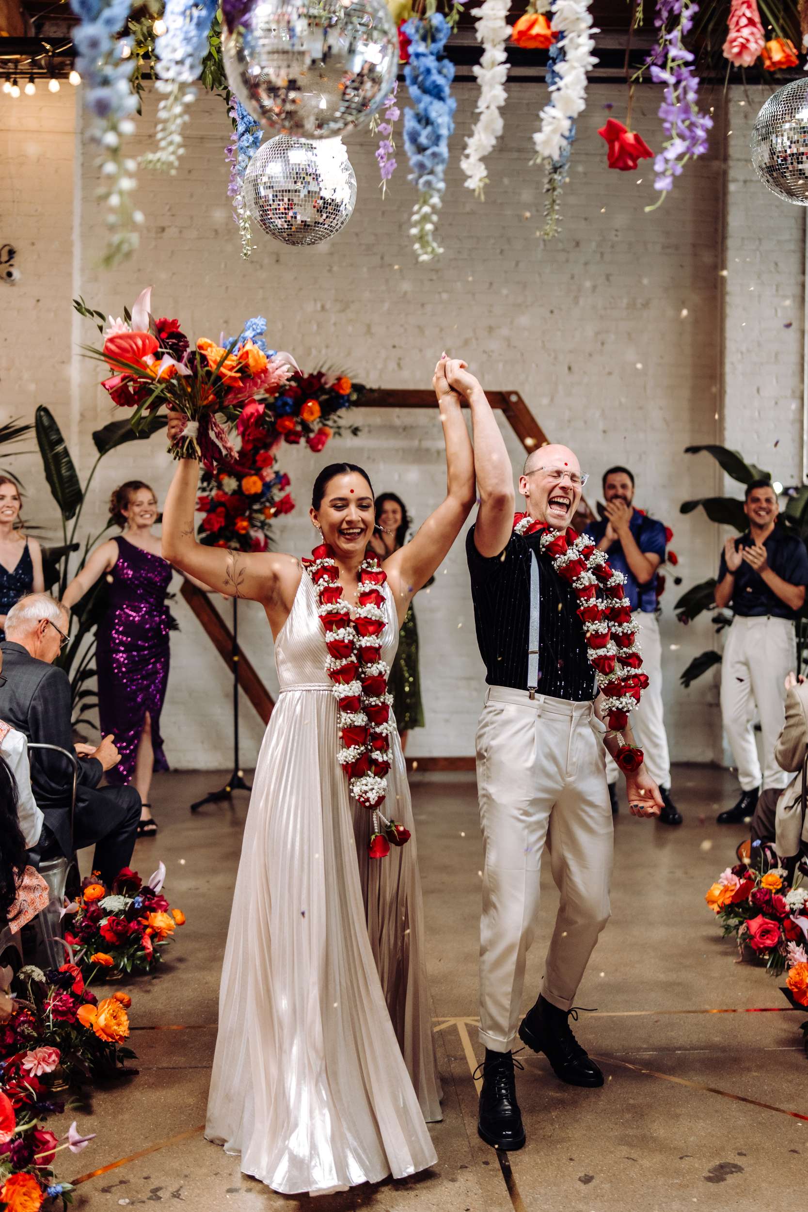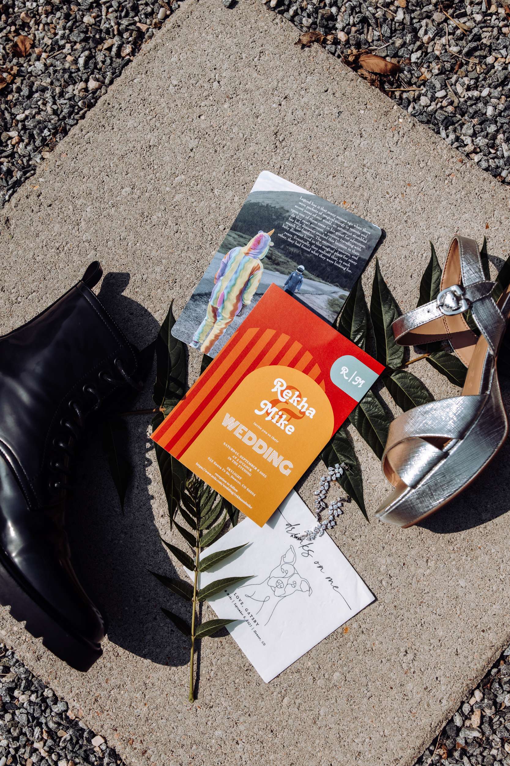 Rekha explained, “We wanted to weave mindfulness and intentionality with joyfulness and playfulness. We decided that the best way to do this was with a jungle disco theme. Choosing to have a wedding and then landing on a jungle disco theme was a bit of a journey for us! Neither of us came to our relationship with huge dreams of a big wedding or with a lot of value placed on marriage and a wedding. This was highly influenced by each of our parents. Neither of us had grown up being told or shown that weddings are important. From Rekha’s side, the messaging I received about weddings is that they are really a thing you do out of obligation to make family elders happy. But, the idea of spending a lot of energy and money on an event that was being done out of obligation was just not appealing to either of us. We were not interested in playing a role and following a script to satisfy other people. However, slowly over the 7+ years we’ve been together, attending our friends’ weddings changed our minds.”