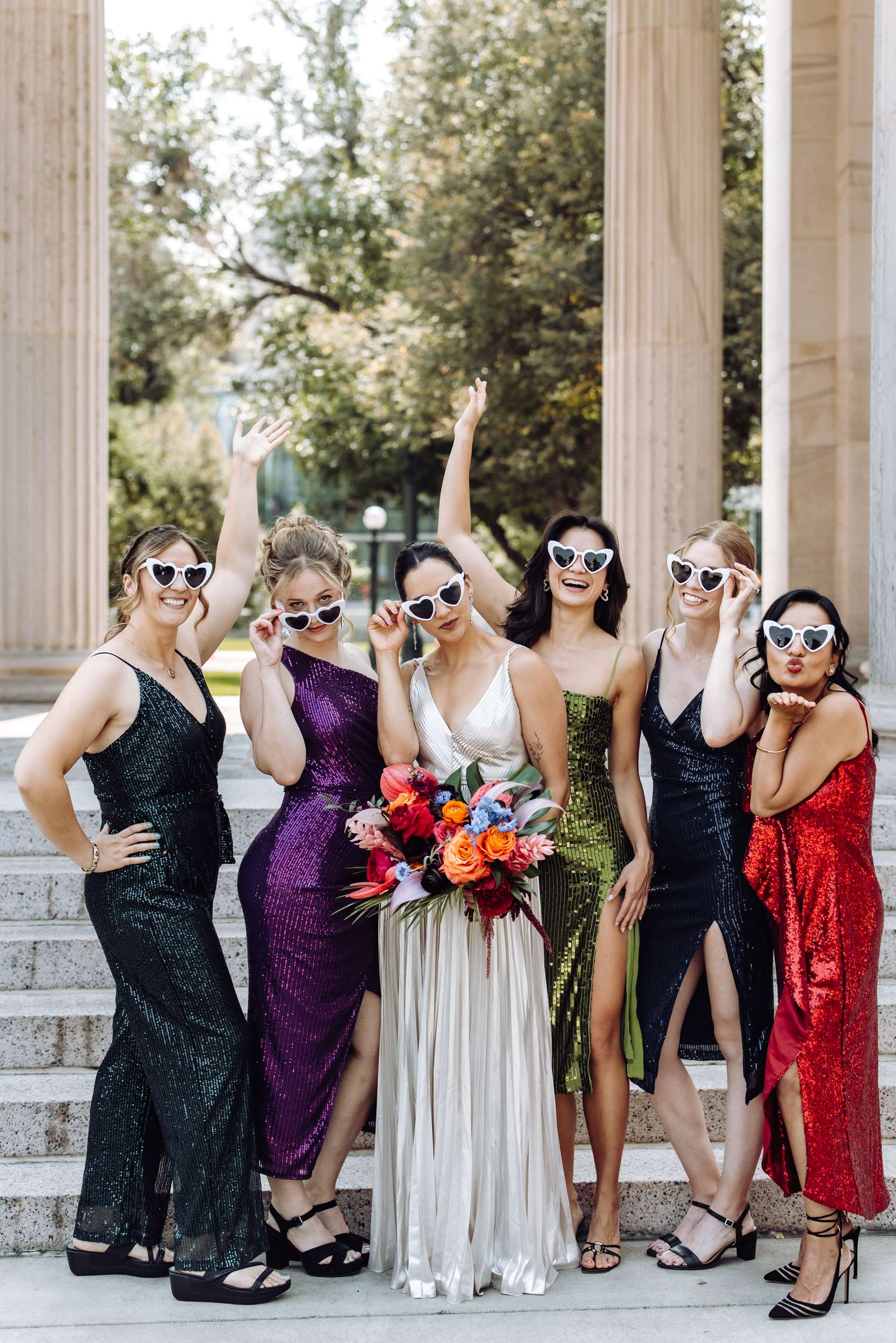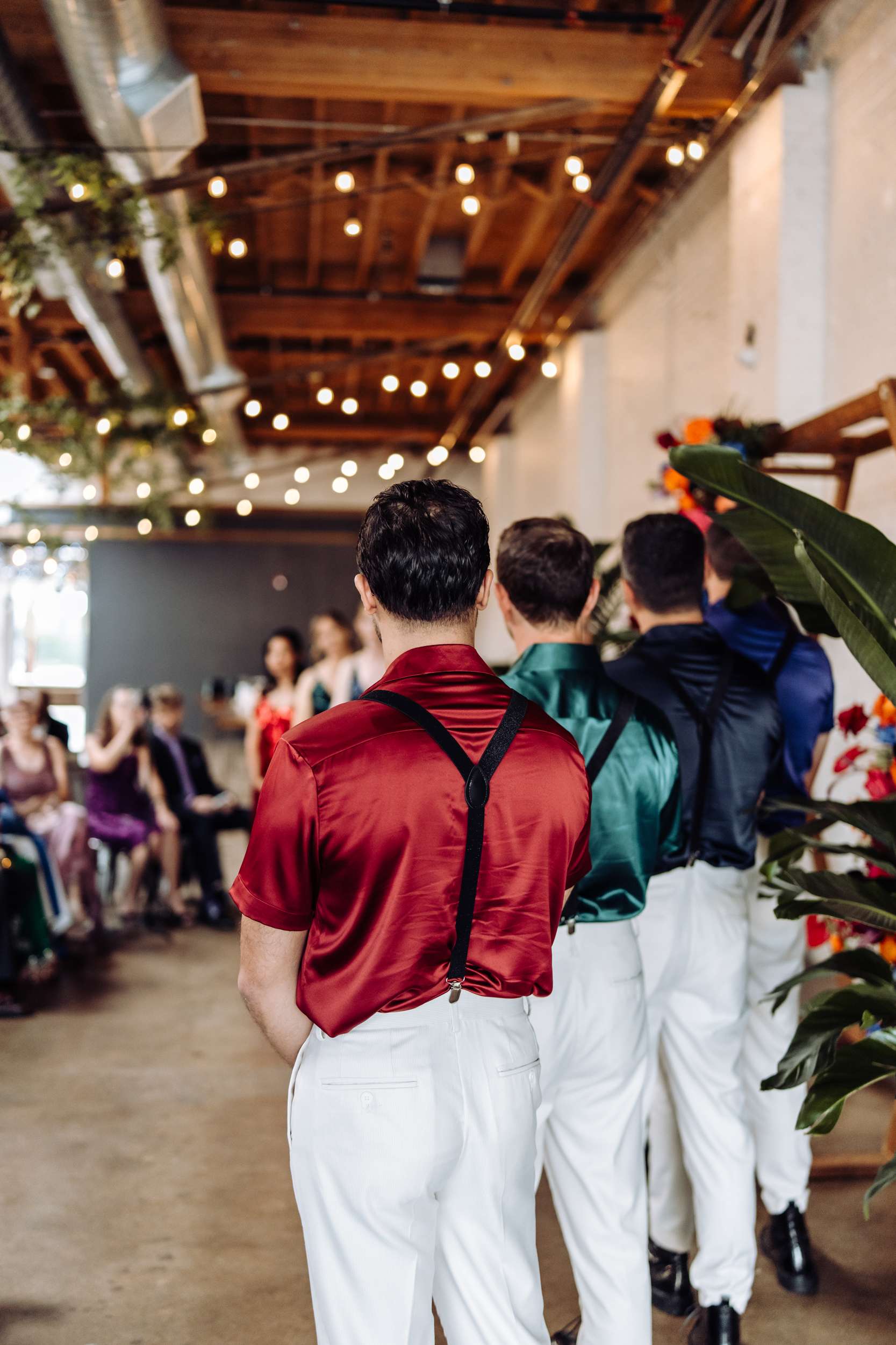 The jungle disco theme shaped everything without becoming costumey. Rekha and Mike wanted colour, texture and shine, not traditional wedding looks. The wedding party was coordinated in different coloured outfits rather than a uniform. Bridesmaids chose their own sequined dresses while the groomsmen wore matching trousers, boots and suspenders, paired with satin shirts in colours that matched a bridesmaid. Rekha wore a shimmery silver dress. Mike matched the groomsmen, with a sequined black top setting him apart.
