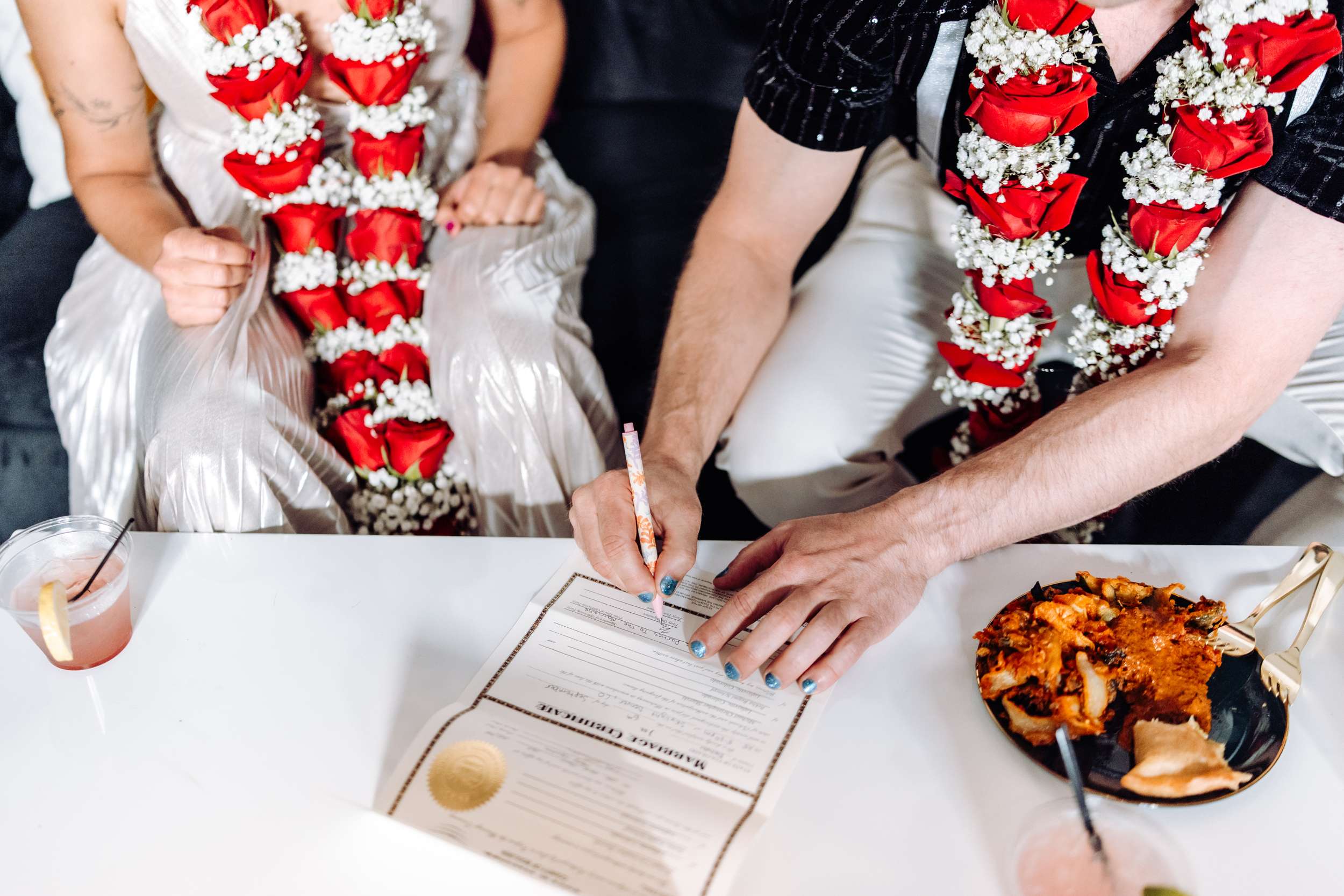 Rekha also wanted the ceremony to reflect her identity. Her mother is from Nepal so honouring that mattered. Two moments from a traditional Nepali ceremony were woven in. Rekha’s mum placed a tika on each of their foreheads as a blessing for wellbeing. They also exchanged flower garlands to symbolise acceptance of one another as partners. The ceremony ended with Levels by Avicii playing as they kissed and walked back up the aisle.