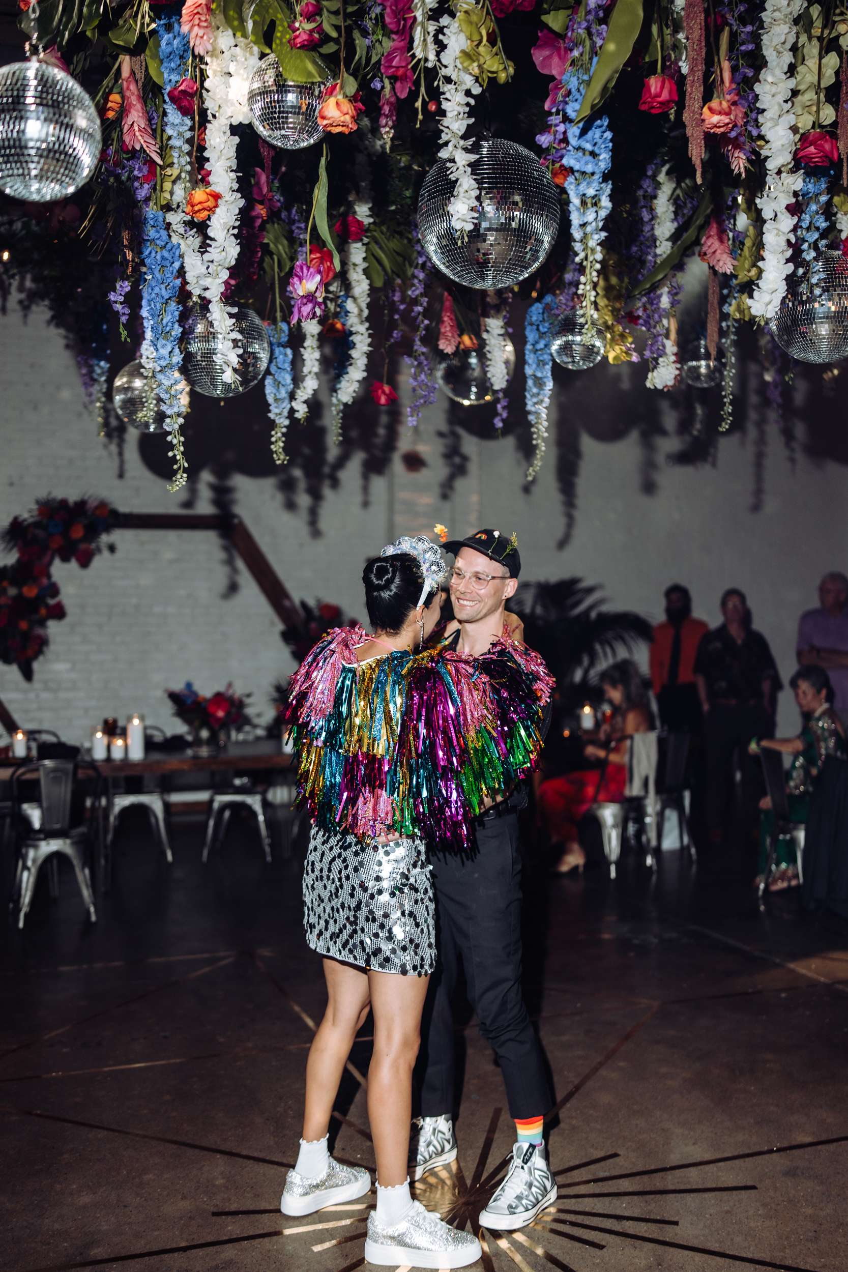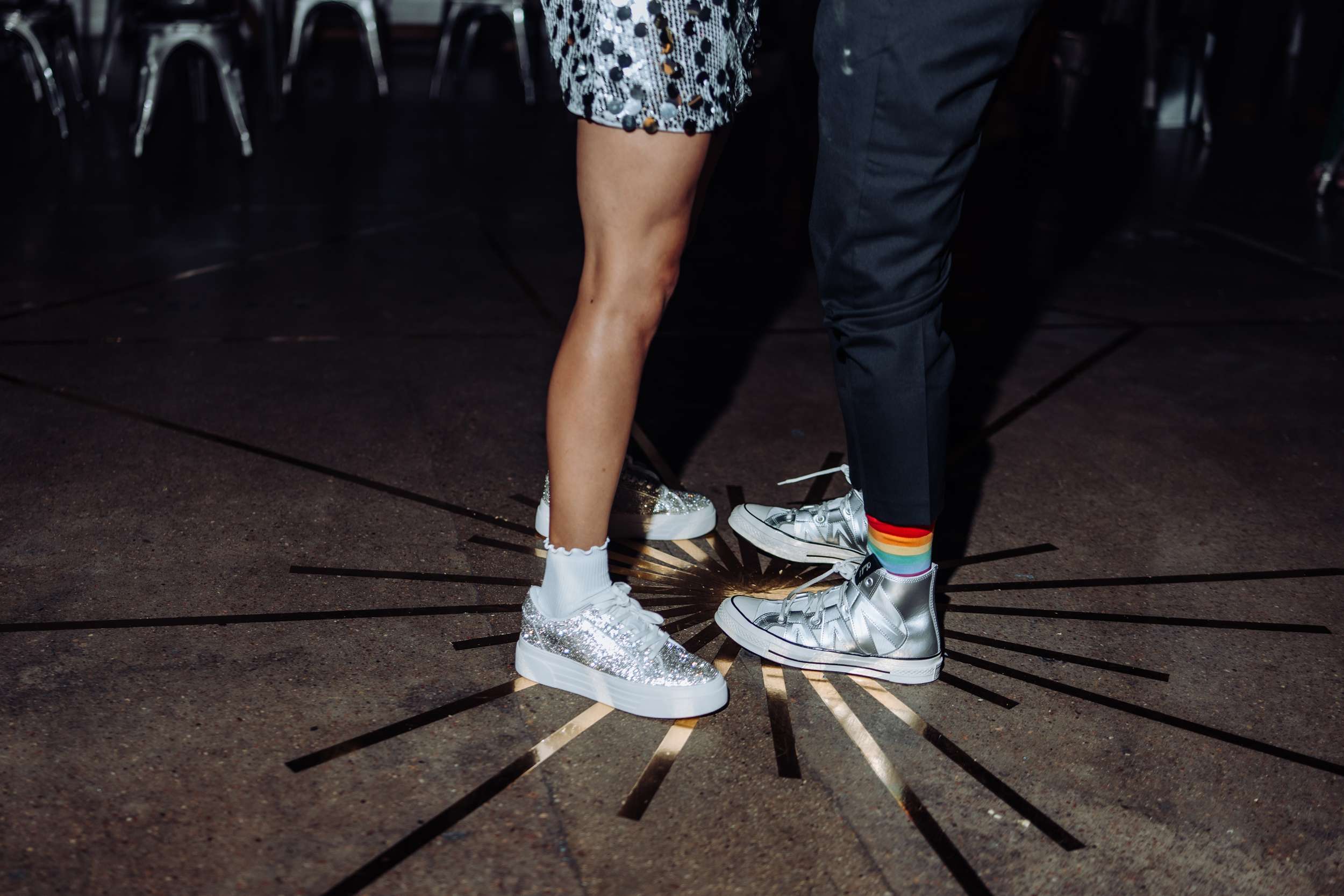 Before the reception, both changed outfits. Mike swapped into silver Converse, black trousers with rainbow socks and a sheer sparkly top. Rekha changed into a silver sequined mini dress, sparkly trainers and a rainbow tinsel jacket. She added a disco headband gifted by a close friend.