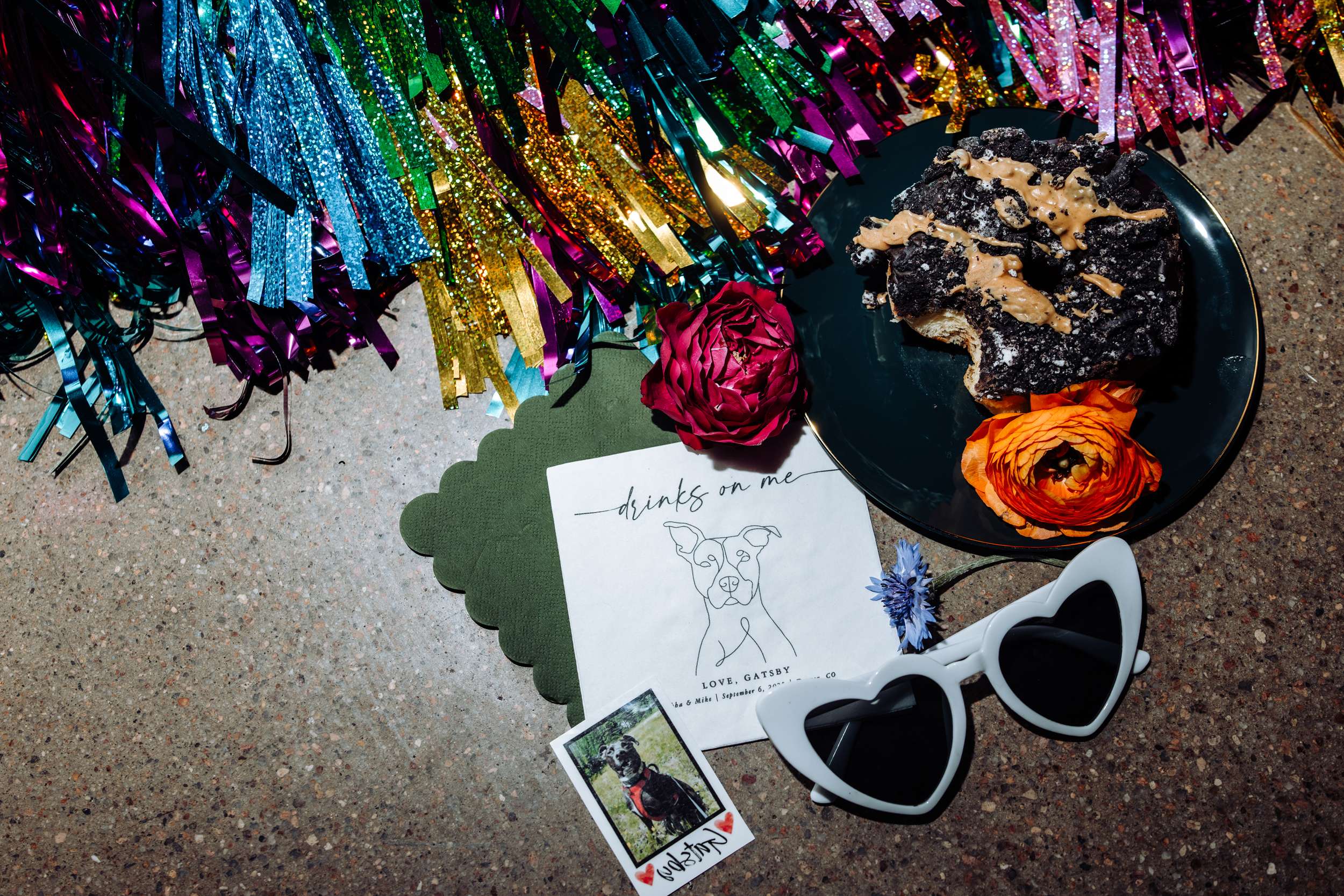 Gatsby’s presence ran through the day. He was part of their family and treated as such. Instead of a cake, they ordered a large custom donut with his face piped onto purple icing. The result was cartoonish and hilarious but and perfect. Gatsby also appeared on cocktail napkins, drinks names and the bar menu.