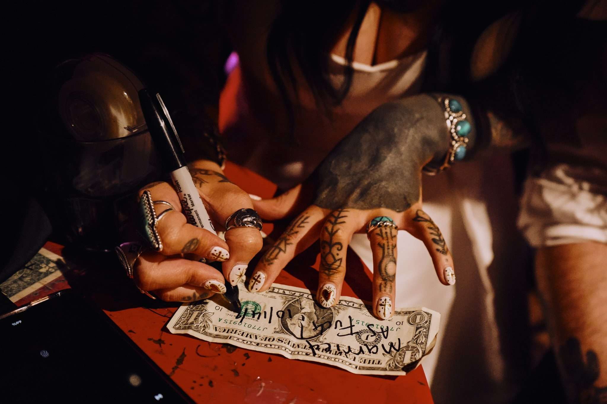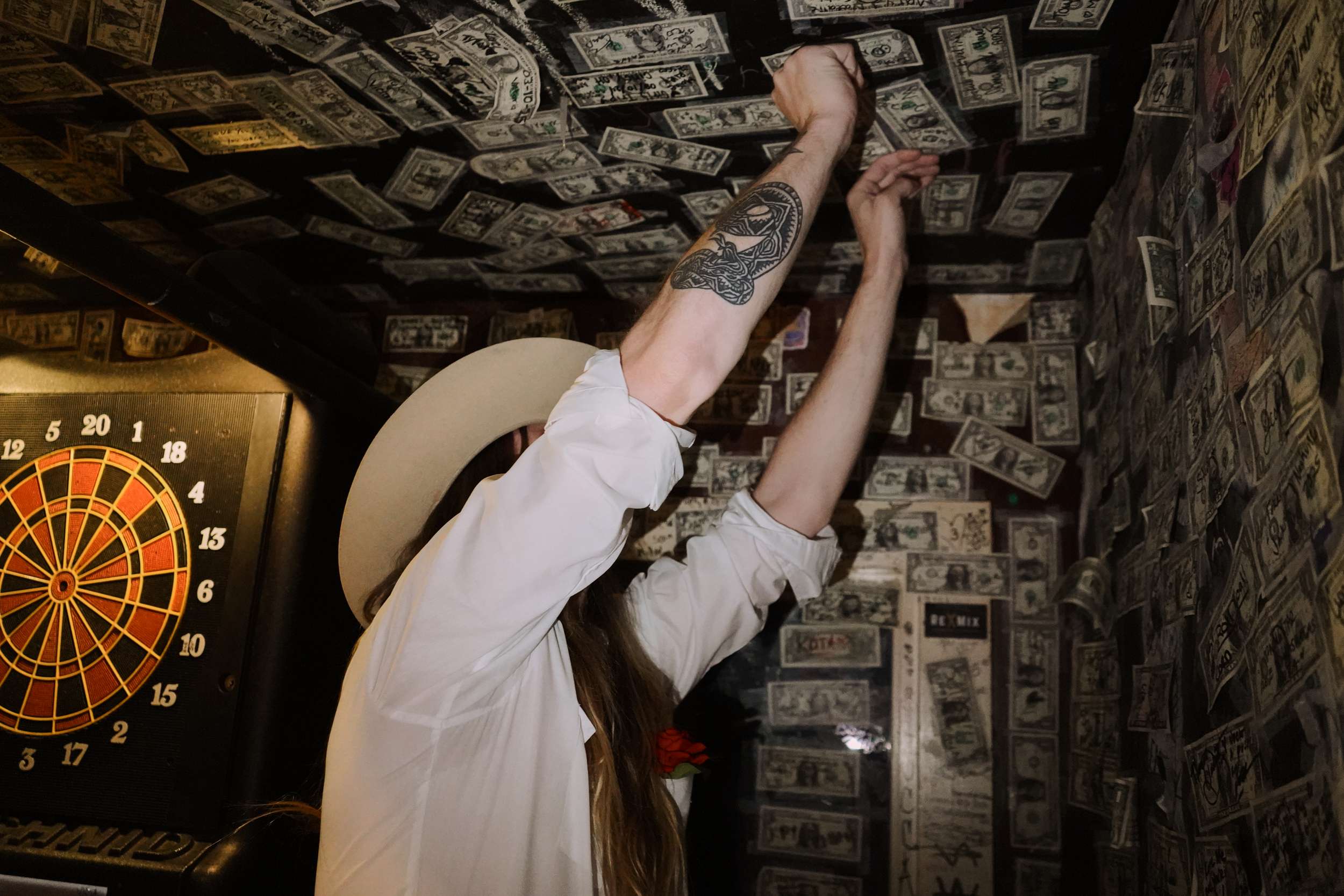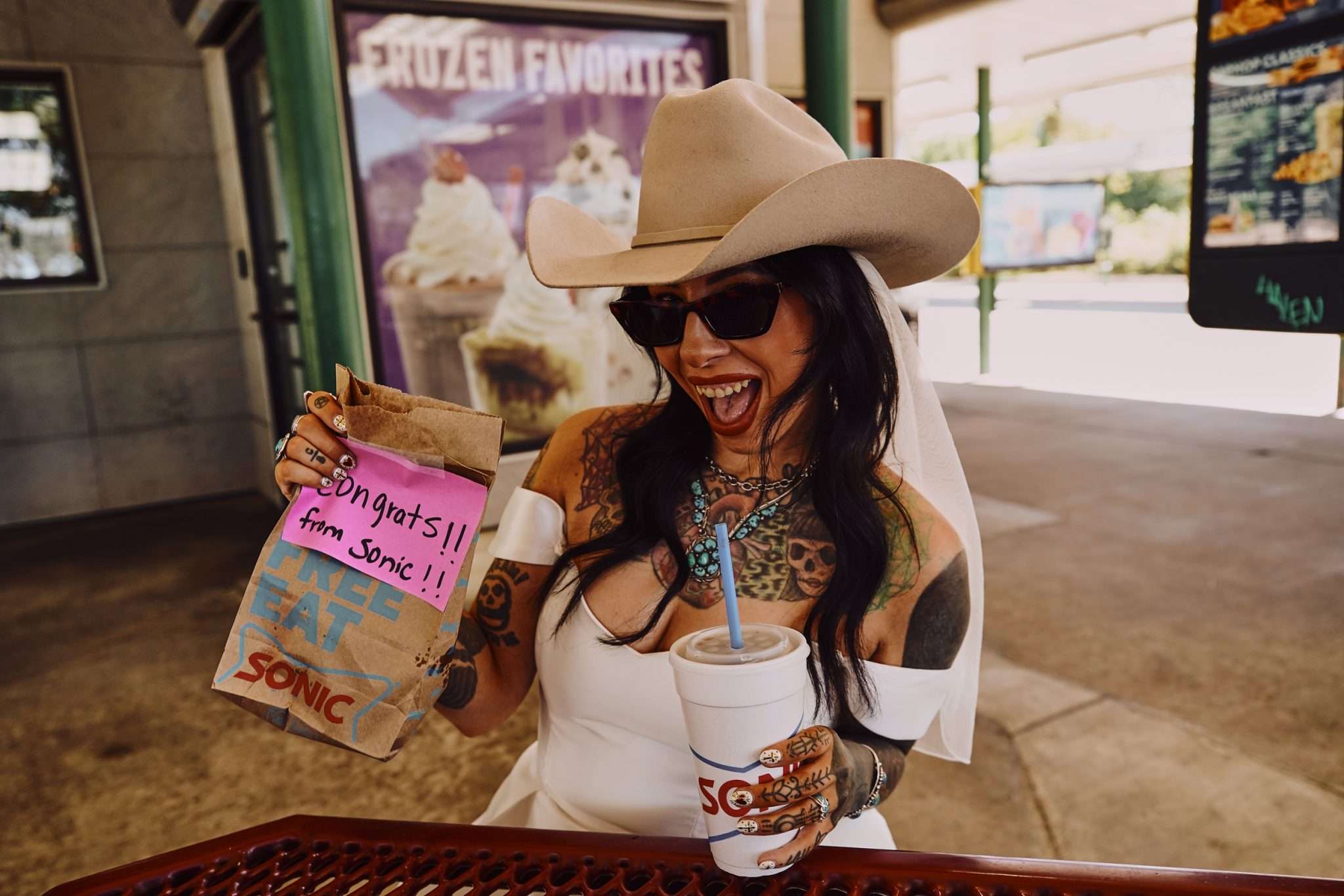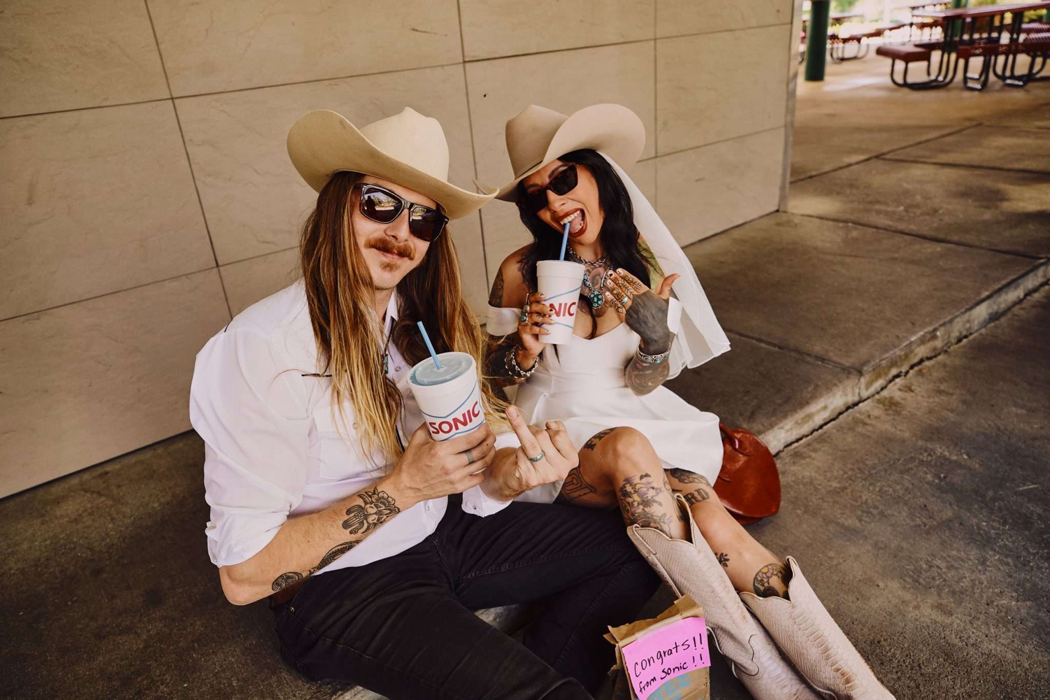 Afterwards, they took photos around the chapel and drove to Sonic’s Drive-In where the staff gave them their food on the house and wrote a sweet ‘congrats’ message on the bag. They then met up with some friends and family later for food and drinks at the bar where they first met. “We went back to Doc Holliday’s Saloon and put another dollar bill on the wall next to our previous ones, this time with our wedding date and ‘Married as Fuck’ written on it!” Lucie explained. “We then finished our night in our favourite place – the famous Roberts Western World, for some traditional country music and a recession special.”