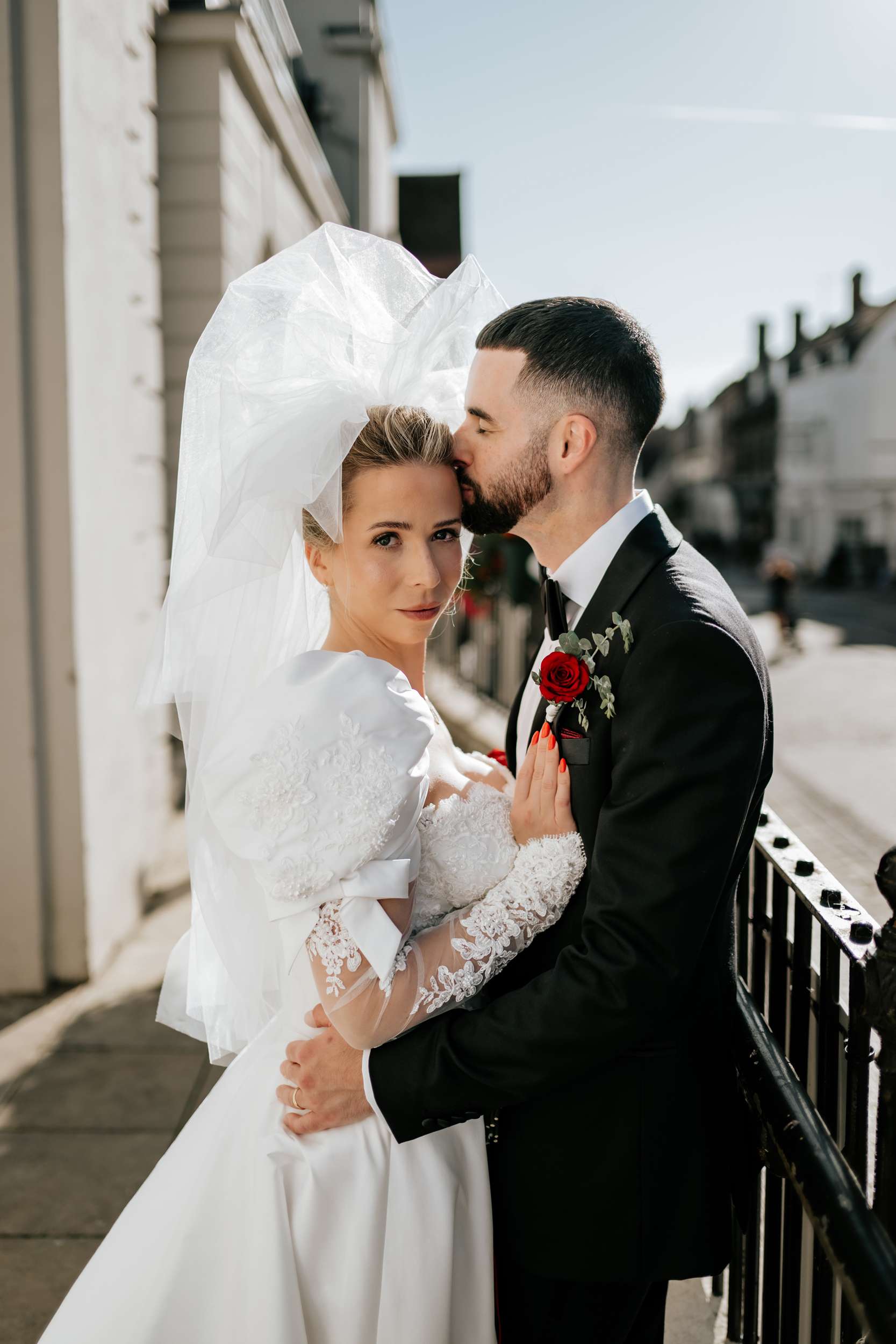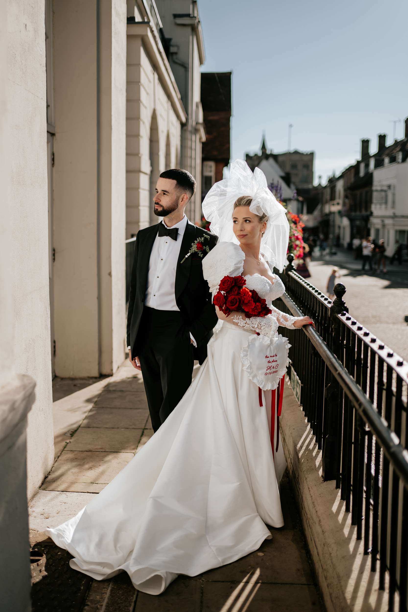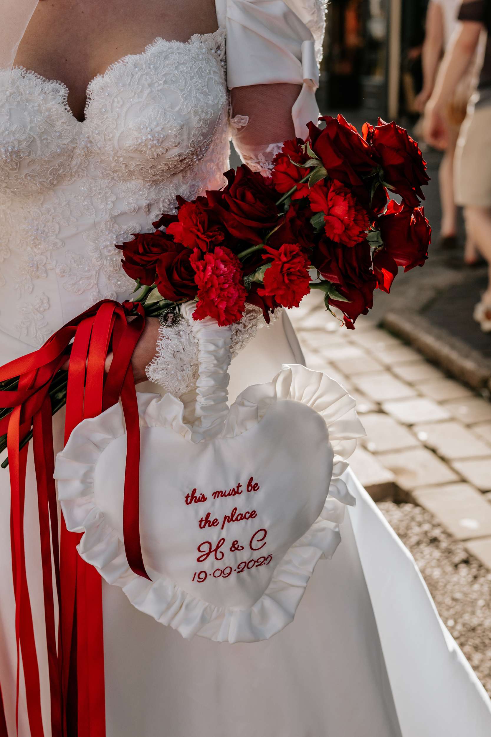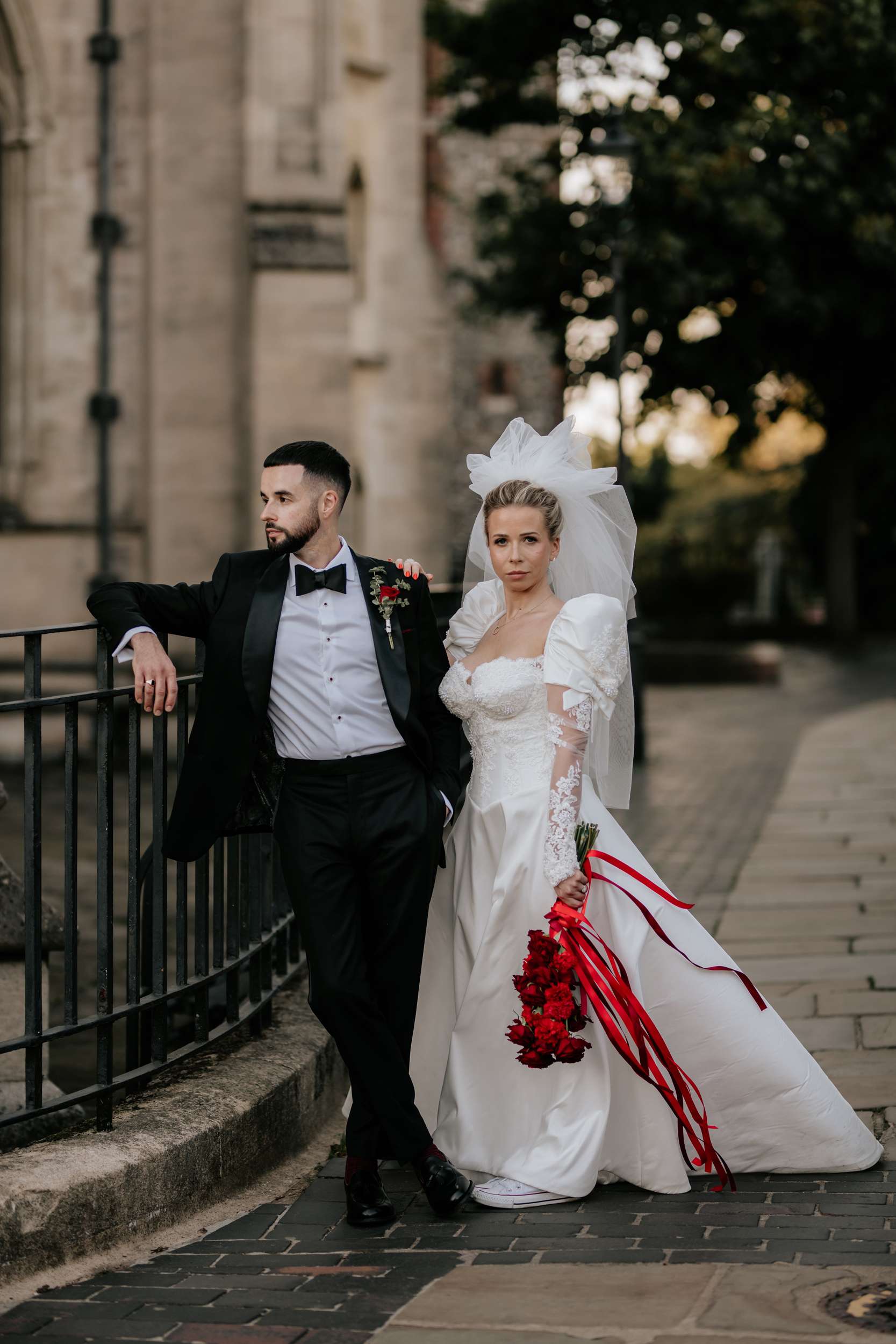 “Our inspiration was Guns ‘n’ Roses’ November Rain video, with the drama of Meatloaf’s I Would Do Anything For Love and Celine Dion’s It’s All Coming Back To Me!” Chloe explained. “A blend of classy 80s (we didn’t want it to look fancy dress!) and the 80s-does-the-50s style. We had lots of ribbons and bows, vintage cake, reds and pinks. My inspiration for the day started with the dress itself, which I always knew I wanted. I worked everything else around the dress, which proved difficult at times as Harry didn’t know what I was going to wear!” The dress was bespoke, made by Lisa Lyons, and designed specifically for Chloe’s body and brief.