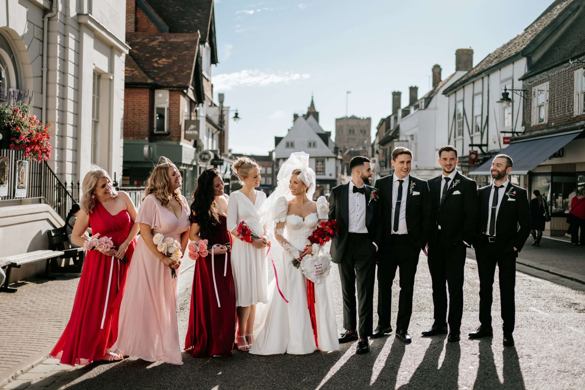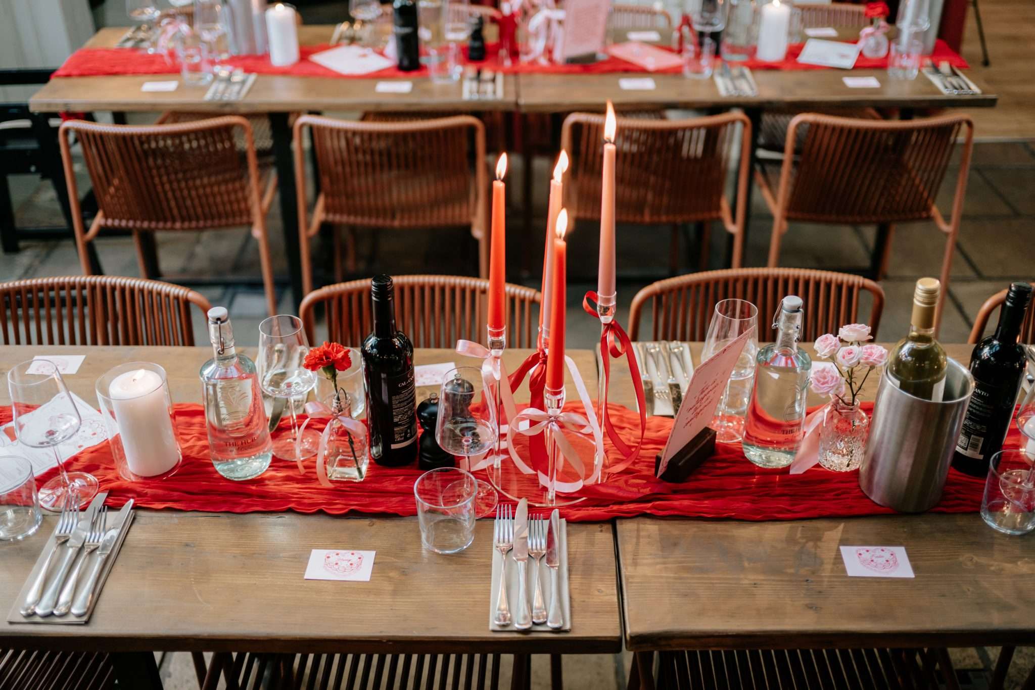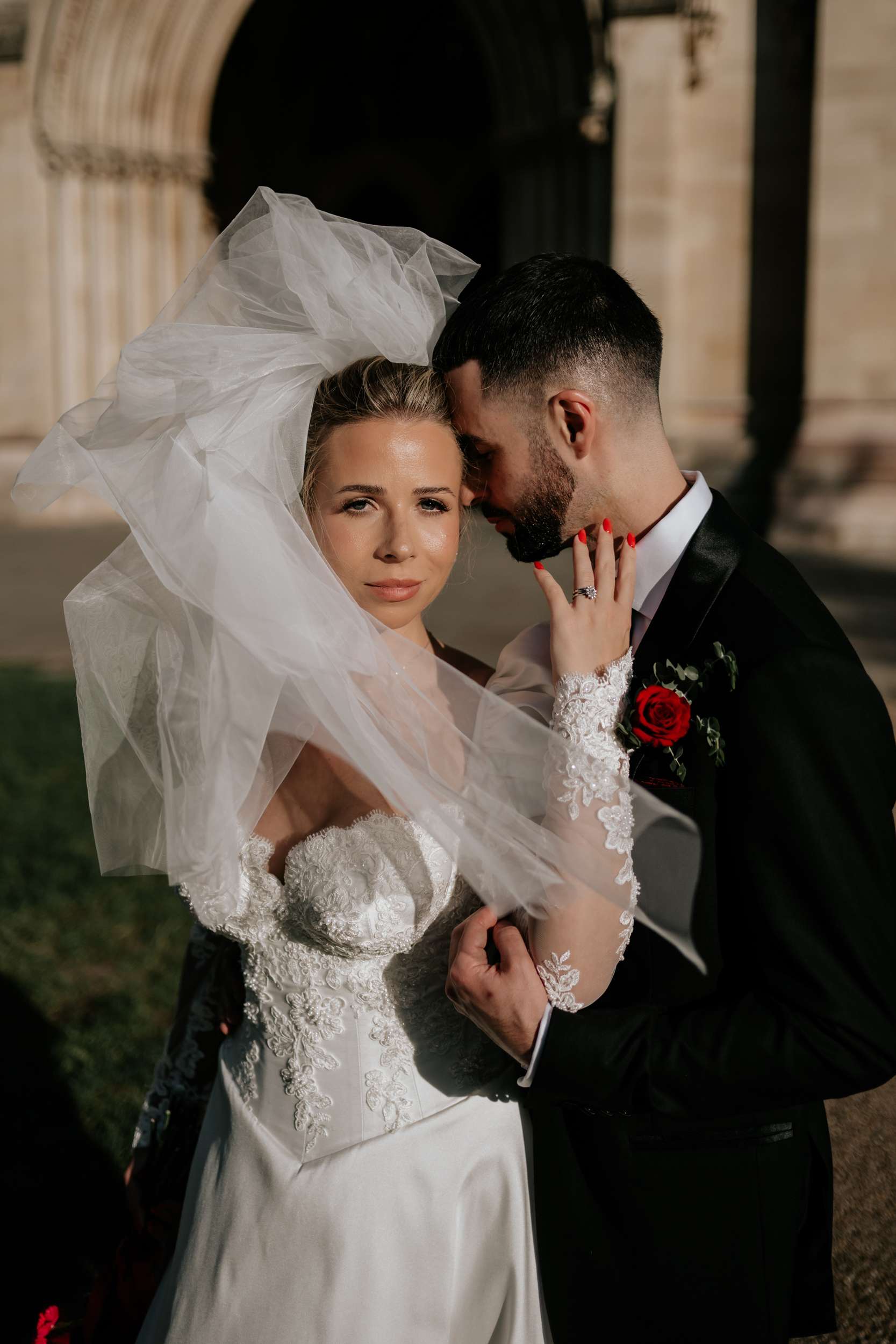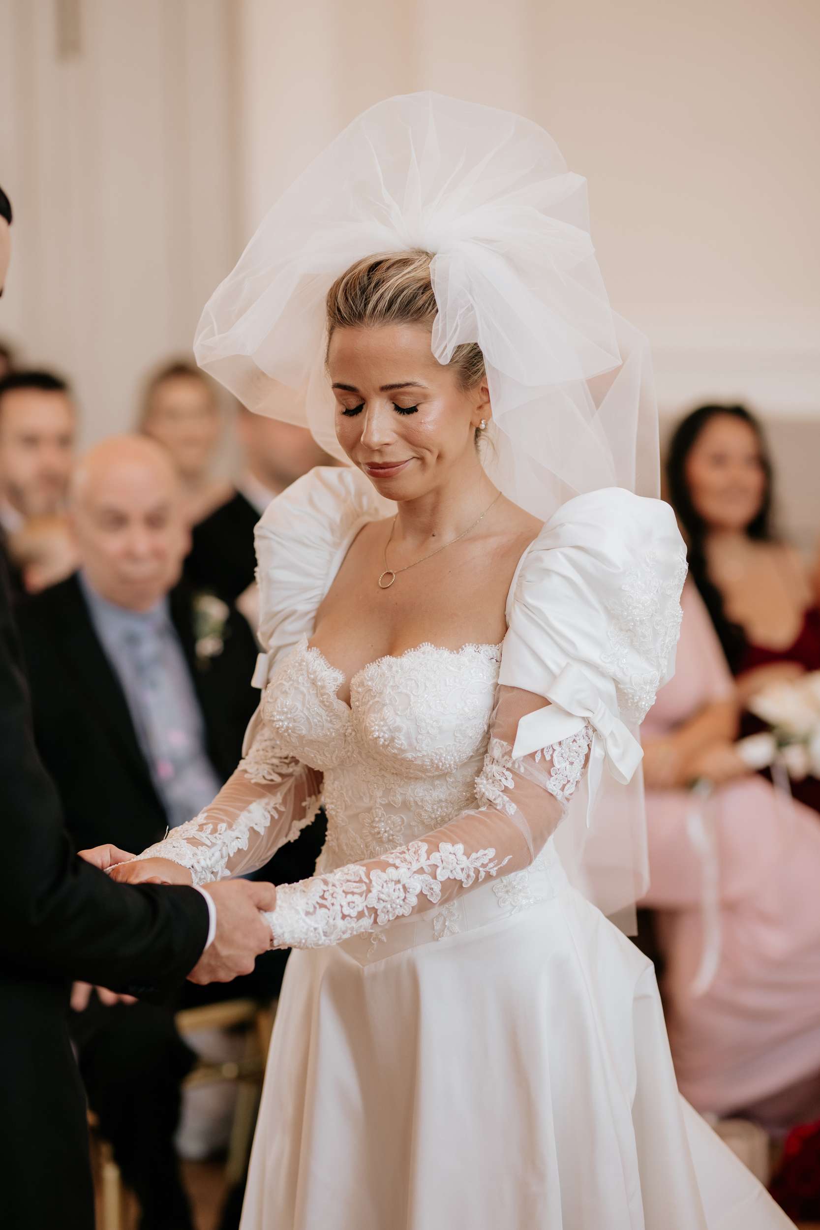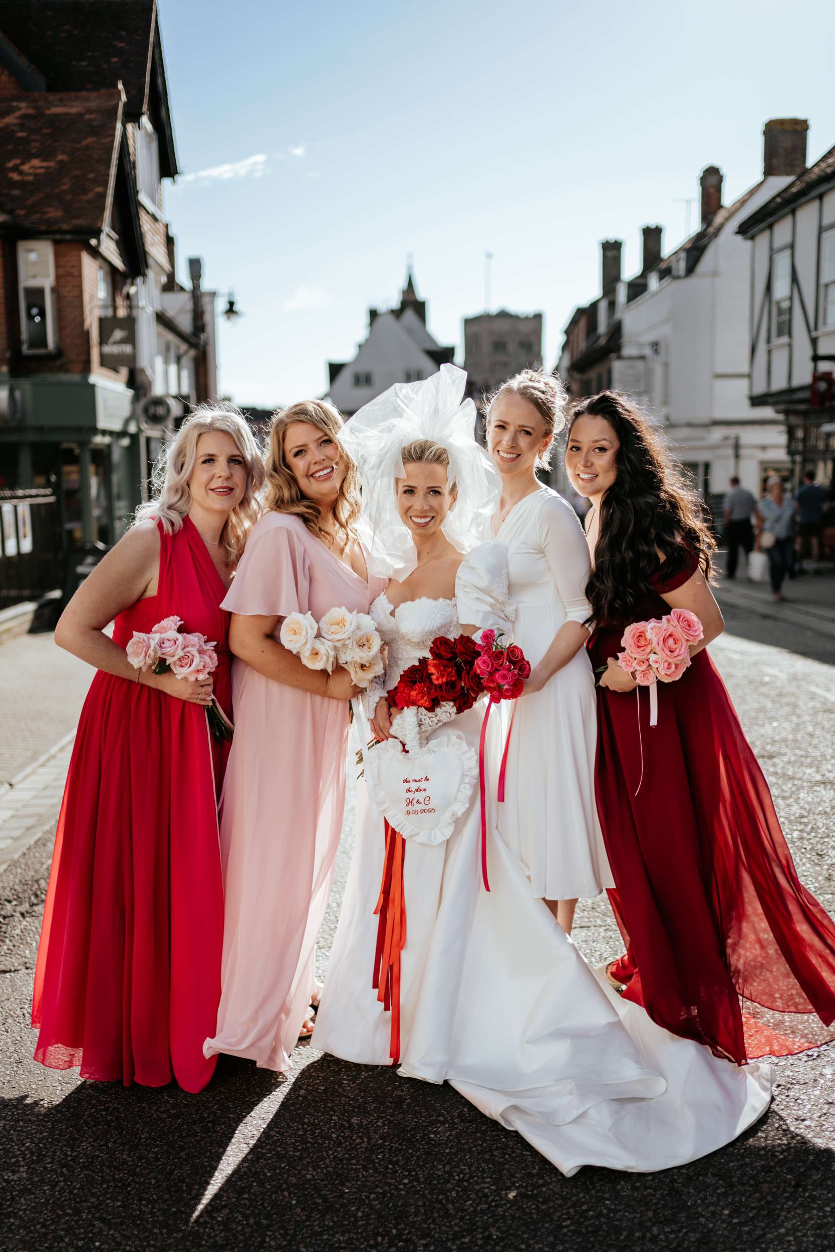 “Our inspiration was Guns ‘n’ Roses’ November Rain video, with the drama of Meatloaf’s I Would Do Anything For Love and Celine Dion’s It’s All Coming Back To Me!” Chloe explained. “A blend of classy 80s (we didn’t want it to look fancy dress!) and the 80s-does-the-50s style. We had lots of ribbons and bows, vintage cake, reds and pinks. My inspiration for the day started with the dress itself, which I always knew I wanted. I worked everything else around the dress, which proved difficult at times as Harry didn’t know what I was going to wear!” The dress was bespoke, made by Lisa Lyons, and designed specifically for Chloe’s body and brief.