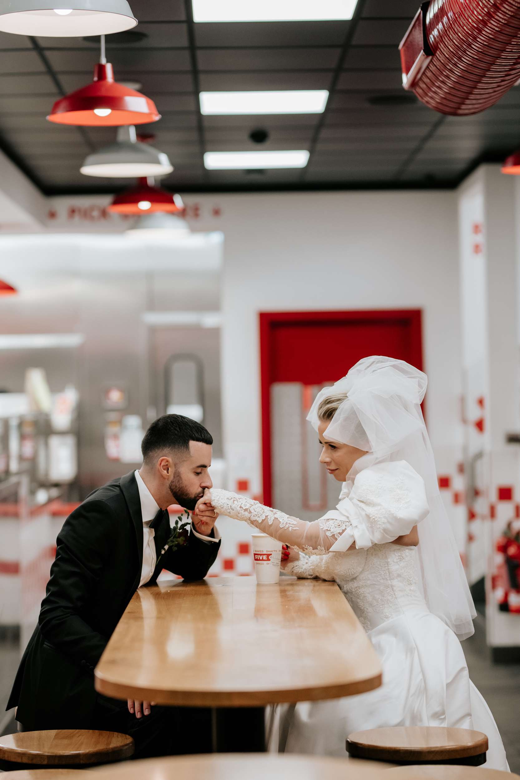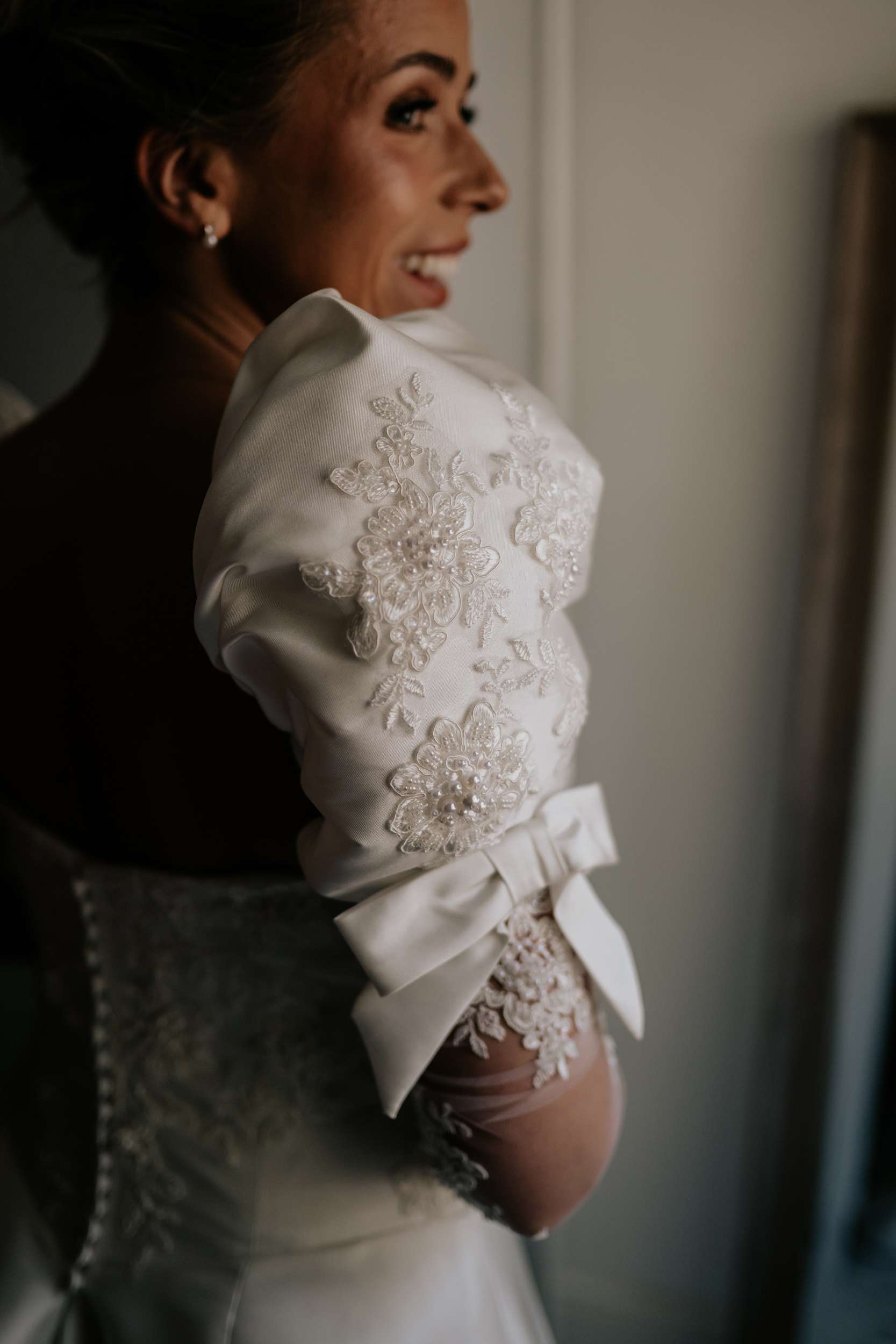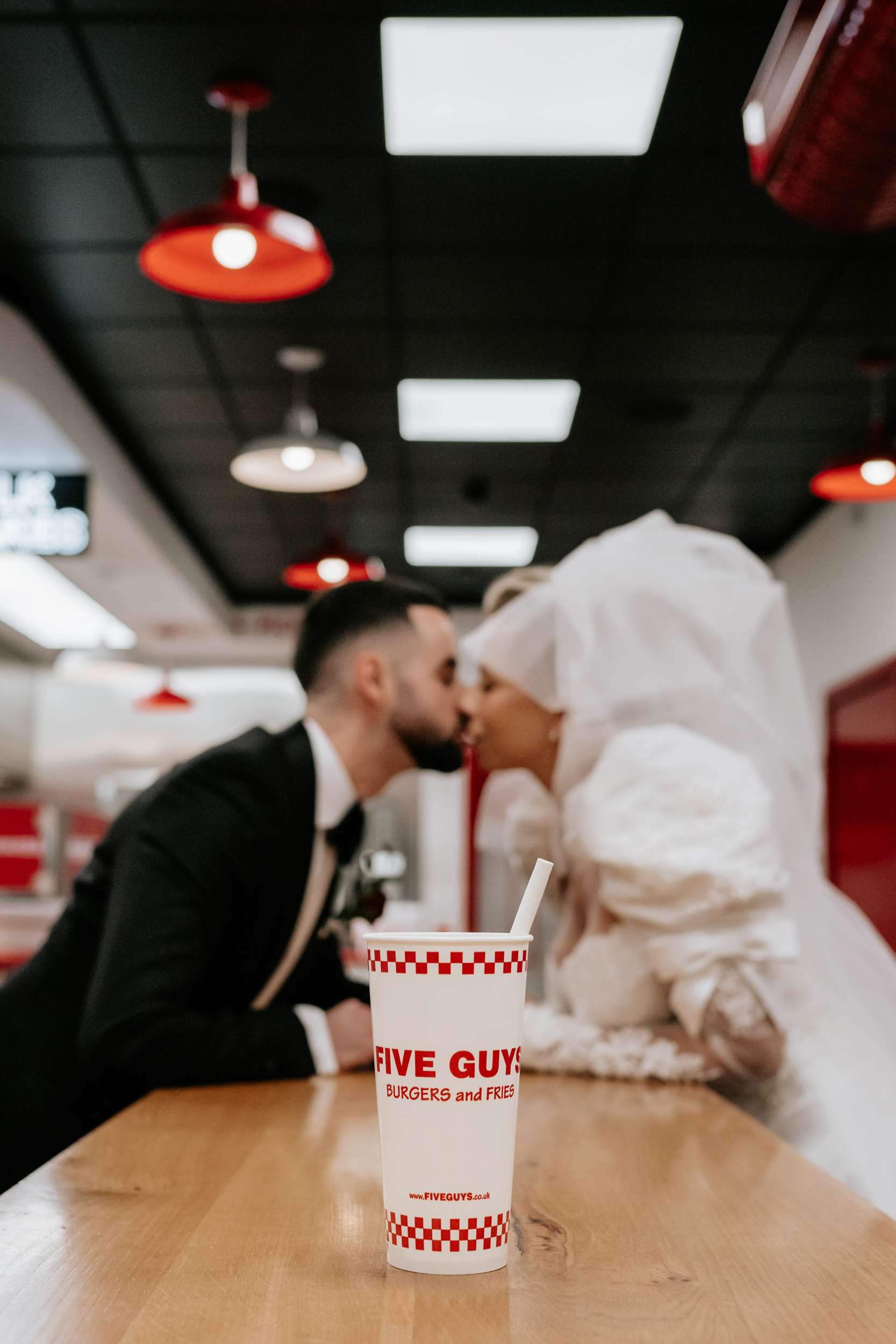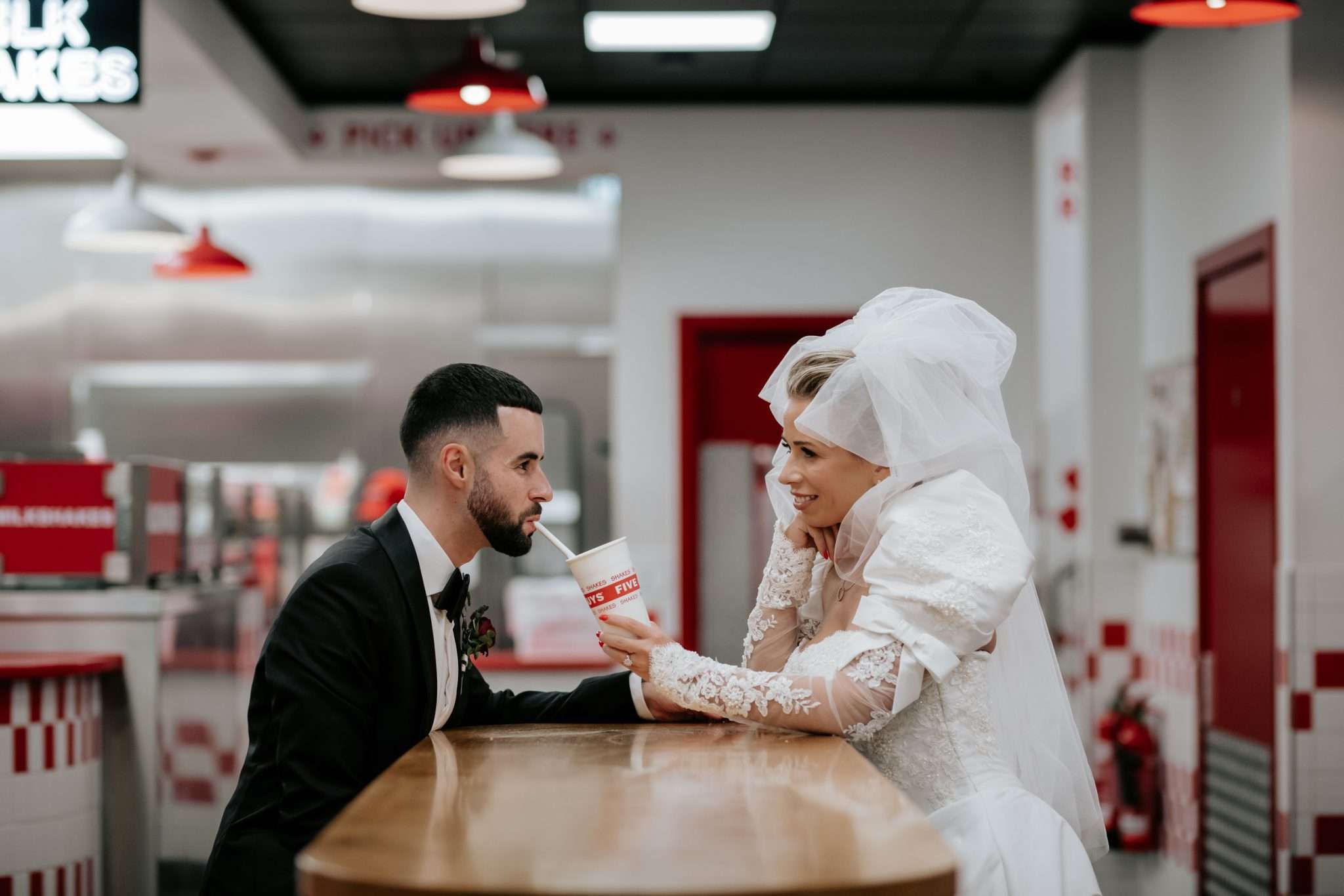“Our inspiration was Guns ‘n’ Roses’ November Rain video, with the drama of Meatloaf’s I Would Do Anything For Love and Celine Dion’s It’s All Coming Back To Me!” Chloe explained. “A blend of classy 80s (we didn’t want it to look fancy dress!) and the 80s-does-the-50s style. We had lots of ribbons and bows, vintage cake, reds and pinks. My inspiration for the day started with the dress itself, which I always knew I wanted. I worked everything else around the dress, which proved difficult at times as Harry didn’t know what I was going to wear!” The dress was bespoke, made by Lisa Lyons, and designed specifically for Chloe’s body and brief.