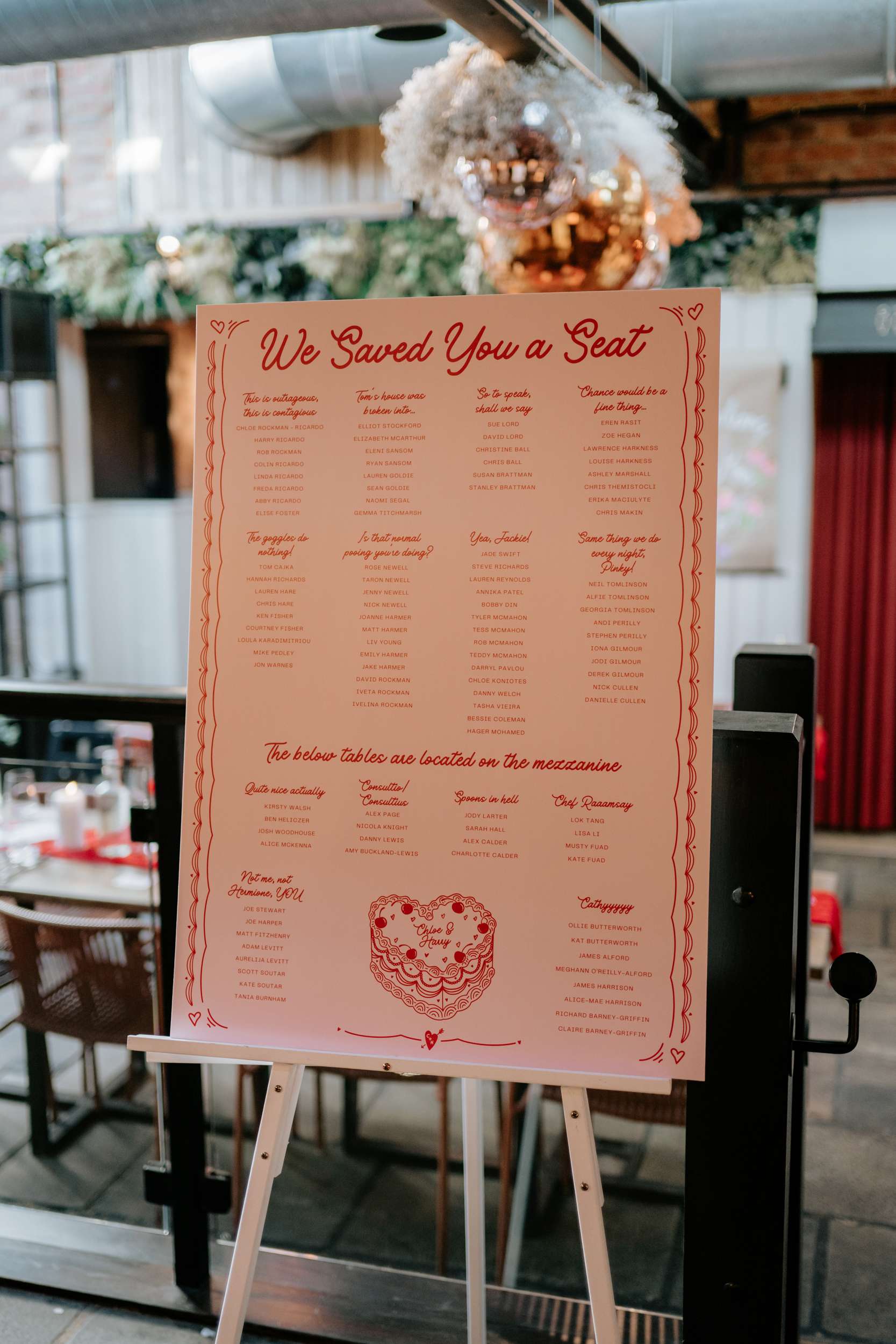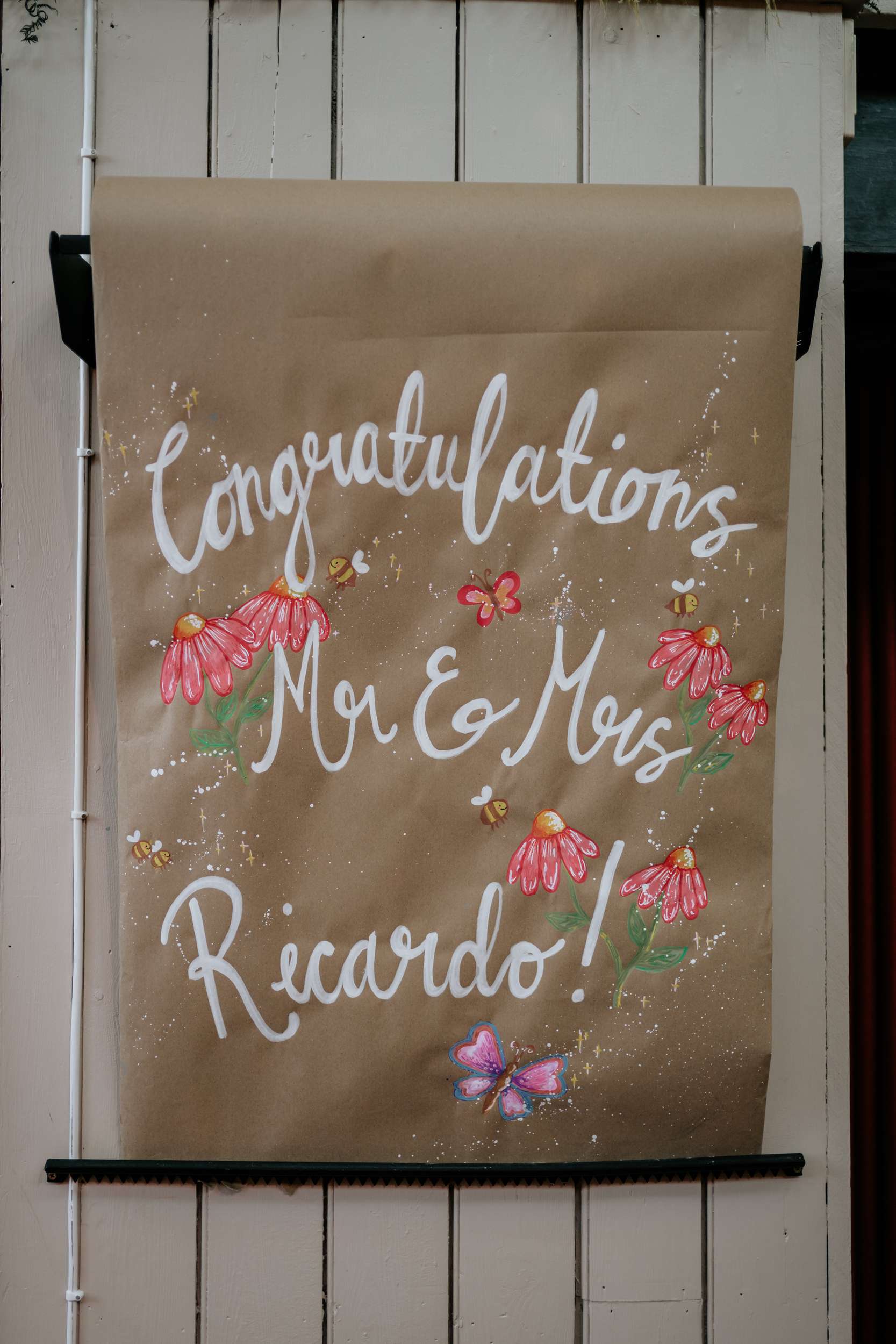 When they returned, the cake was cut and the first dance followed. The rest of the evening unfolded without too much structure or pressure. “When we came back, we did our cake cutting and then our first dance,” Chloe said. “Everyone’s place name was also a note card, and each table was a different year in the future. We asked guests to write us a message to read on each anniversary. Our table names were based on our own private jokes that meant nothing to anyone else!”