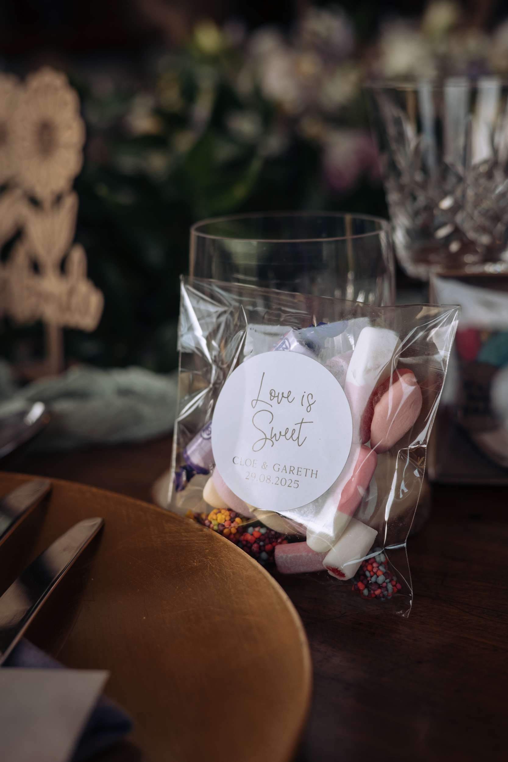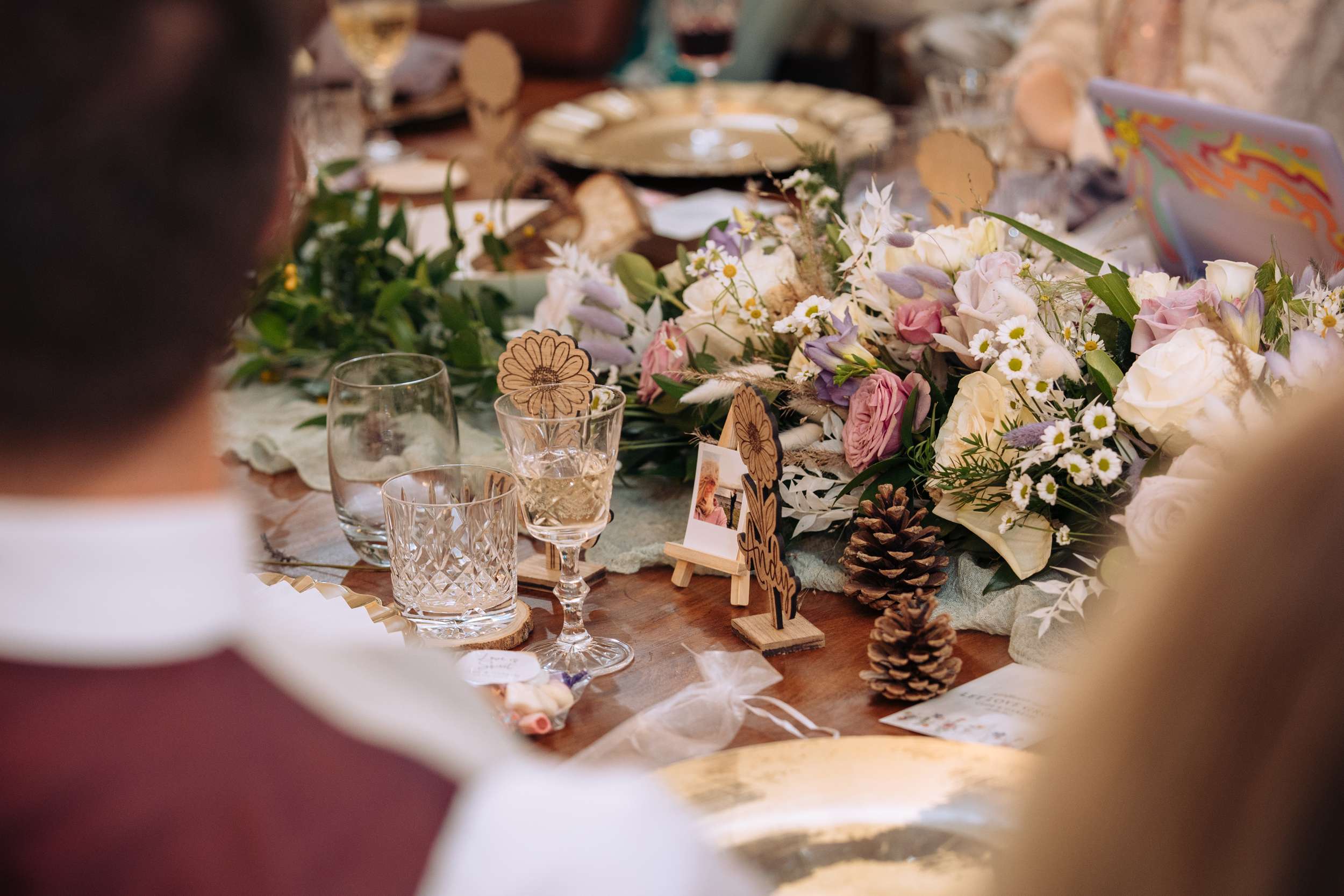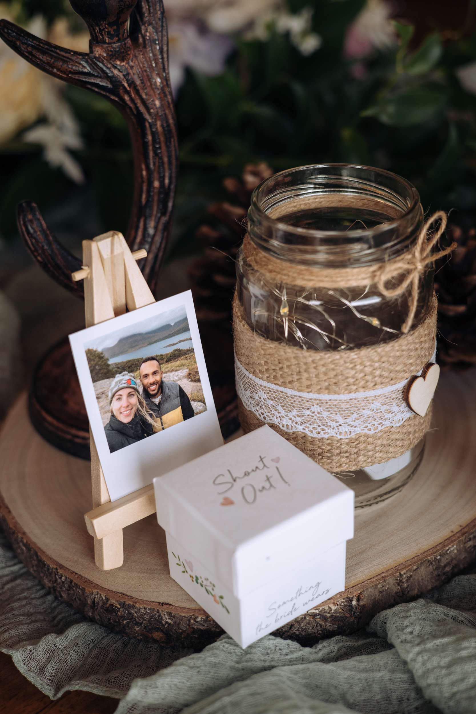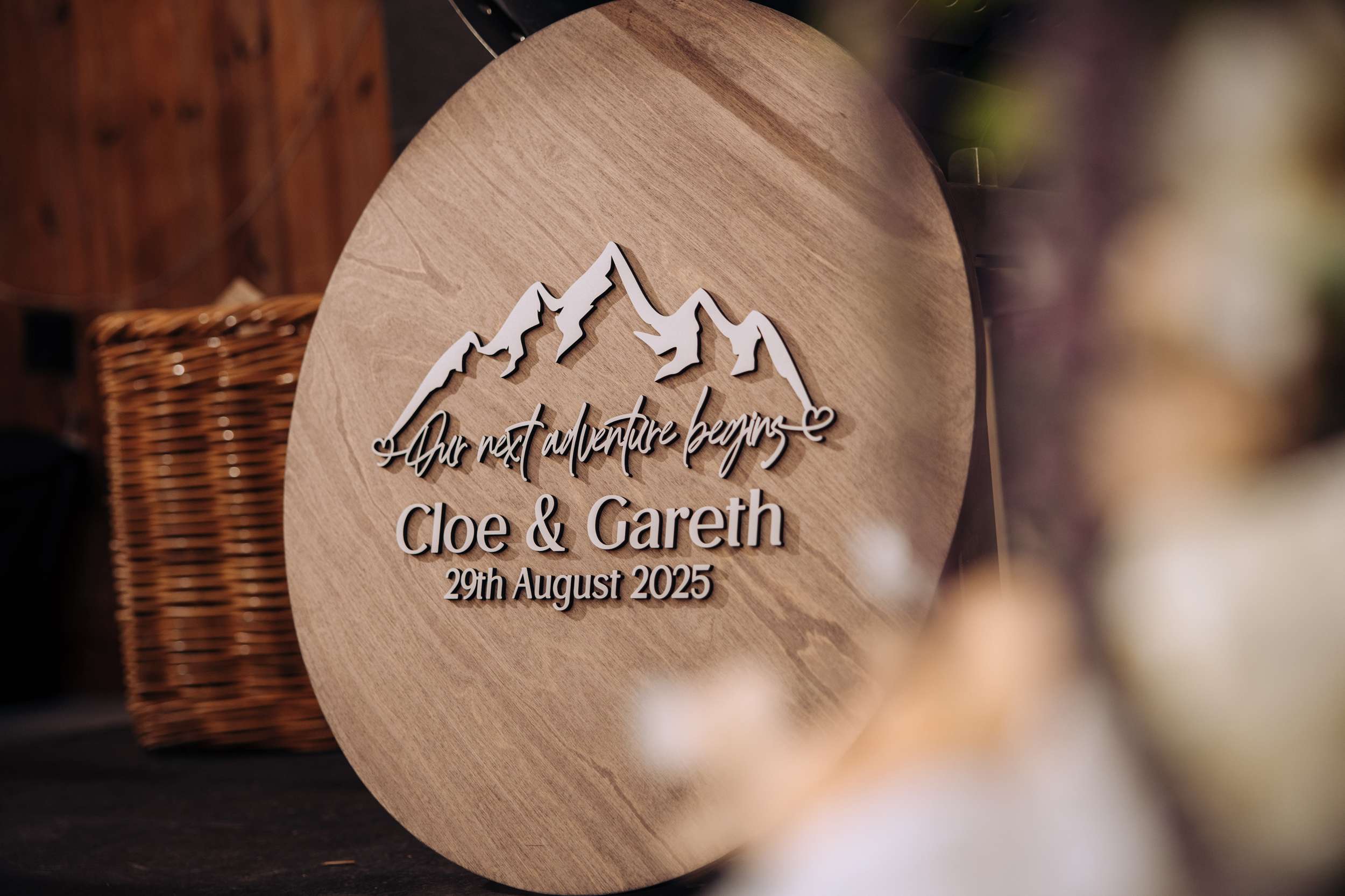 After the ceremony, and some rainy photos on the beach, everyone returned to the lodge. The ceilidh barn on the grounds became the centre of the evening. Guests helped decorate it together. Bunting was strung up, a flower arch was assembled, and retro prints from Cloe and Gareth’s life together were pegged onto string around the space. A mountain-shaped sign with their names and wedding date sat on an easel, filled with handwritten messages by the end of the night.