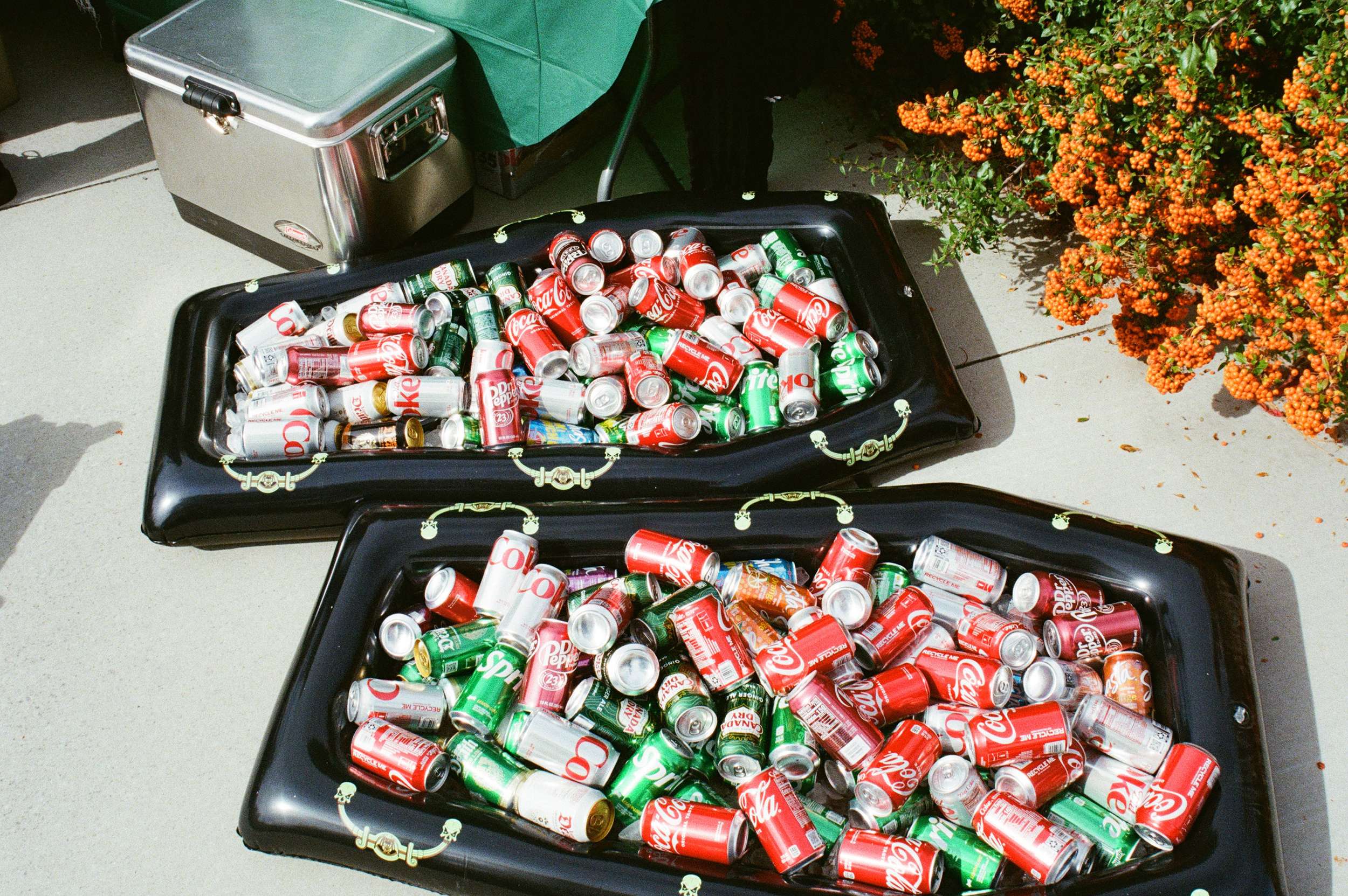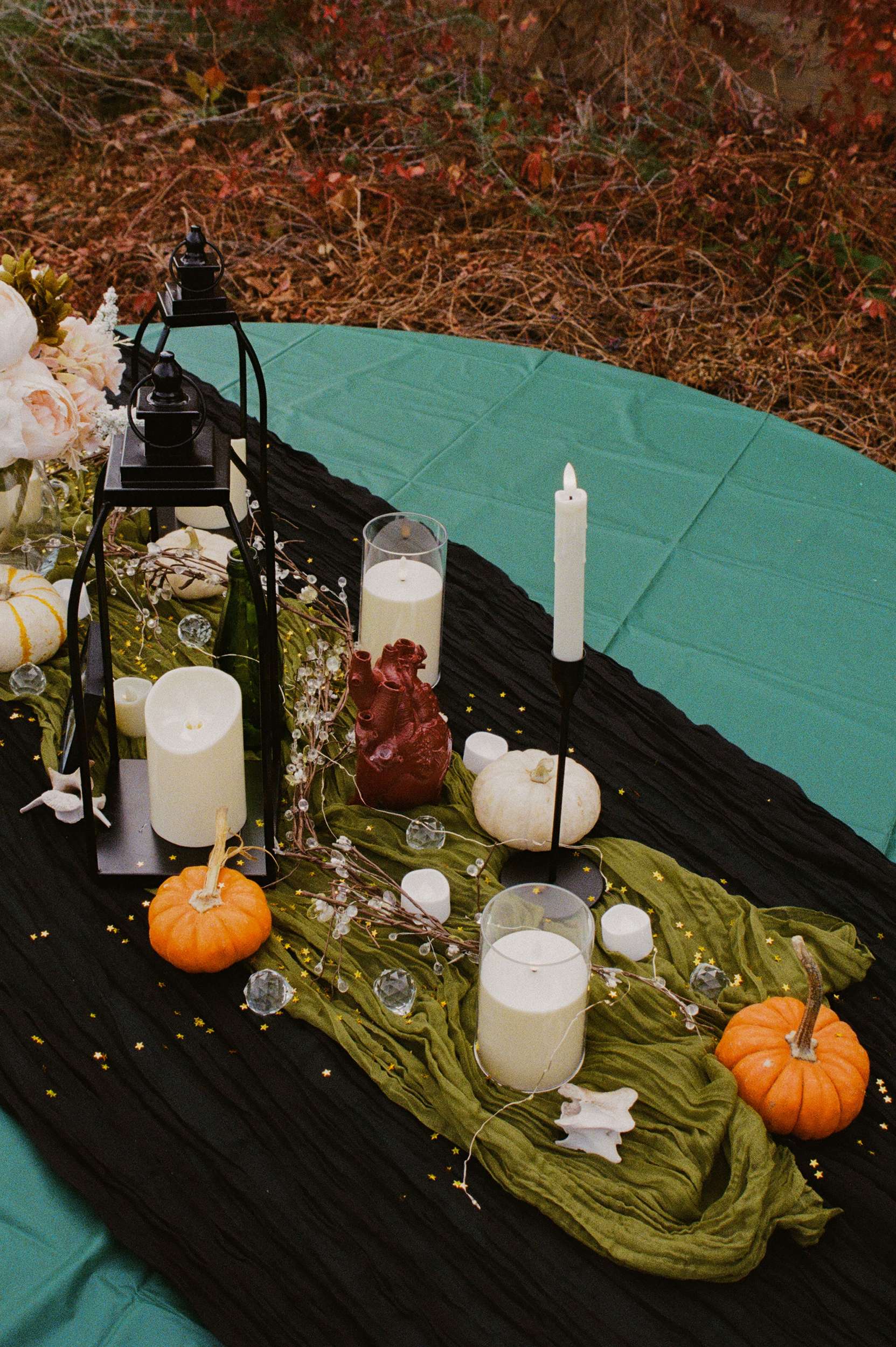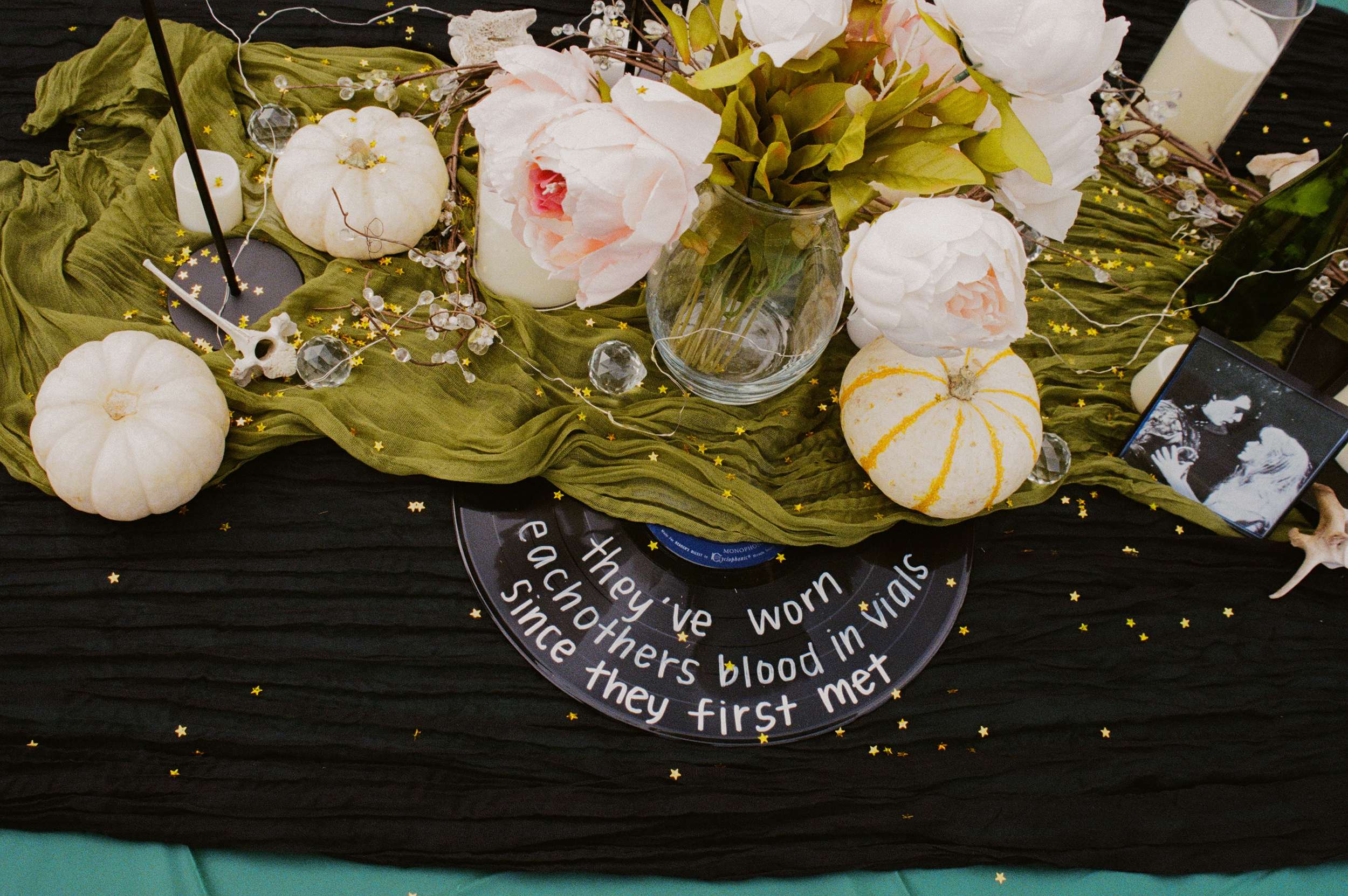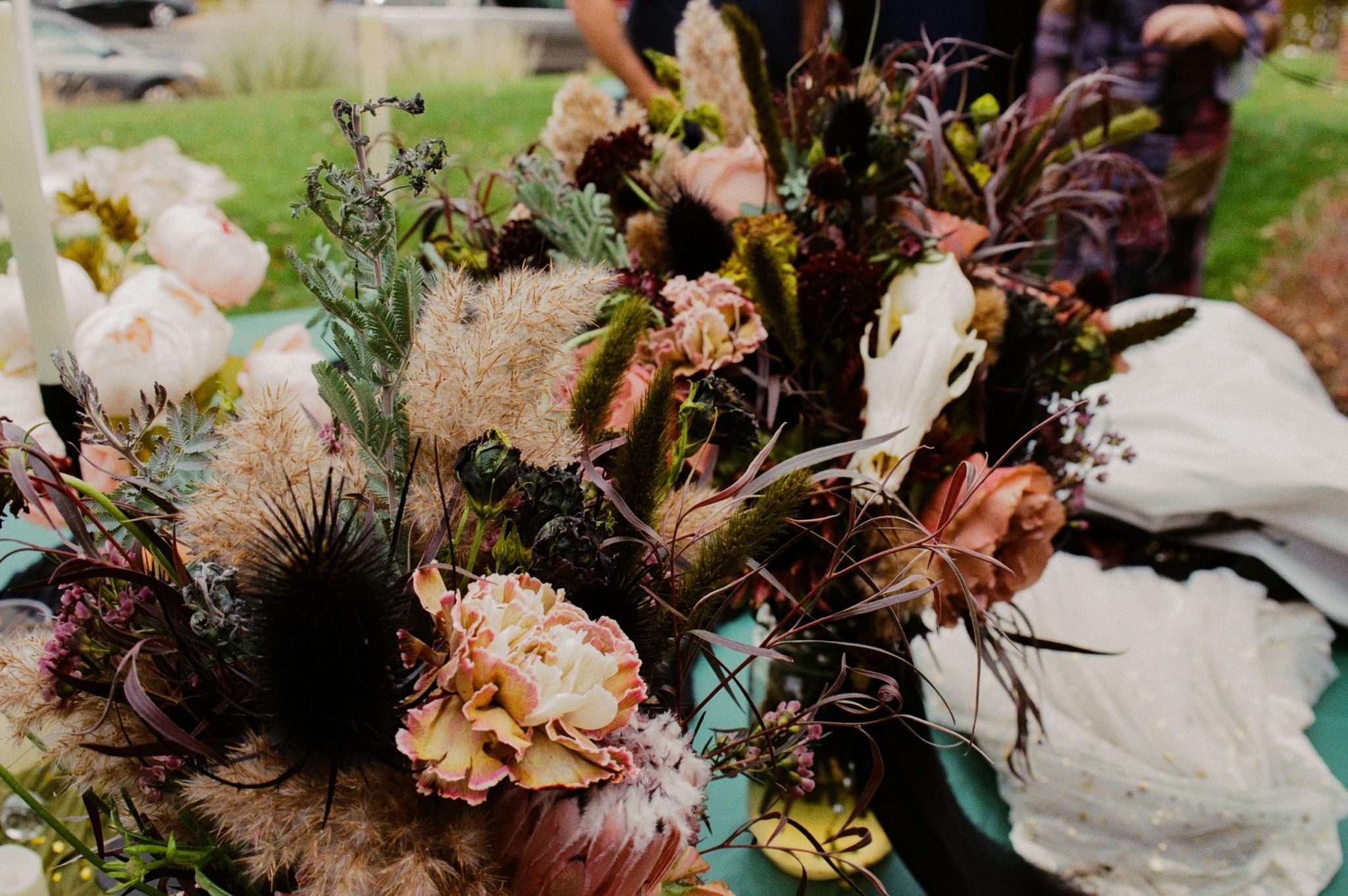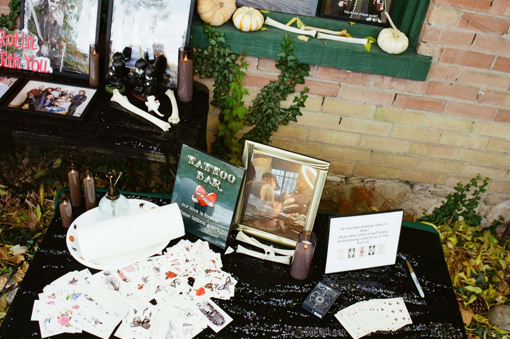 Their theme was ‘death, but they didn’t want it to feel macabre or gothic. A giant coffin held gifts. ‘Til death do we part’ motifs appeared throughout the day. Cleaned and scavenged bones were worked into the styling, a nod to their shared love of oddities. “We wanted the day to be a true reflection of us, all of our weird interests displayed in one day,” Amelia continued. ” We also incorporated our love of tattoos. I am a a tattoo artist, and so we wanted that to be a big part of our day. We had an on-site tattoo artist doing