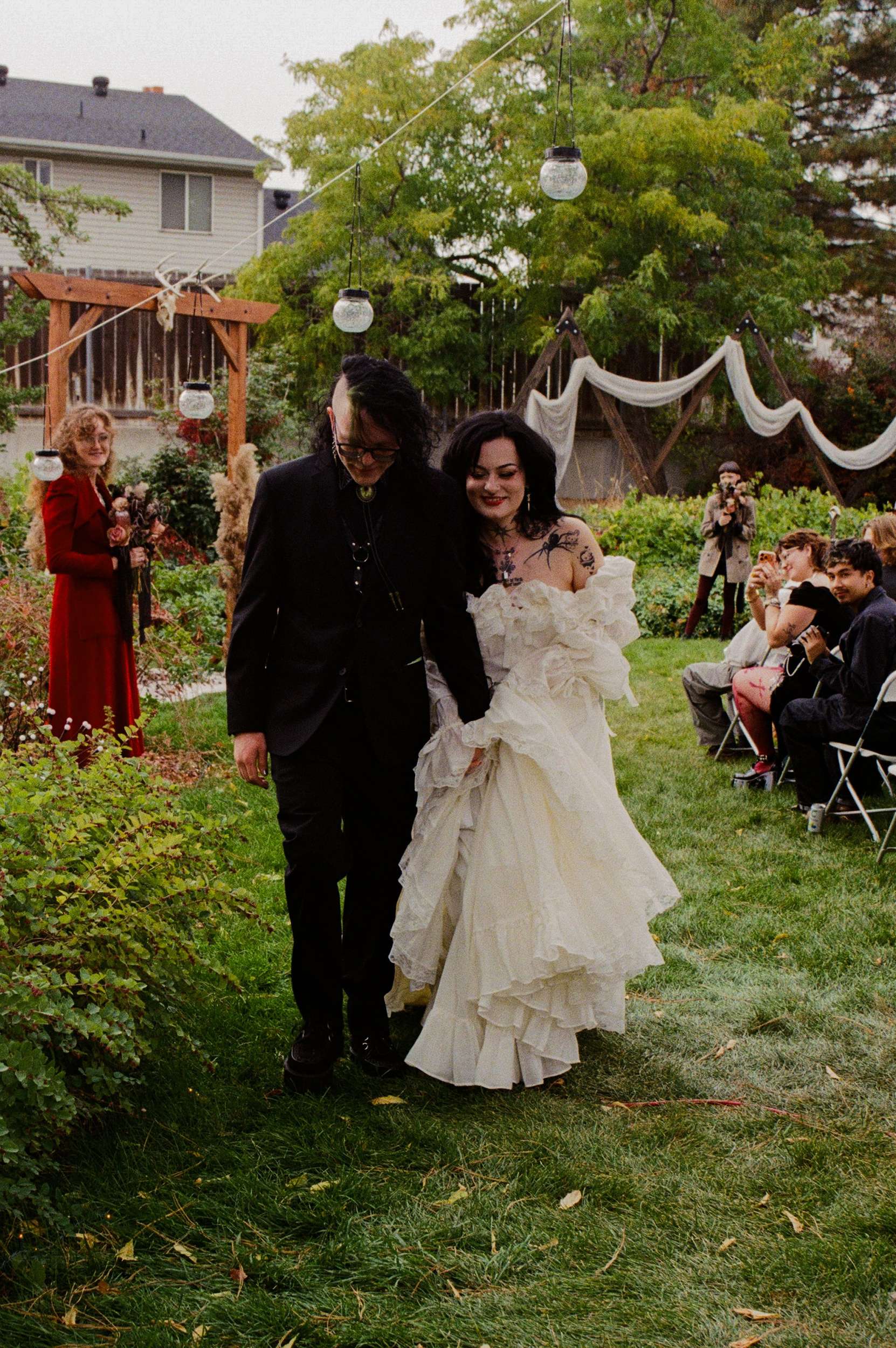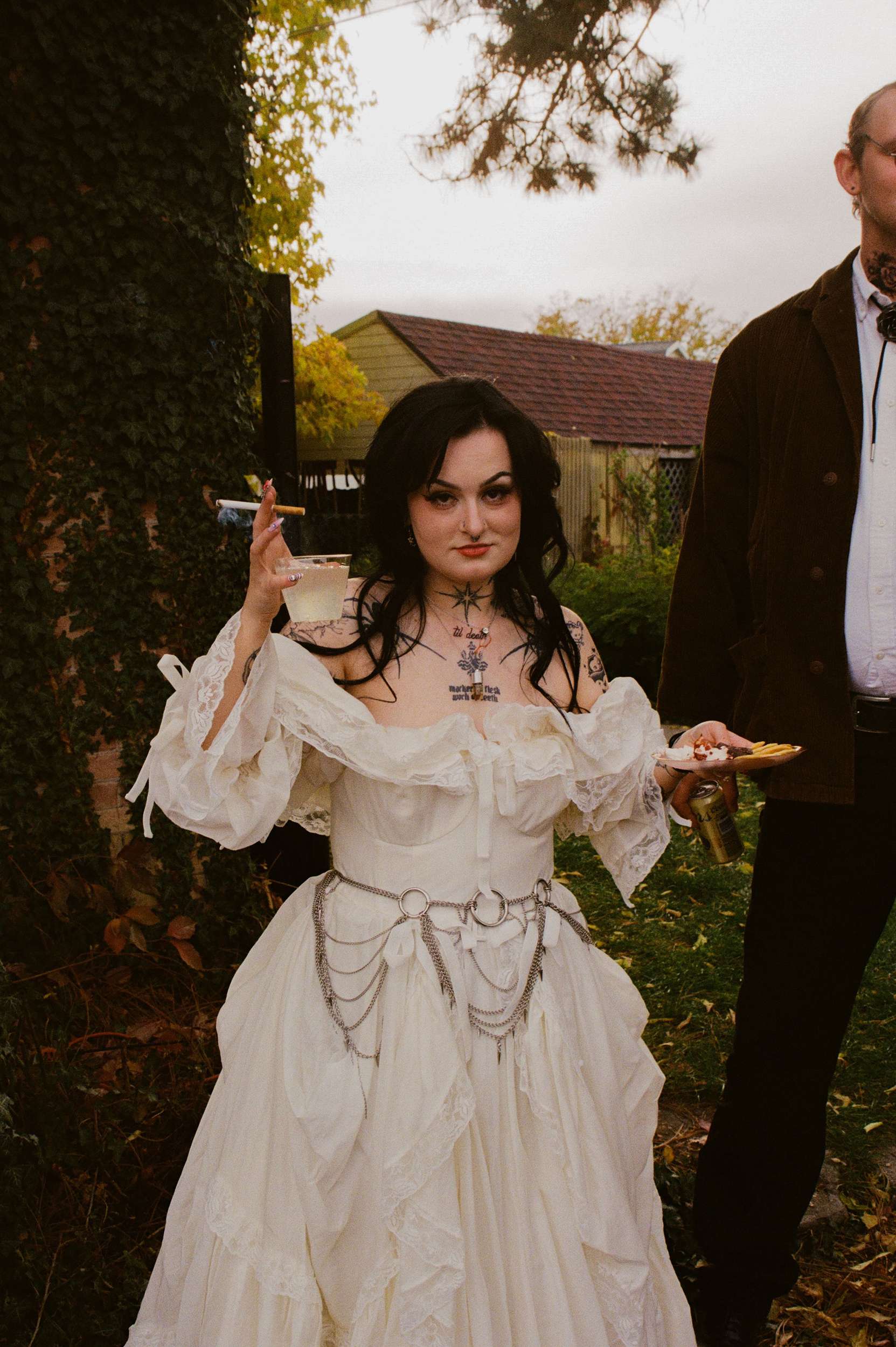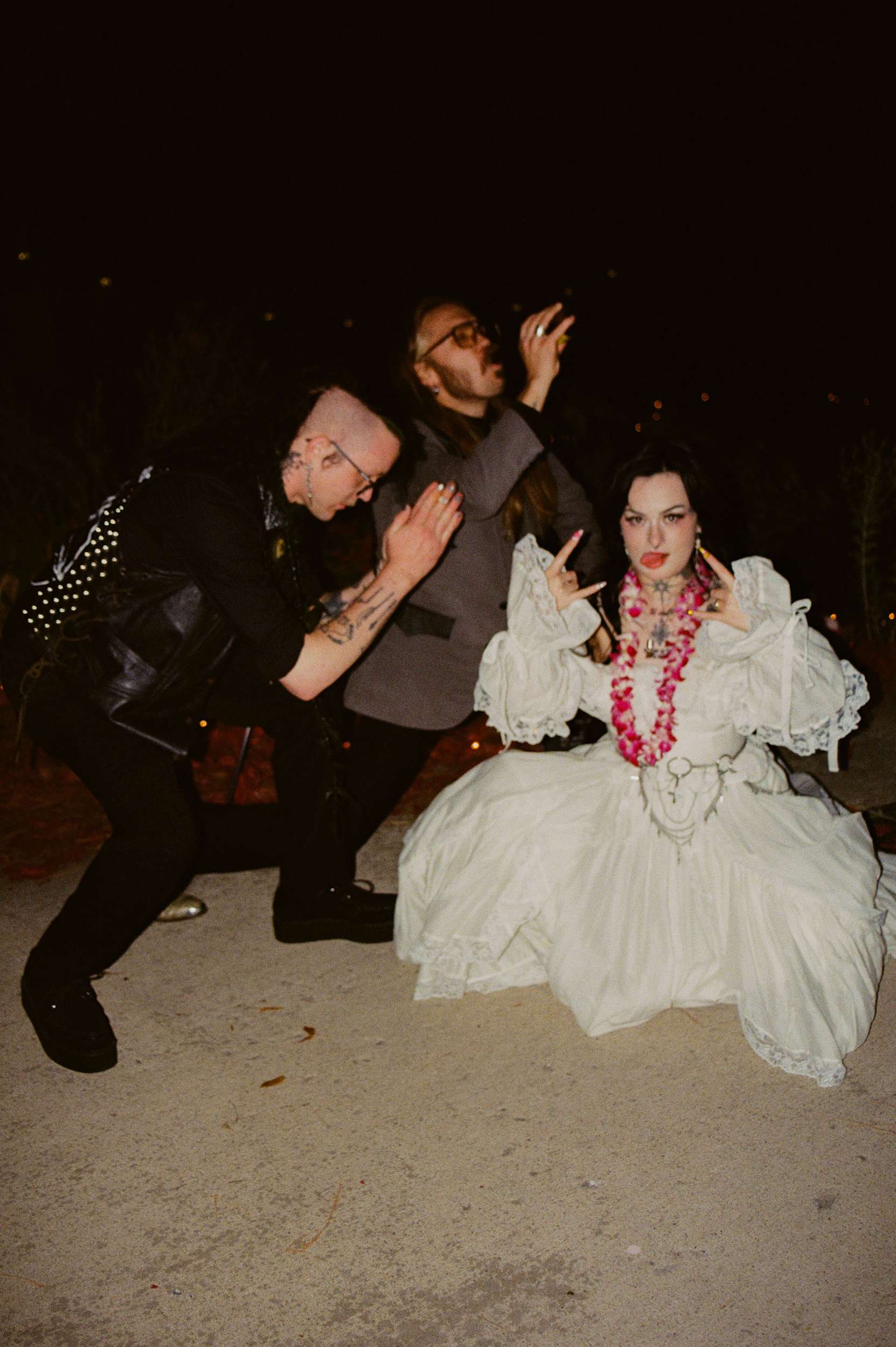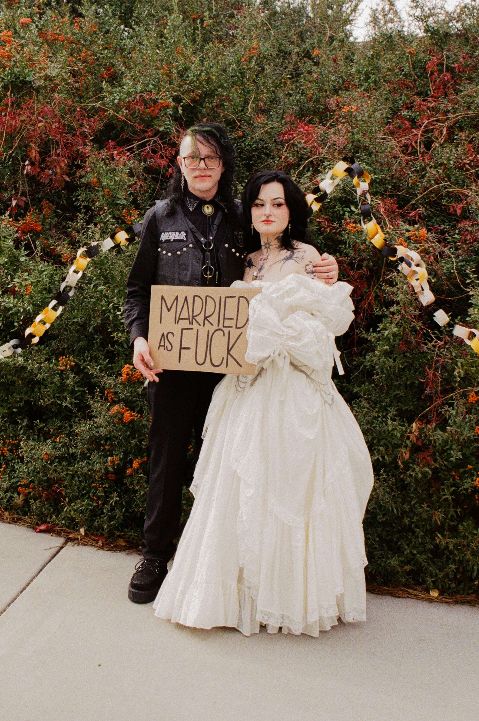 Amelia wore a Selkie dress with a custom cathedral-style chainmail belt, creepers, floral details and embroidered shoes. Bryson wore a handmade leather biker jacket, studded, patched and embroidered by hand, finished with Demonia creepers. The looks felt lived-in and personal, not styled for anyone else’s approval.