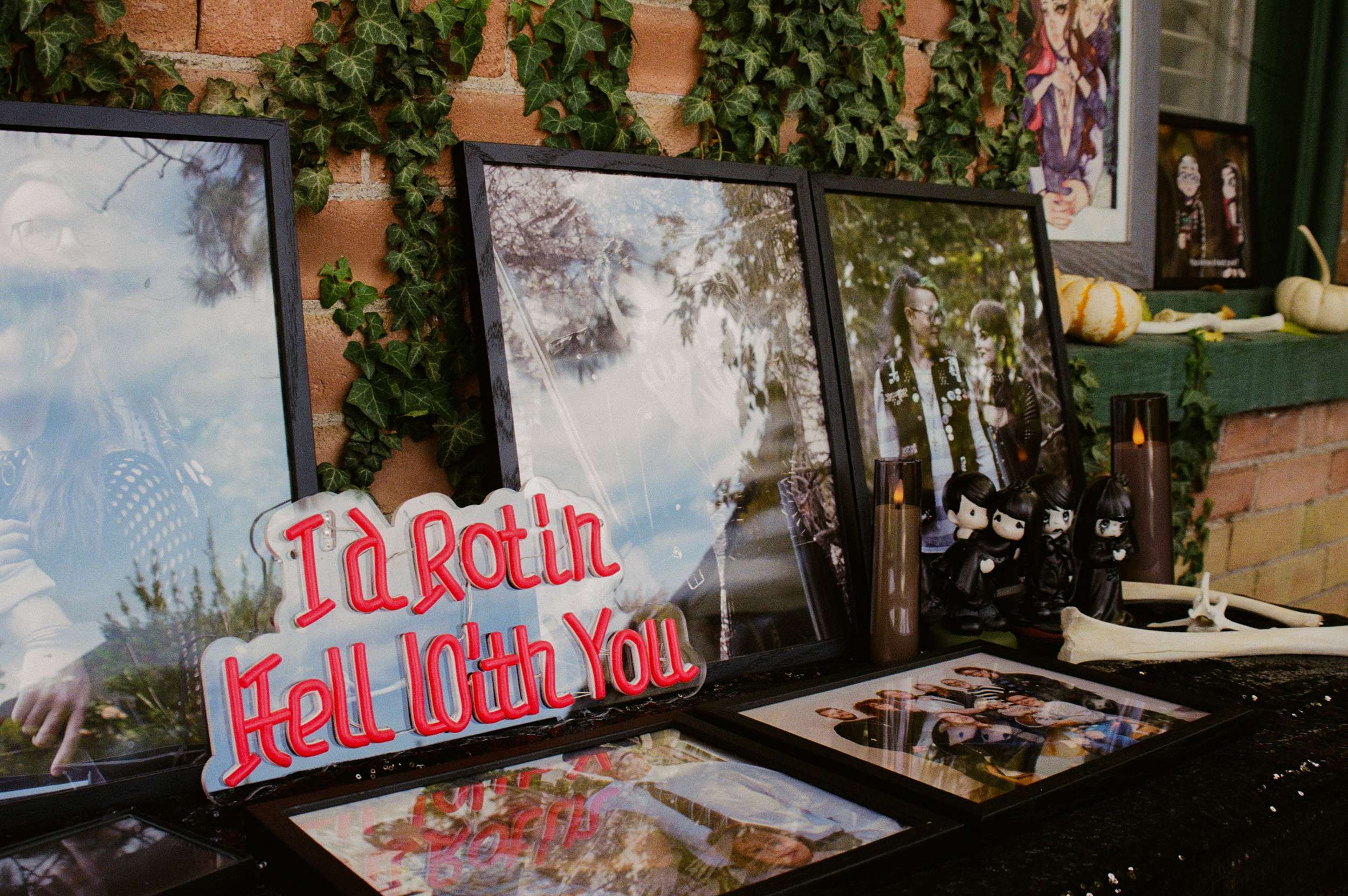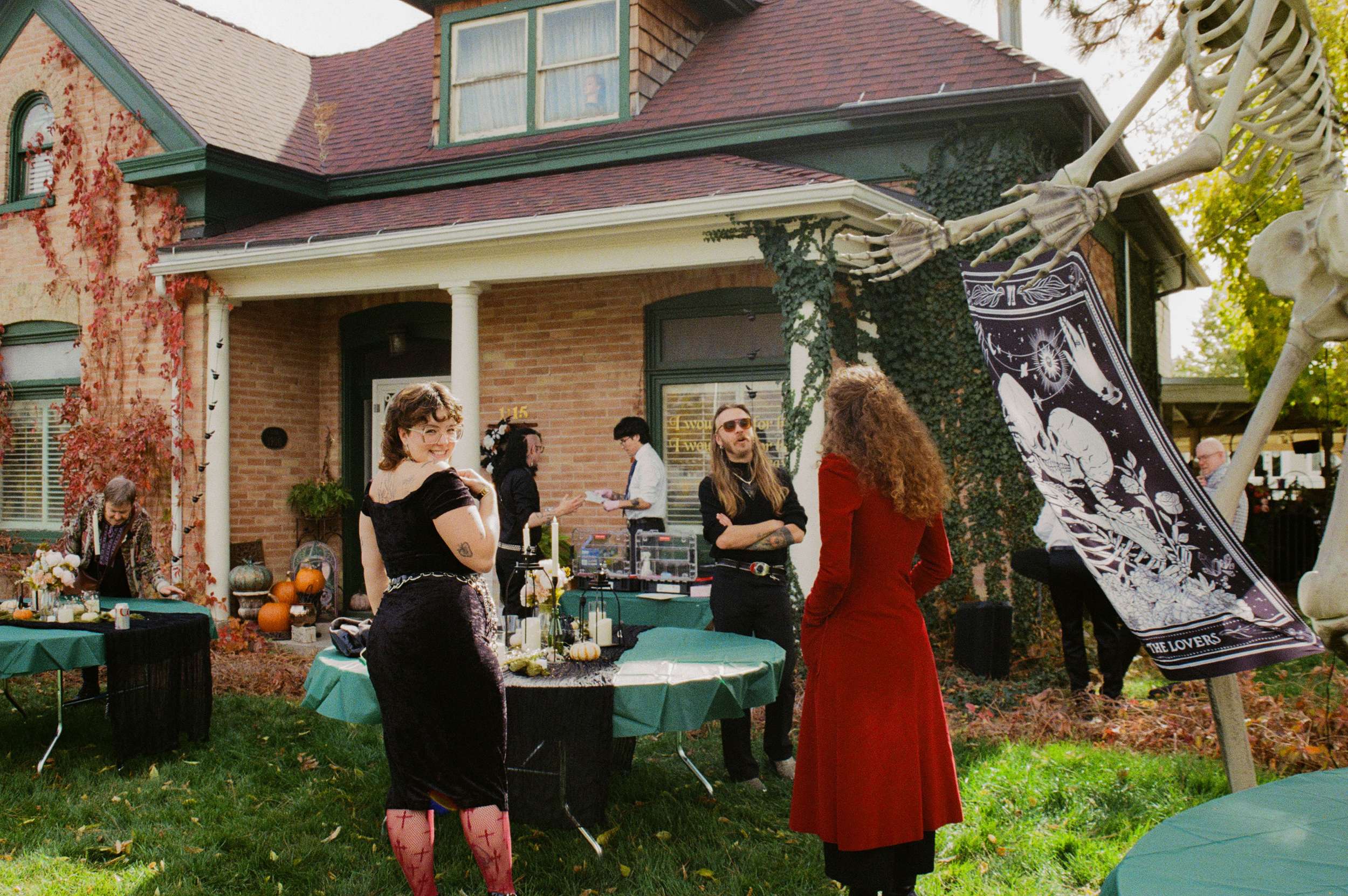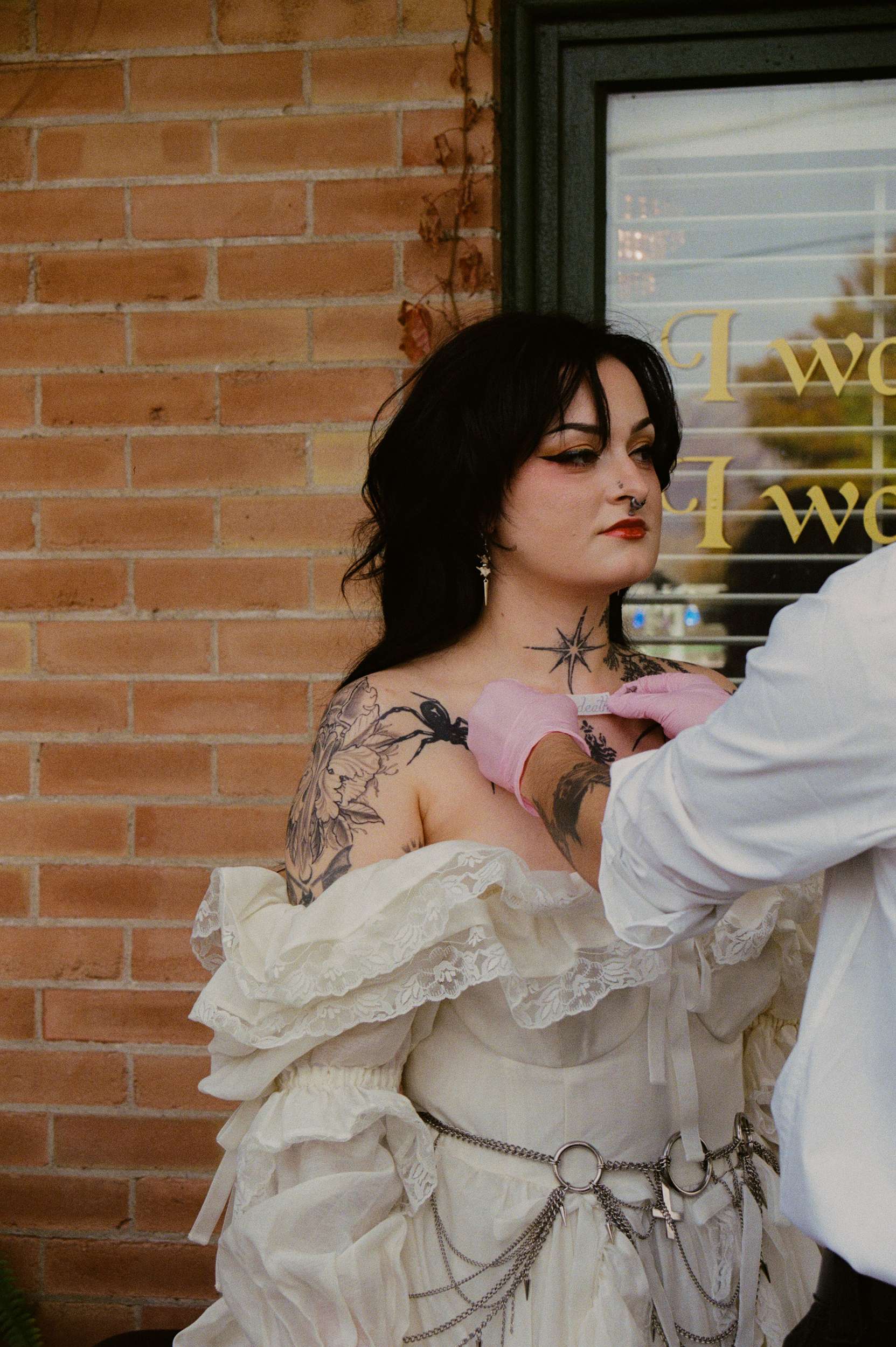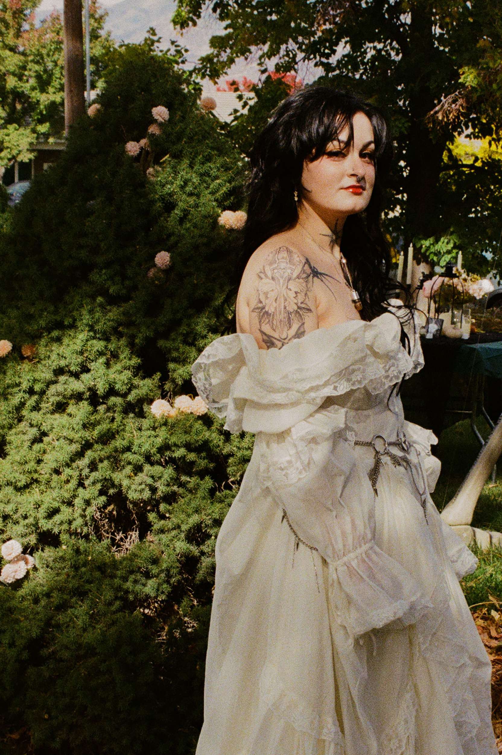 Amelia wore a Selkie dress with a custom cathedral-style chainmail belt, creepers, floral details and embroidered shoes. Bryson wore a handmade leather biker jacket, studded, patched and embroidered by hand, finished with Demonia creepers. The looks felt lived-in and personal, not styled for anyone else’s approval.