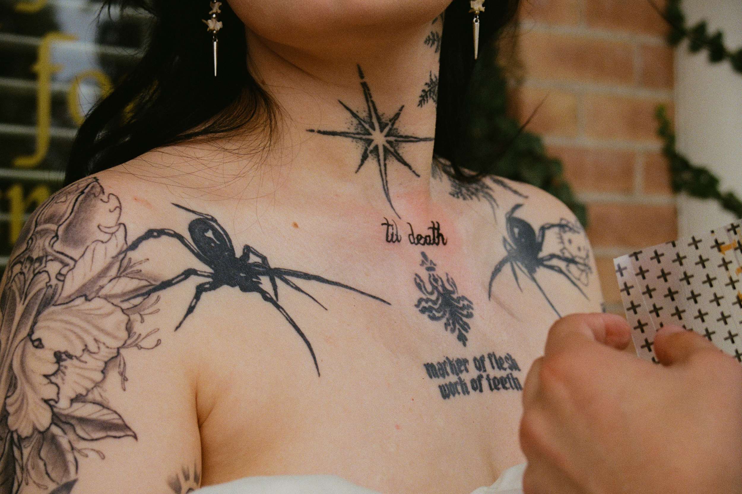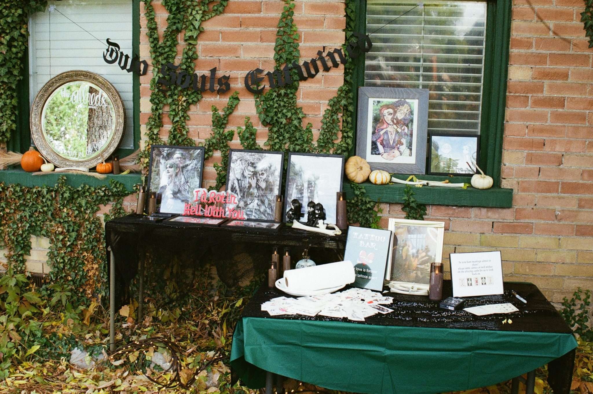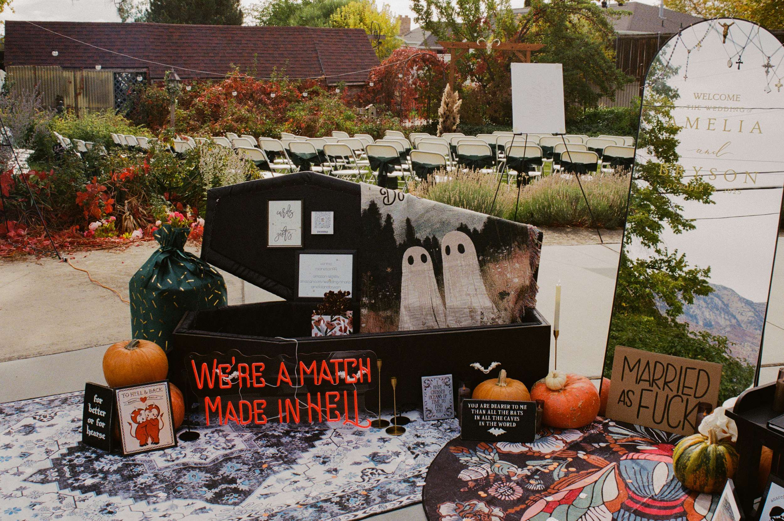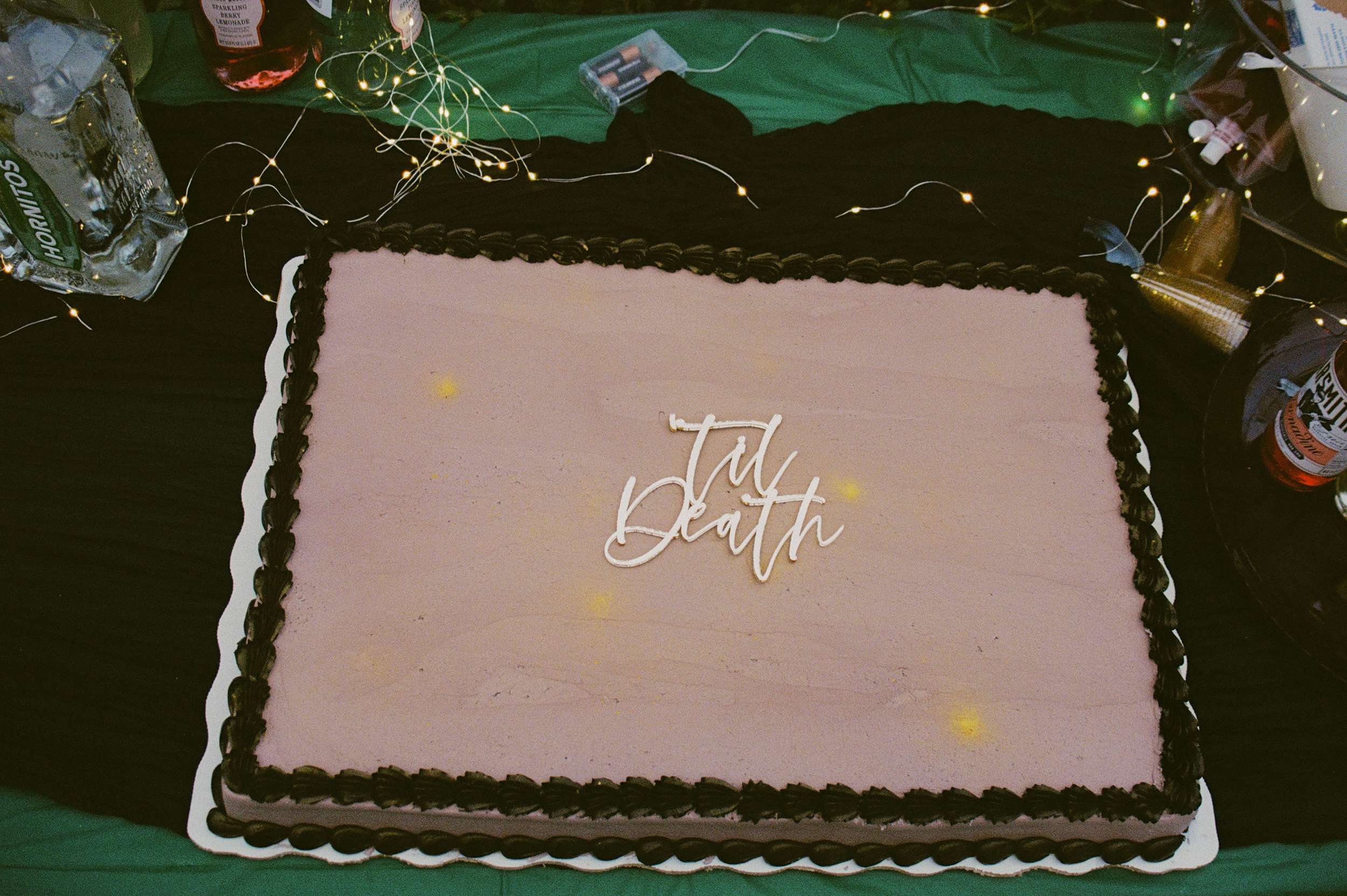 Their officiant AJ, who is also their tattoo artist, designed their names as a death metal logo. The couple turned it into handmade pins and set up a merch table, handing them out like band badges.