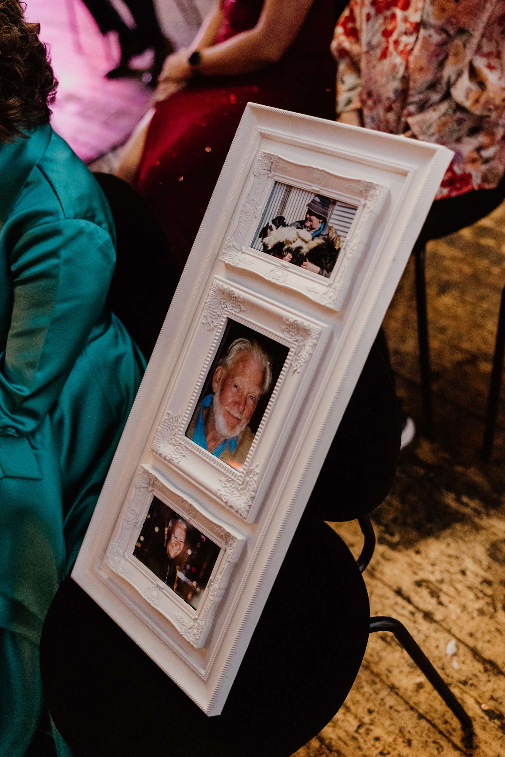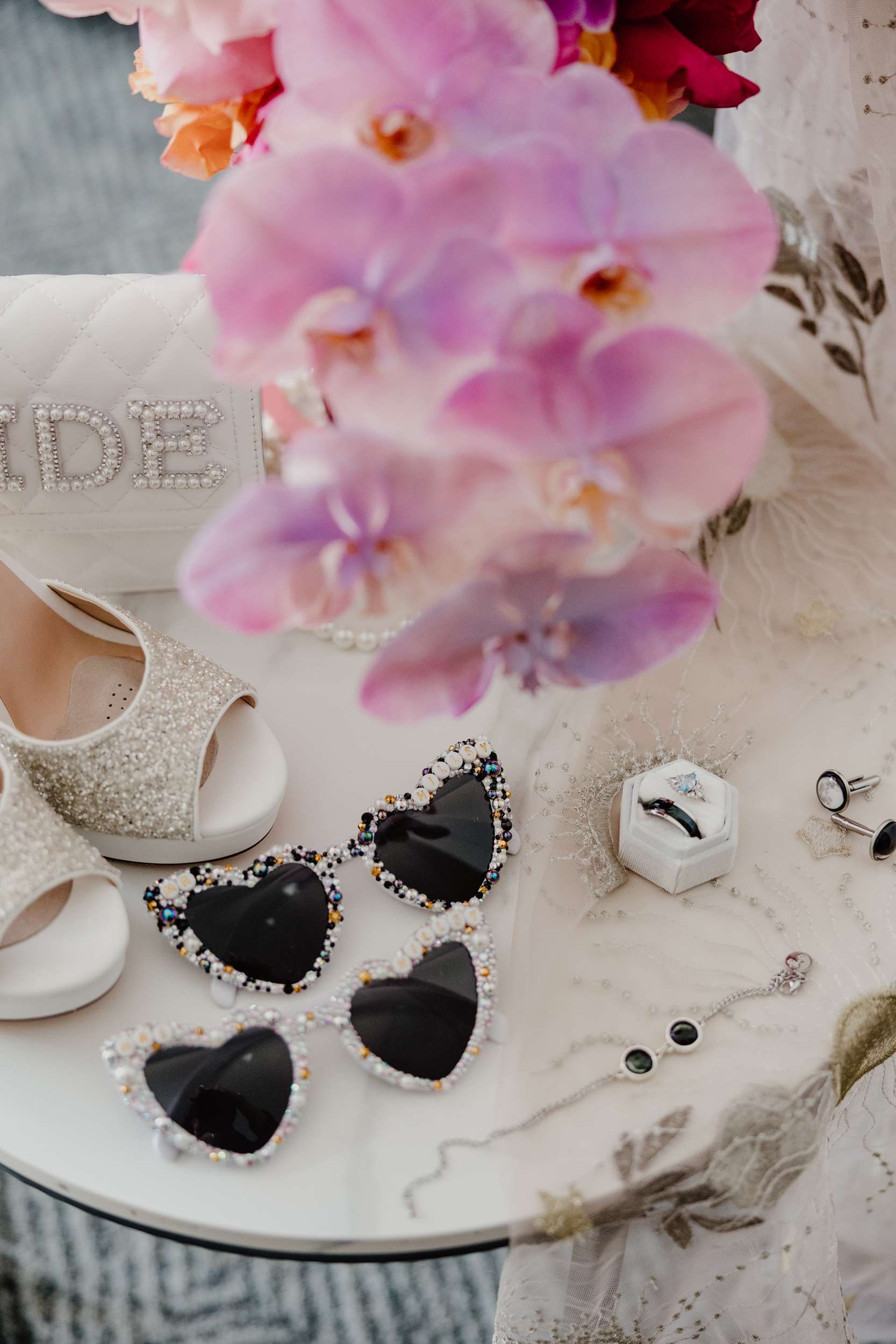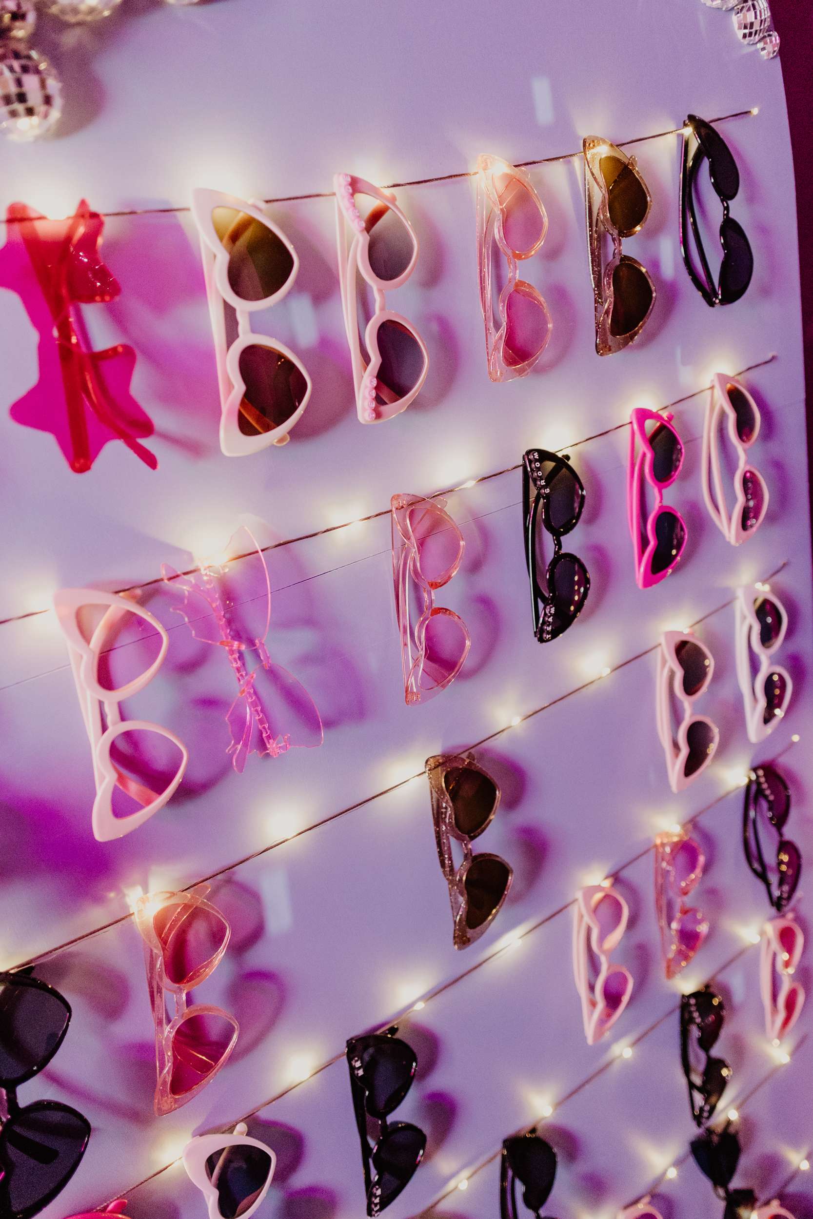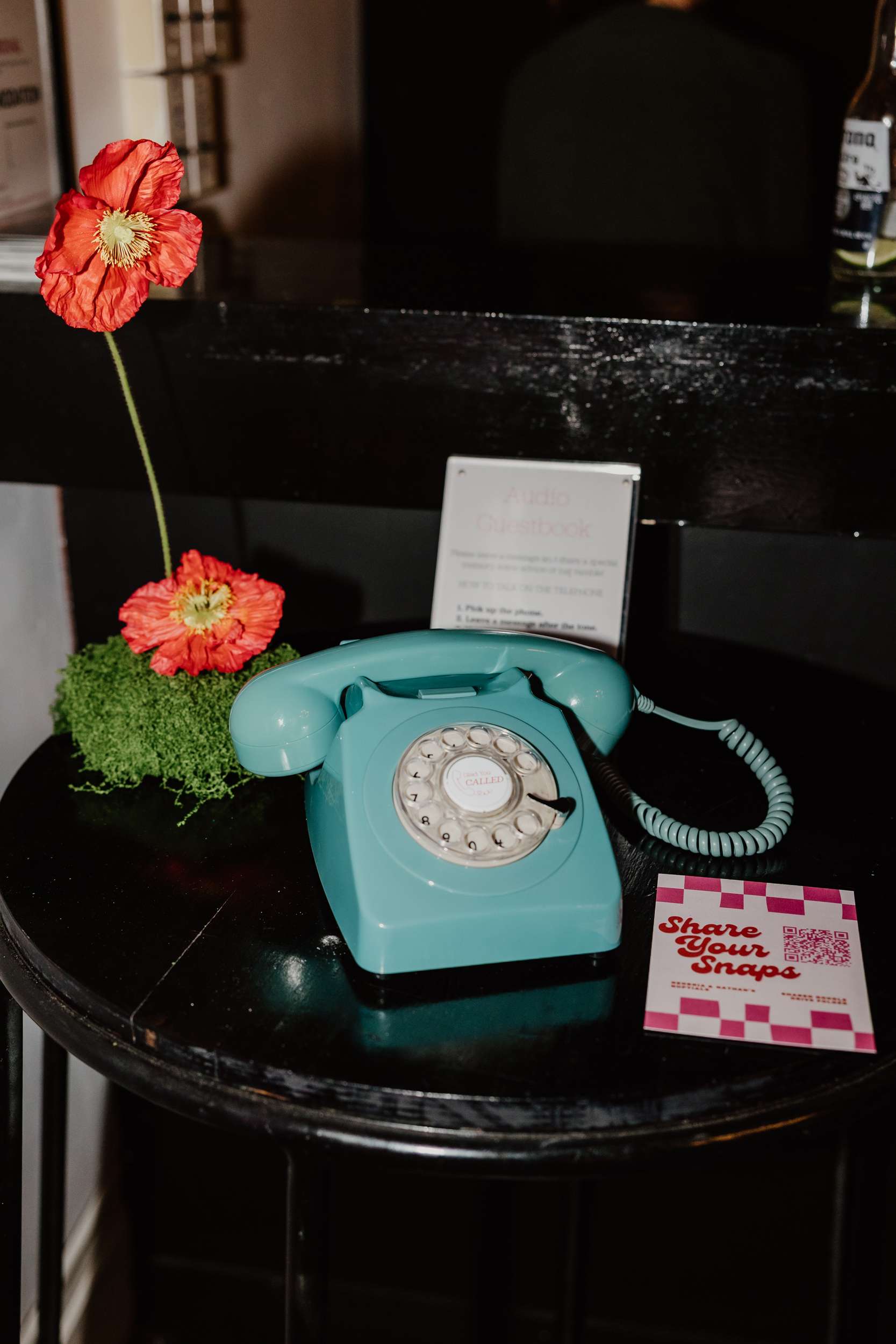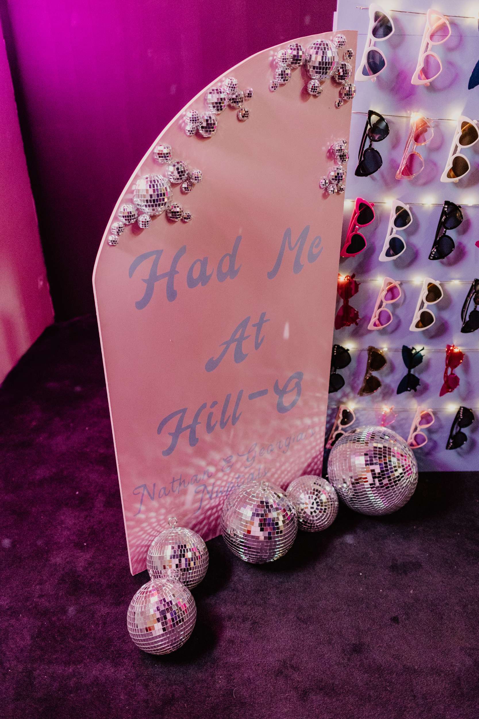 “It was important to me to ensure a safe space for our neurodiverse guests”, Georgia continued. “We made sure to have a range of foods available in small sizes so everyone could eat freely all night, rather than a more formal sit-down dinner, and a separate room from the dancefloor with board games and couches as a de-stimulation area. We had a phone guestbook making its way around to everyone all night, and a temporary tattoo station that the guests completely ransacked! Our fave addition was a DIY sunglasses wall sign to welcome guests, designed and decorated by me, built by Nathan’s dad and painted by Nathan’s sister.”