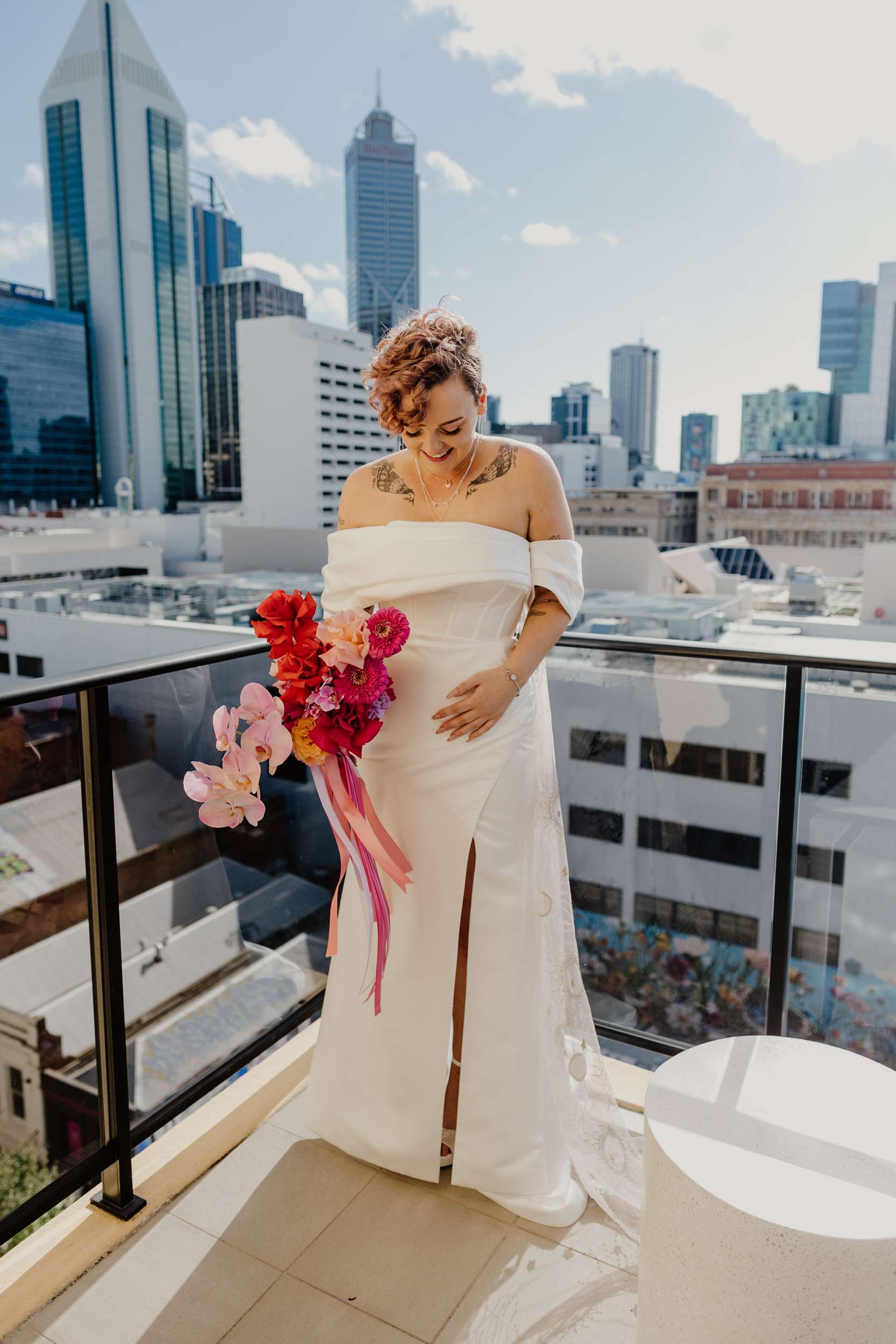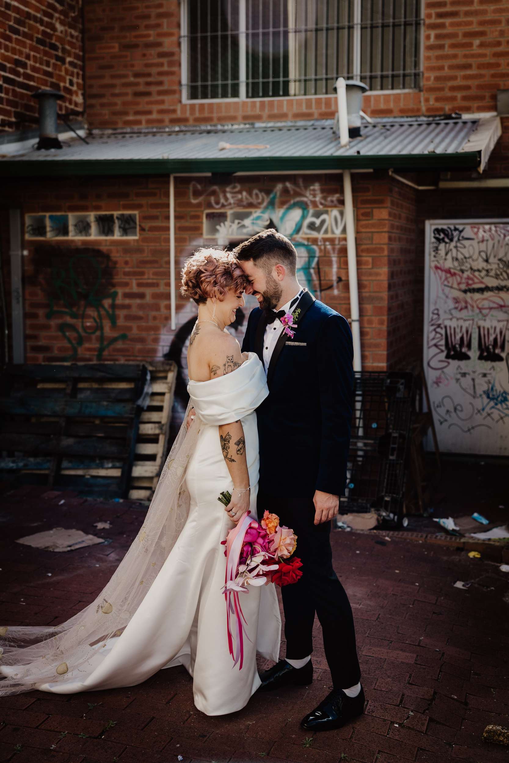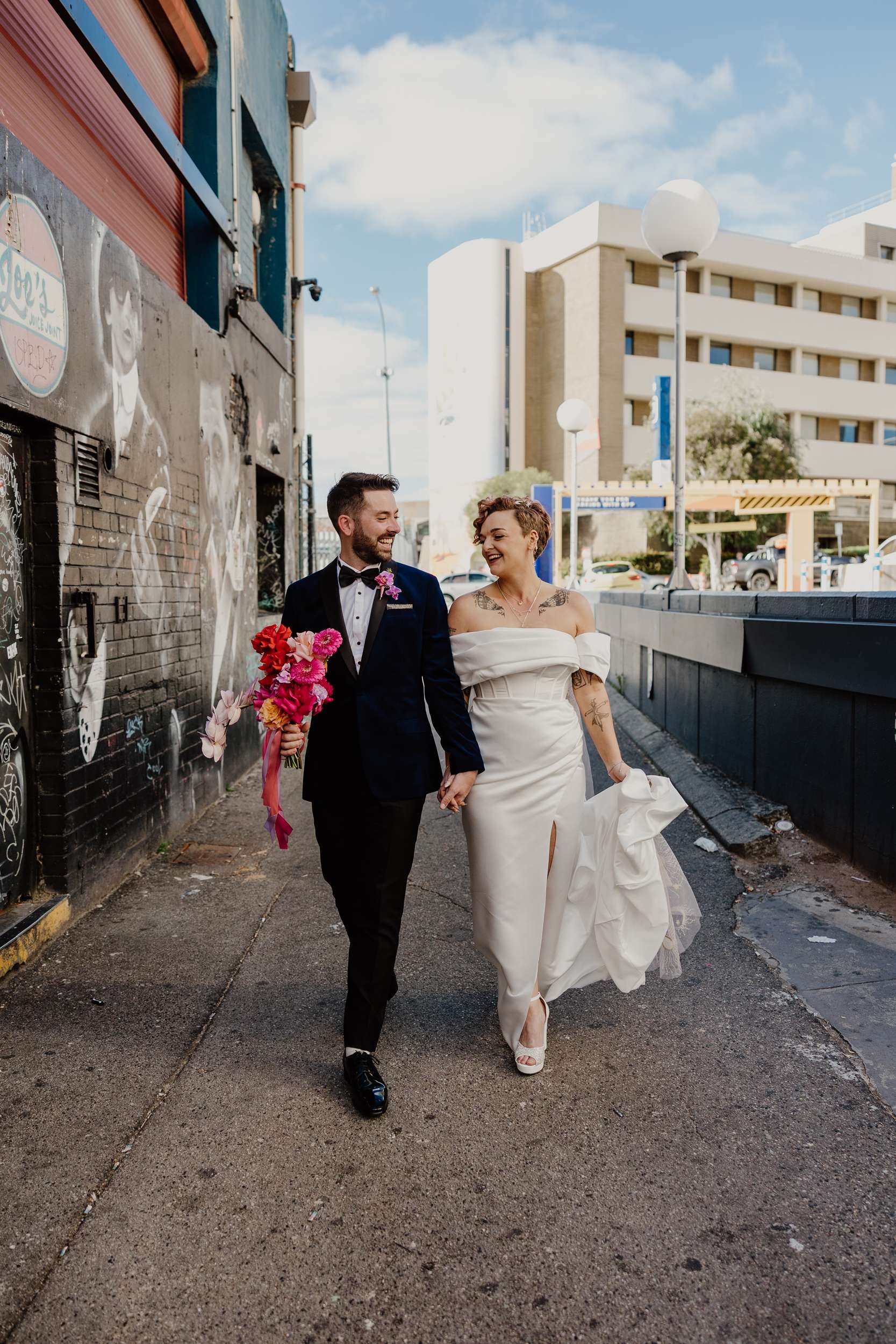 The day was held at Cherry Bomb Chapel in Perth, who handled all the décor and helped out with so many of the logistics, “In Perth our venue choices seemed limited to wineries, parks or beaches”, Georgia said. “As beautiful as they are, Cherry Bomb Chapel was so much more our style. The owners, Jodie and Chandre, have built an incredible space and assembled some amazing vendors with them. The venue was the biggest chunk of the budget, but that also came bundled with bar, food, furniture, décor and staff. Plus the girls from Cherry Bomb are absolute legends and made it worth every cent!”
