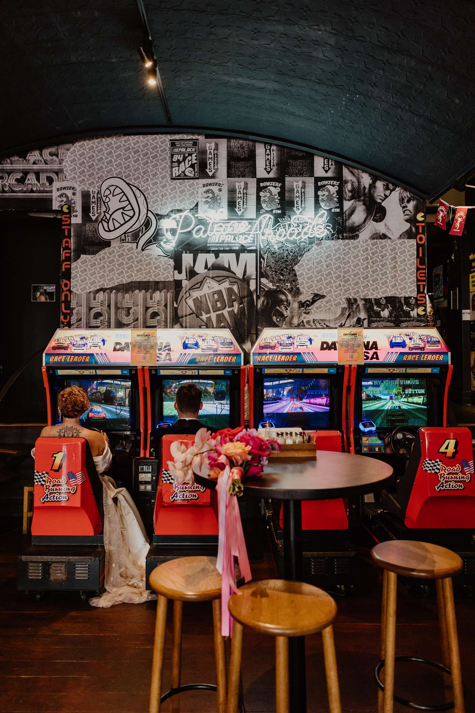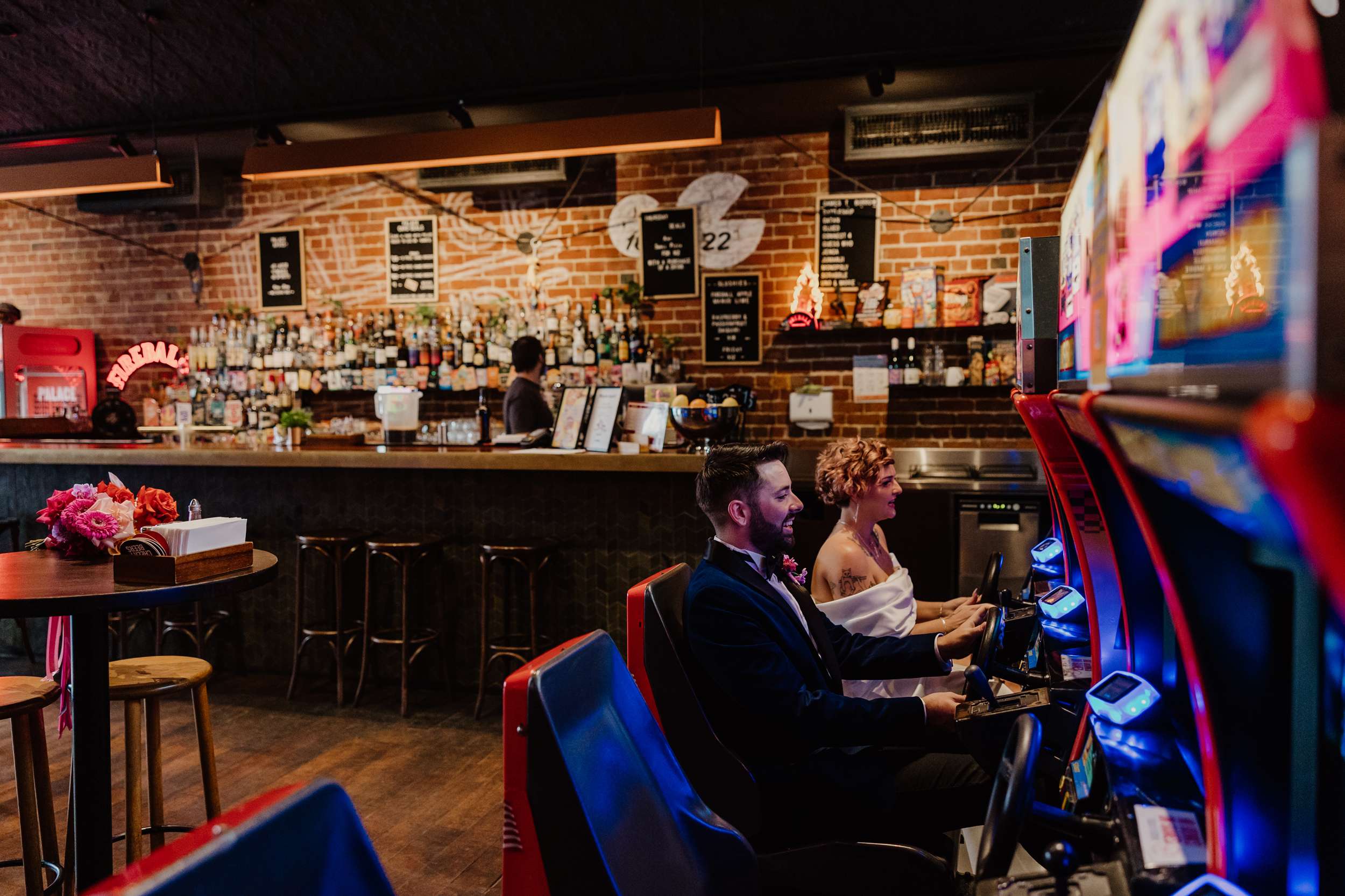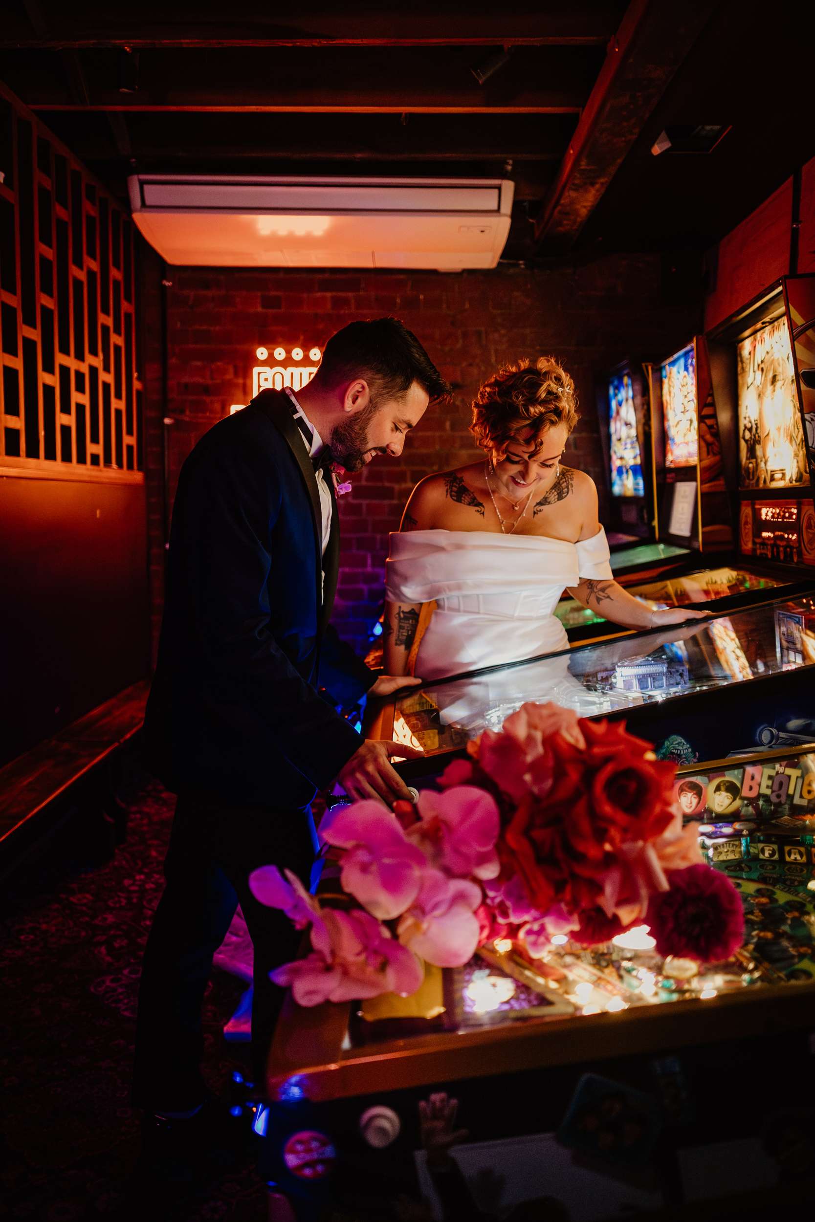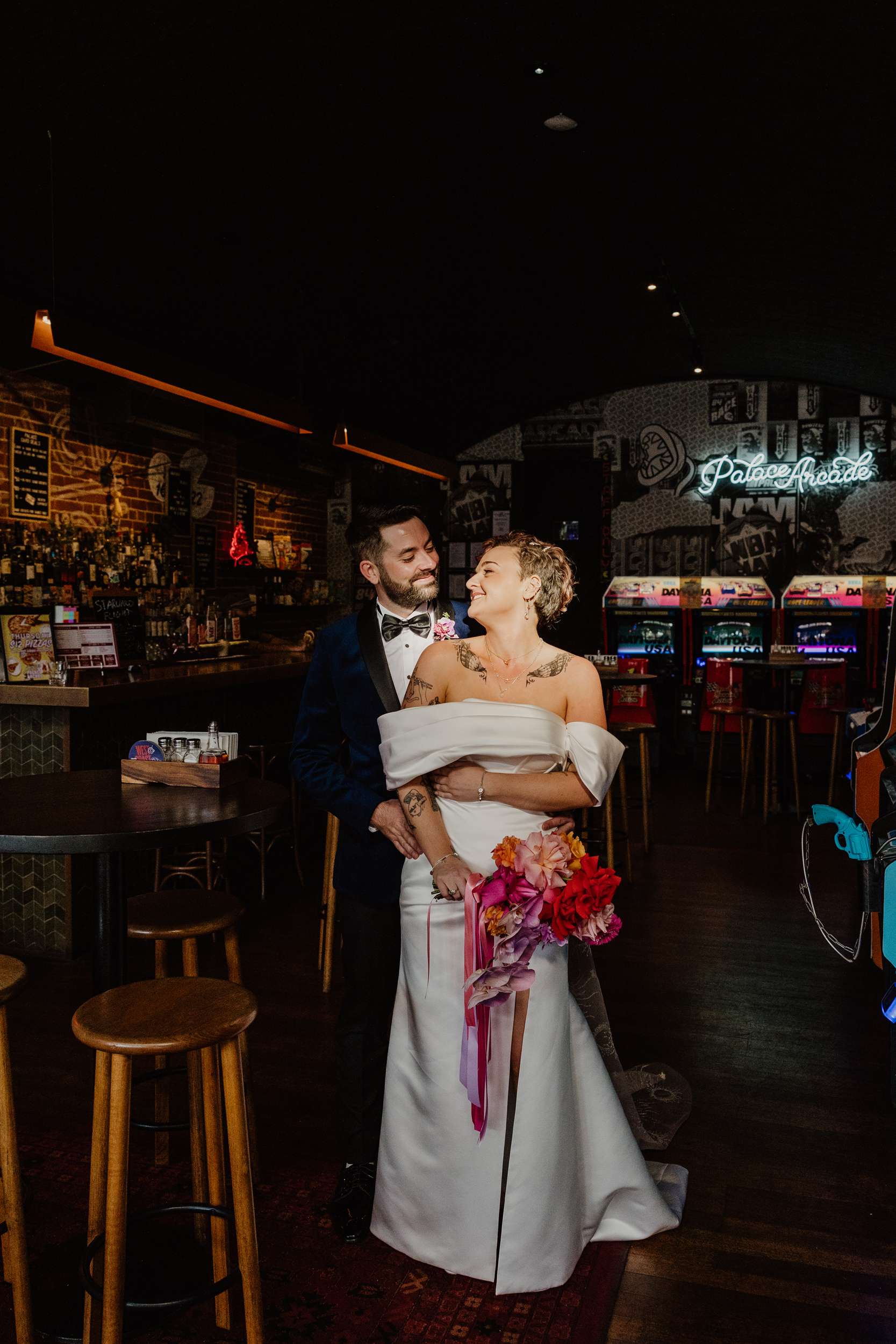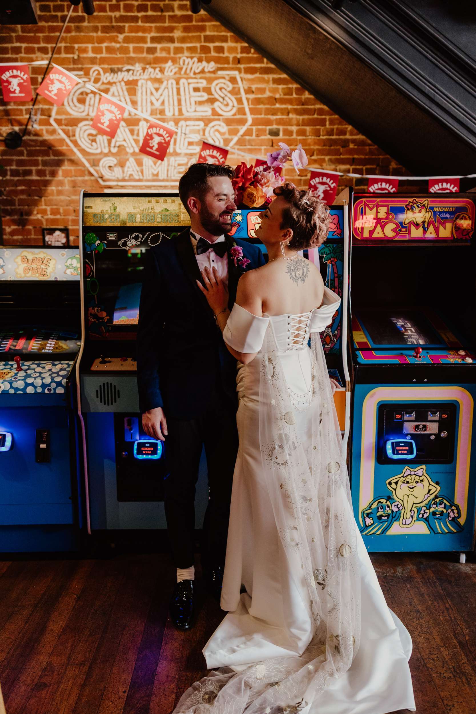 Georgia and Nathan’s wedding grew out of the life they already share and featured many of their favourite things: The arcade they go for date nights, the board games and Lego they loved to play together, and a shared fluency in internet jokes and pop culture references. The brief was never about landing on a single theme. “Whimsical, retro, camp, kitschy, Vegas-ish and arcade culture” was their reference point, as well as creating a day that felt manageable and comfortable for the neurodivergent bride.