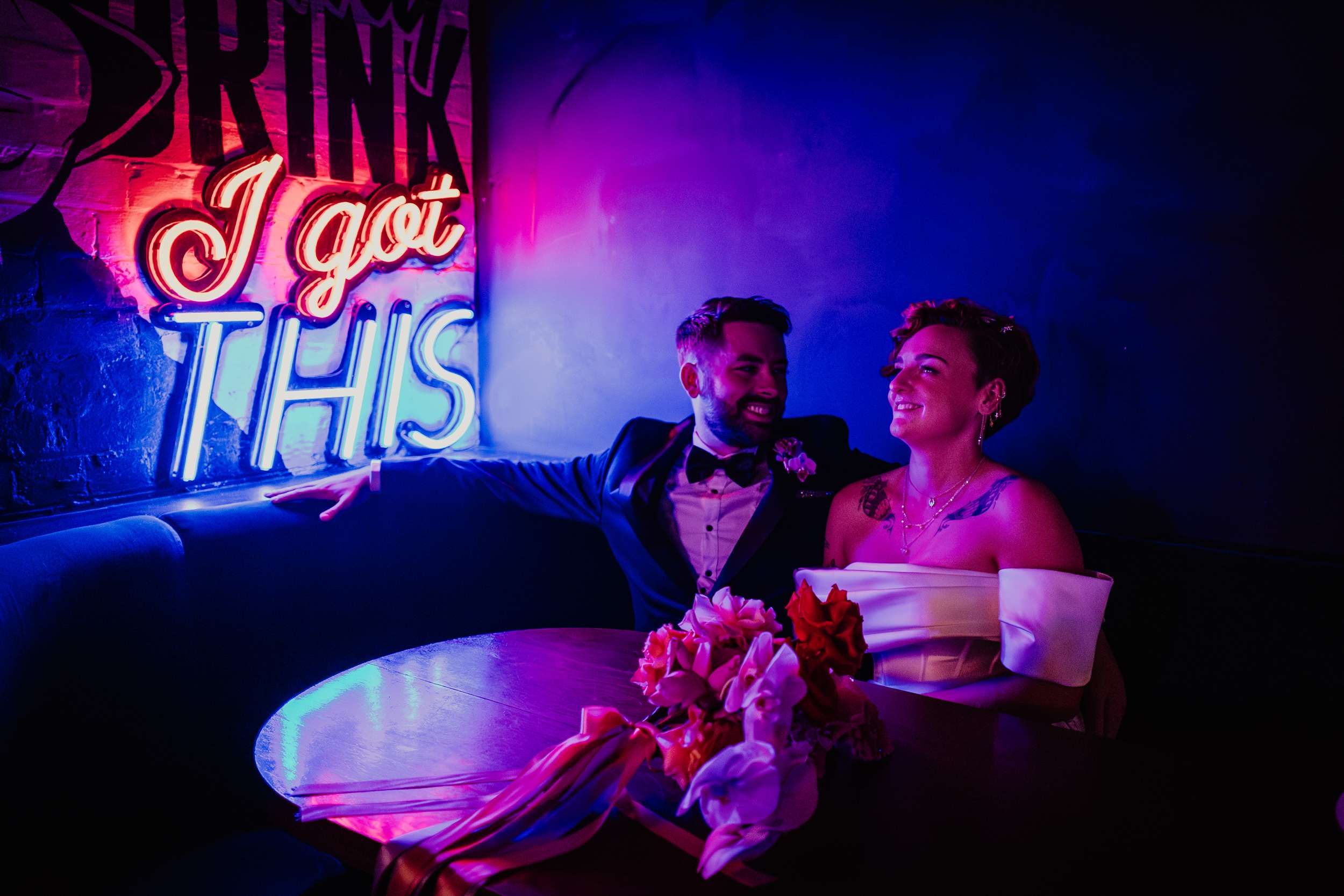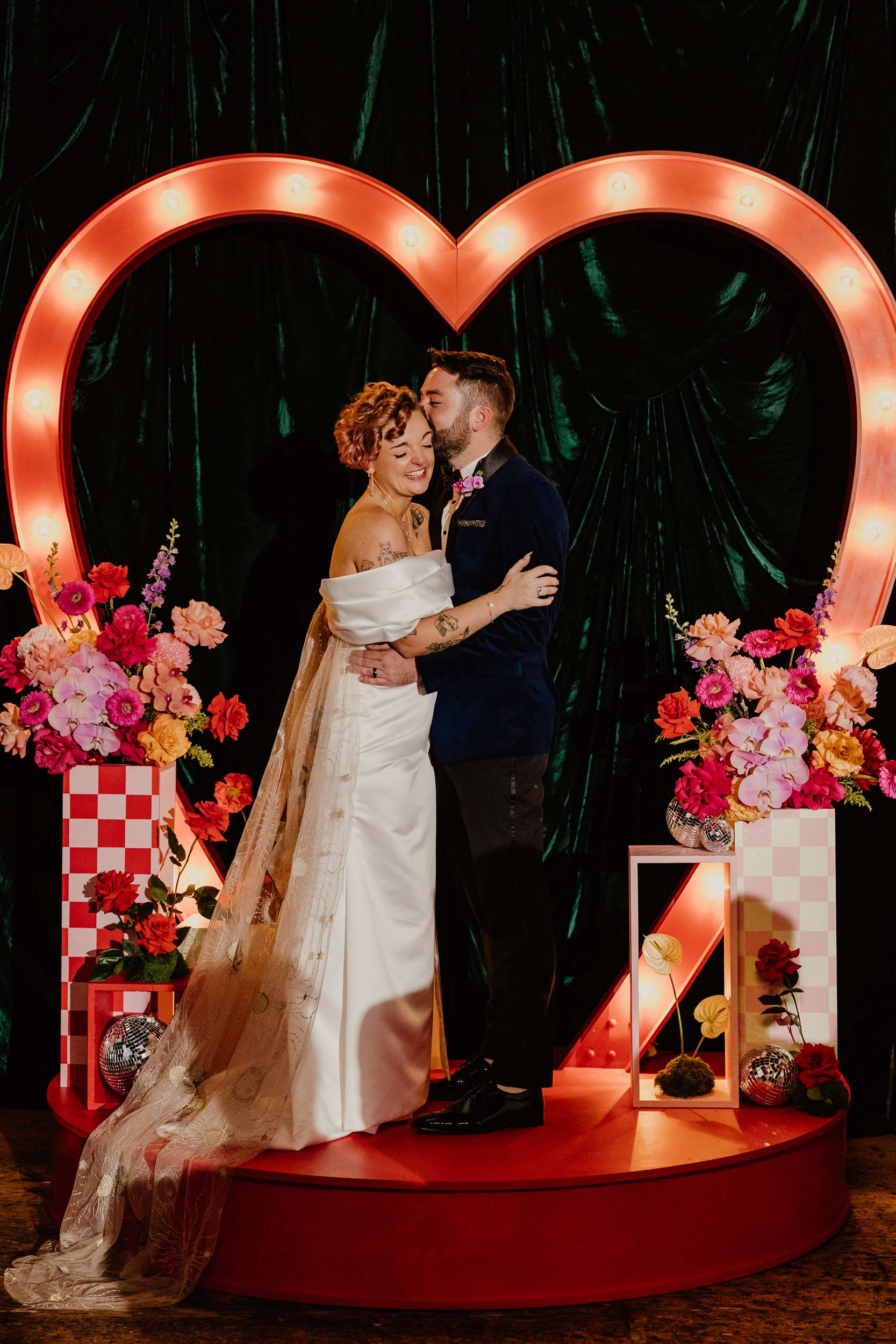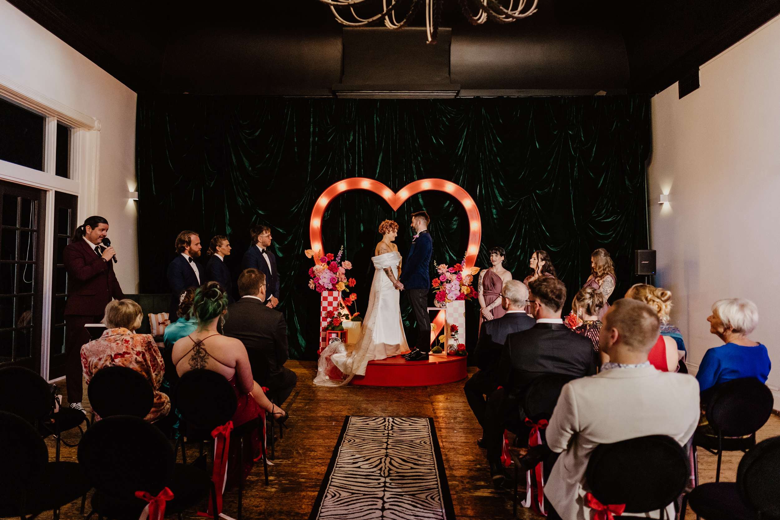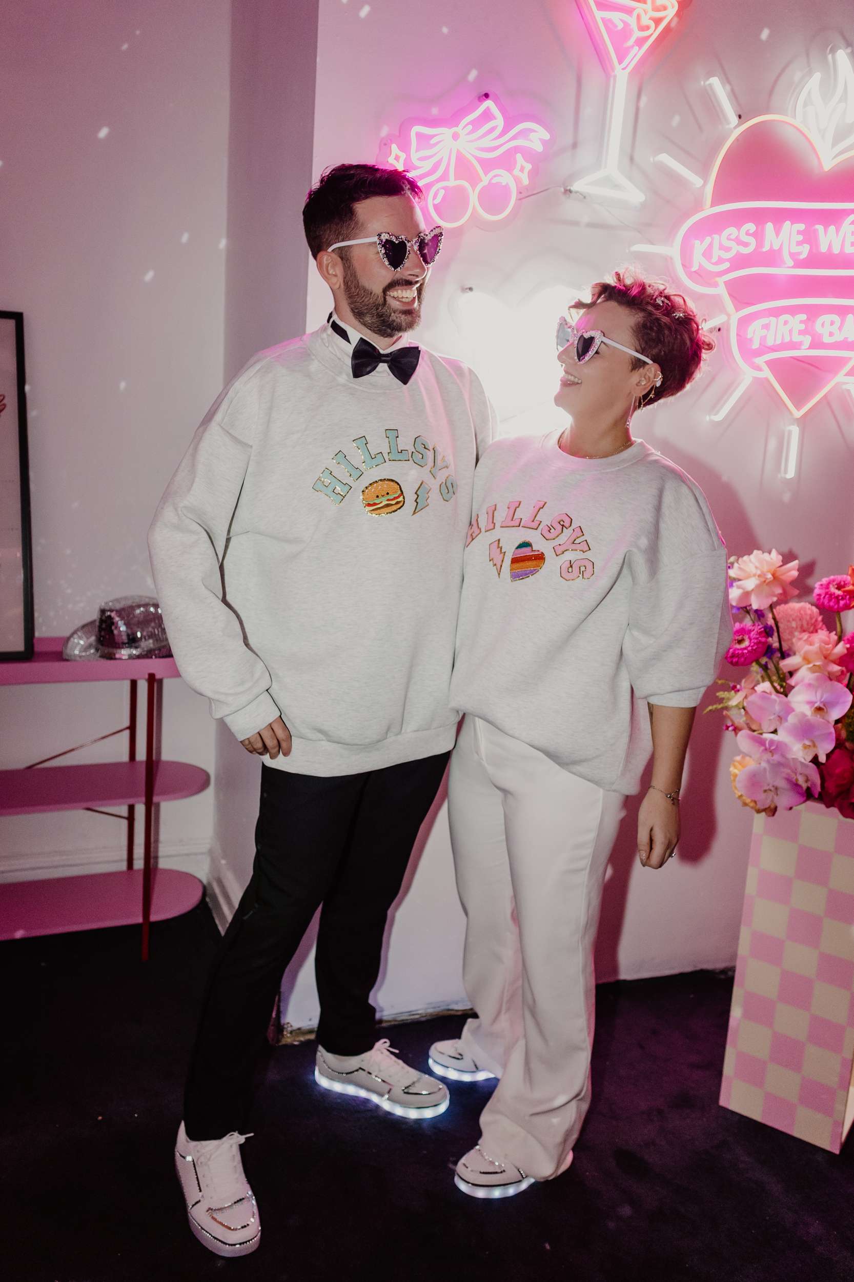 Georgia and Nathan’s wedding grew out of the life they already share and featured many of their favourite things: The arcade they go for date nights, the board games and Lego they loved to play together, and a shared fluency in internet jokes and pop culture references. The brief was never about landing on a single theme. “Whimsical, retro, camp, kitschy, Vegas-ish and arcade culture” was their reference point, as well as creating a day that felt manageable and comfortable for the neurodivergent bride.
