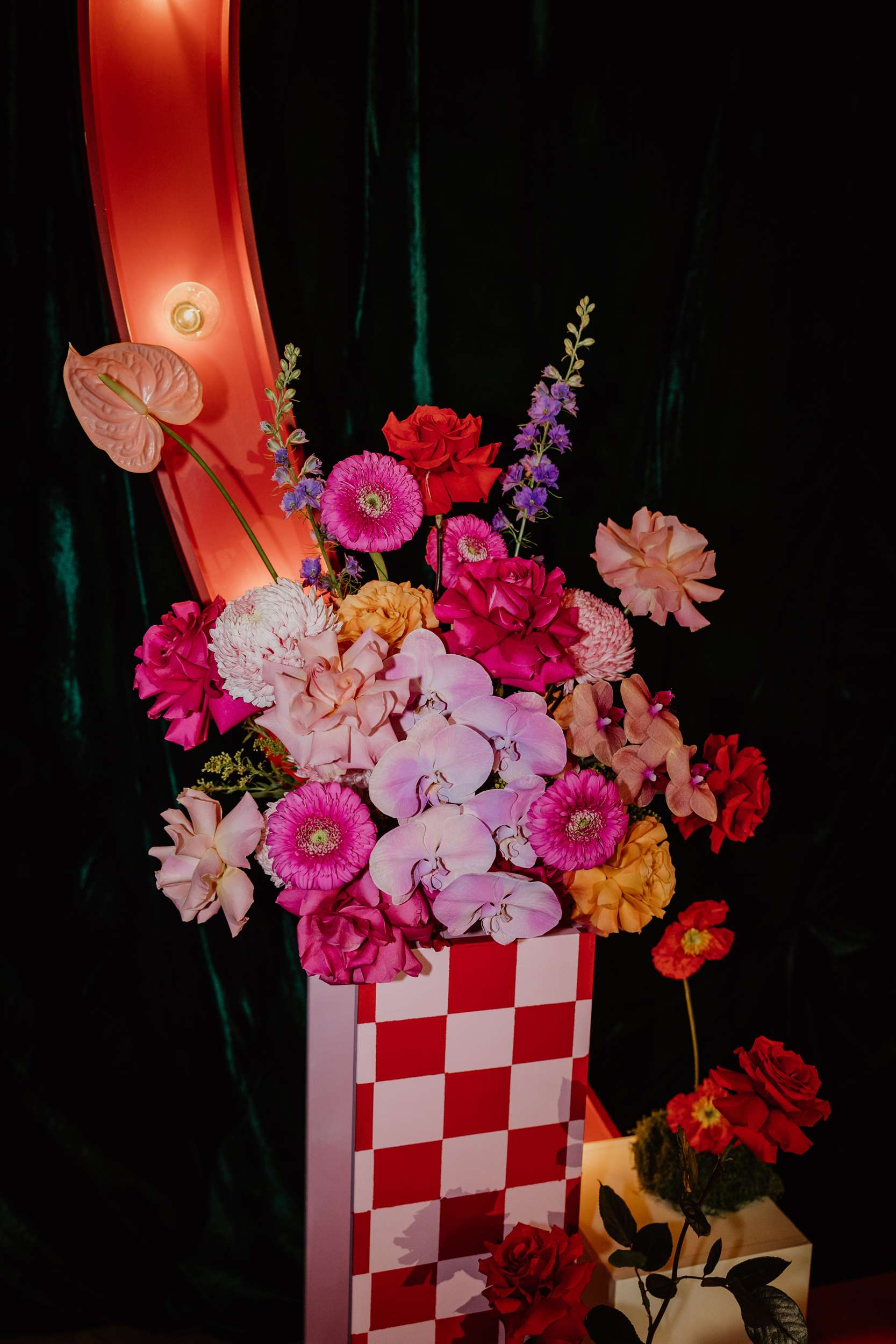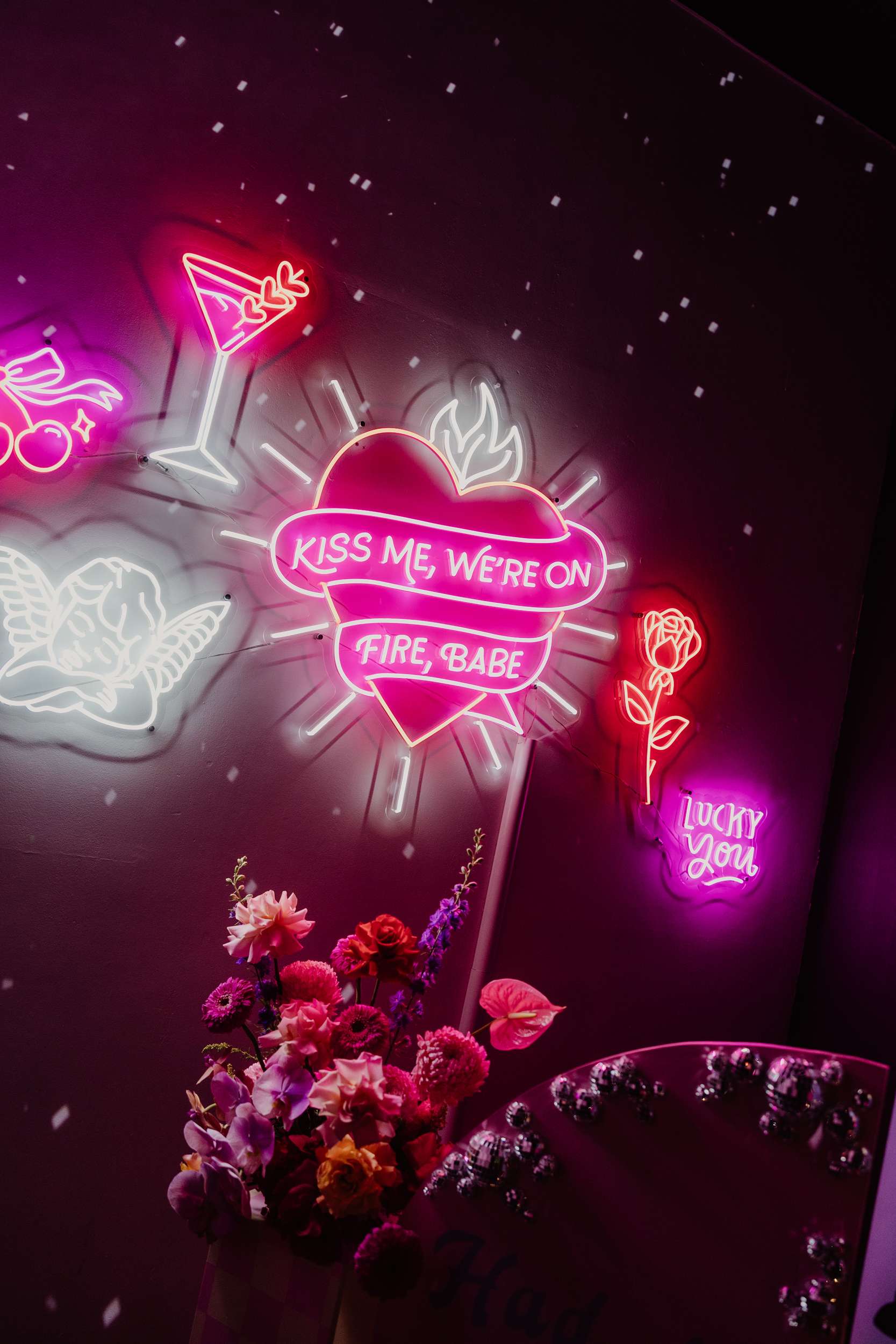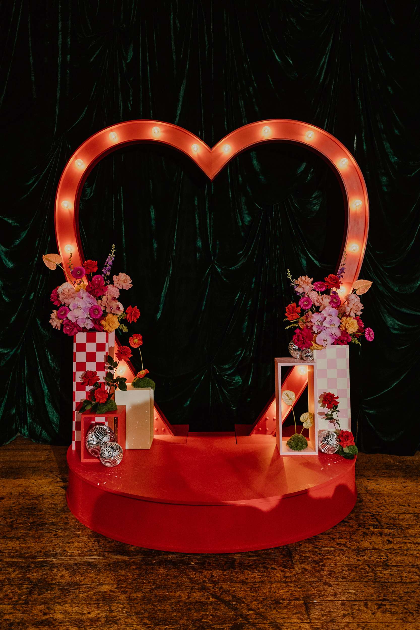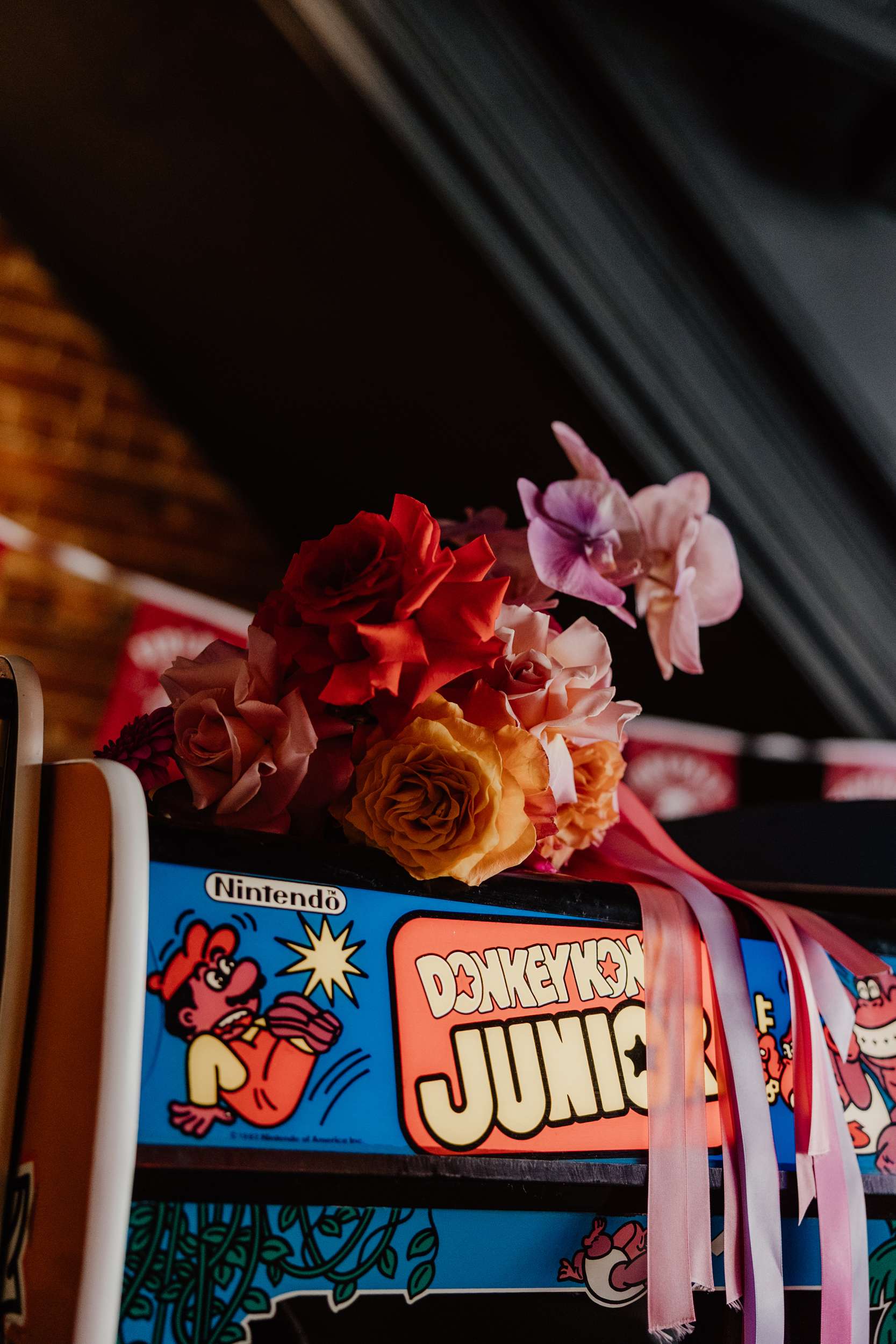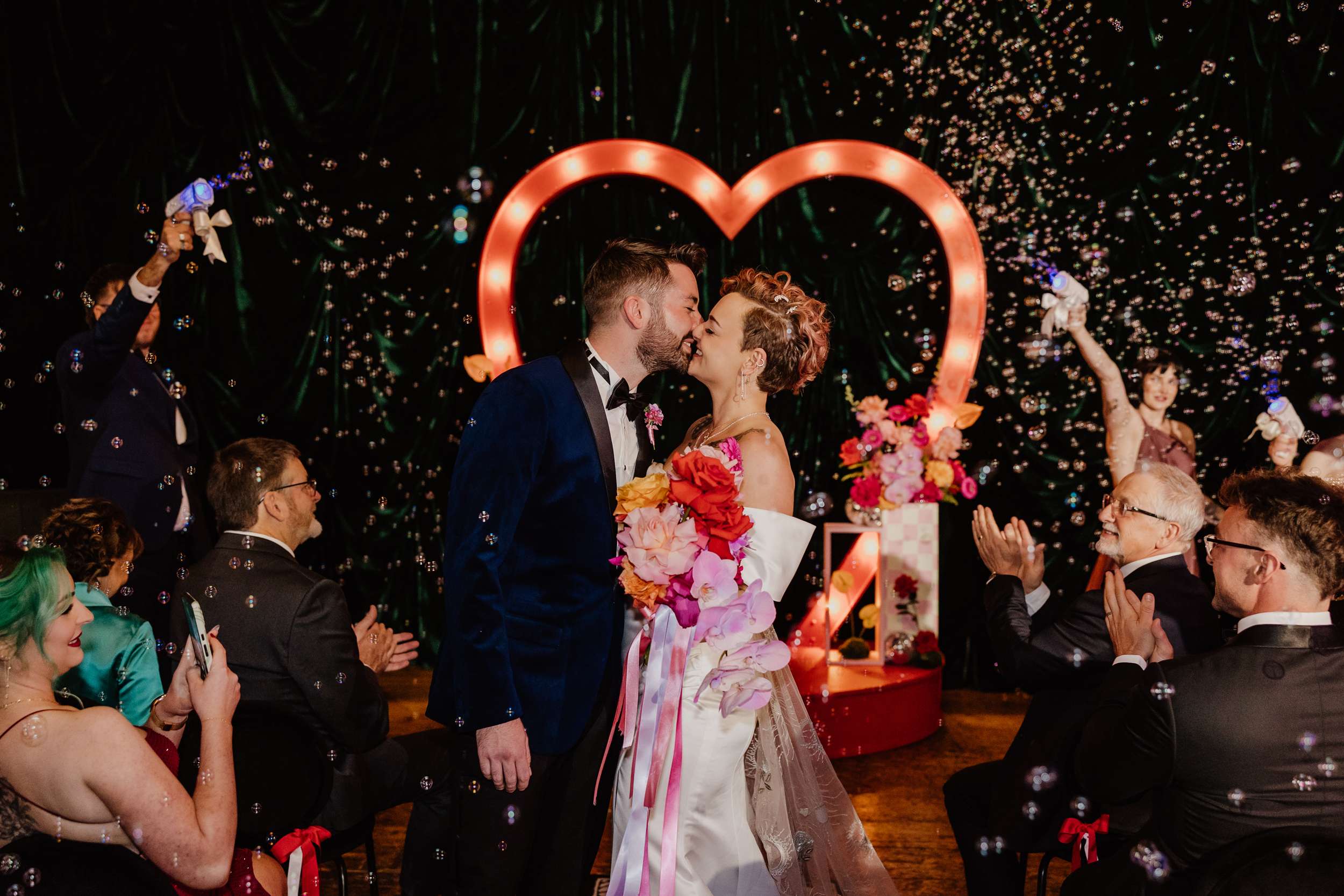 Georgia and Nathan’s wedding grew out of the life they already share and featured many of their favourite things: The arcade they go for date nights, the board games and Lego they loved to play together, and a shared fluency in internet jokes and pop culture references. The brief was never about landing on a single theme. “Whimsical, retro, camp, kitschy, Vegas-ish and arcade culture” was their reference point, as well as creating a day that felt manageable and comfortable for the neurodivergent bride.