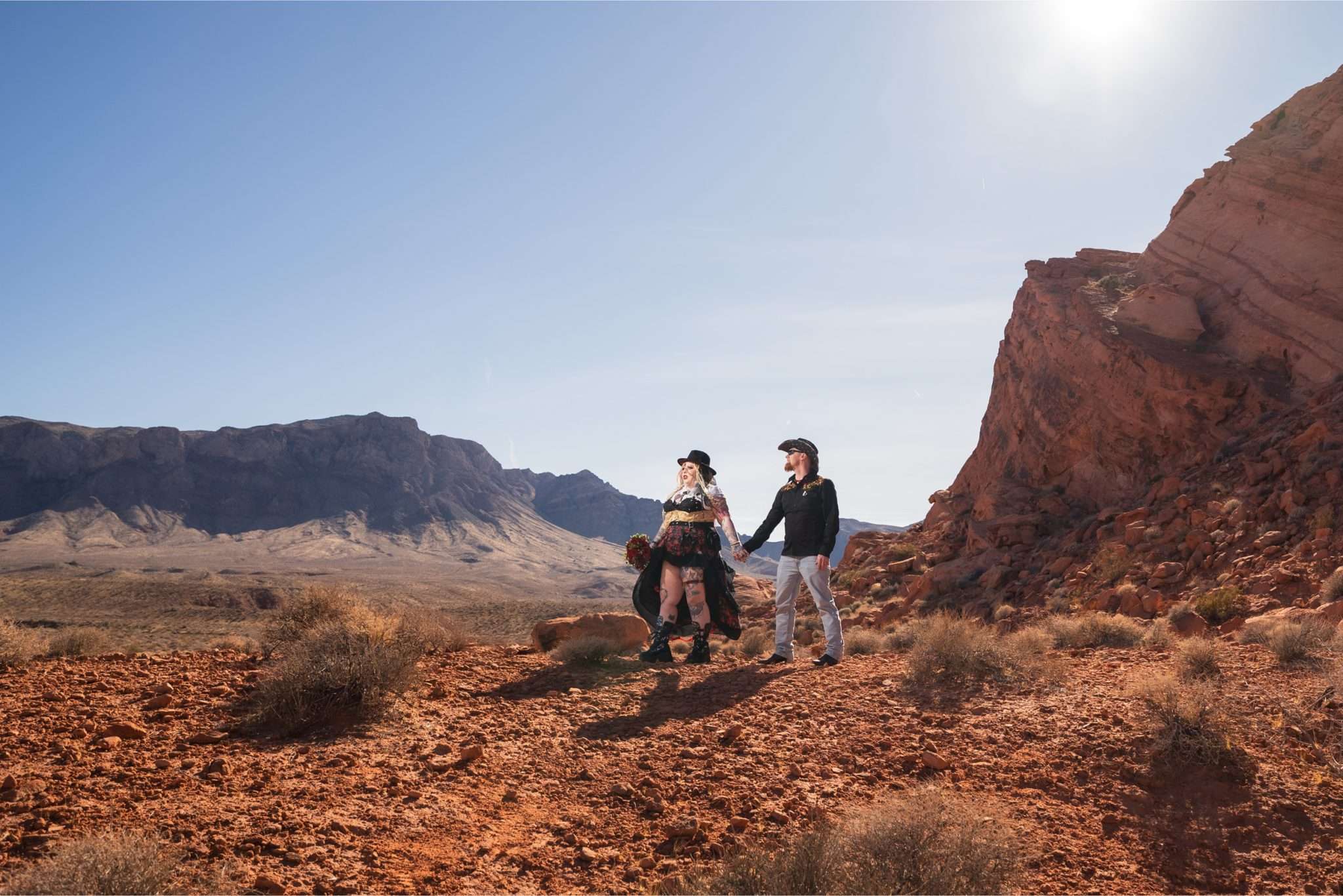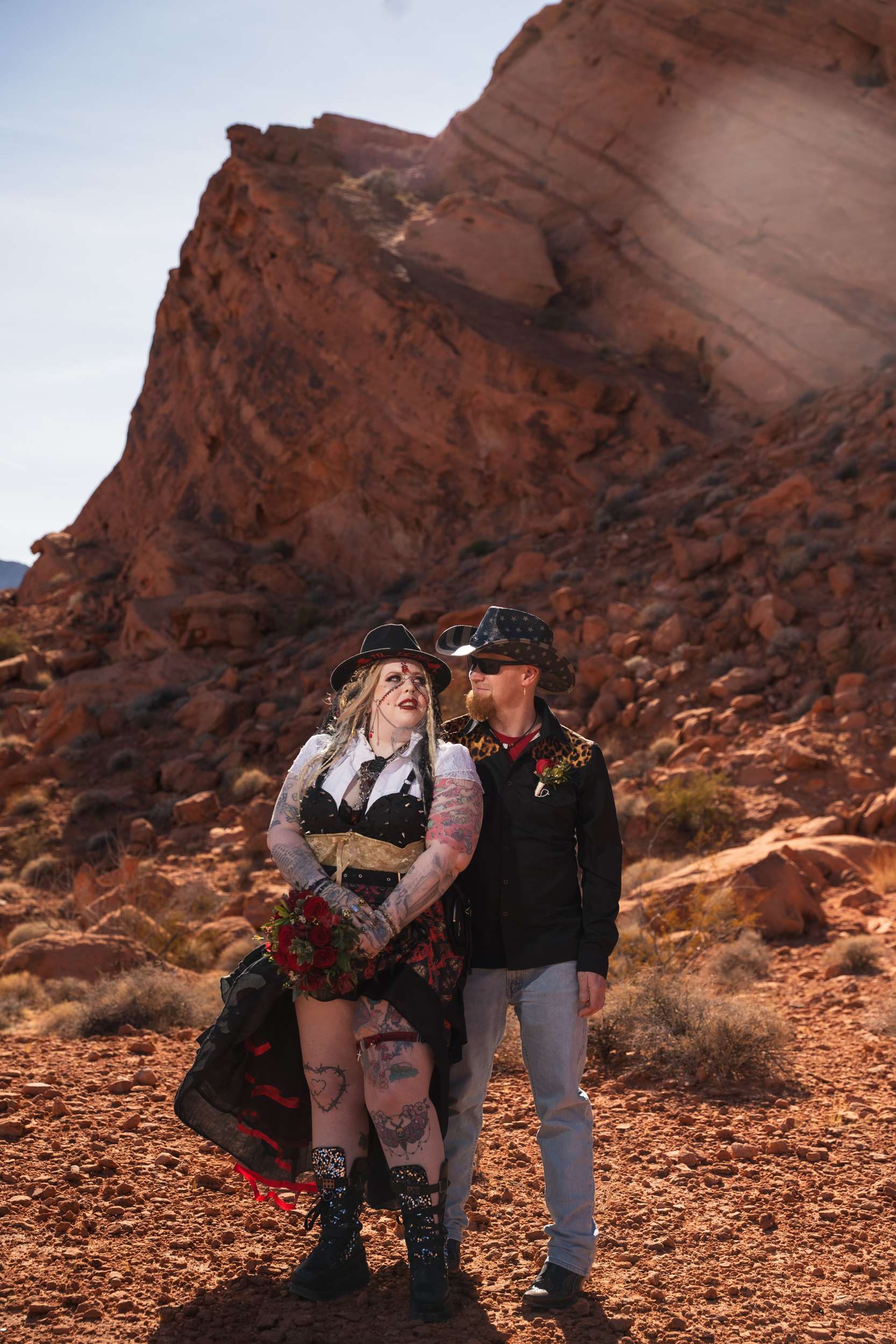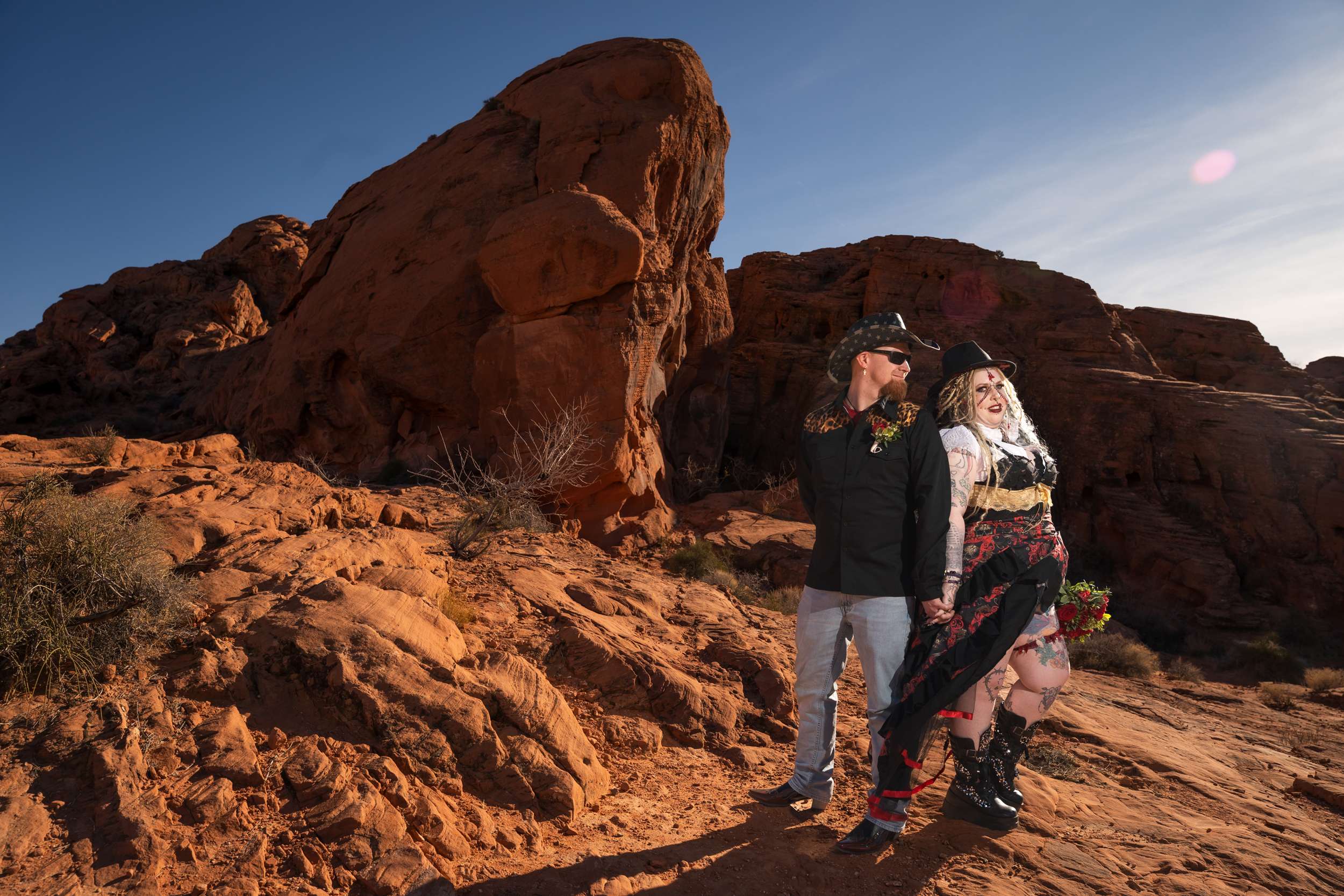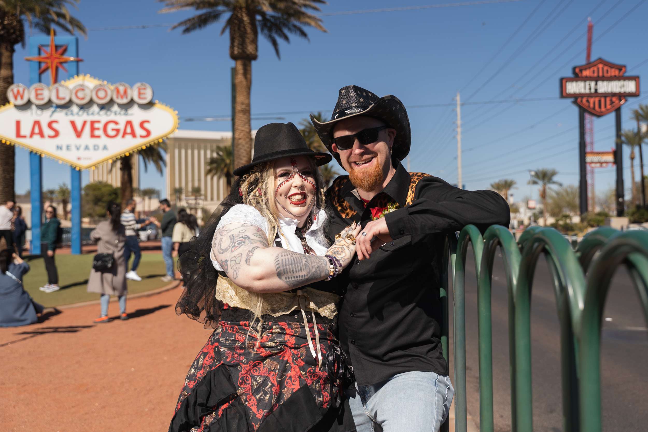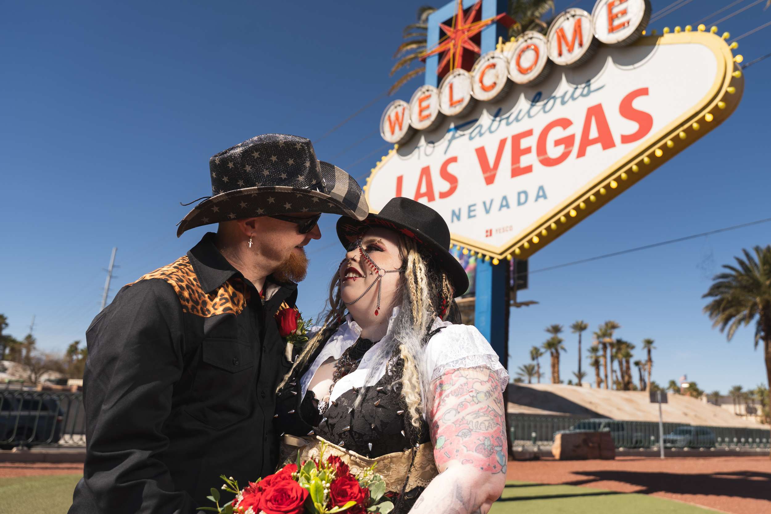 Adam and Kitty got married in Las Vegas with a guest list of six and a budget of around £5k including travel and accommodation from the UK. The ceremony took place at High Noon at the Welcome to Las Vegas sign, followed by a limo ride out to the Valley of Fire for portraits.