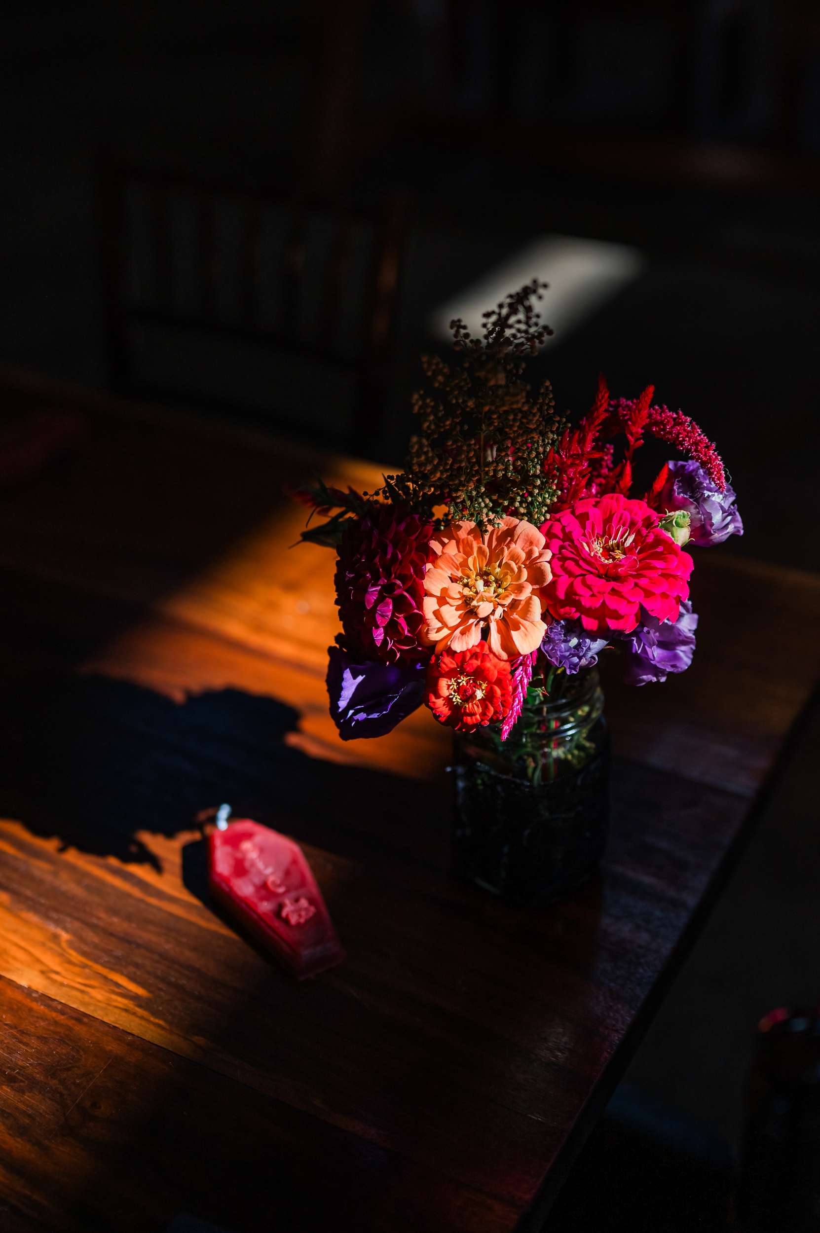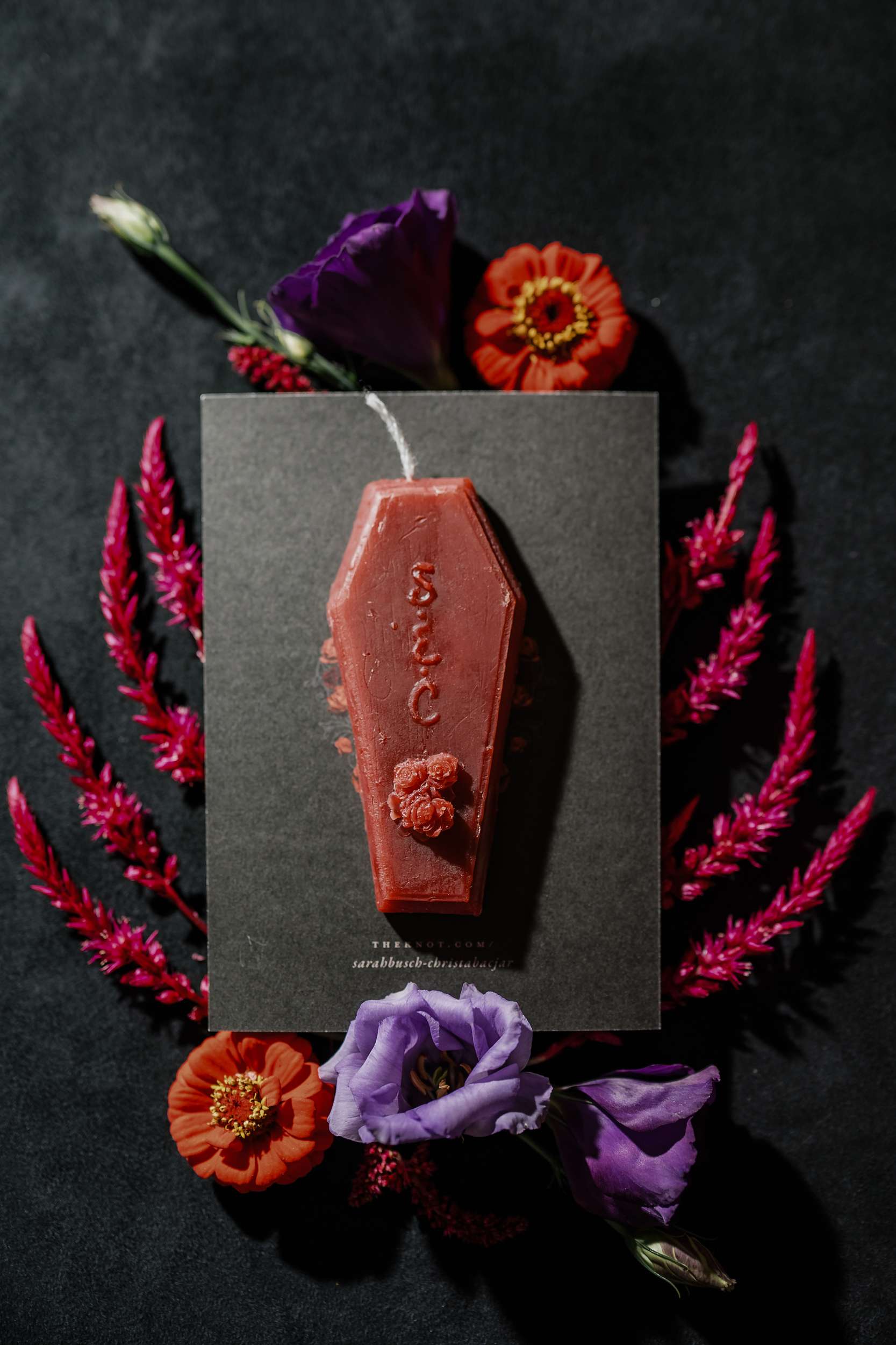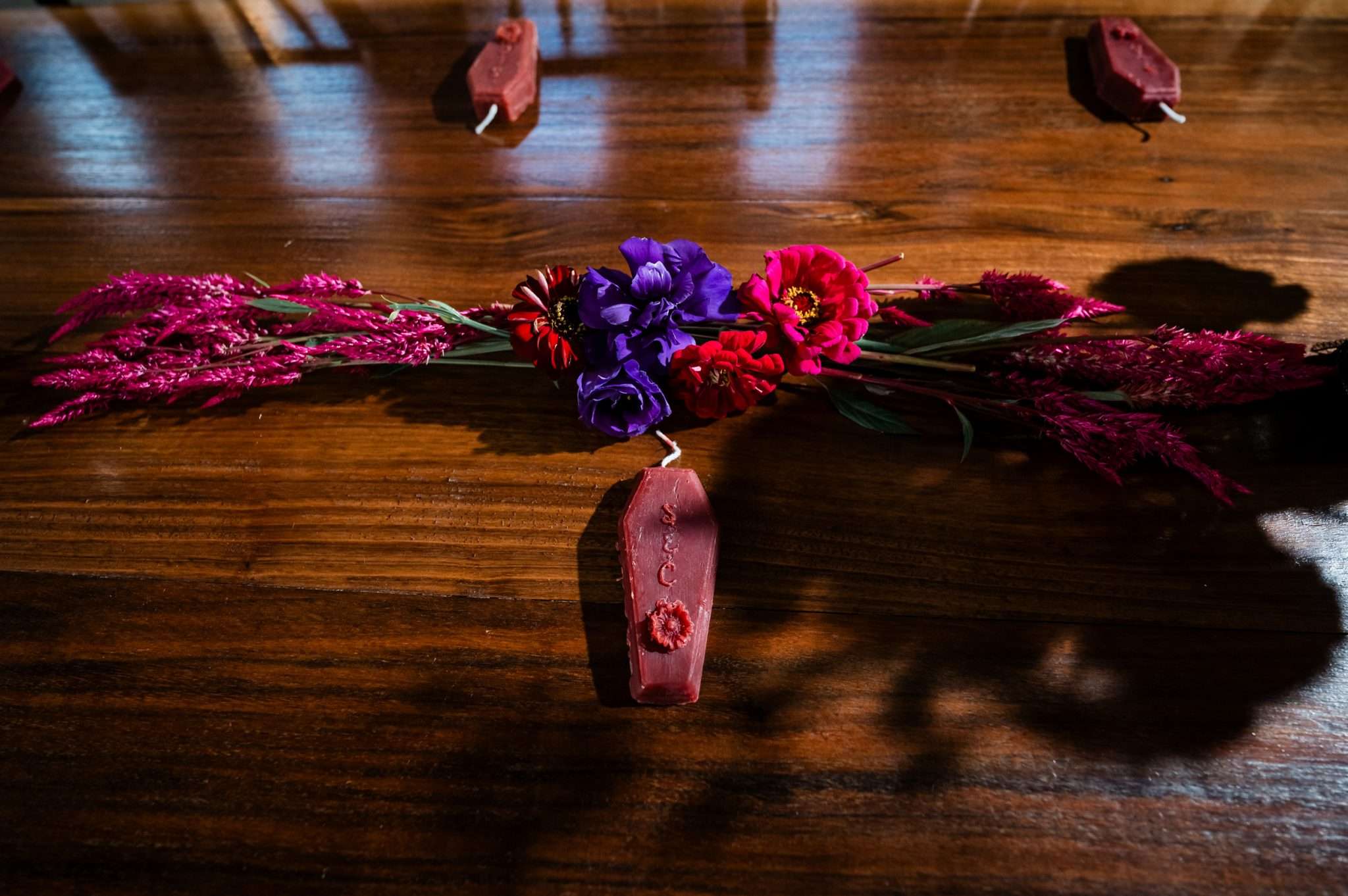 They filled the space with dried flowers, bones and found dead bugs, which were arranged in jars and wrapped in lace. Every décor element was homemade by them or someone they love. The vases were wrapped by the wedding party, the ring box was handmade by the ring bearer, and the favours were coffin shaped candles poured by Sarah and Chris themselves.