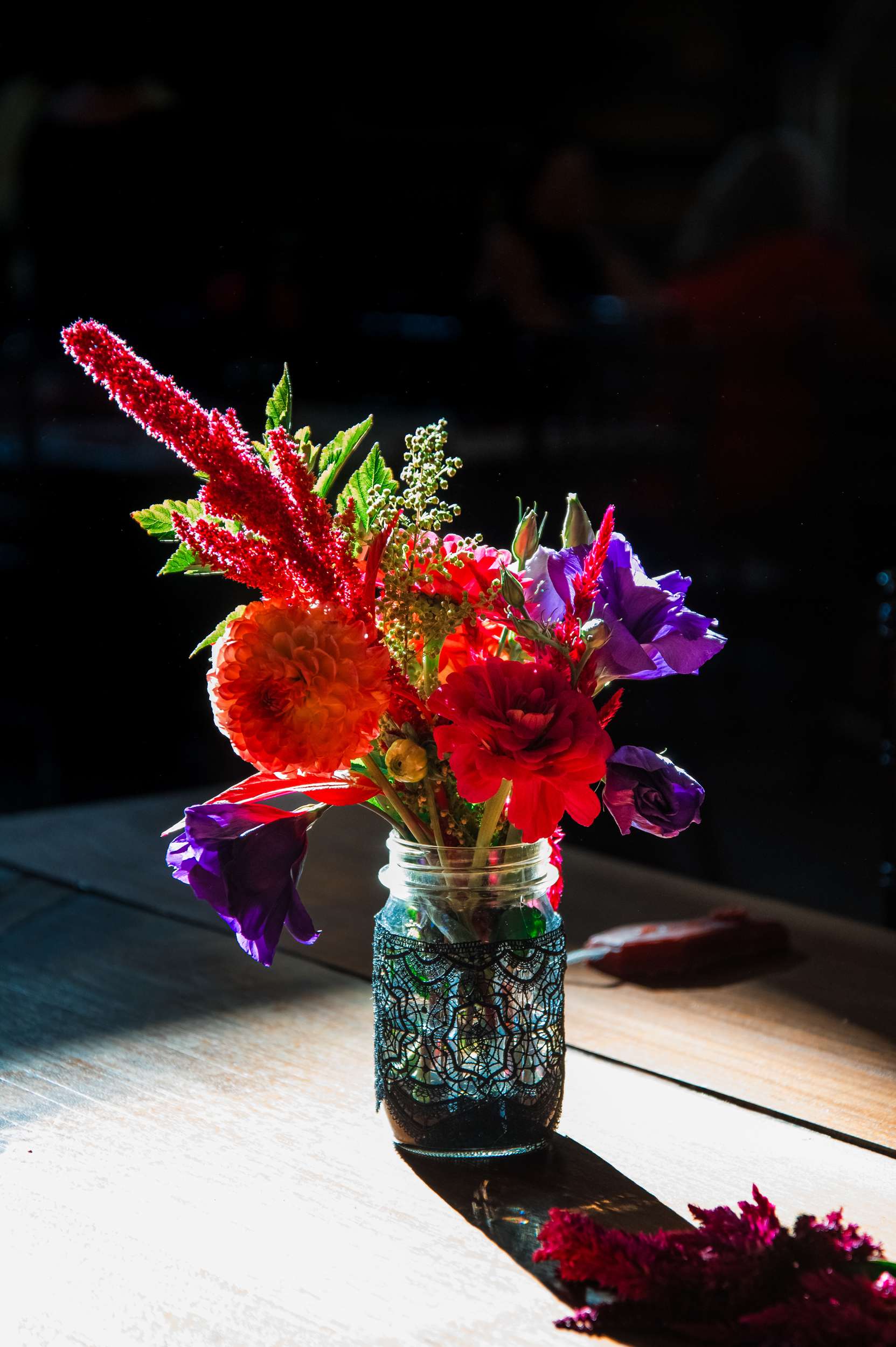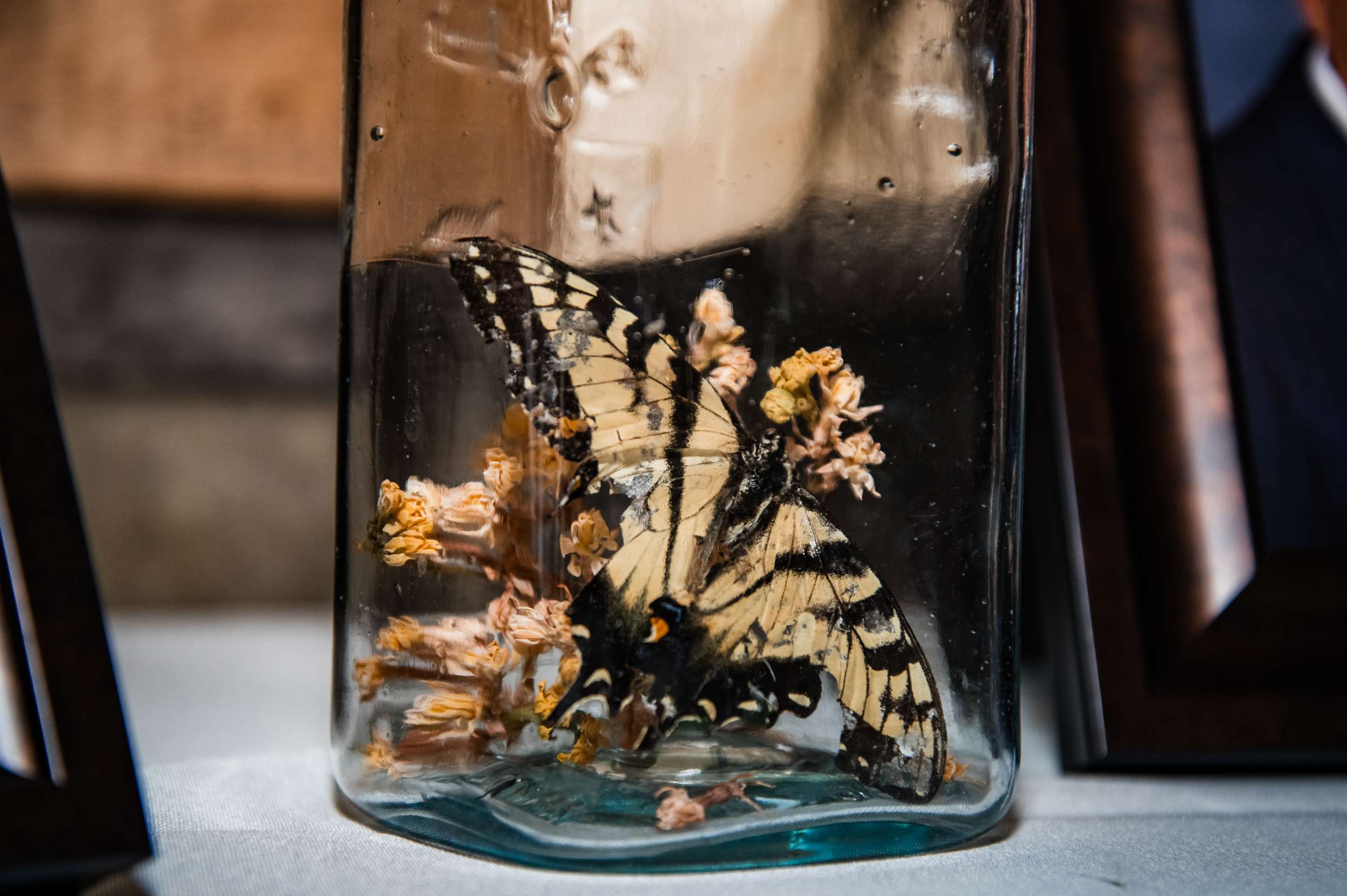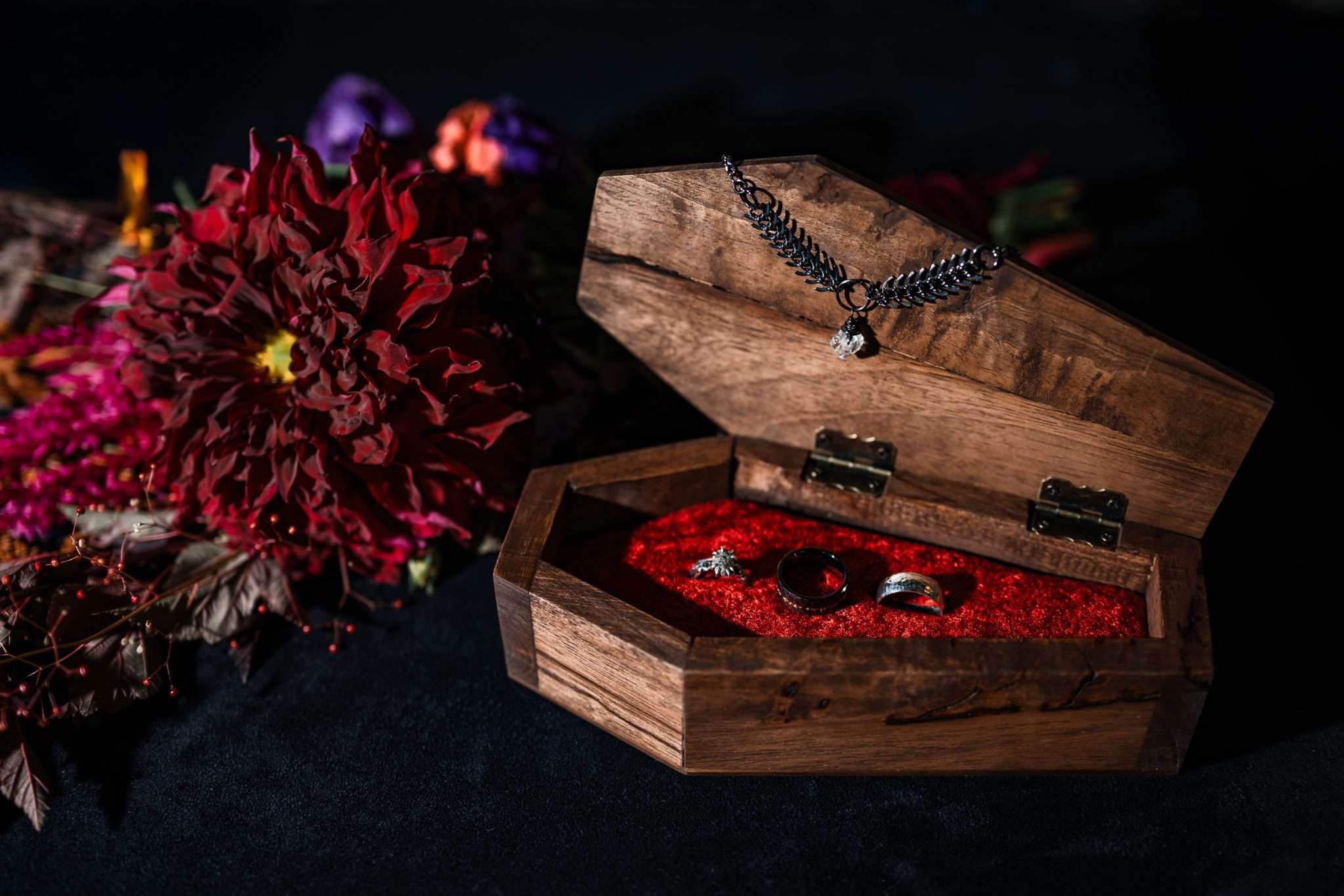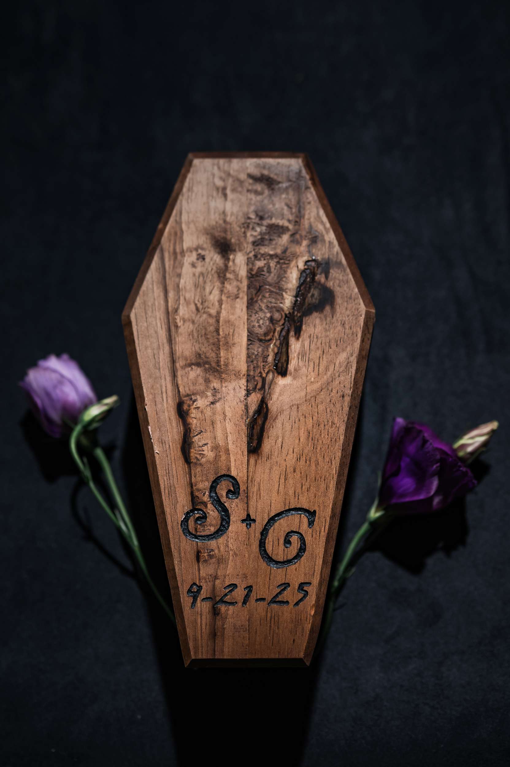They filled the space with dried flowers, bones and found dead bugs, which were arranged in jars and wrapped in lace. Every décor element was homemade by them or someone they love. The vases were wrapped by the wedding party, the ring box was handmade by the ring bearer, and the favours were coffin shaped candles poured by Sarah and Chris themselves.