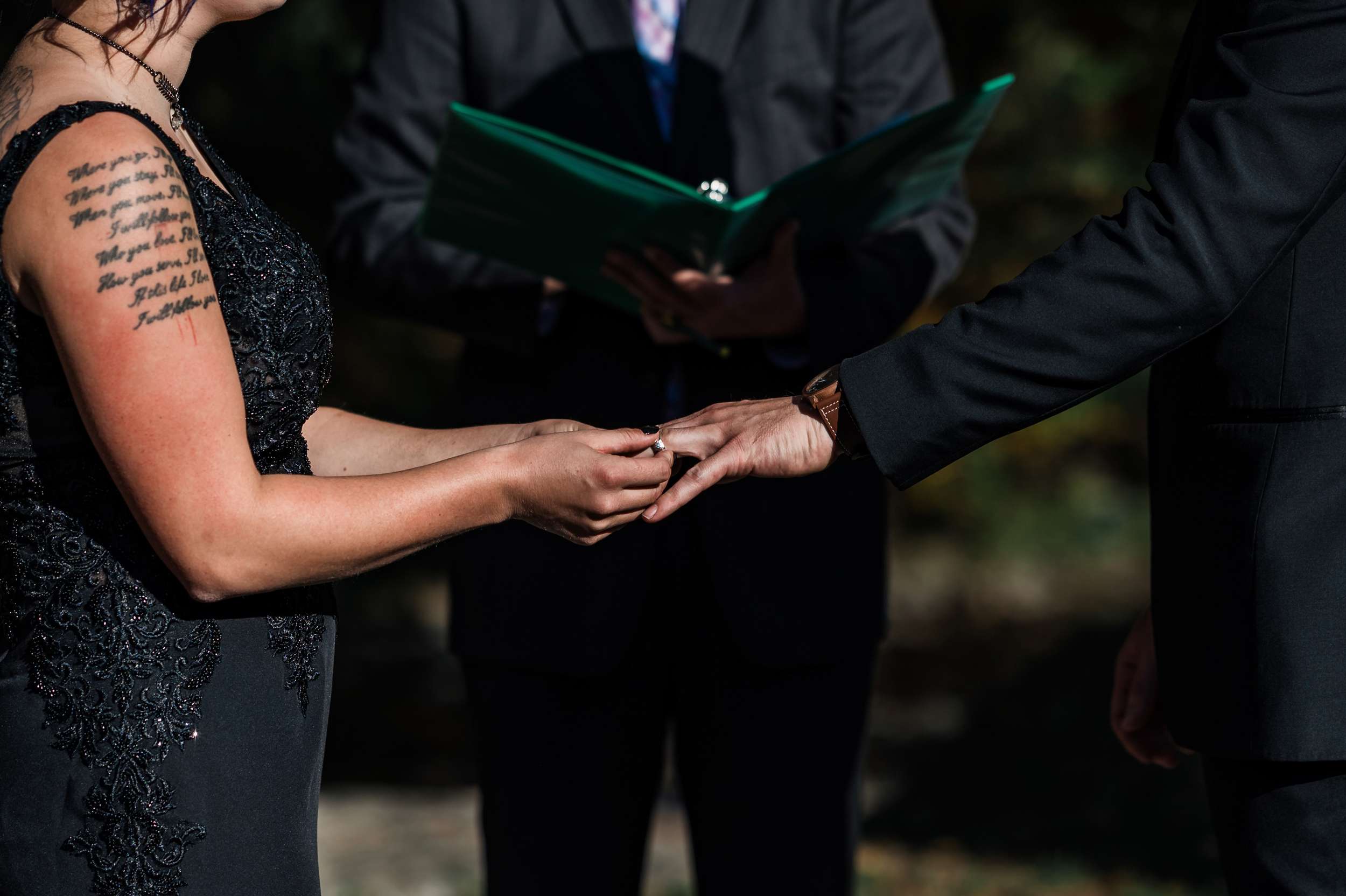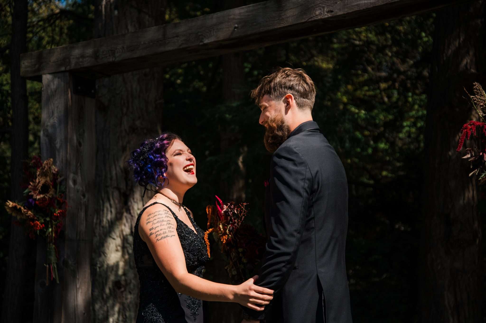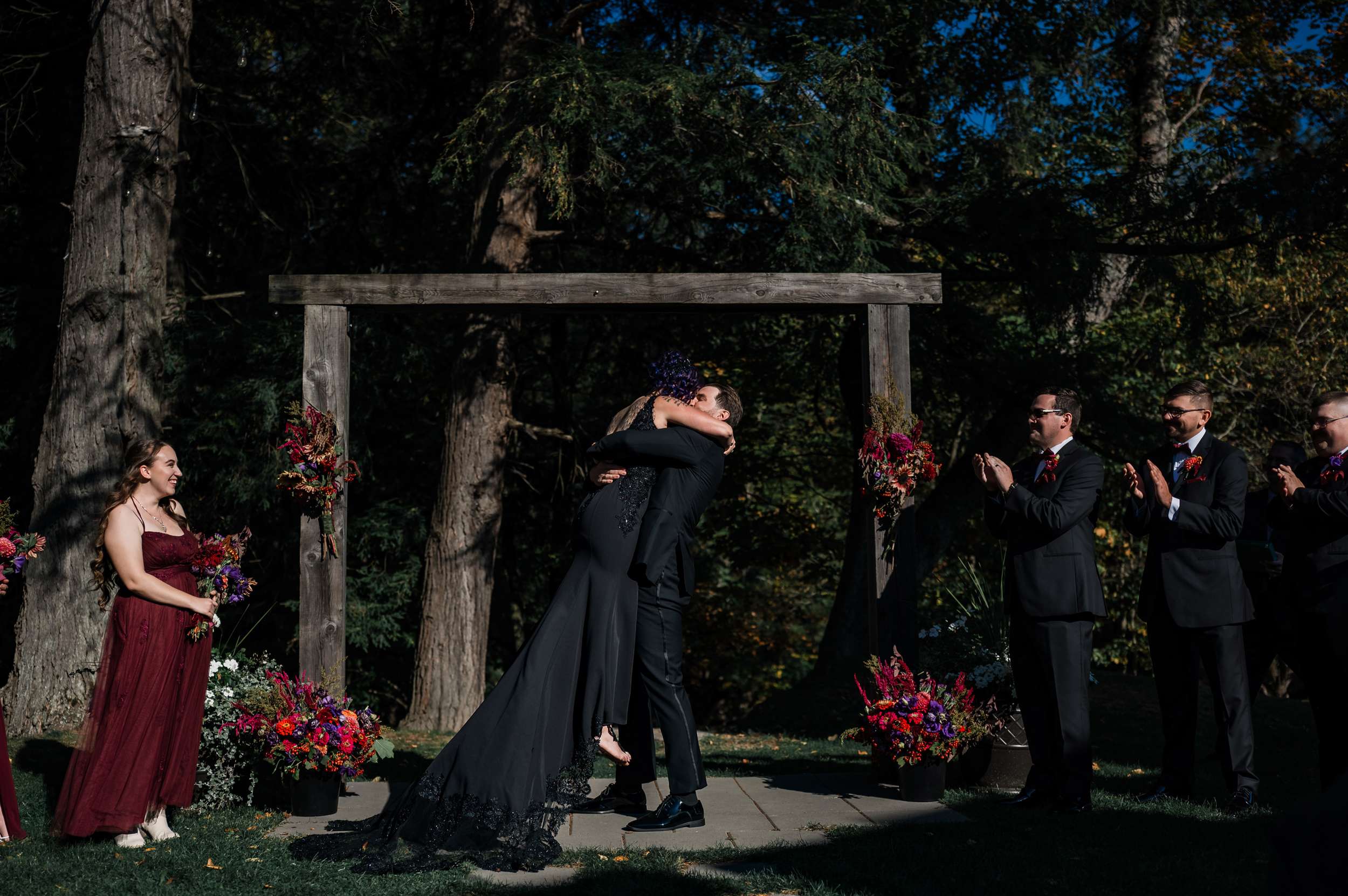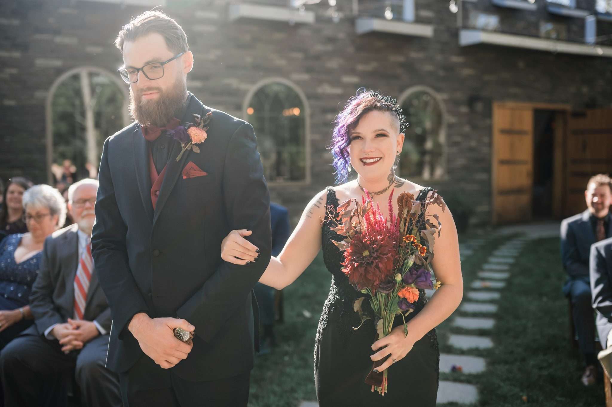 After a first look, the couple walked down the aisle together. “To us it was more important that this was a decision and a commitment that we were making to each other,” Sarah, who wore black, said. Their vows were written in a handmade book created by a close friend.