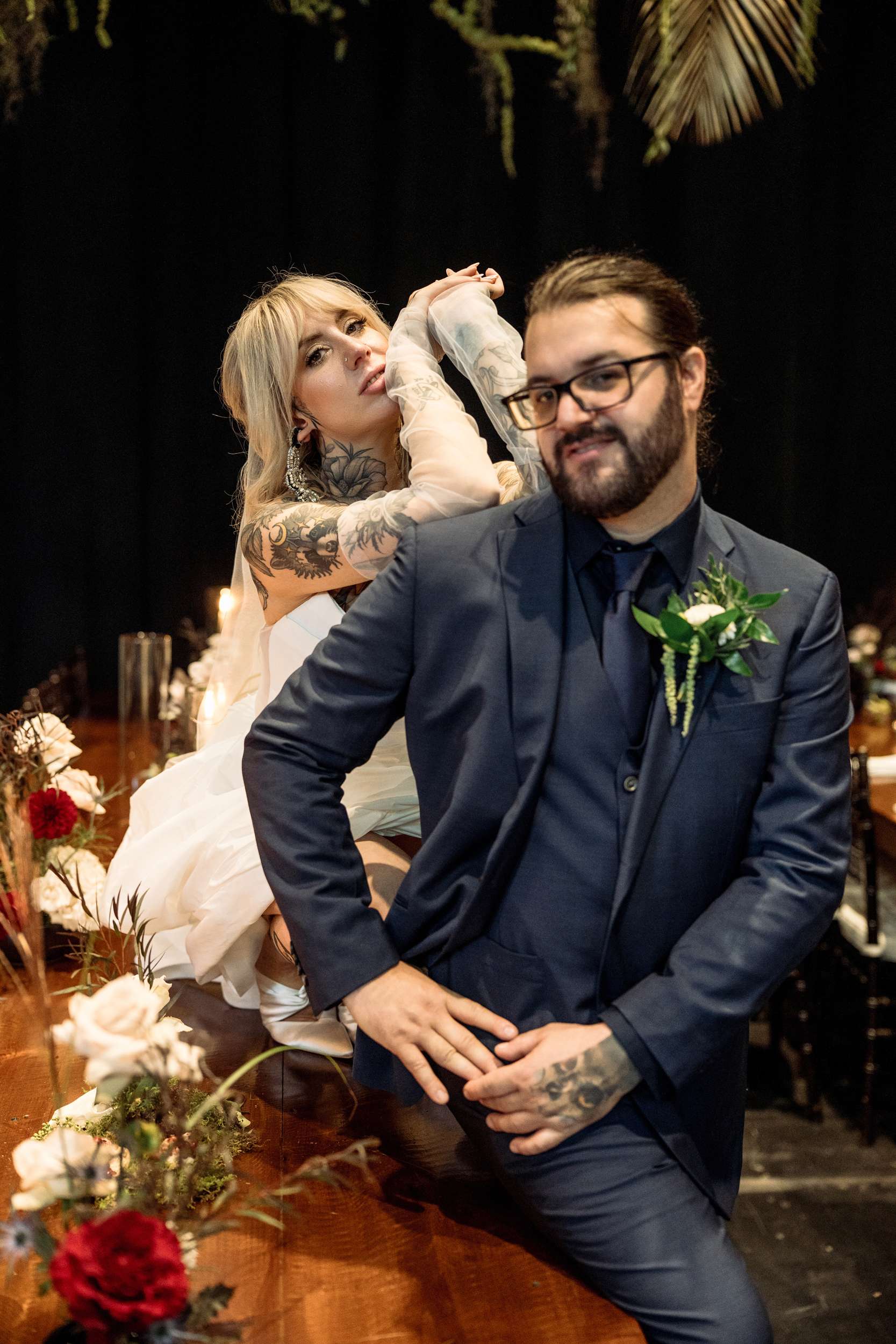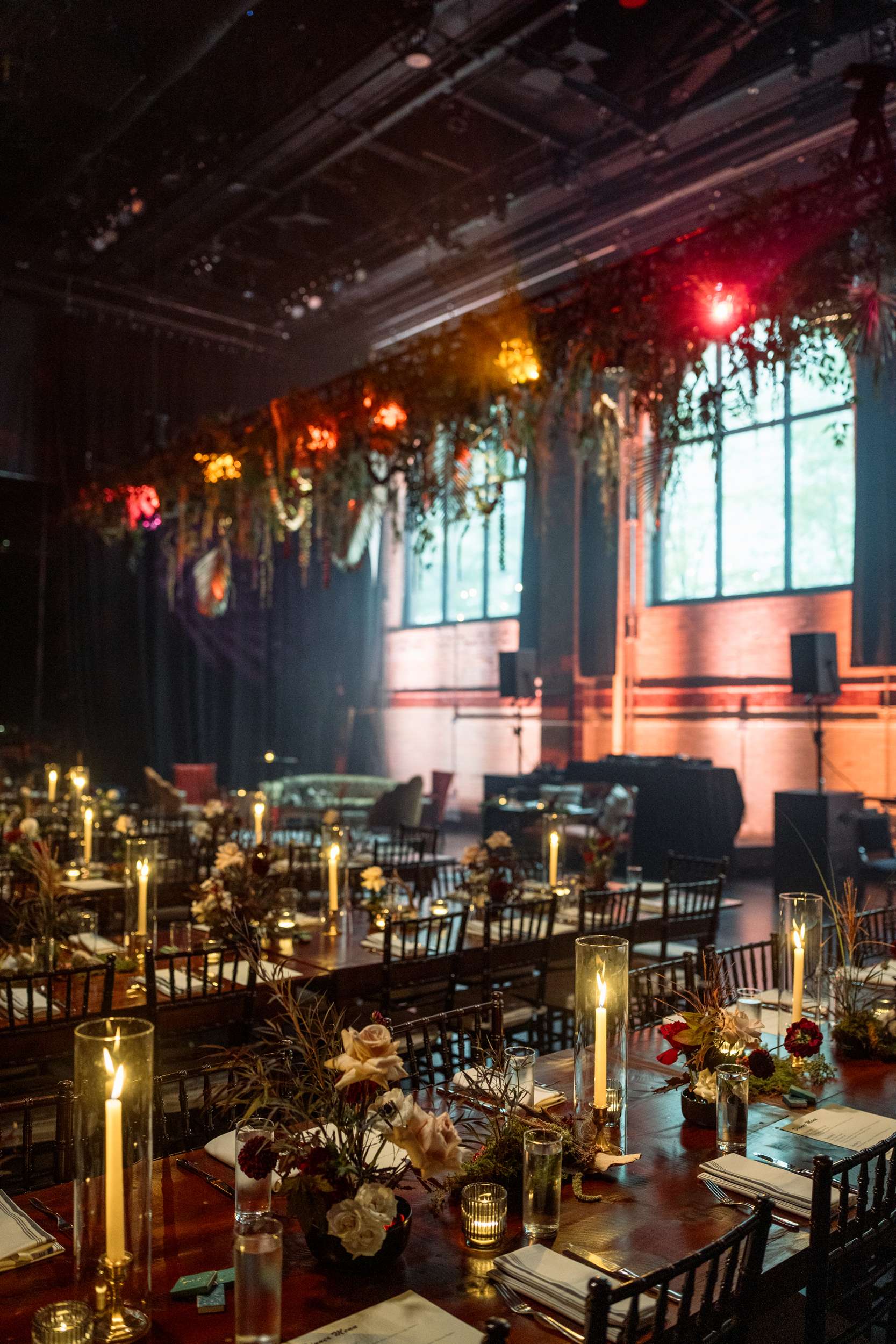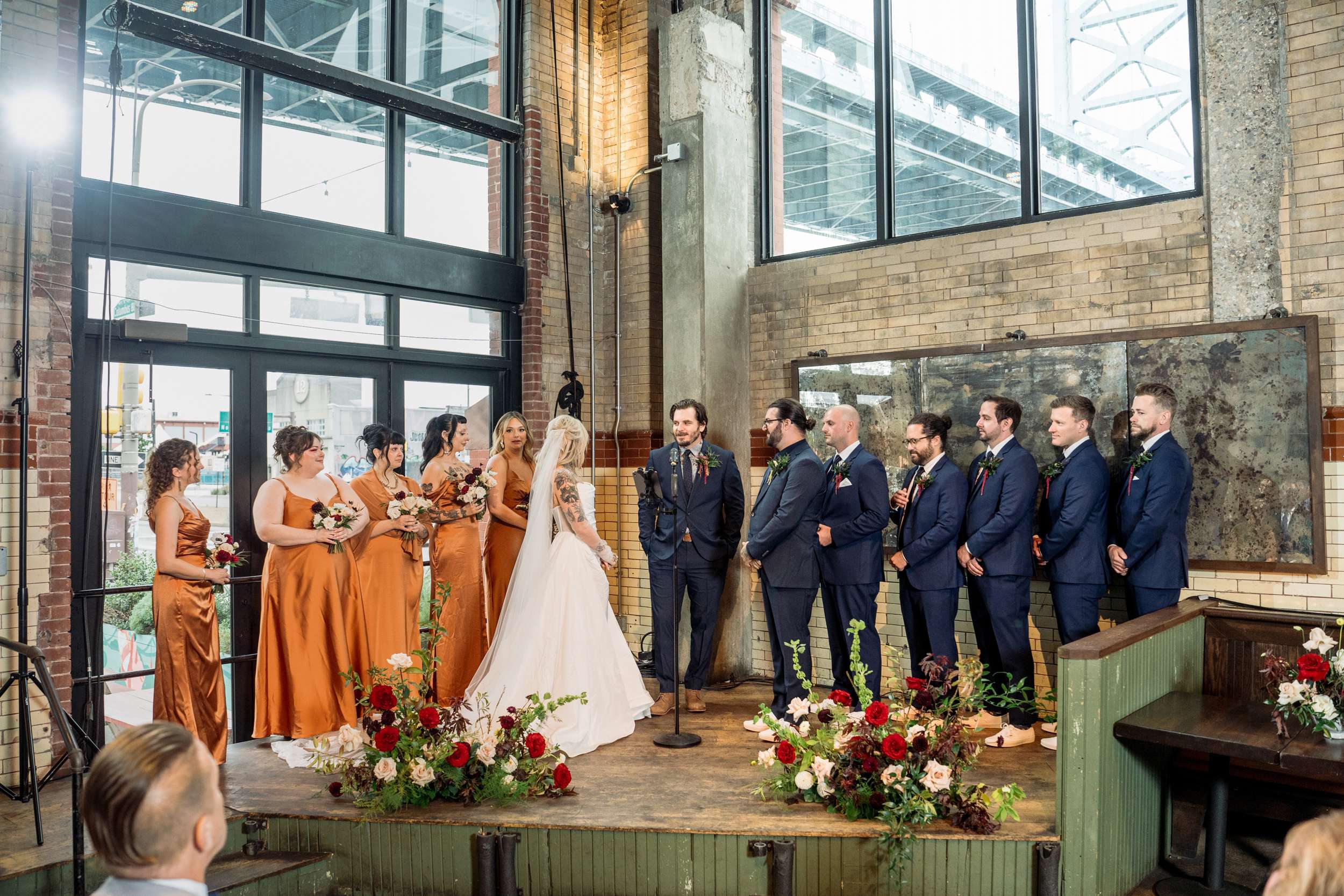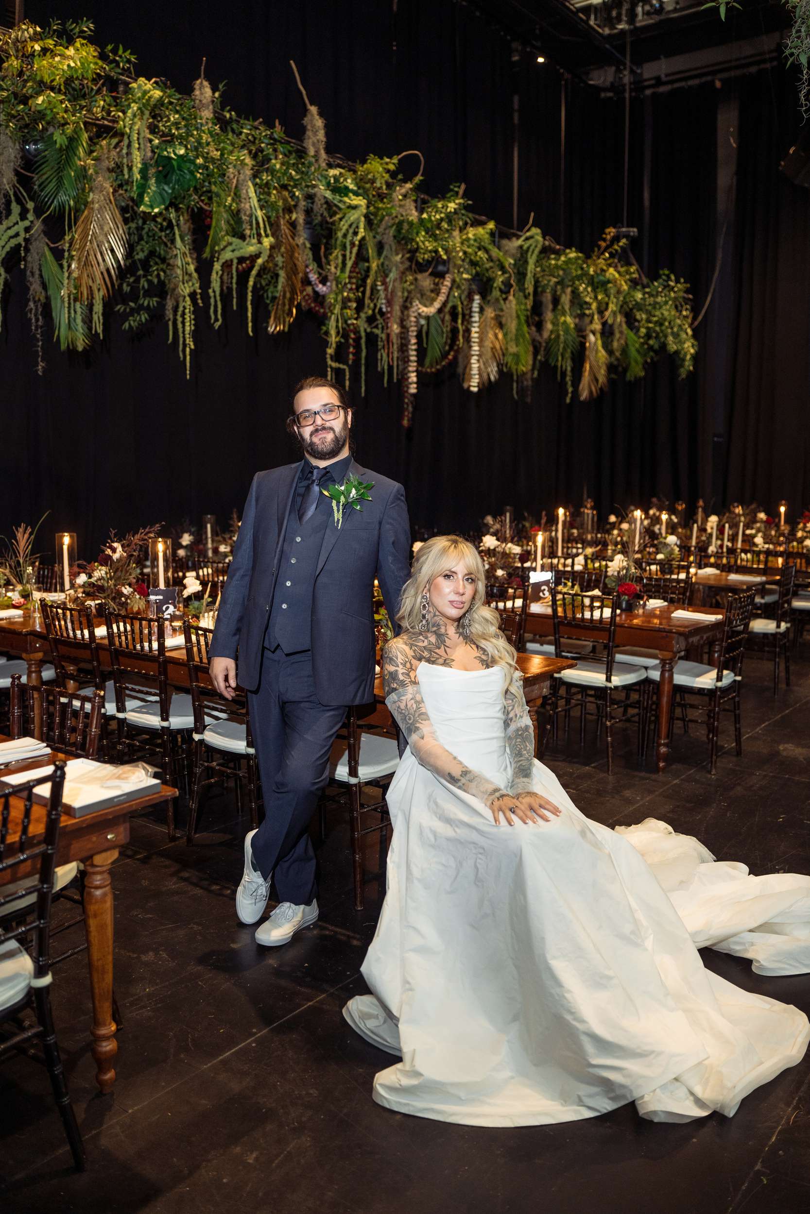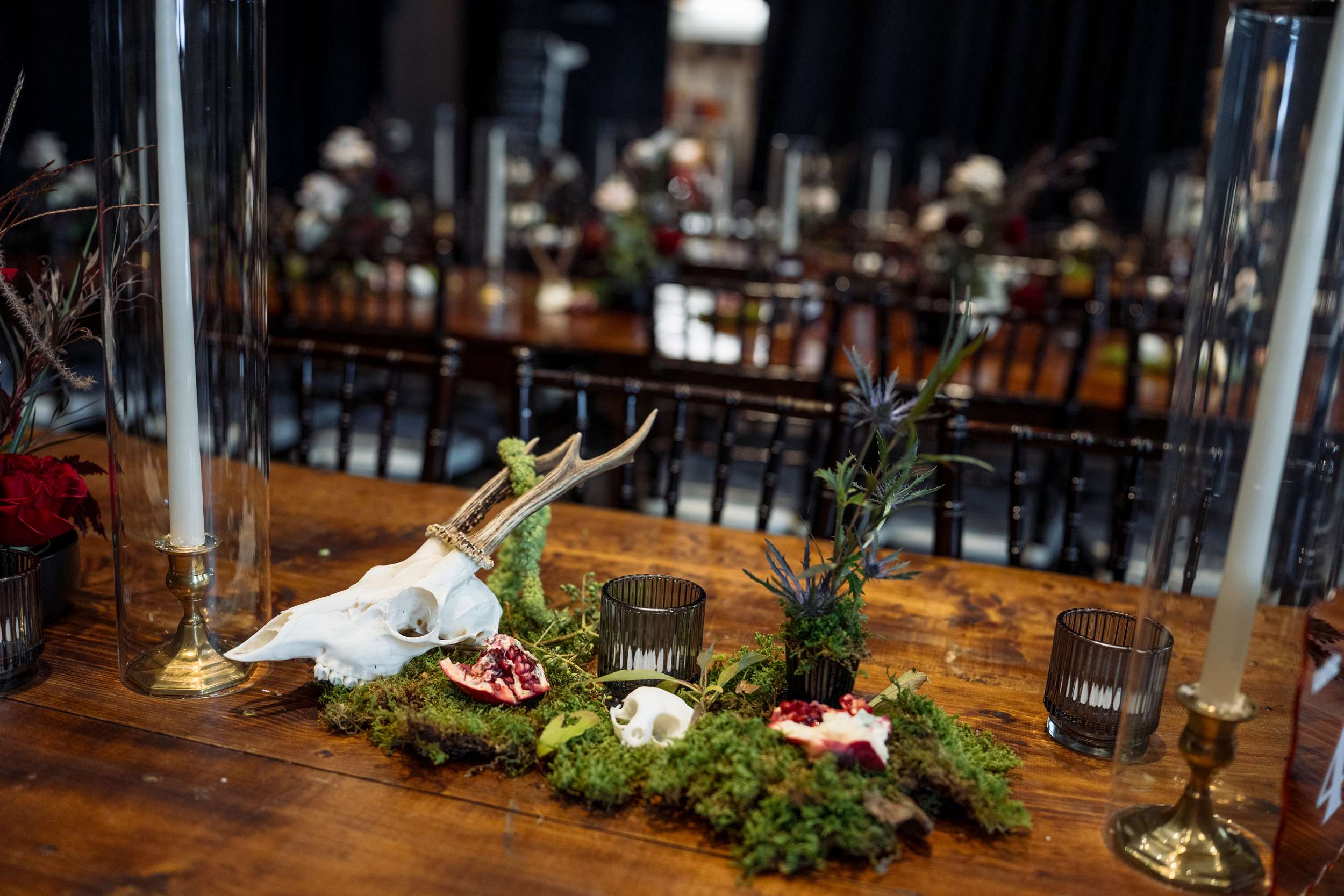 The reference point foe Nina and Lenny’s wedding was dark botanical styling with taxidermy woven through the space. They were married in the bar area of FringeArts in Philadelphia. The weather was bad all day so they had to stay inside, luckily their theme had brought the outside in!