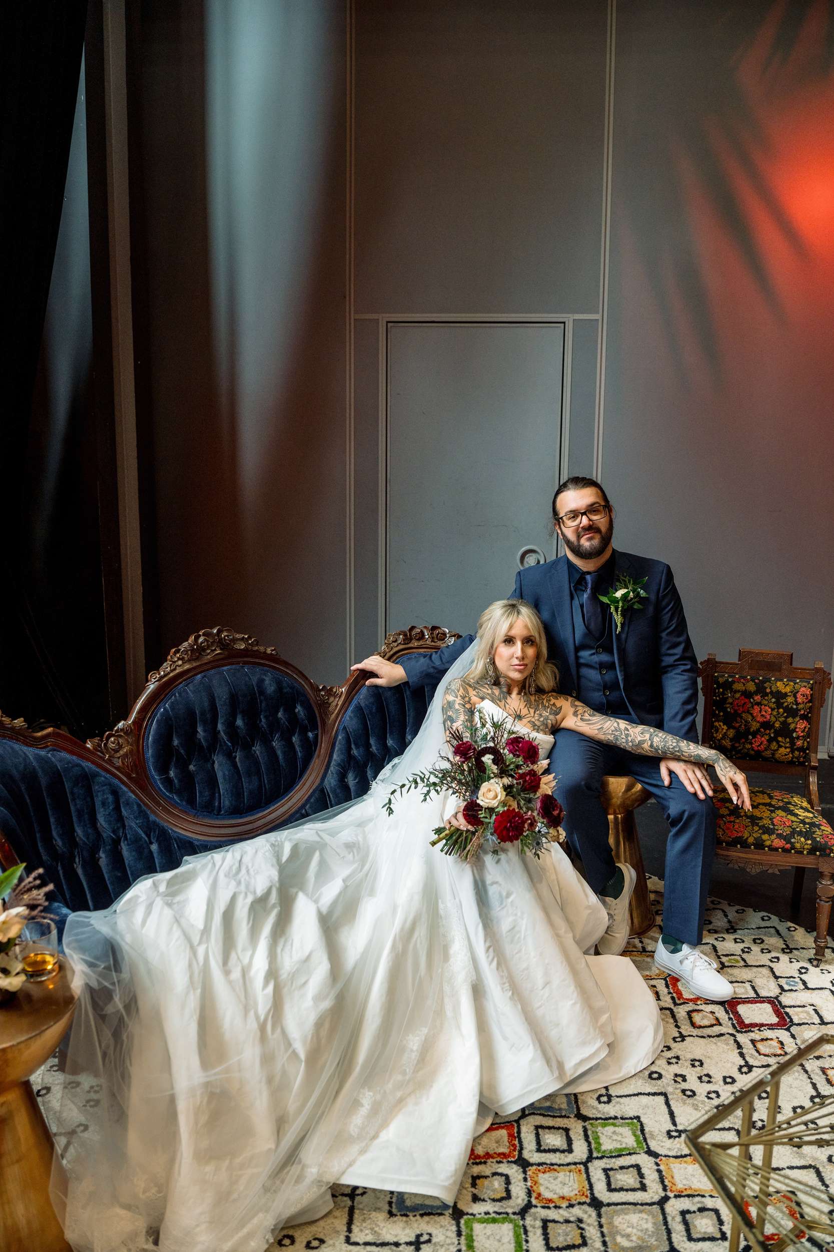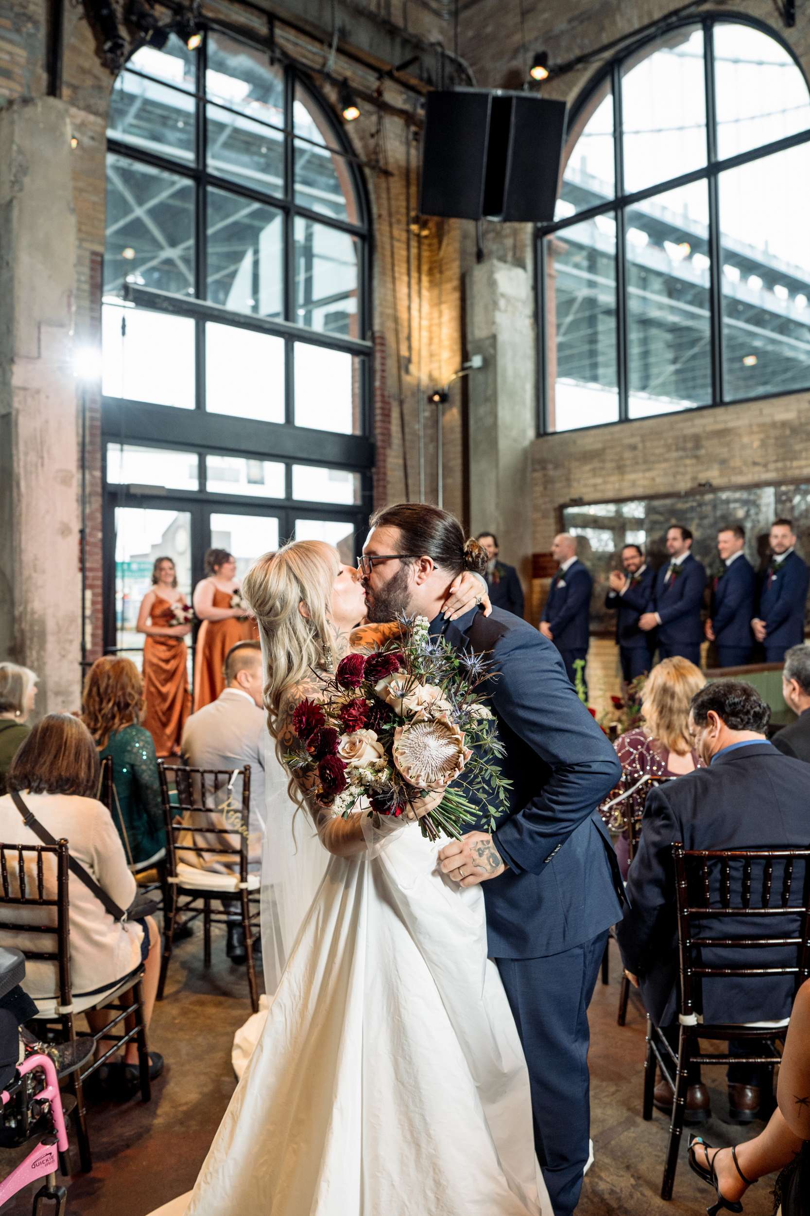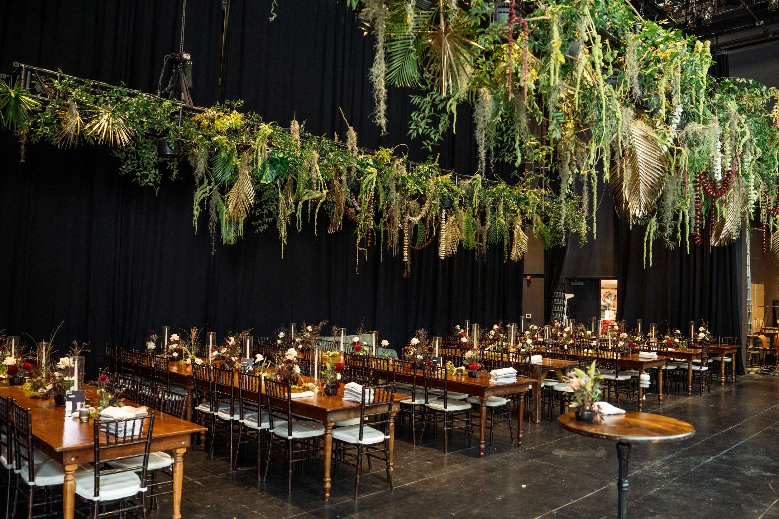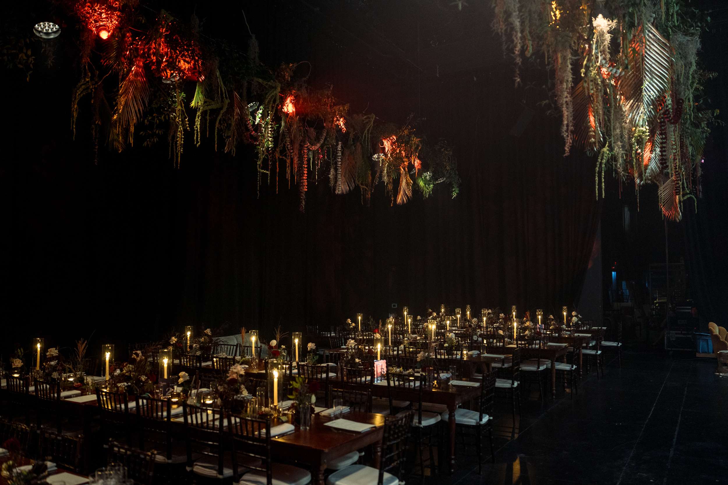 The reference point foe Nina and Lenny’s wedding was dark botanical styling with taxidermy woven through the space. They were married in the bar area of FringeArts in Philadelphia. The weather was bad all day so they had to stay inside, luckily their theme had brought the outside in!