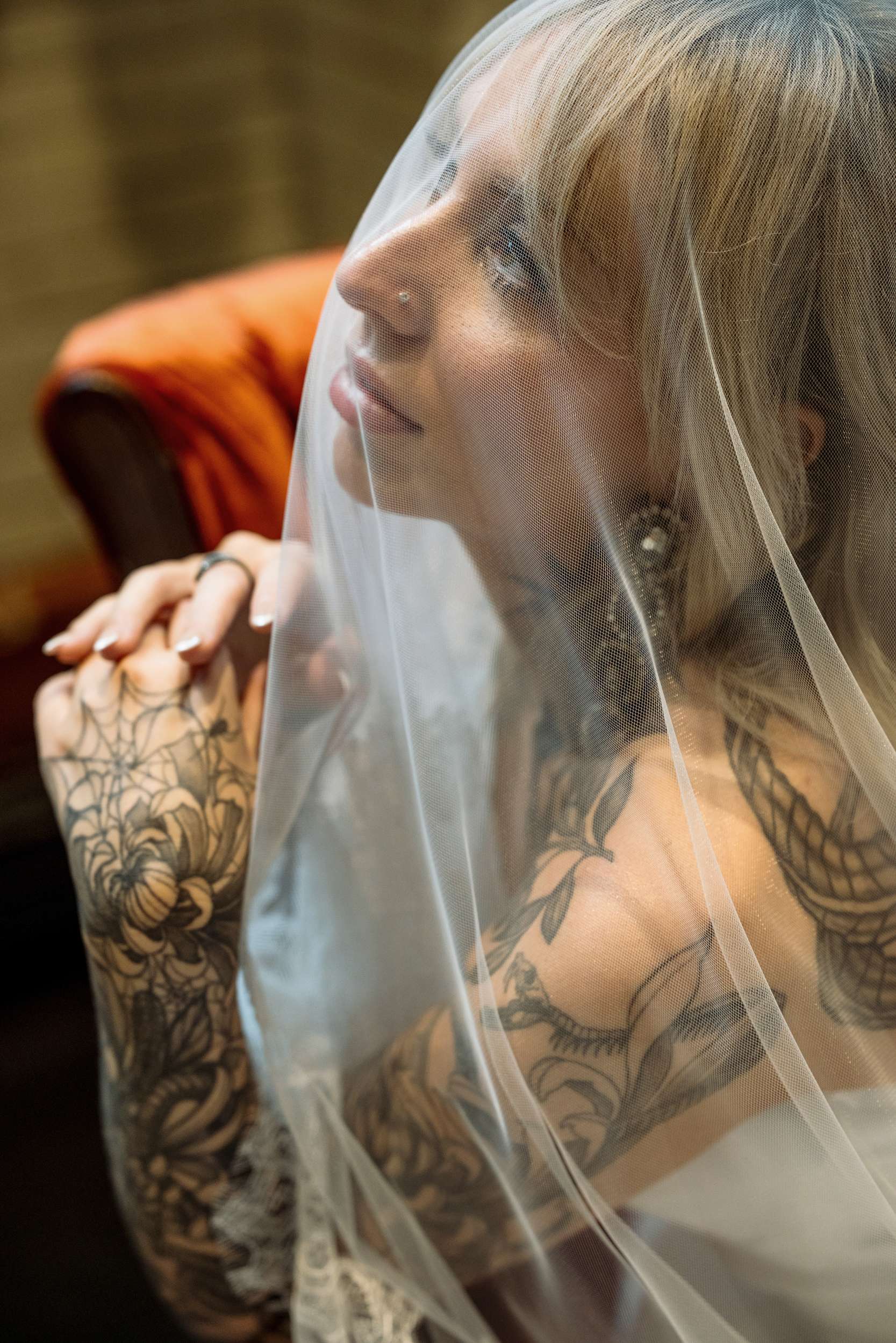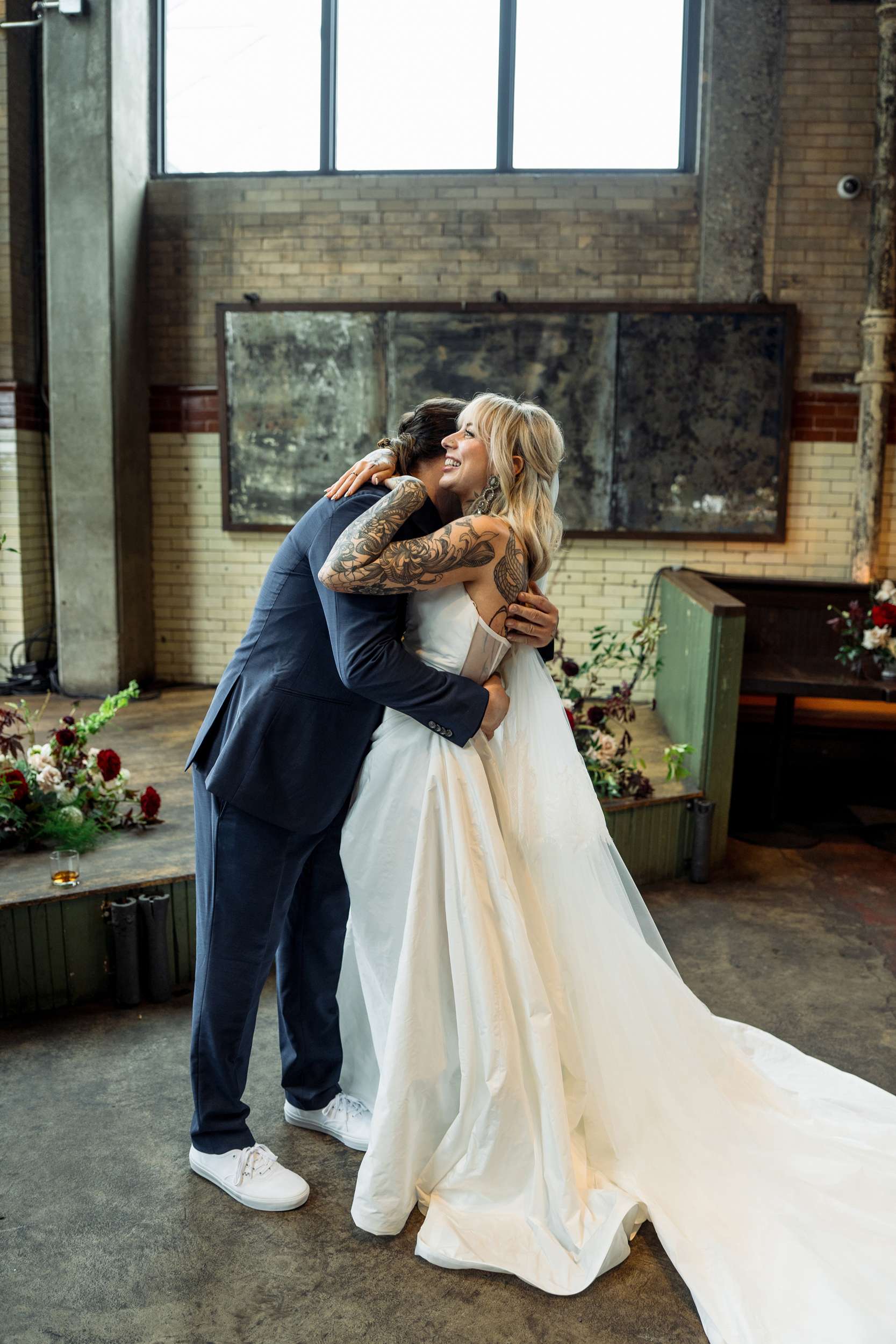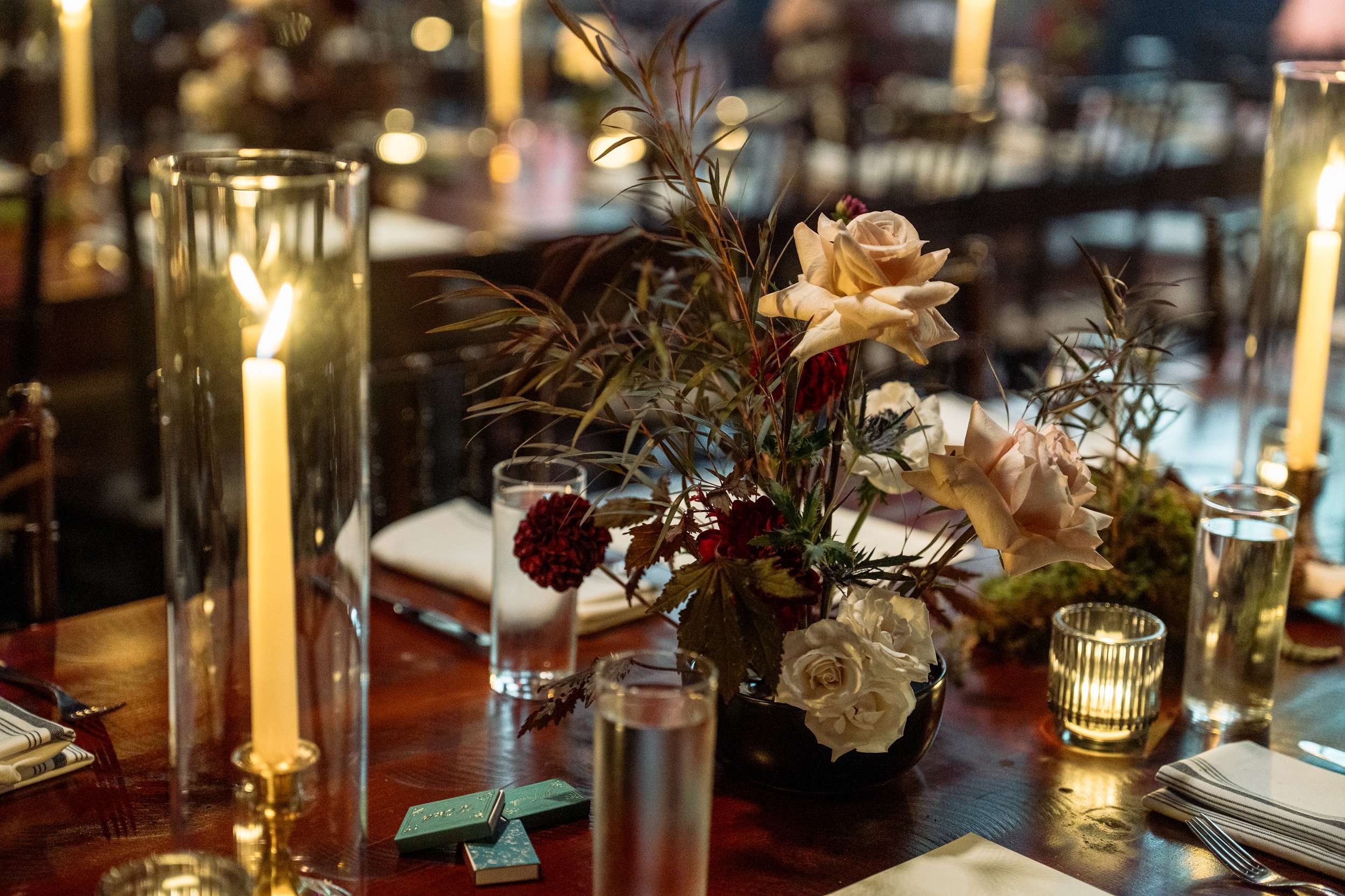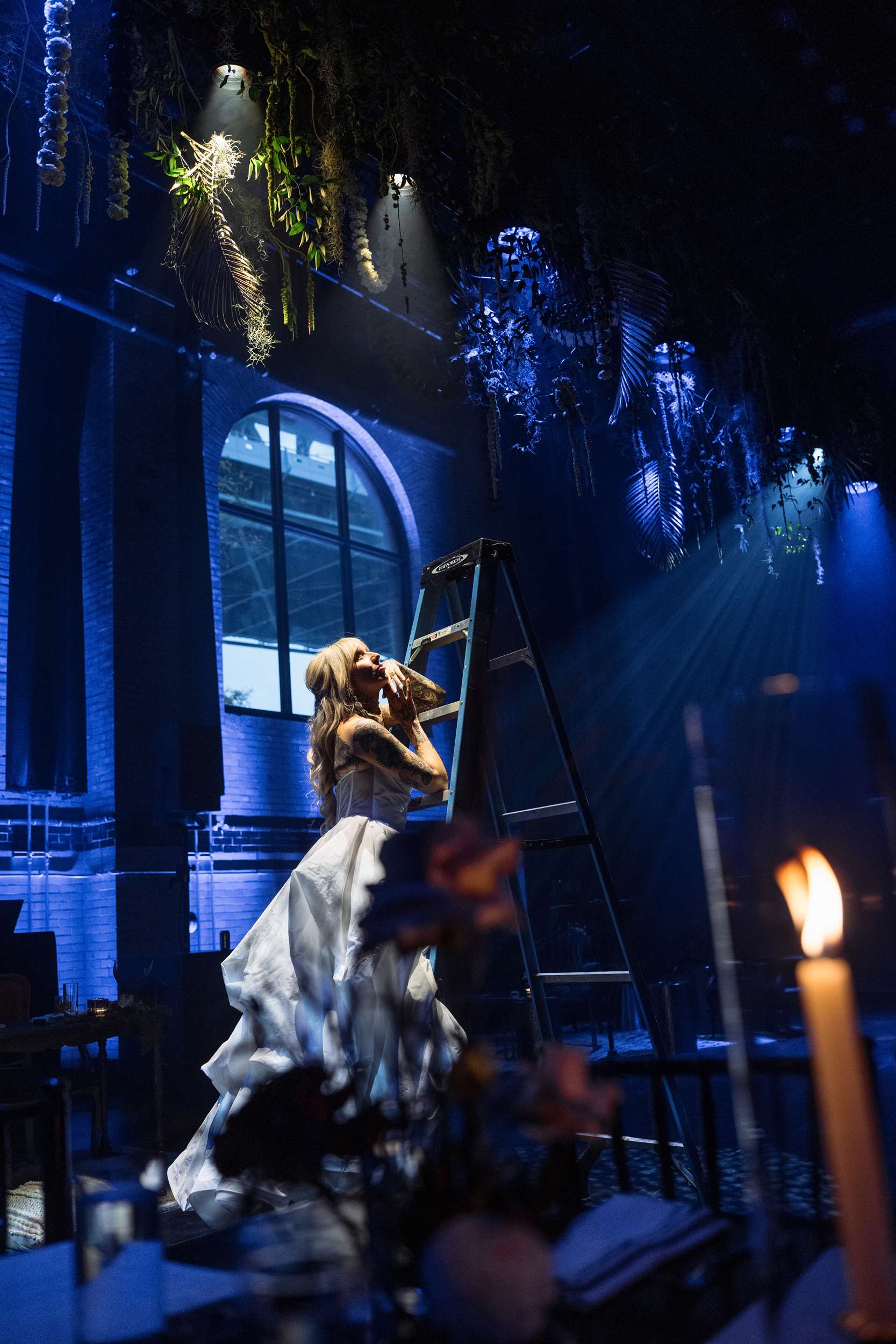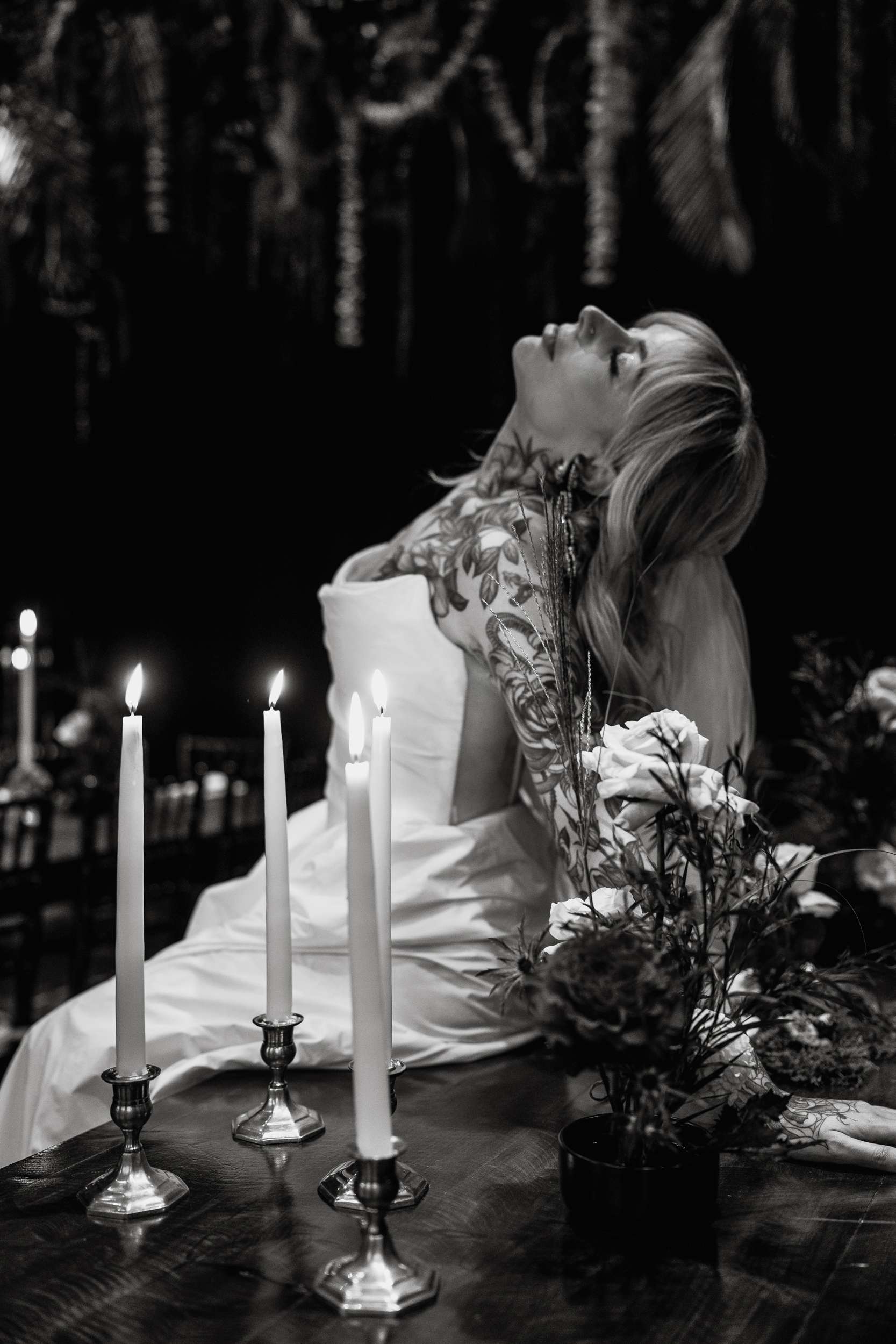 The reference point foe Nina and Lenny’s wedding was dark botanical styling with taxidermy woven through the space. They were married in the bar area of FringeArts in Philadelphia. The weather was bad all day so they had to stay inside, luckily their theme had brought the outside in!