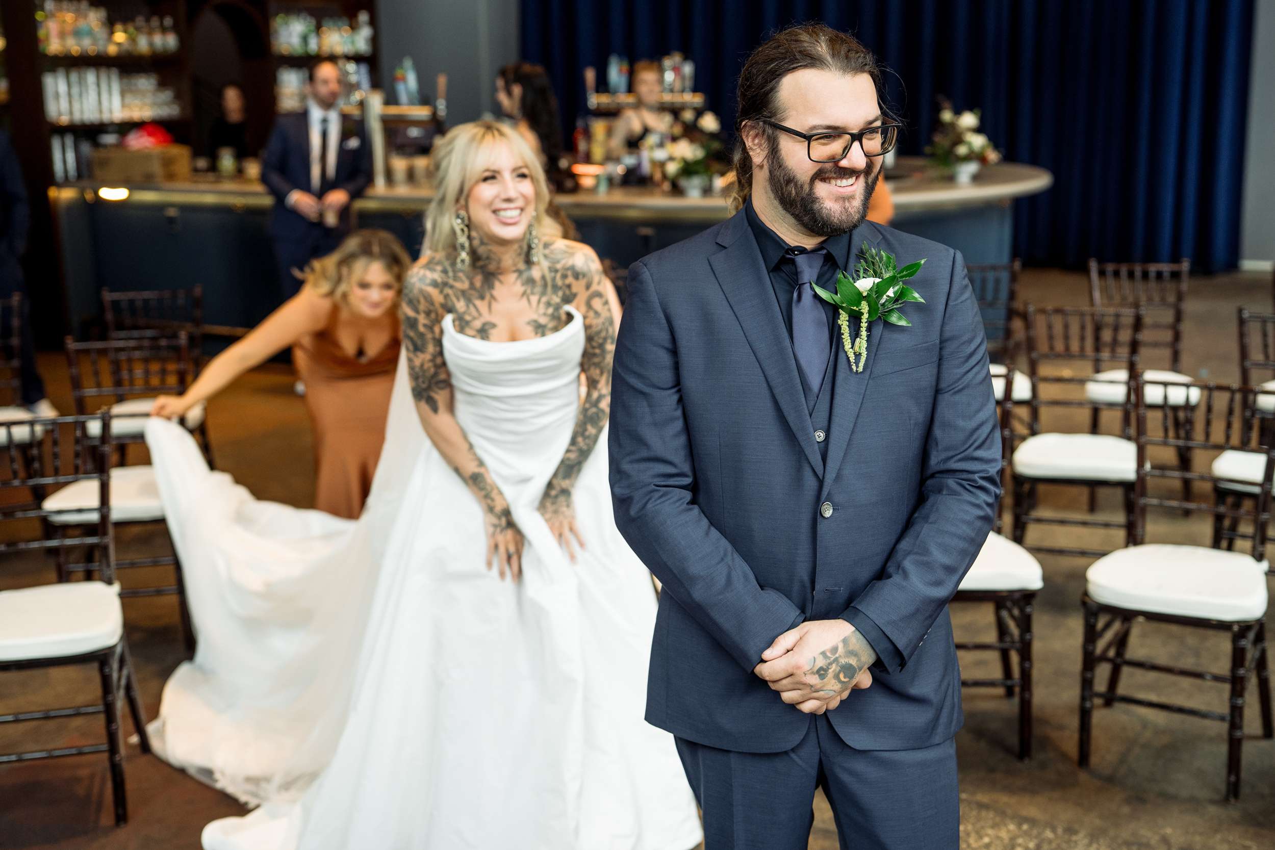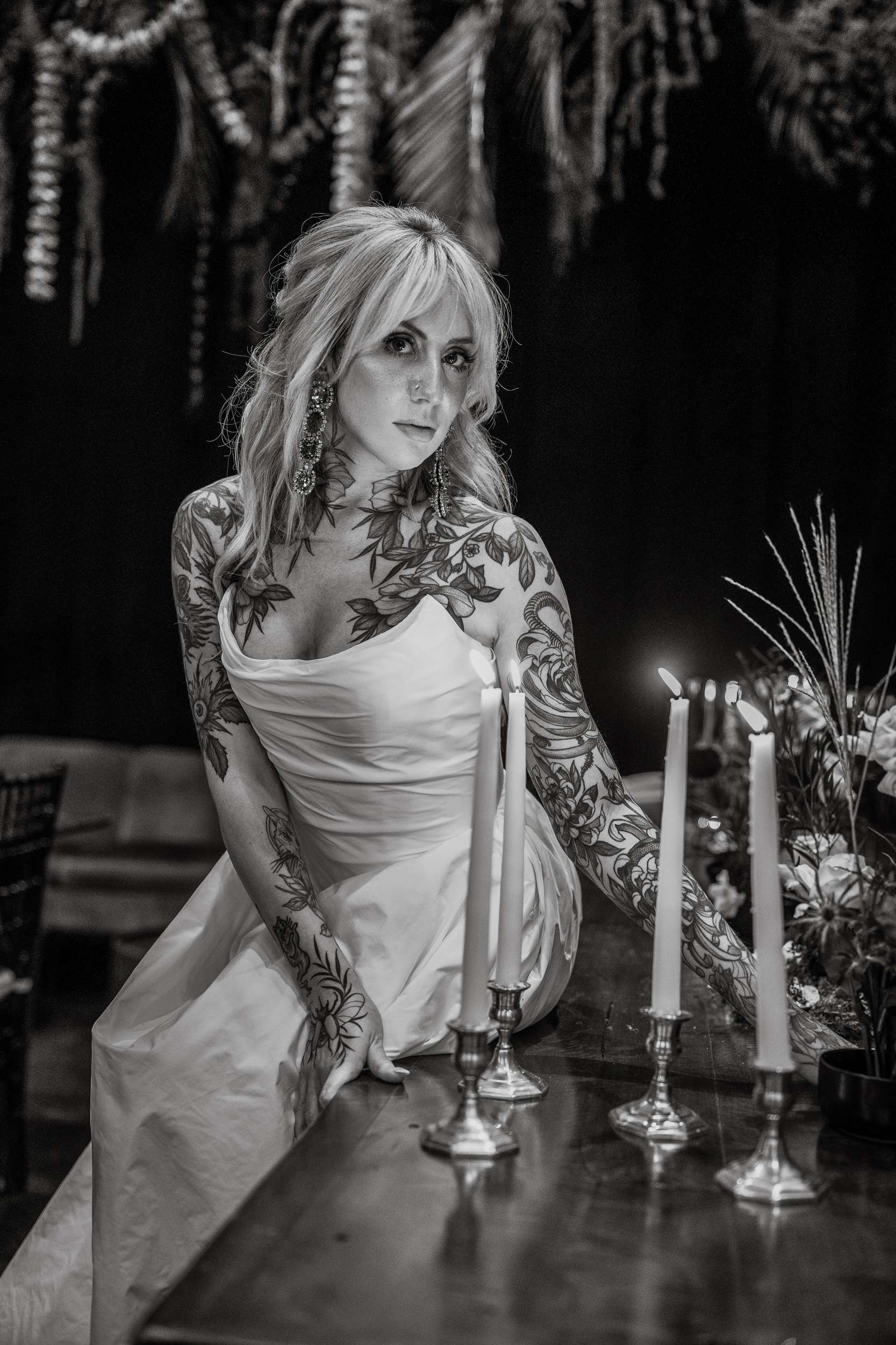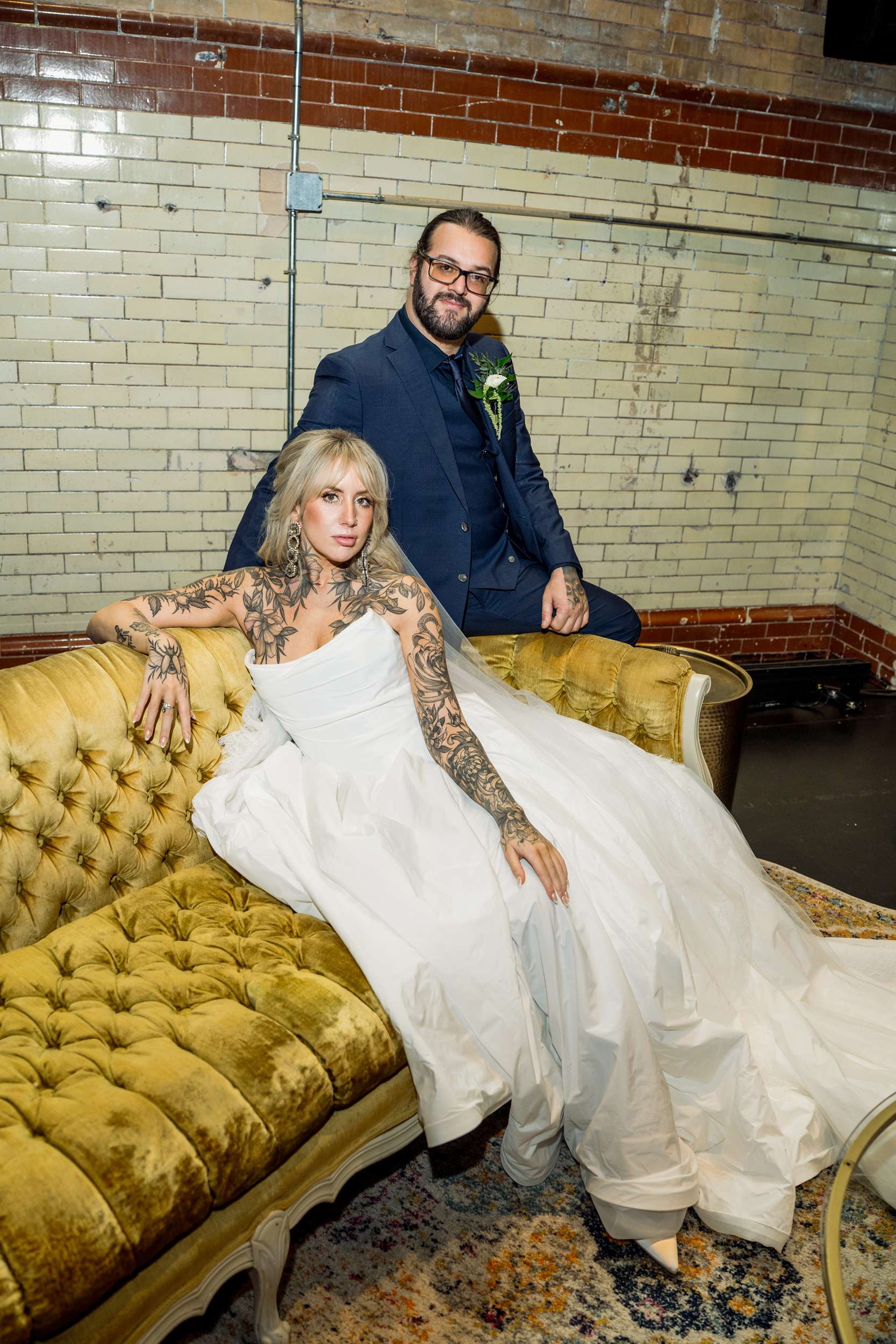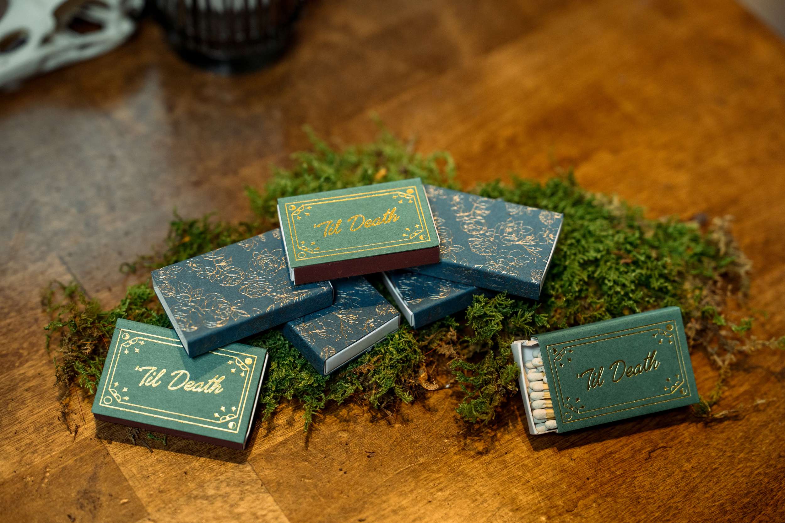 The reference point foe Nina and Lenny’s wedding was dark botanical styling with taxidermy woven through the space. They were married in the bar area of FringeArts in Philadelphia. The weather was bad all day so they had to stay inside, luckily their theme had brought the outside in!