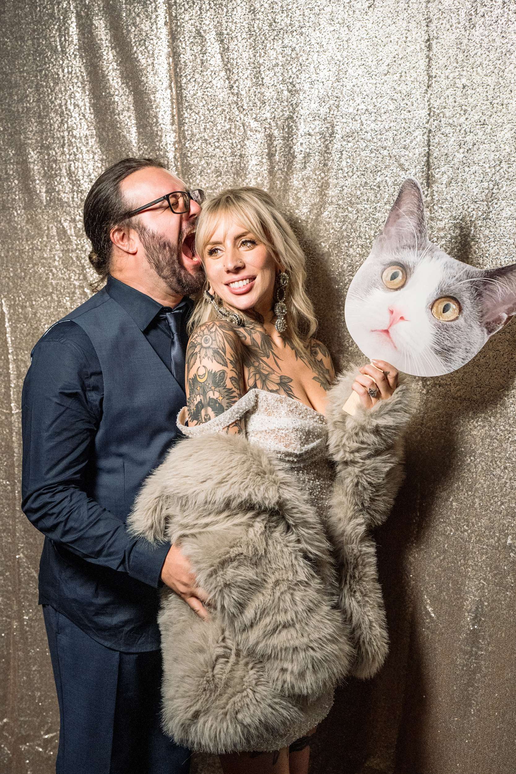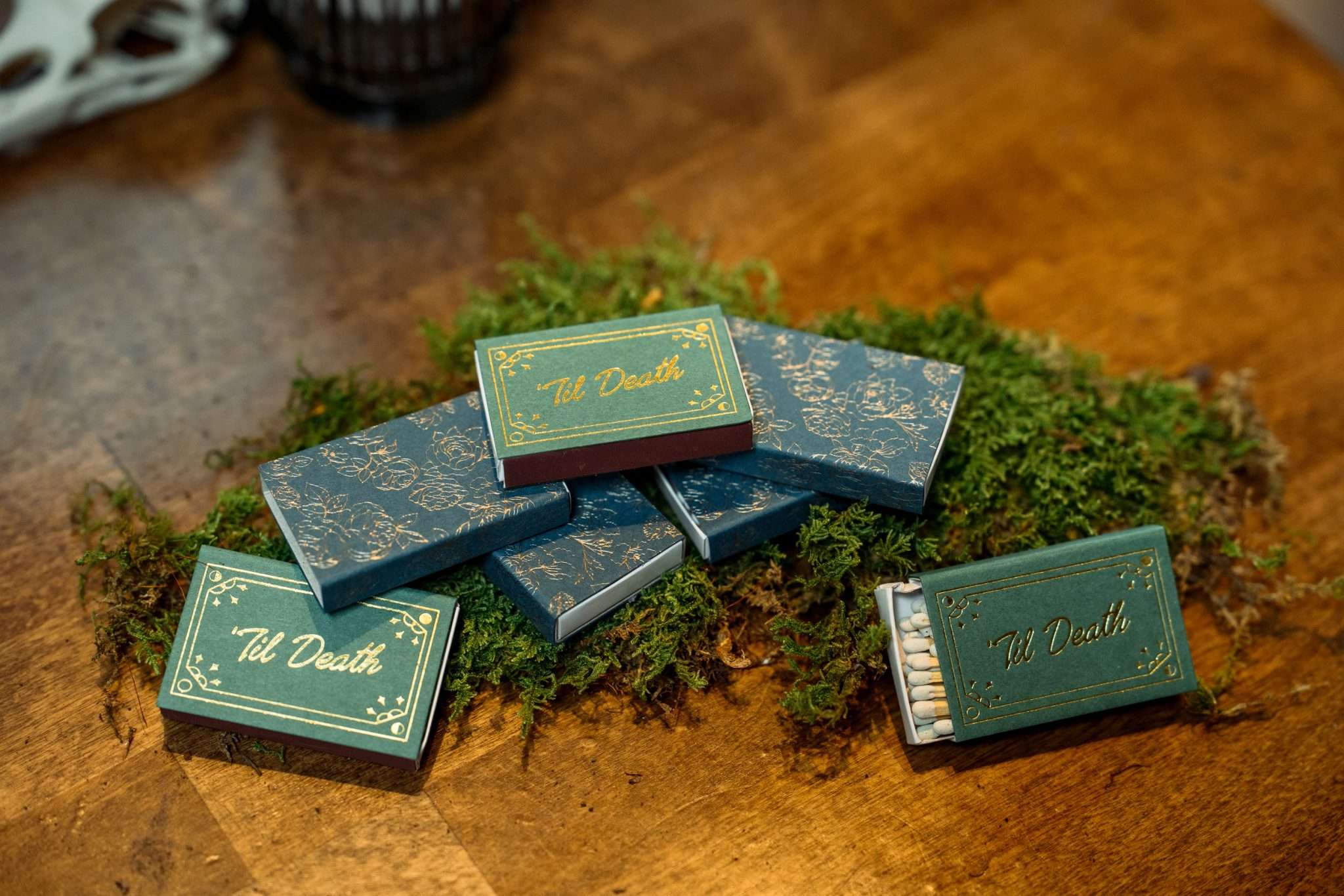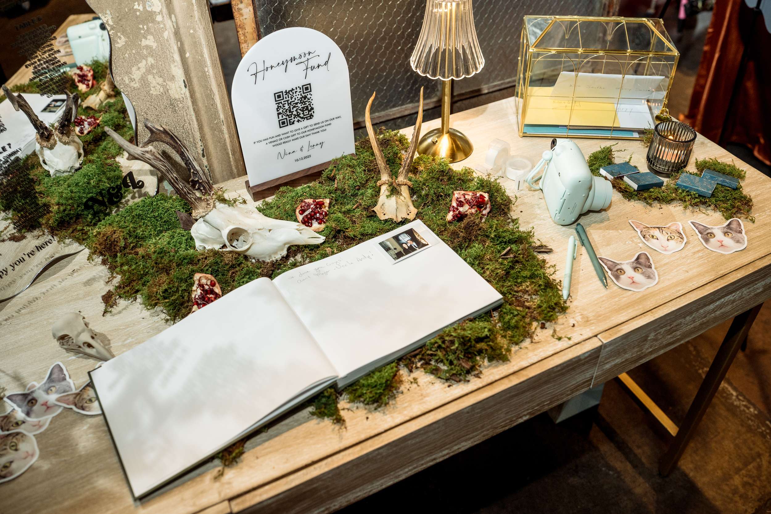 The décor was one of the bride’s main focuses, she loved pulling it all together. Nina selected the taxidermy pieces herself and treated them as part of the guest experience rather than fixed styling. Guests were even encouraged to take pieces home. “We wanted everything to feel like a moody botanical dream”, explained the bride, “Lush greens, curated taxidermy, and a hit of glam. With Lenny’s band lighting and Nina’s hairstyling artistry, adding our own creative fingerprints was the easiest part.”