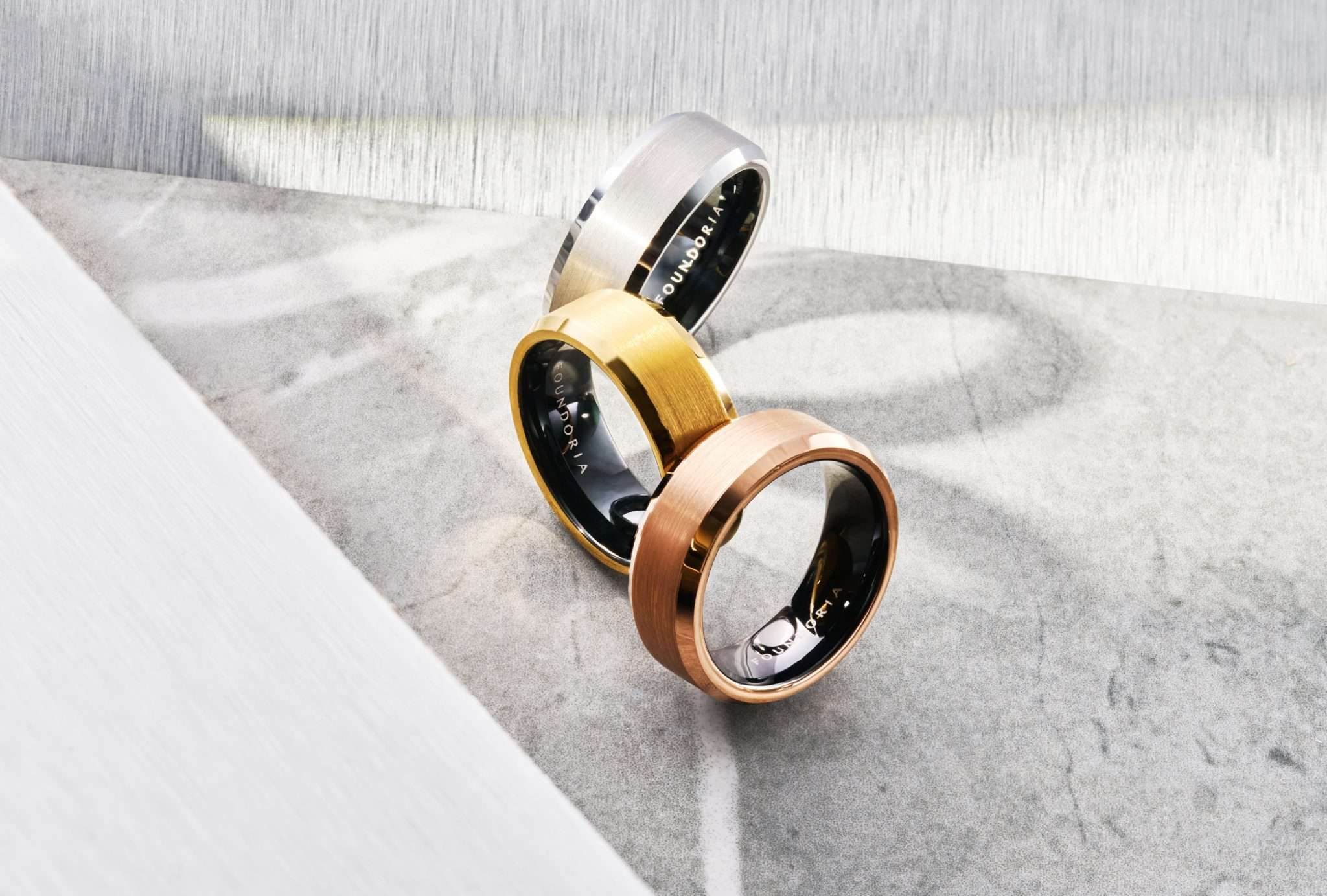 Some collections lean fully into this aesthetic. Foundoria’s TUNGRA range focuses on solid tungsten bands without natural inlays, available in colours from classic steel grey to gold and black.