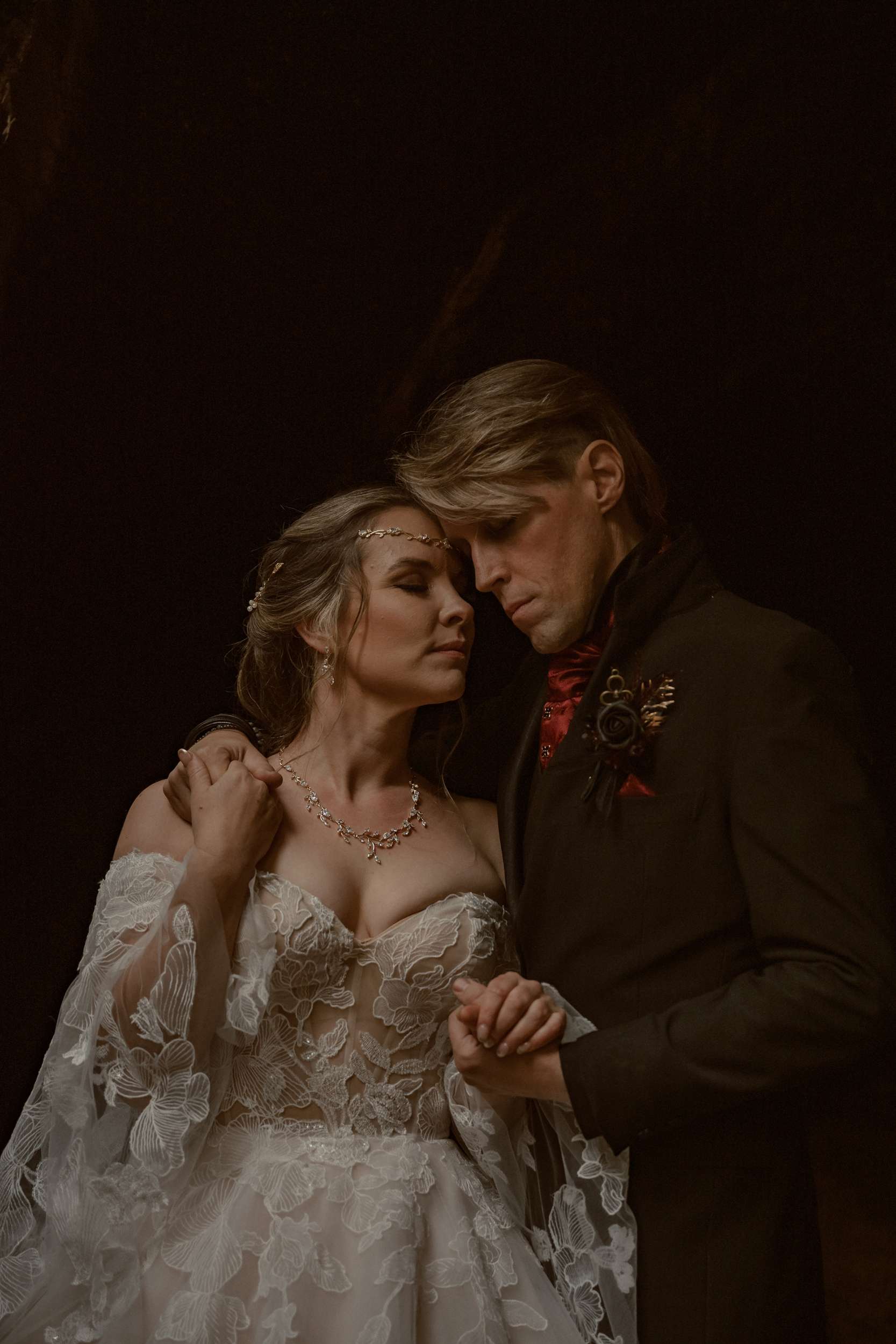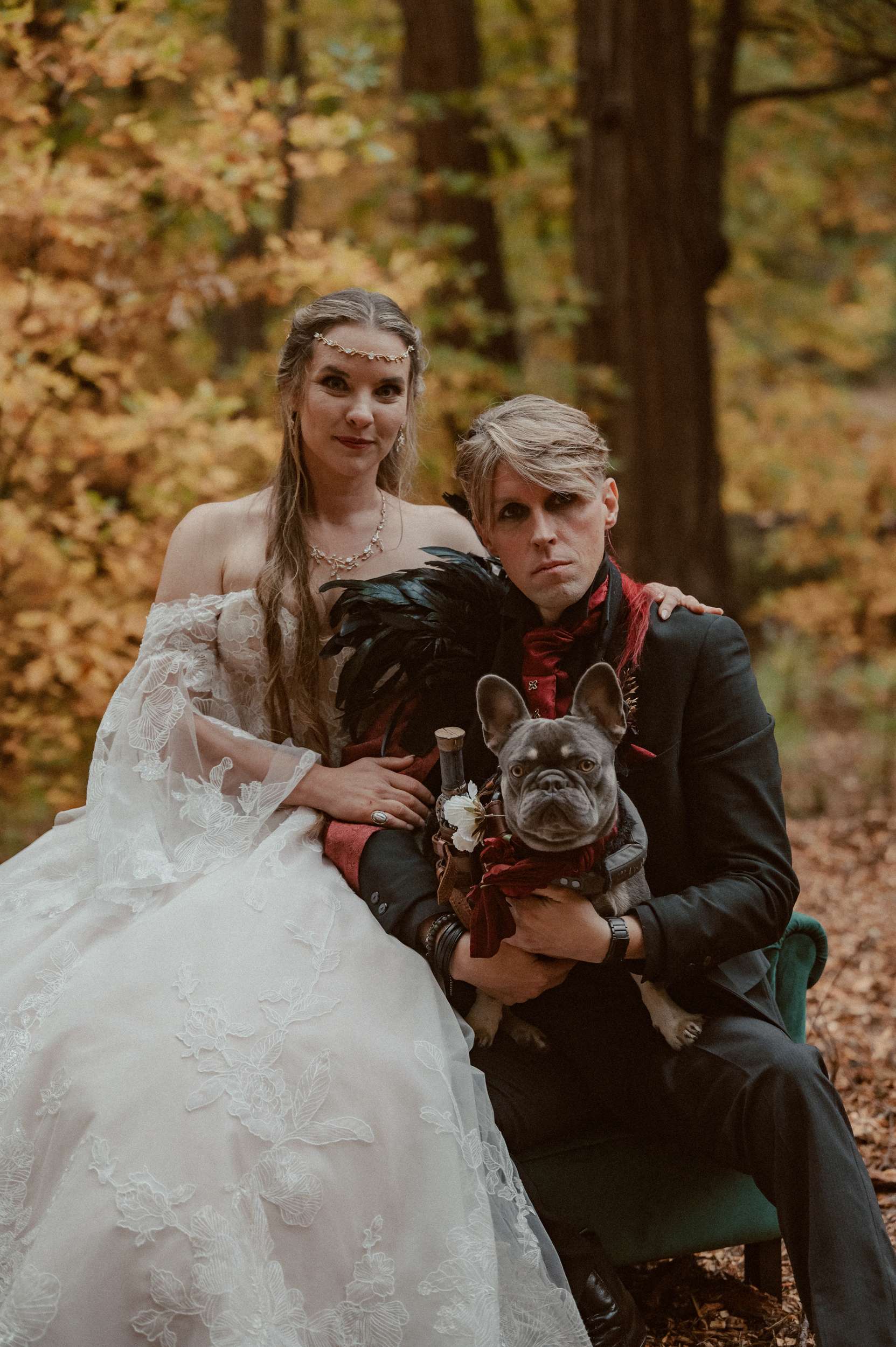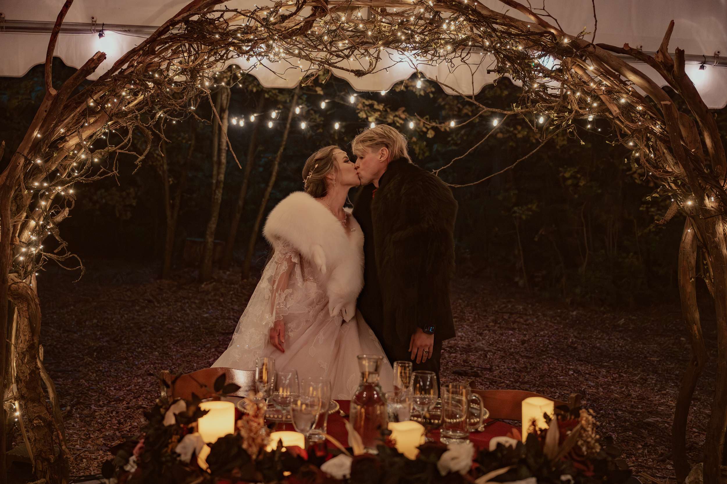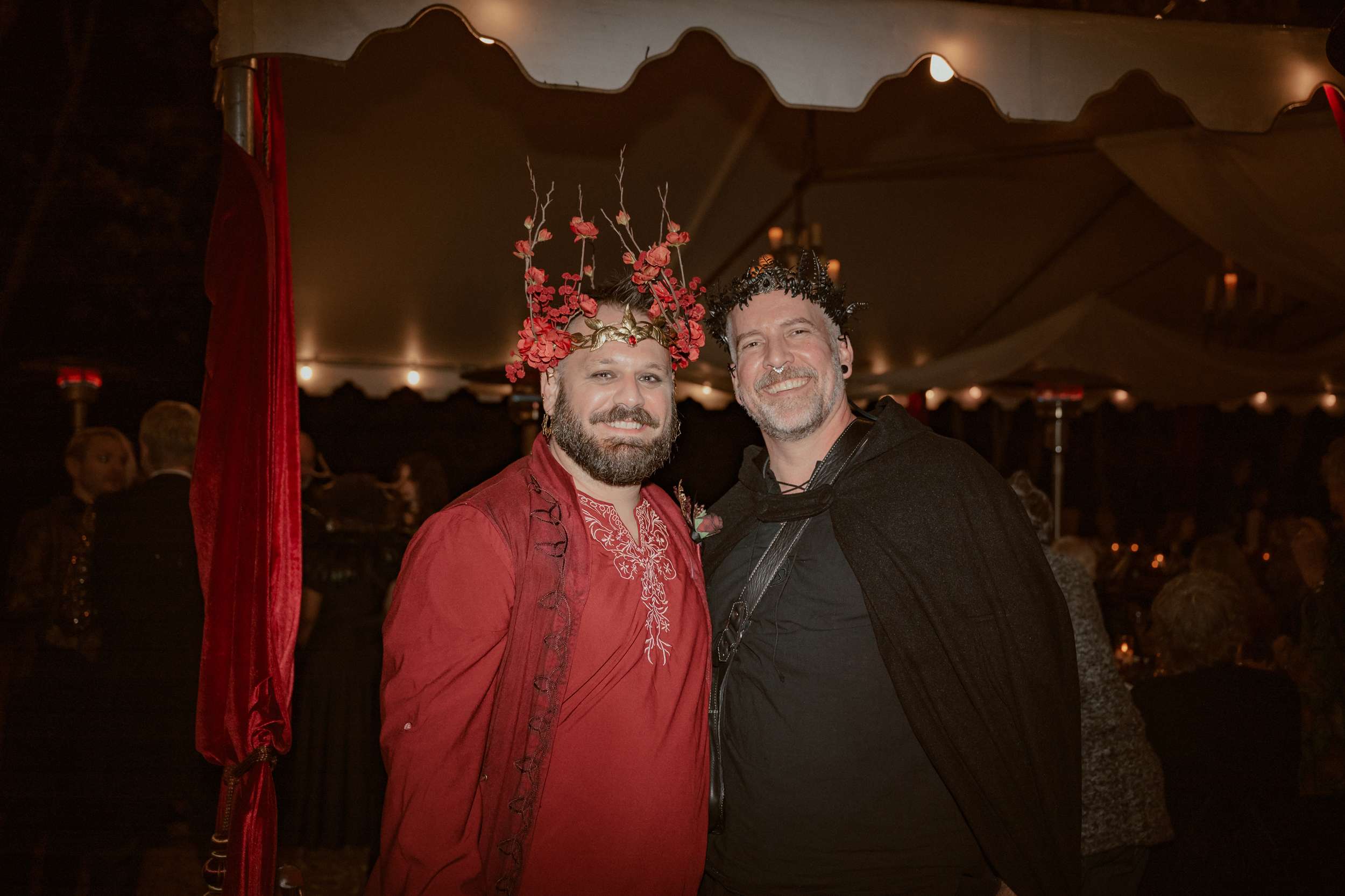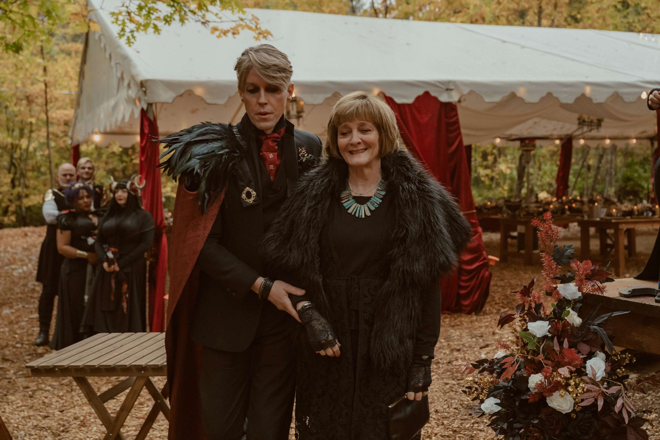 Their wedding theme was called The Contract. It drew from fairytale lore where deals with the fae are sealed through ritual, feasts and promises. The groom wrote the ceremony using his experience with LARP and immersive theatre. It imagined two fae courts meeting in a formal pact. Nox’s side represented the Unseelie Court, the darker fae. Fabienne’s side stood for the Seelie Court, the light. Rather than splitting the wedding party along gender lines, they chose their closest people and divided them between the two houses.