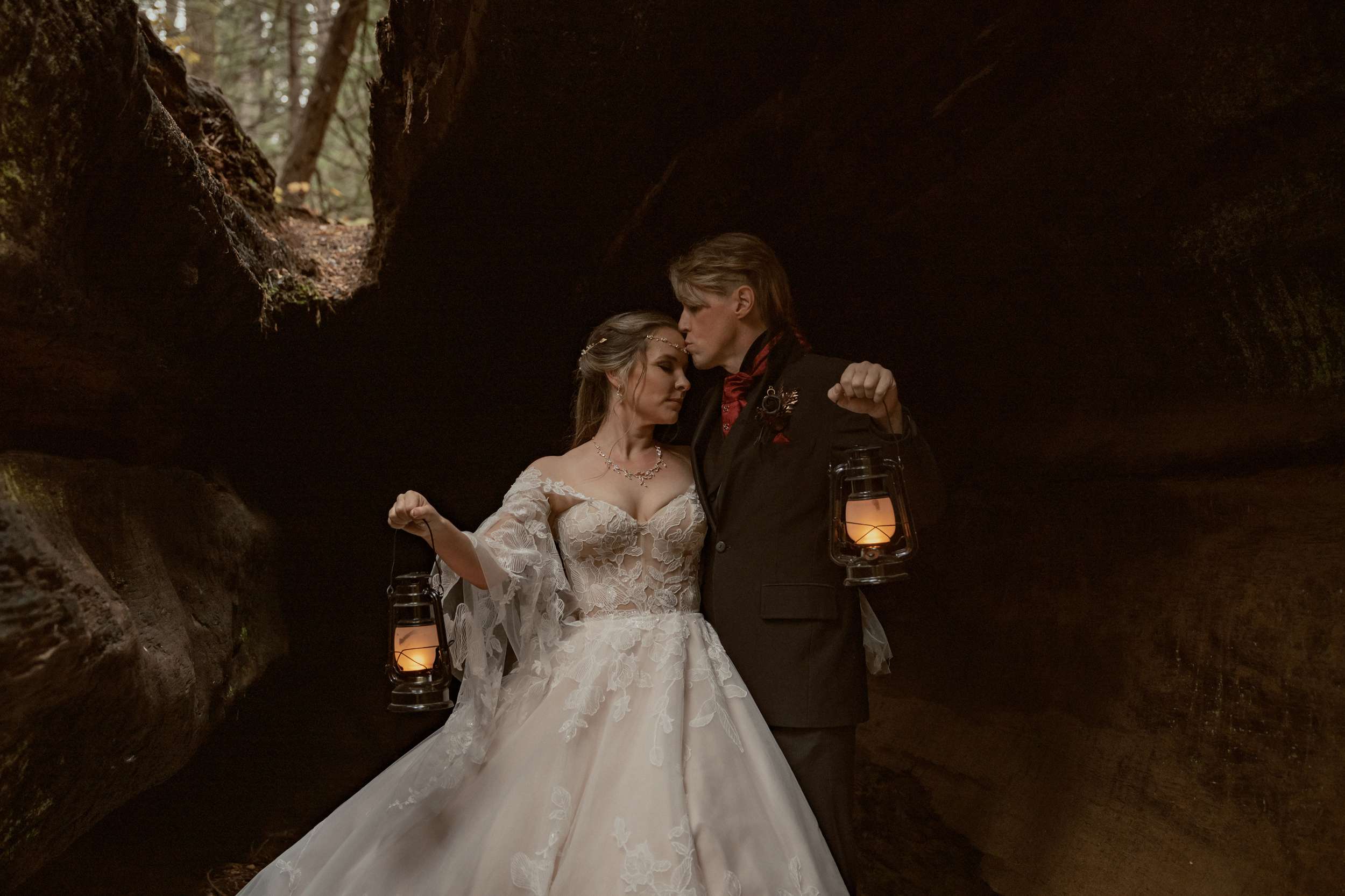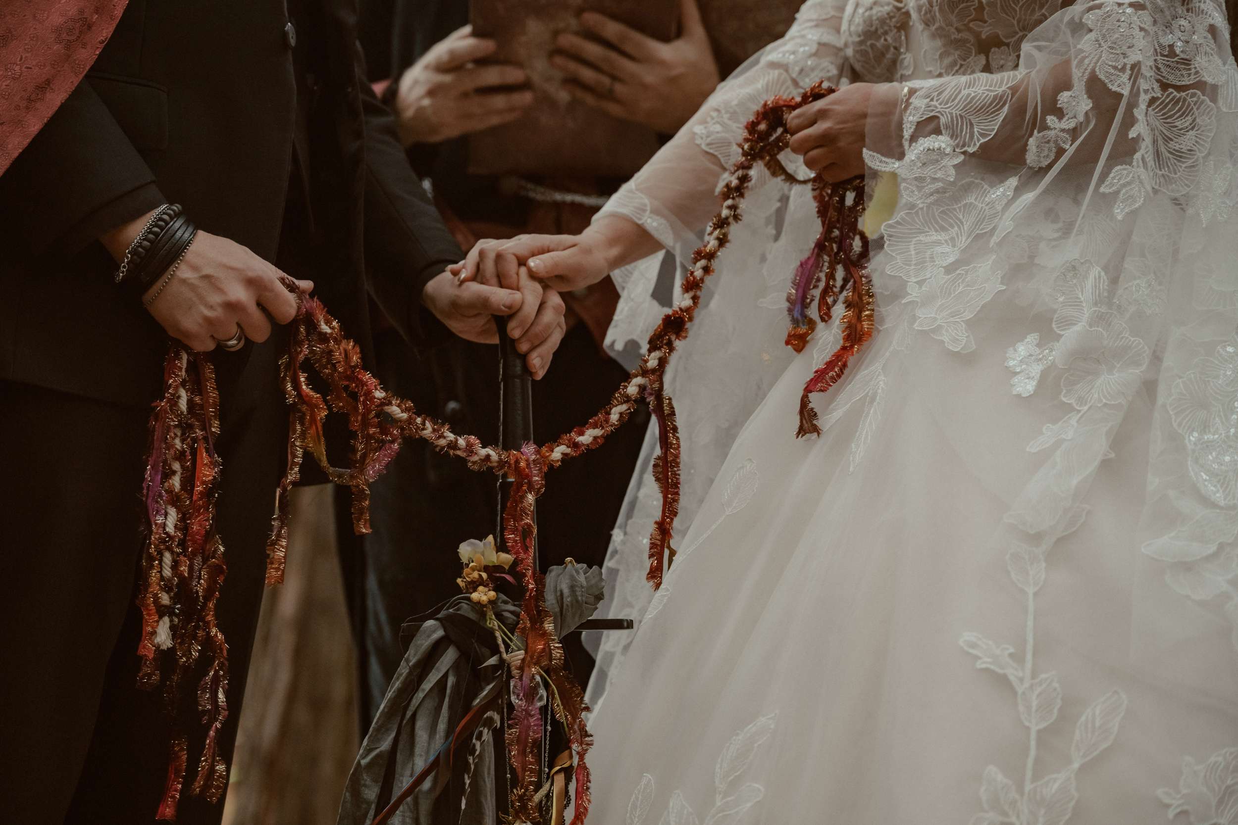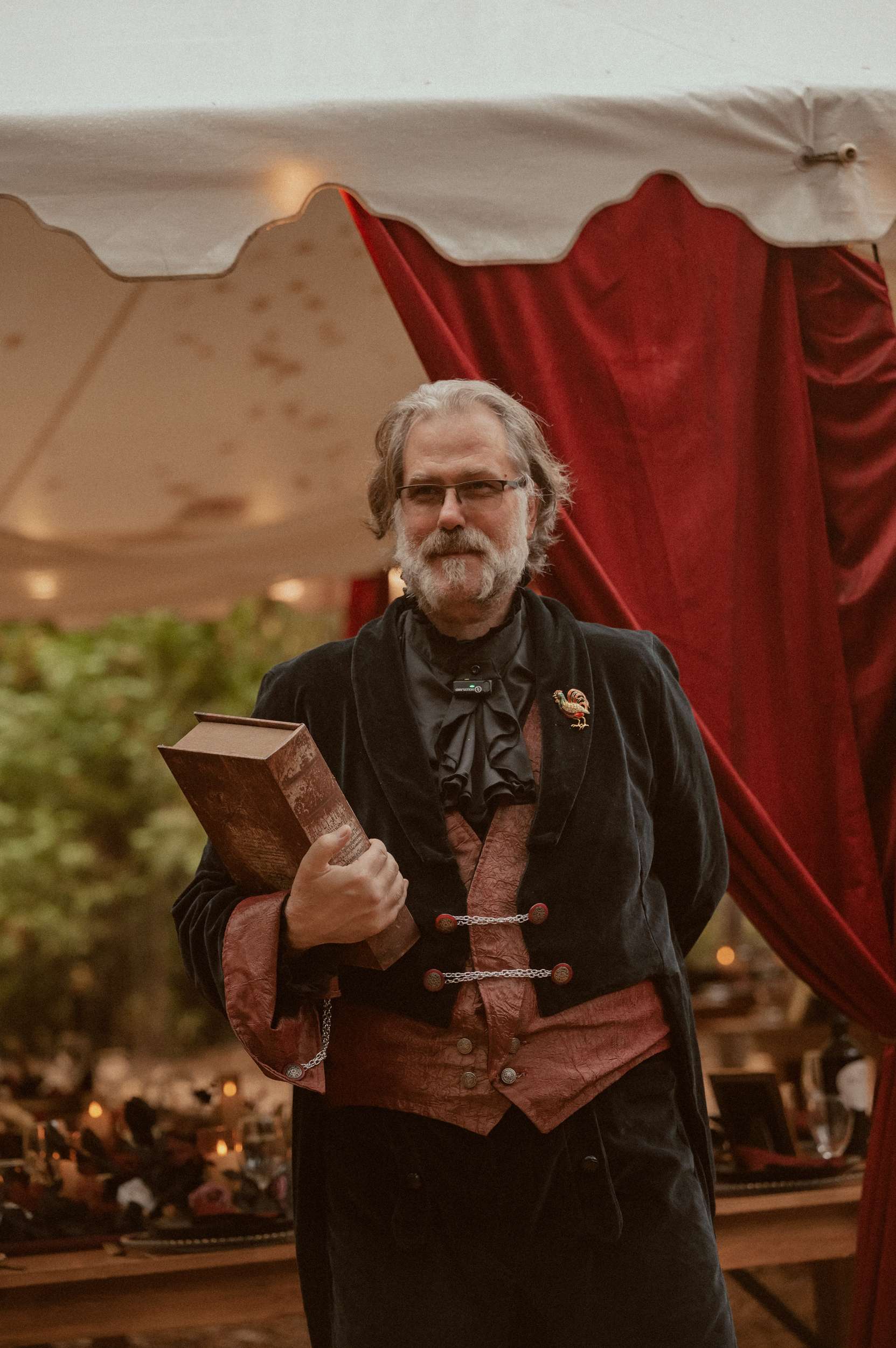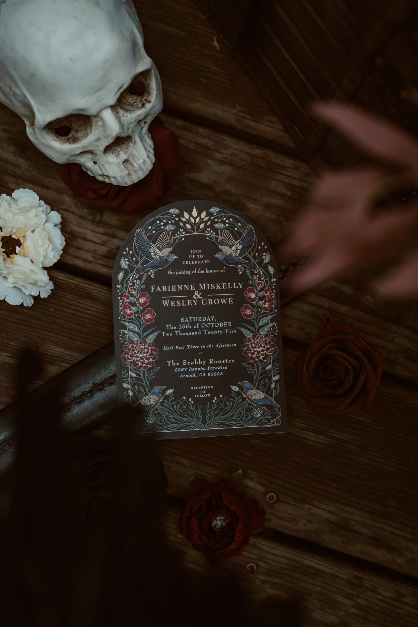 Their wedding theme was called The Contract. It drew from fairytale lore where deals with the fae are sealed through ritual, feasts and promises. The groom wrote the ceremony using his experience with LARP and immersive theatre. It imagined two fae courts meeting in a formal pact. Nox’s side represented the Unseelie Court, the darker fae. Fabienne’s side stood for the Seelie Court, the light. Rather than splitting the wedding party along gender lines, they chose their closest people and divided them between the two houses.