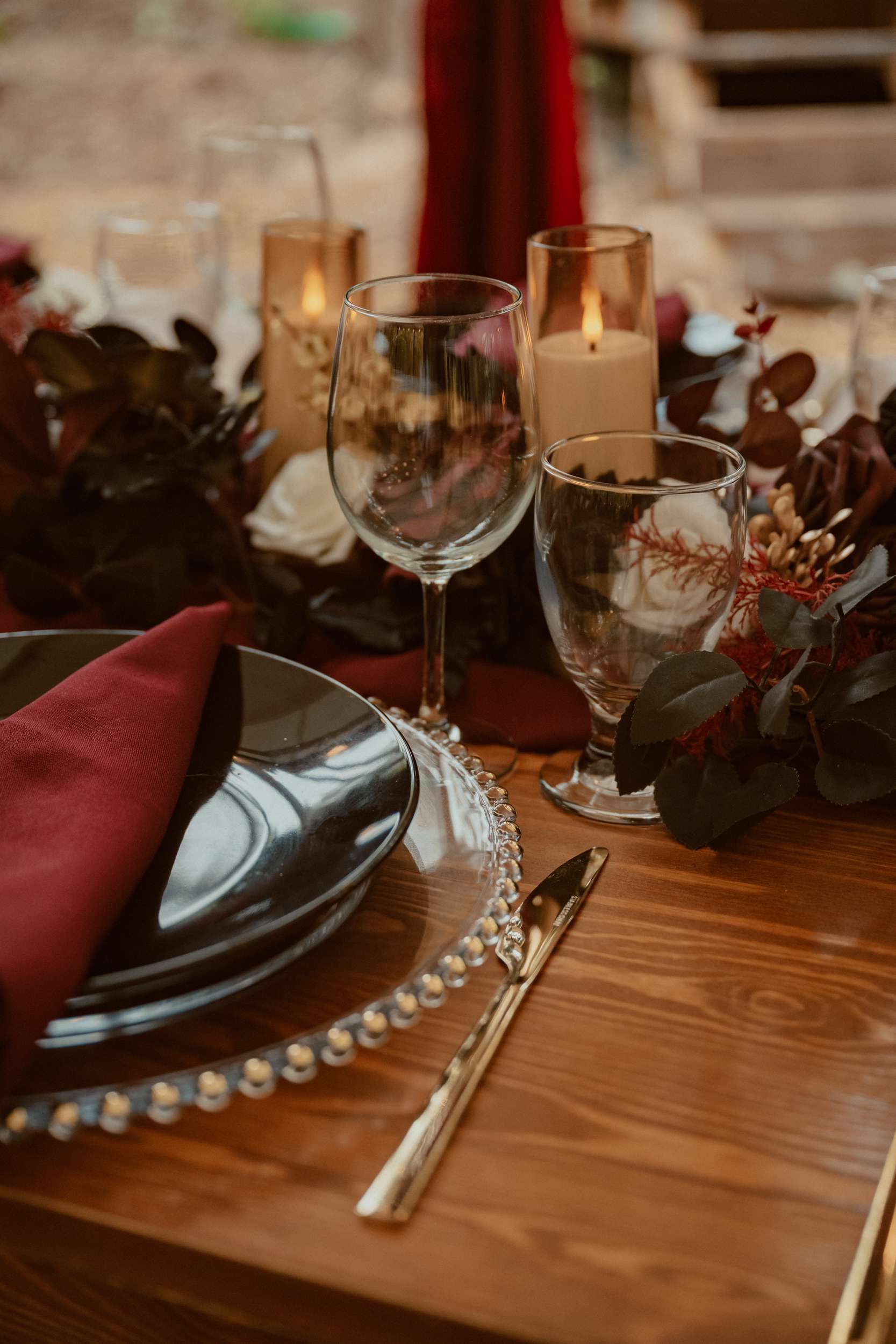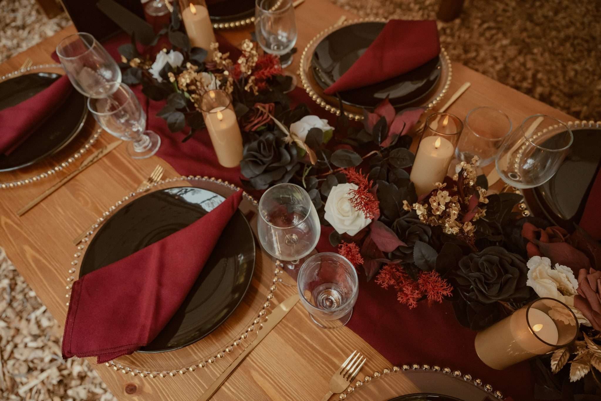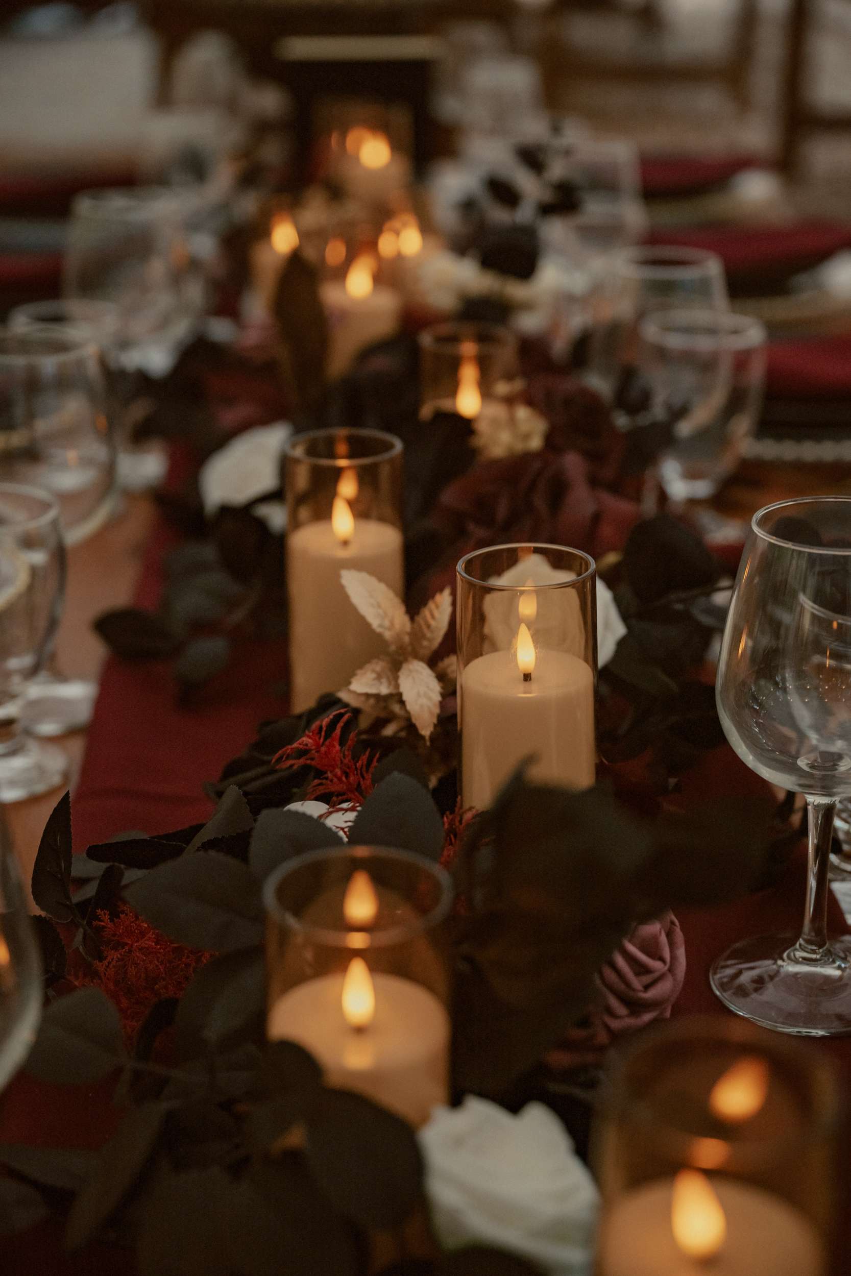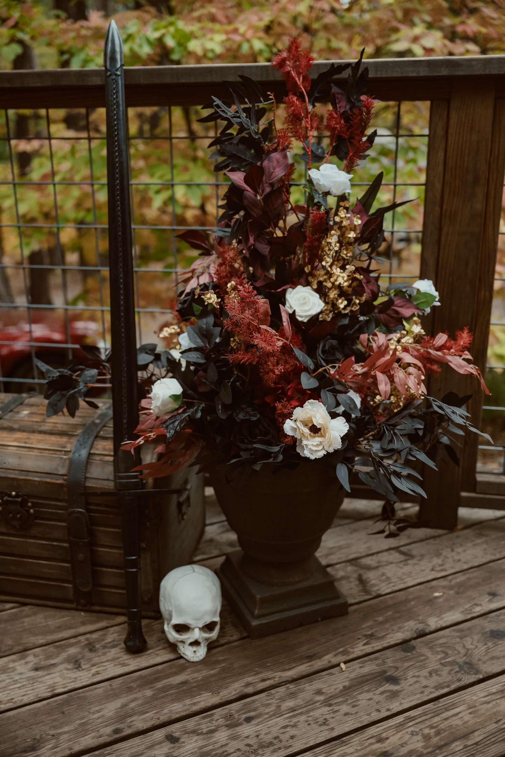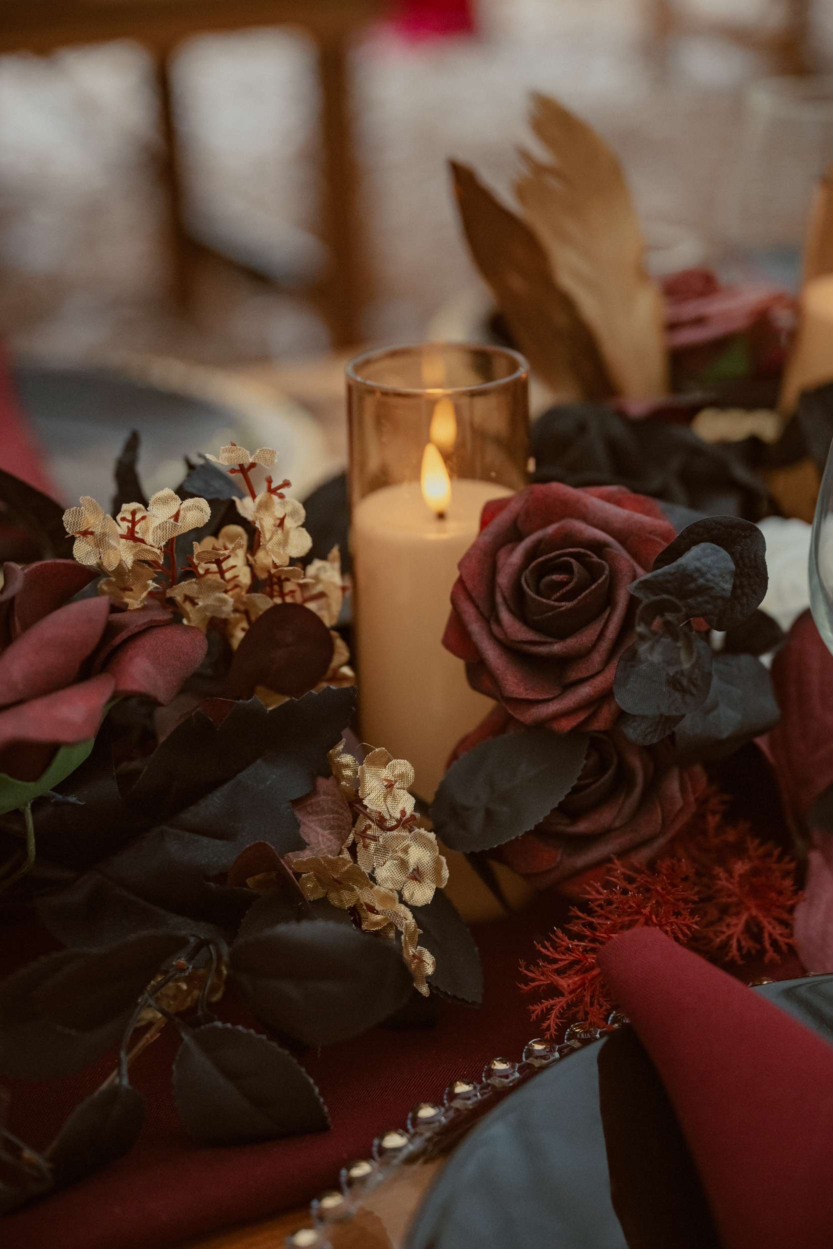 Their wedding theme was called The Contract. It drew from fairytale lore where deals with the fae are sealed through ritual, feasts and promises. The groom wrote the ceremony using his experience with LARP and immersive theatre. It imagined two fae courts meeting in a formal pact. Nox’s side represented the Unseelie Court, the darker fae. Fabienne’s side stood for the Seelie Court, the light. Rather than splitting the wedding party along gender lines, they chose their closest people and divided them between the two houses.