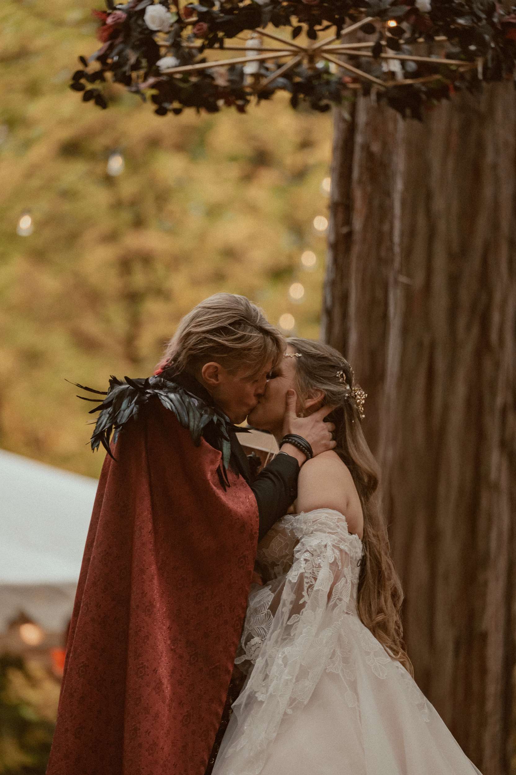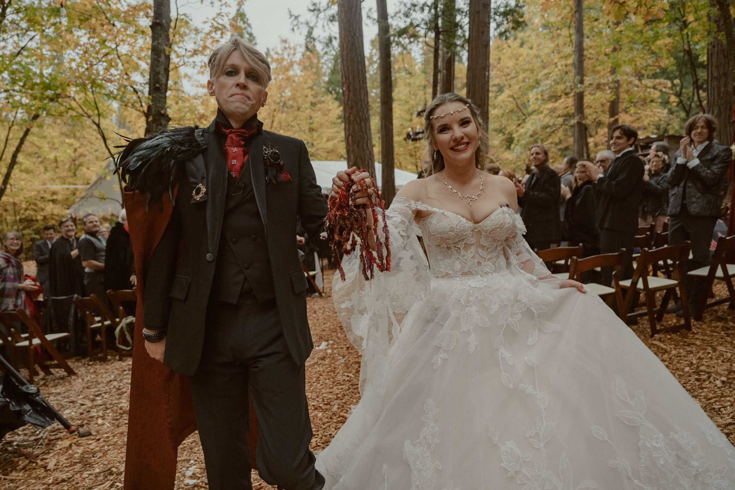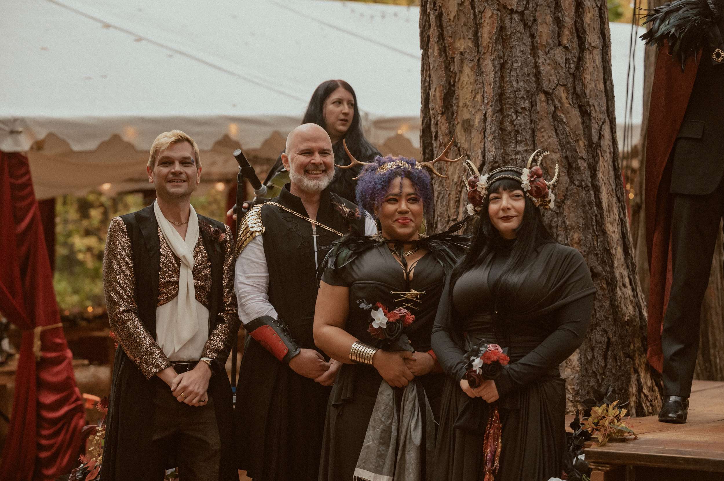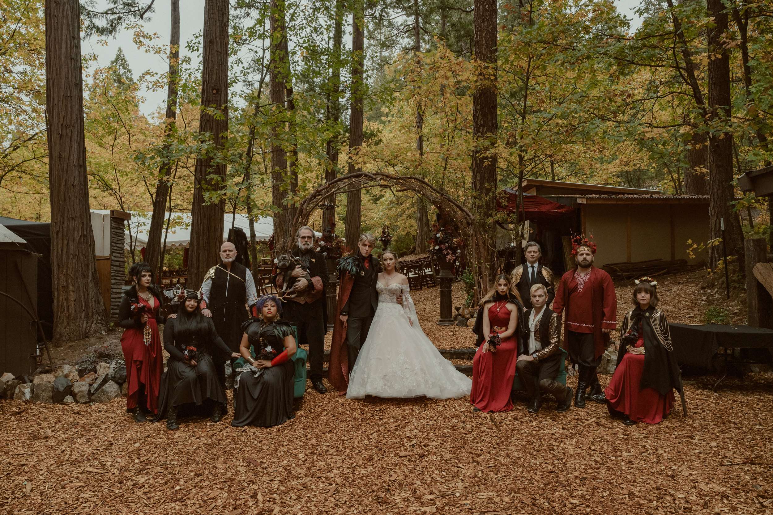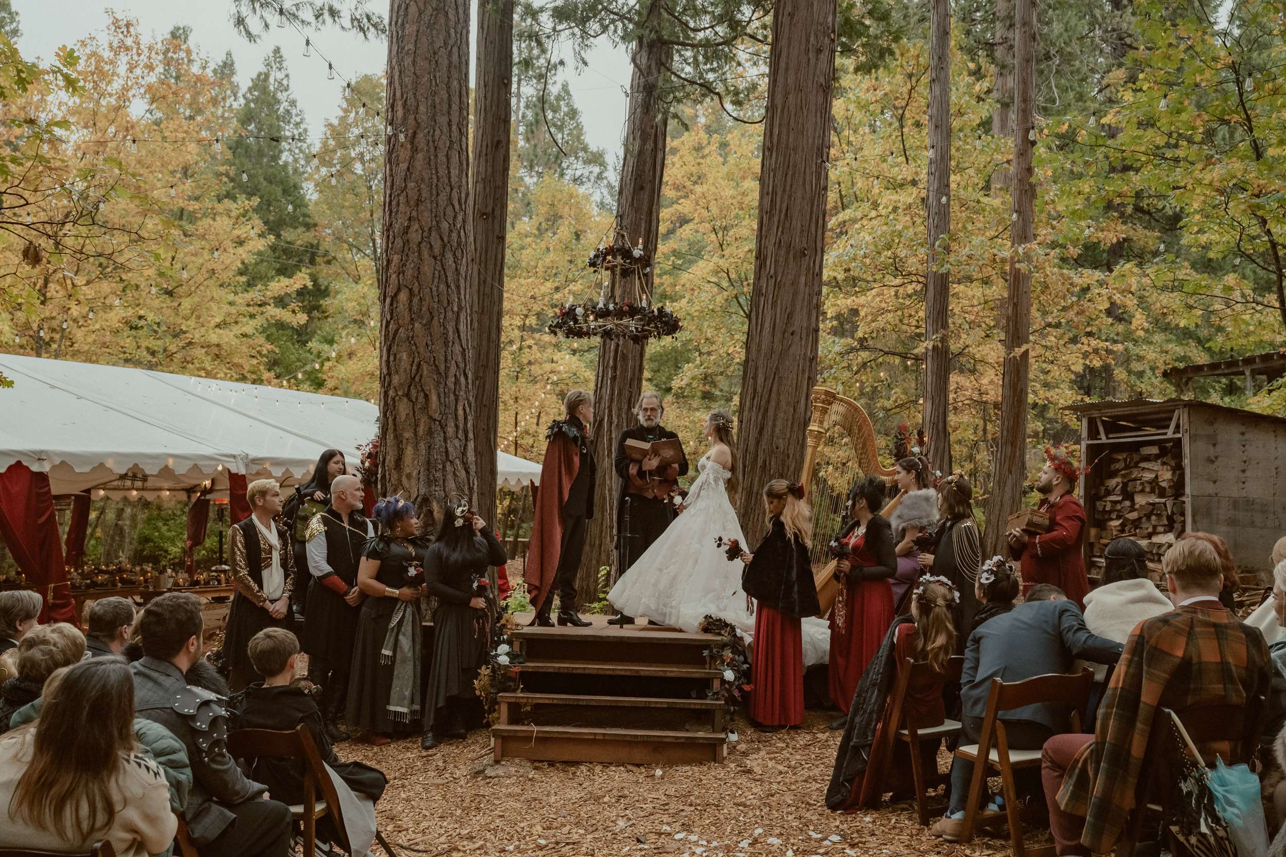 Fabienne and Nox, were married at their home in Arnold, a small mountain town in California. Their property sits among tall trees and was the setting for a wedding influenced by their shared life in fantasy worlds. Both are involved in live action role play, its also how they met, and both work behind the scenes in Hollywood. Storytelling is part of how they live and work, so their wedding followed the same path.
