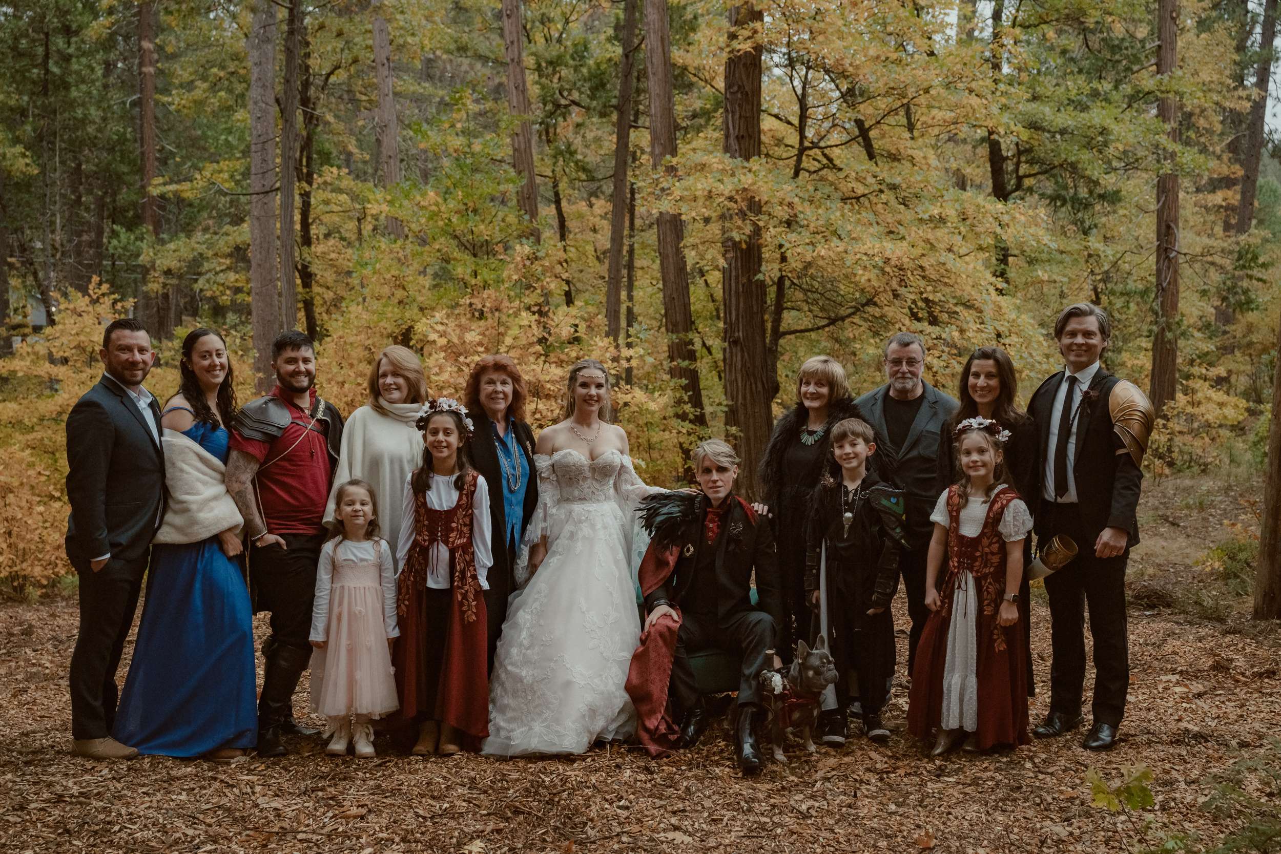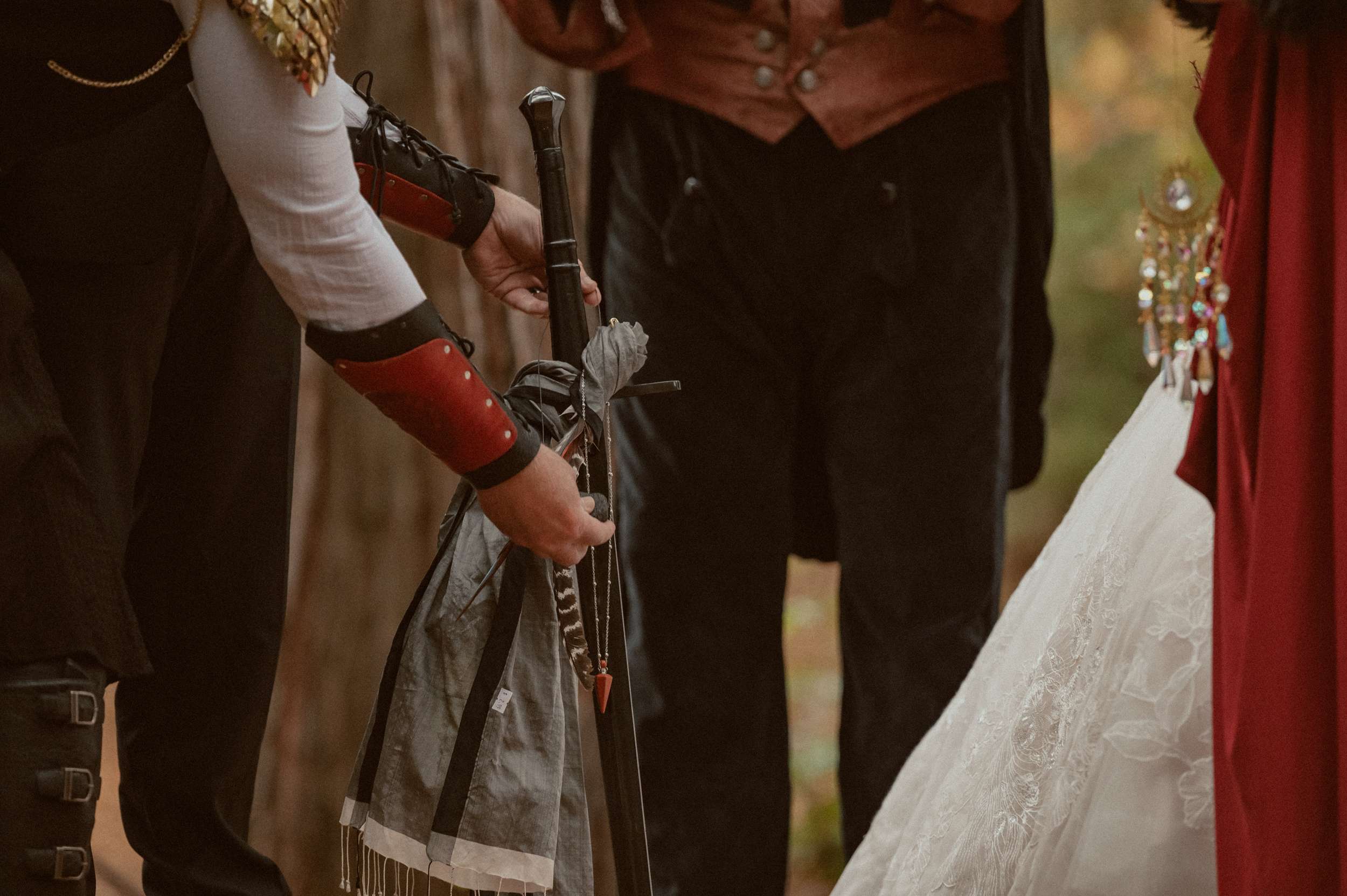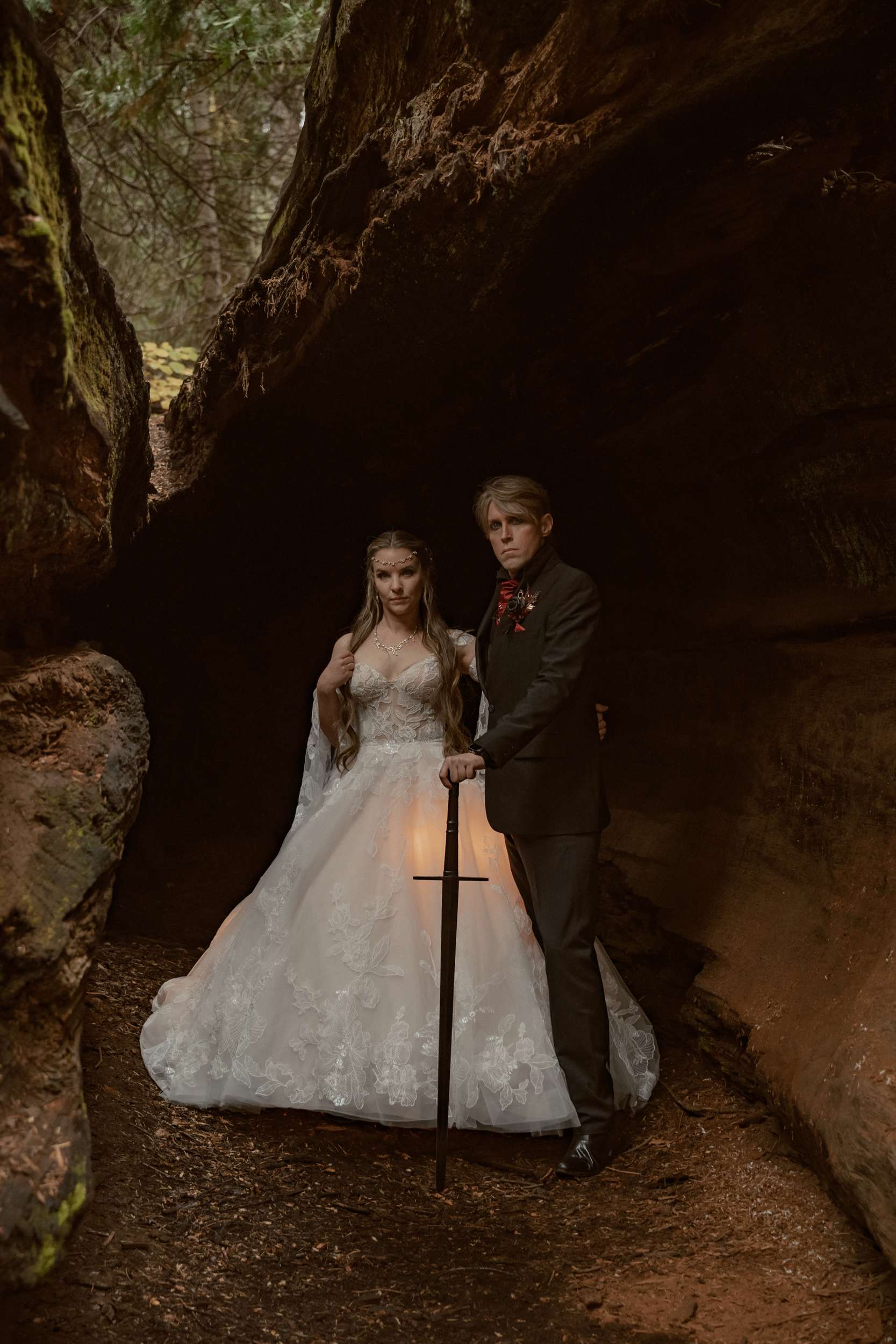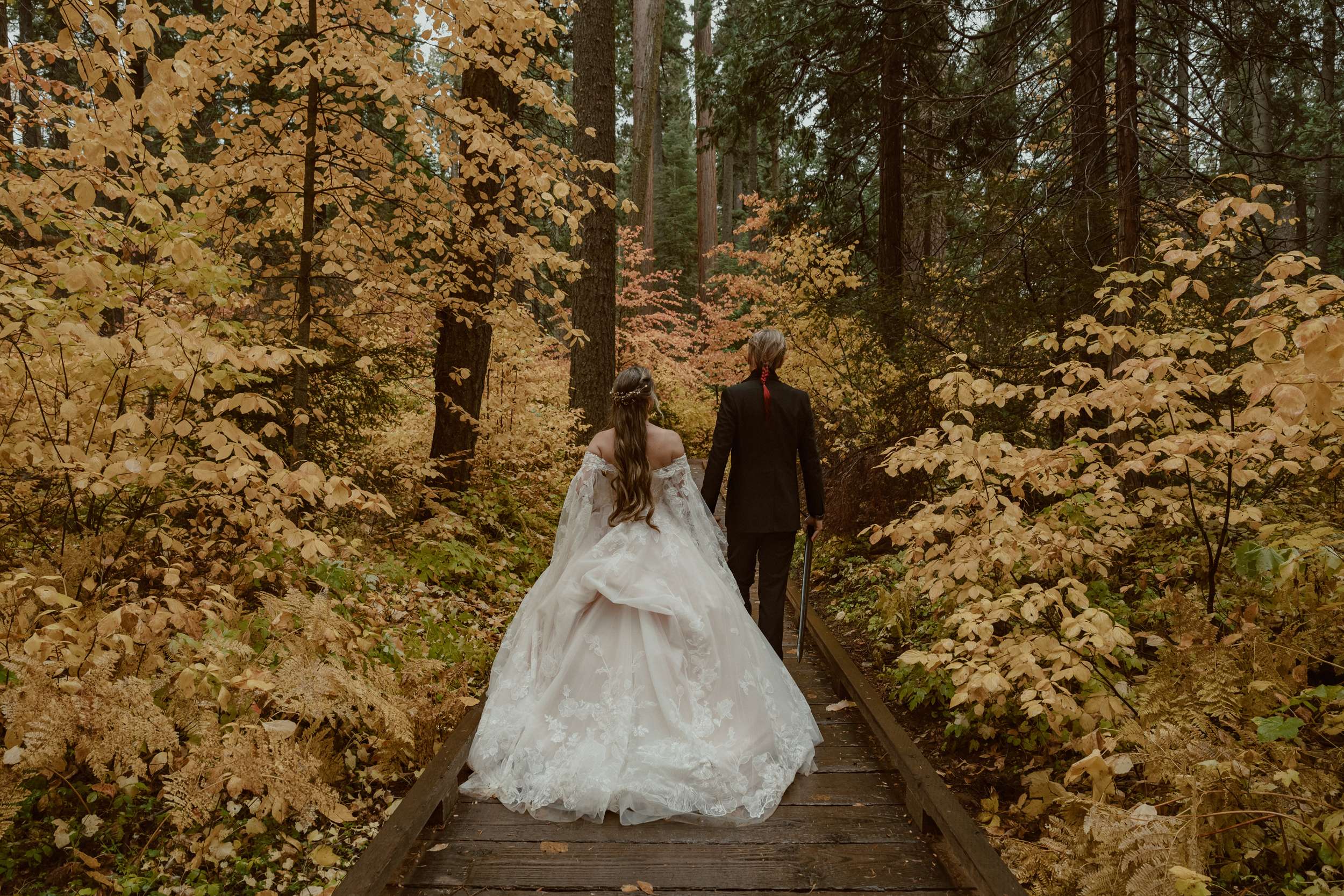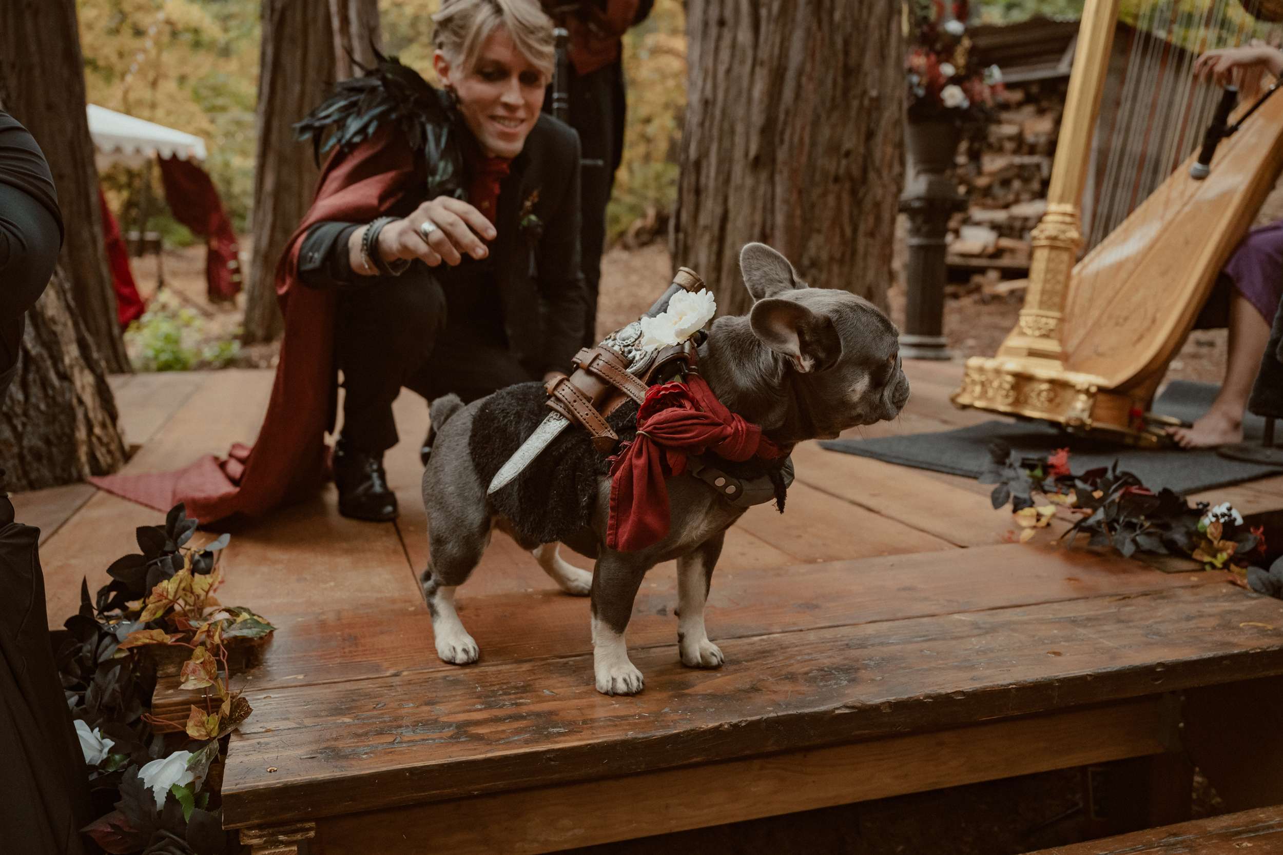 Fabienne and Nox, were married at their home in Arnold, a small mountain town in California. Their property sits among tall trees and was the setting for a wedding influenced by their shared life in fantasy worlds. Both are involved in live action role play, its also how they met, and both work behind the scenes in Hollywood. Storytelling is part of how they live and work, so their wedding followed the same path.