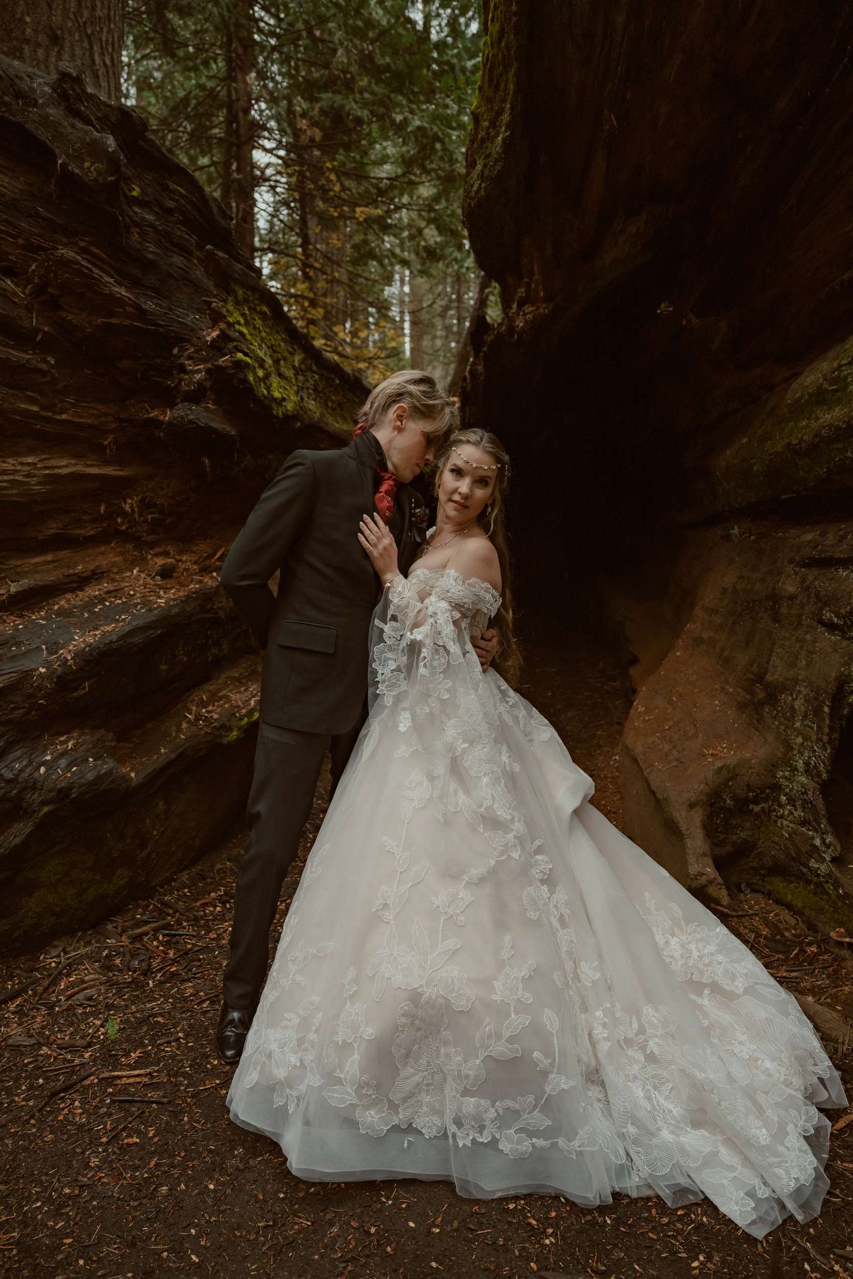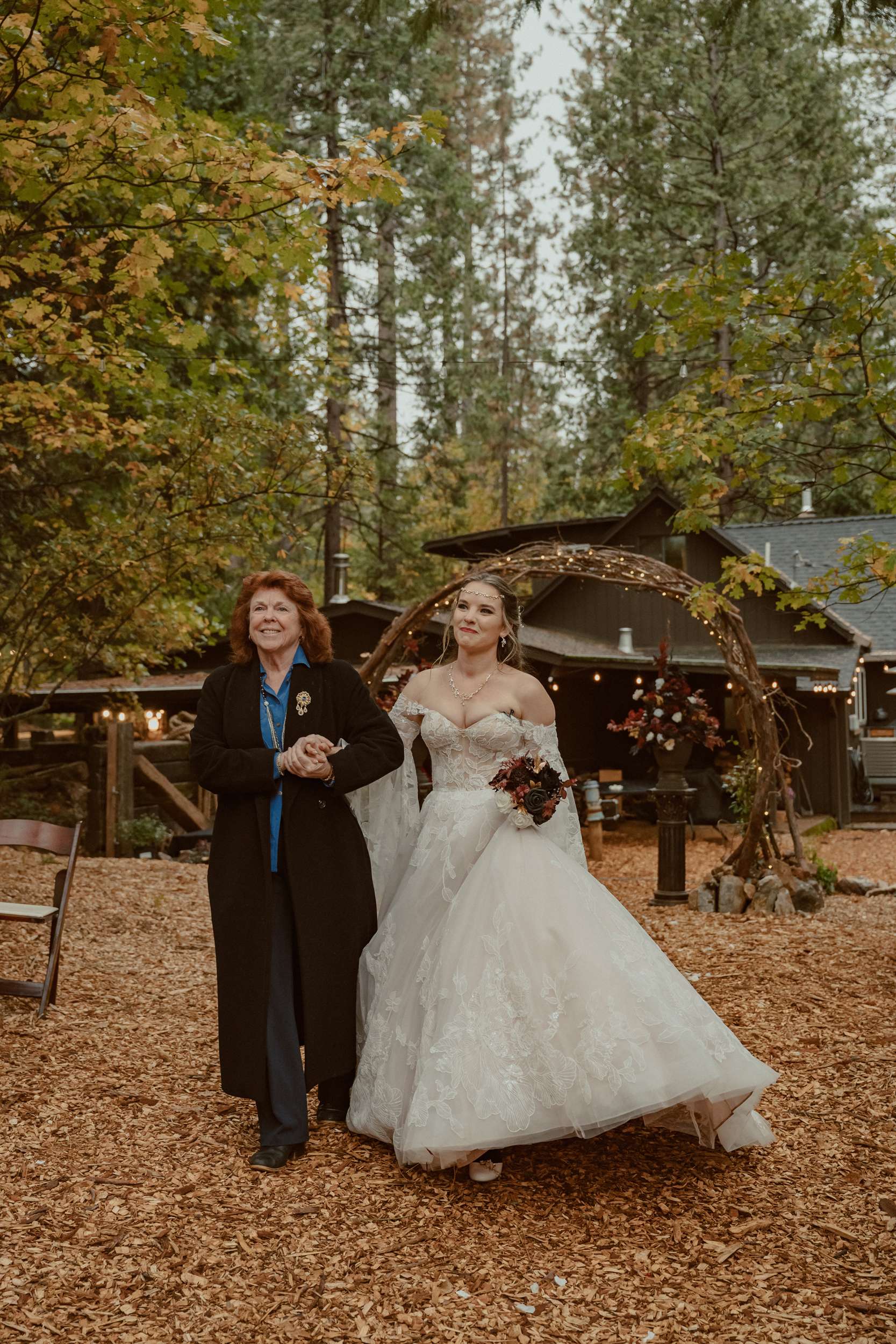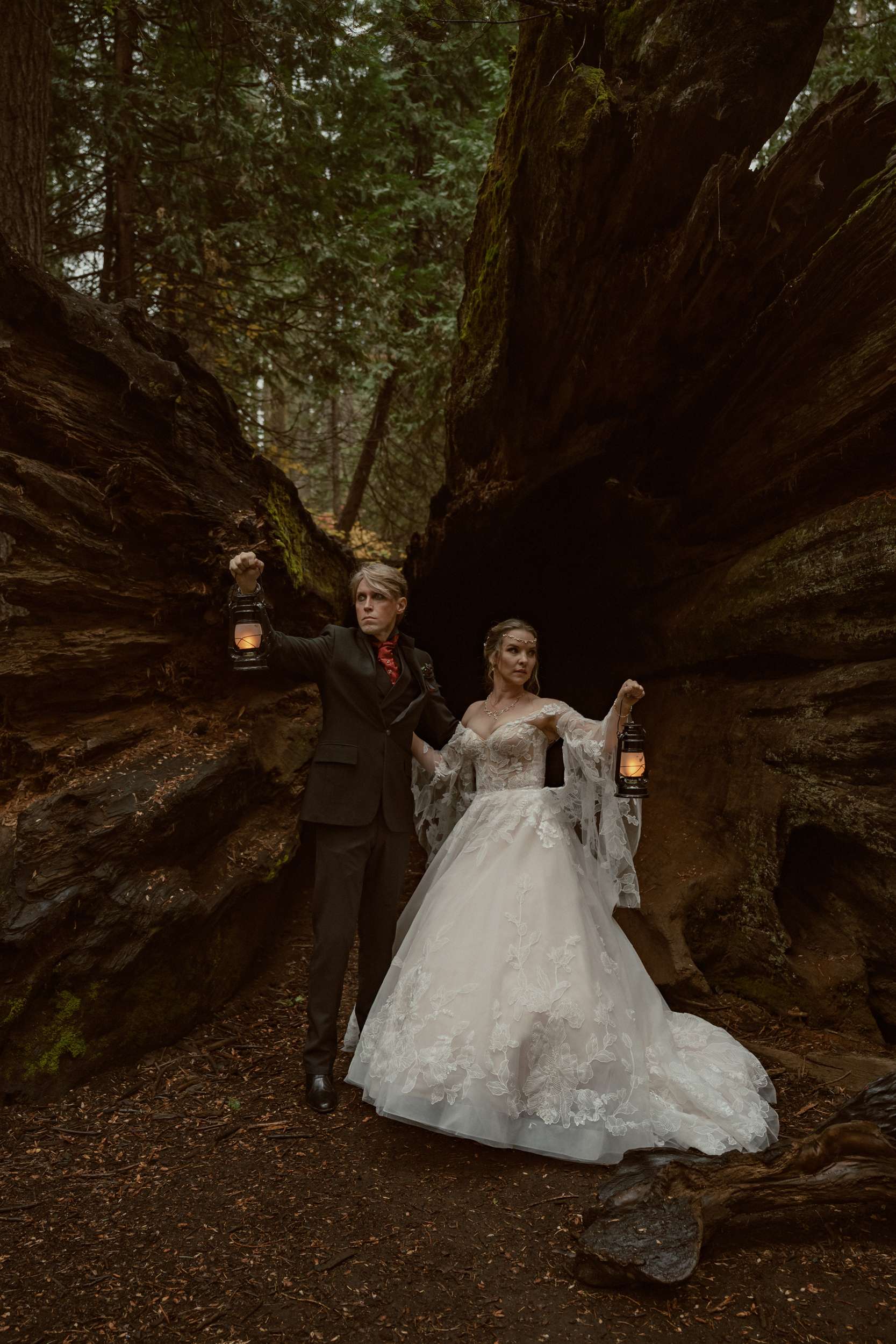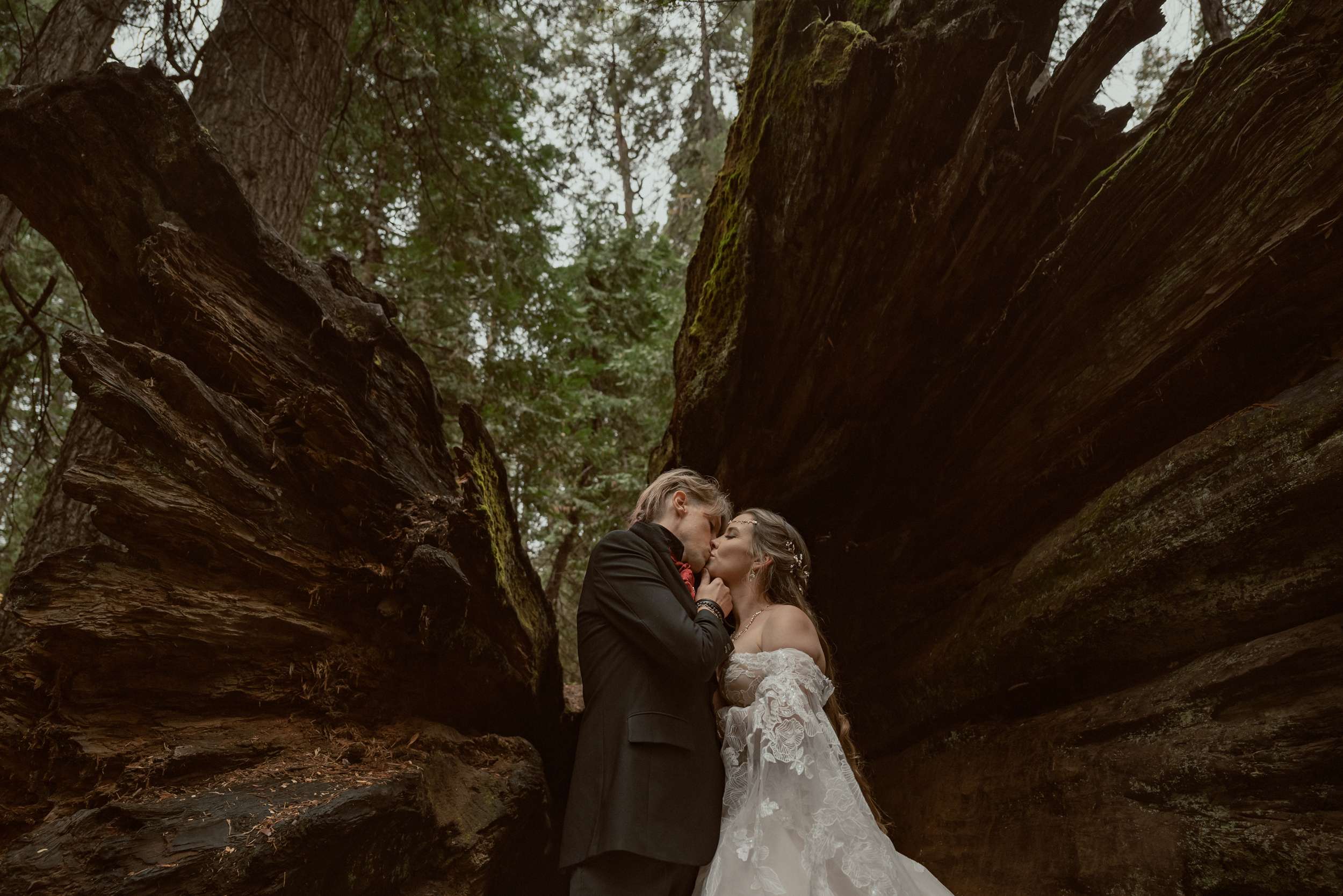 Fabienne and Nox, were married at their home in Arnold, a small mountain town in California. Their property sits among tall trees and was the setting for a wedding influenced by their shared life in fantasy worlds. Both are involved in live action role play, its also how they met, and both work behind the scenes in Hollywood. Storytelling is part of how they live and work, so their wedding followed the same path.
