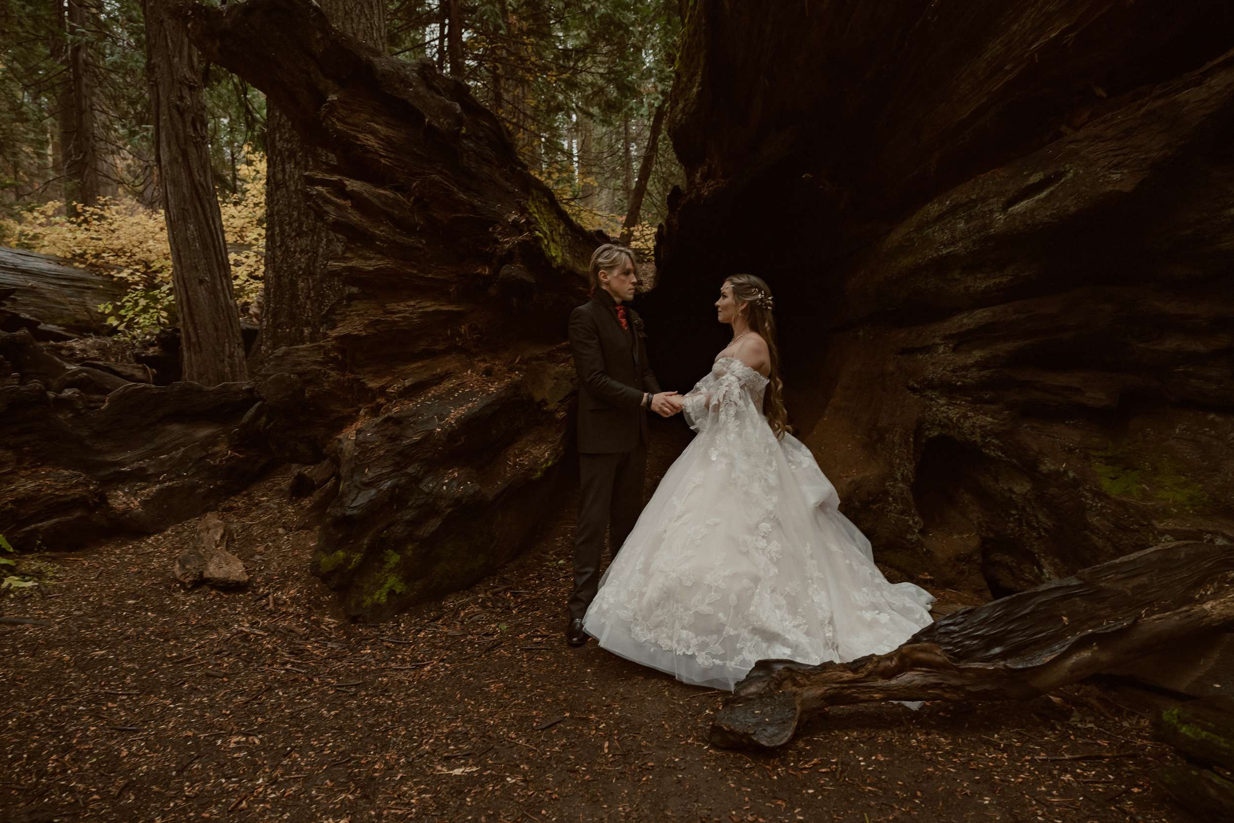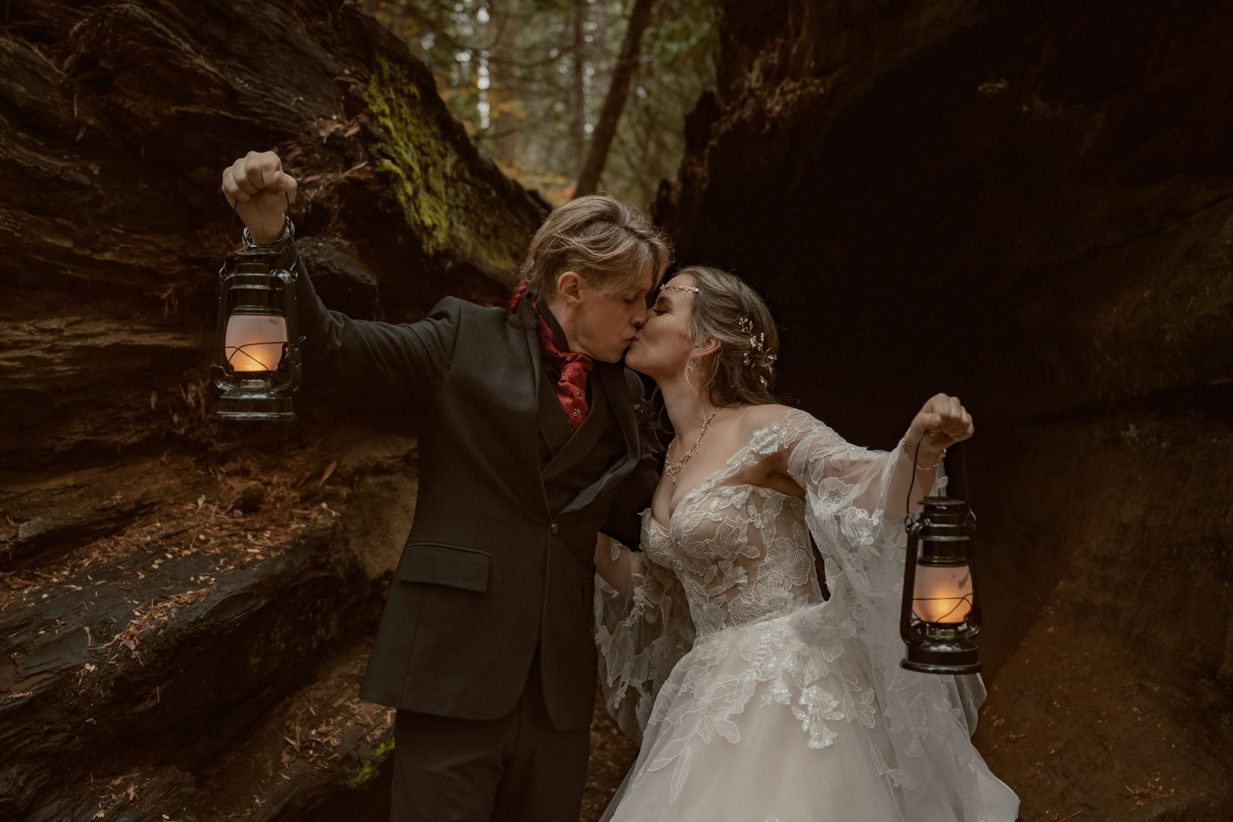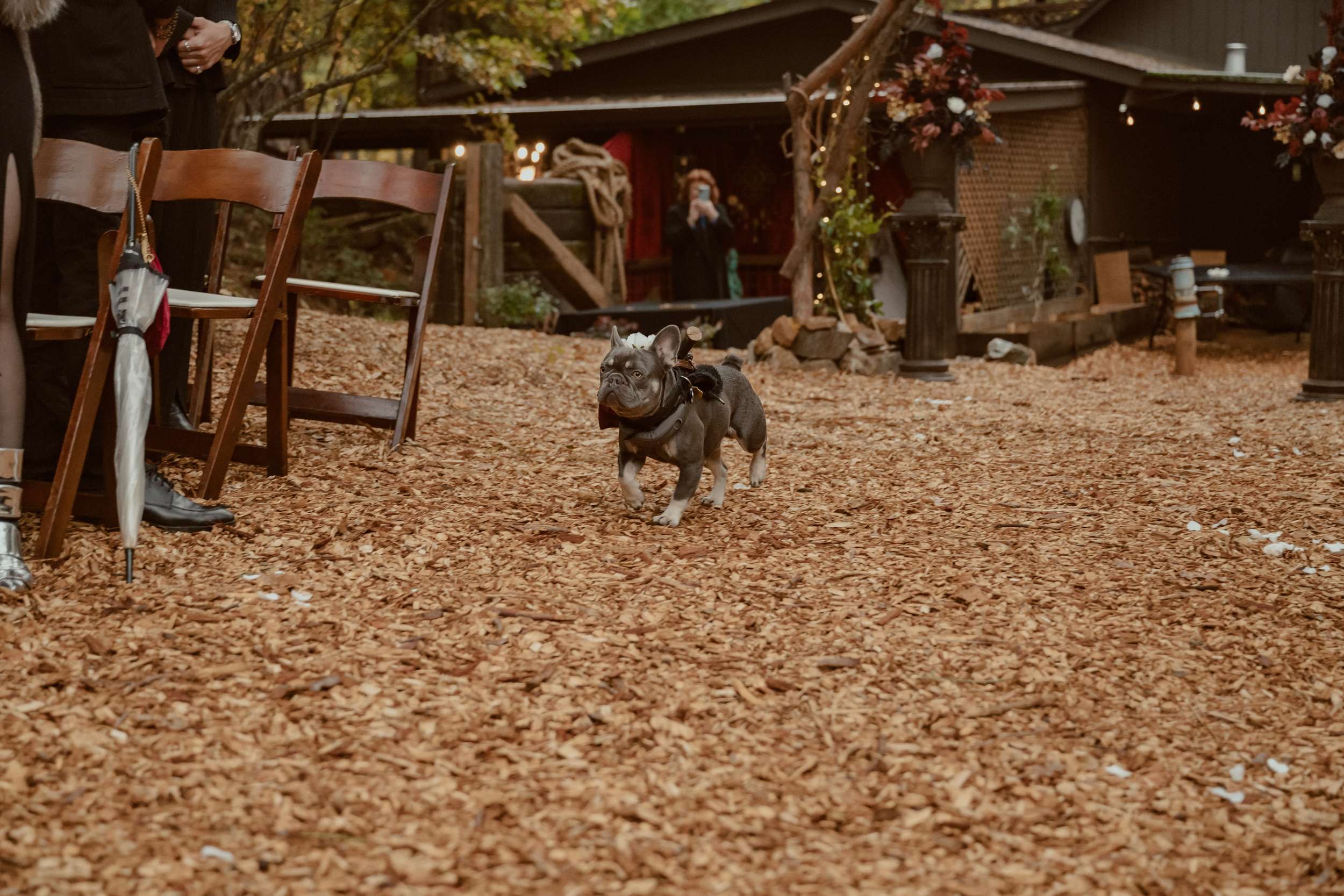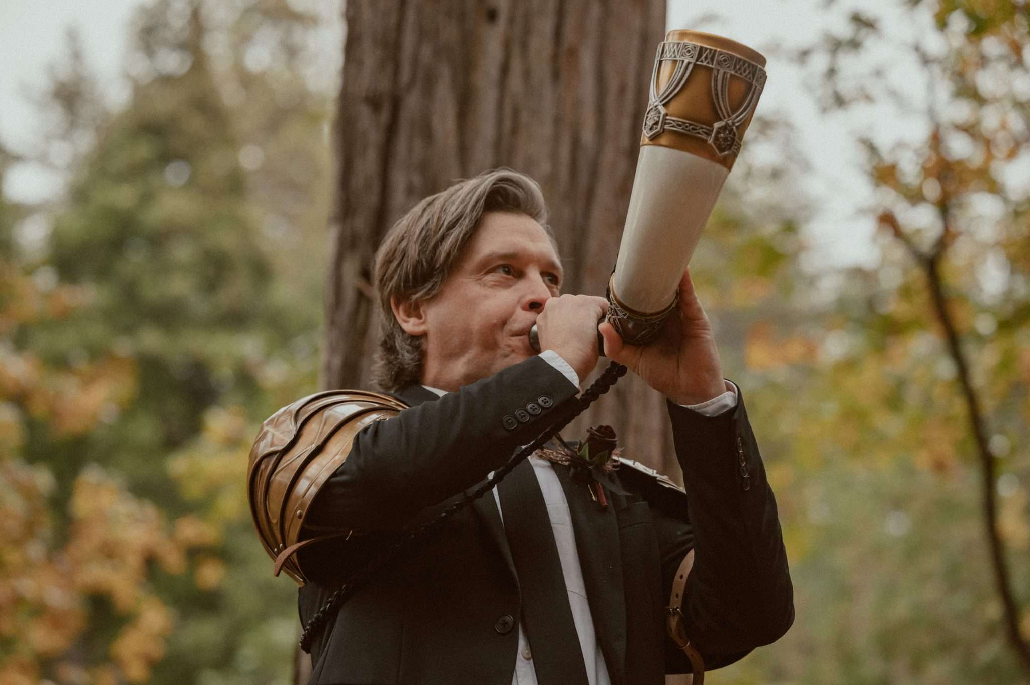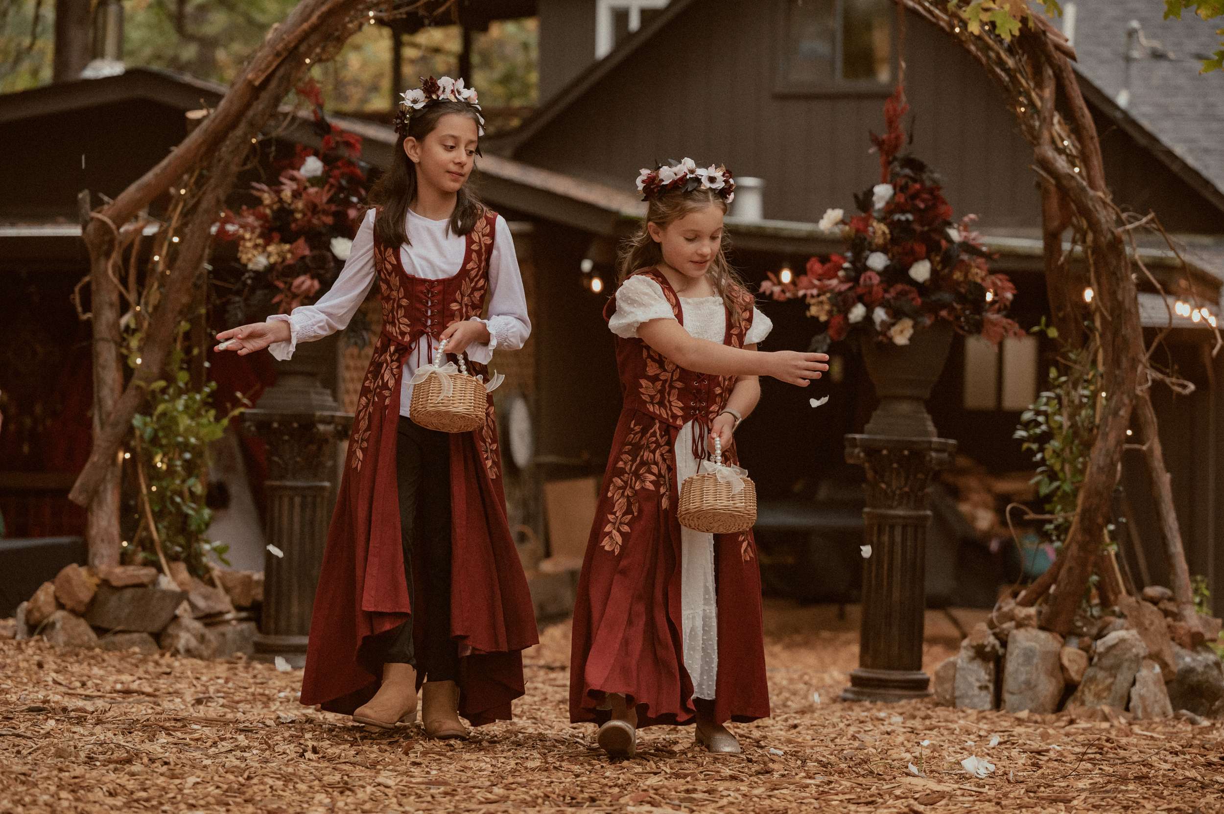 Fabienne and Nox, were married at their home in Arnold, a small mountain town in California. Their property sits among tall trees and was the setting for a wedding influenced by their shared life in fantasy worlds. Both are involved in live action role play, its also how they met, and both work behind the scenes in Hollywood. Storytelling is part of how they live and work, so their wedding followed the same path.