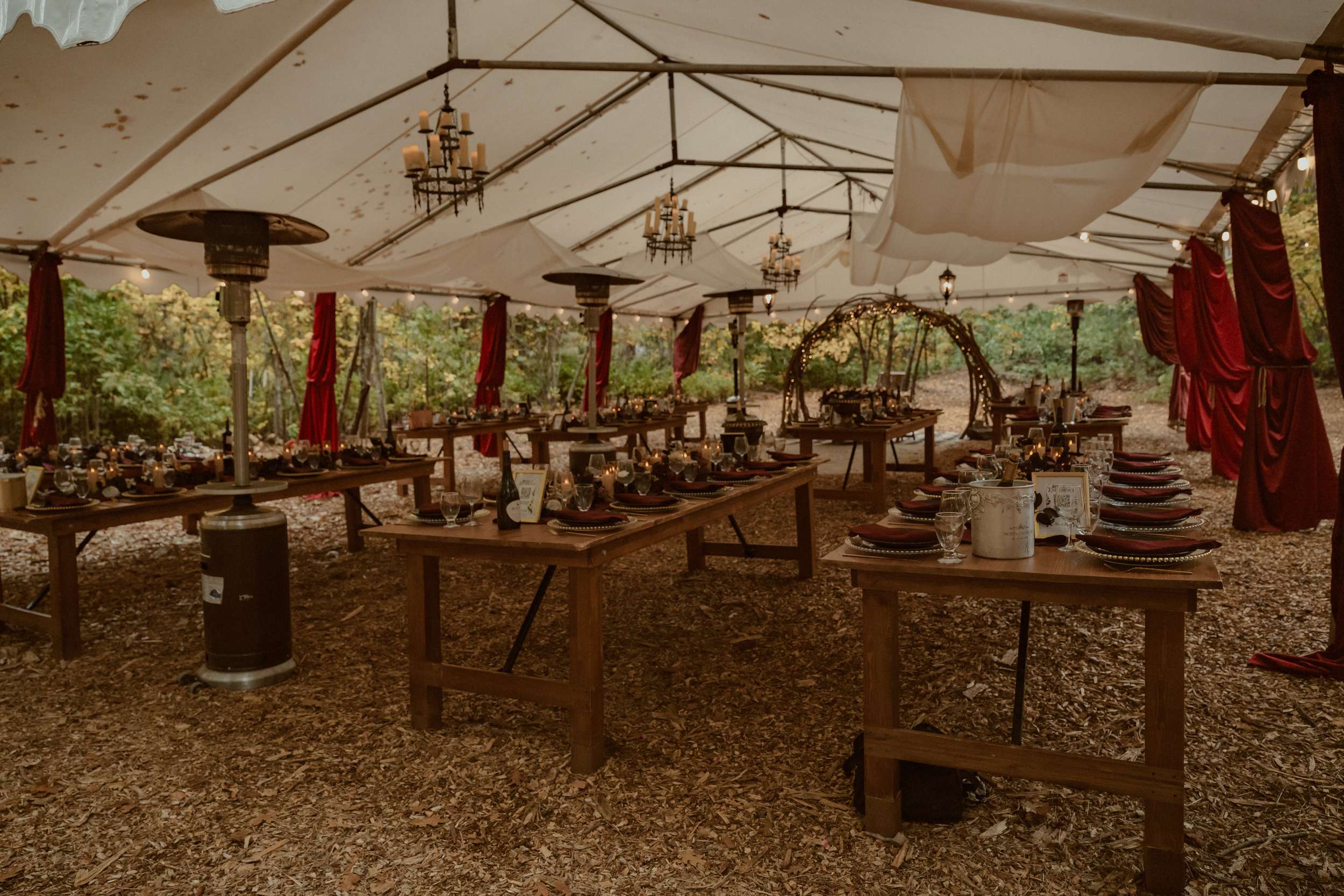 “While we technically saved money on not hiring a venue, we spent a great deal on making it functional”, they continued. “As we are on a septic system out here in the mountains, we trucked in some really nice trailer washrooms and needed tents, tables, chairs, dishware, bar, and sound setups. We had a lot of help from the mother of the bride and her friends on the sound front, and we certainly didn’t skimp on style when it came to the seating arrangements.”