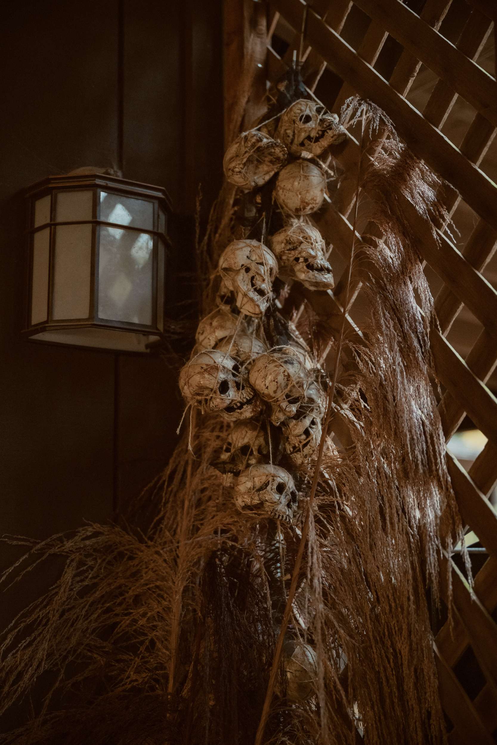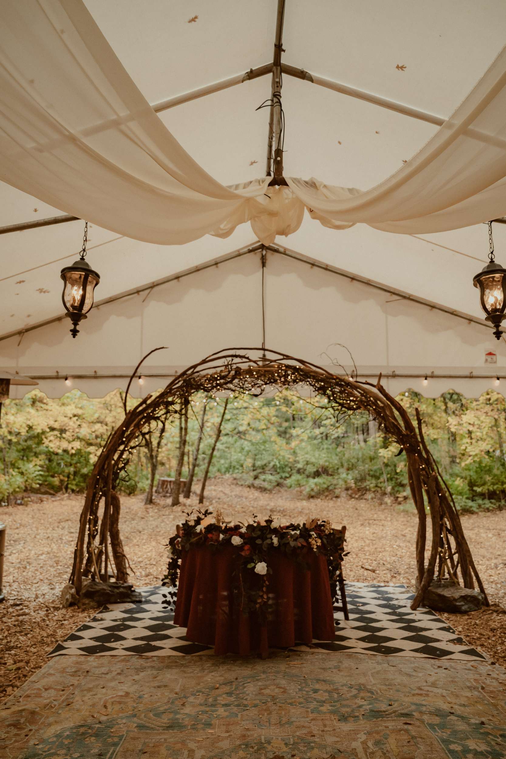 Nearly every element of the wedding was built by the couple and their friends. Due to their careers in film production and immersive events, they already owned a large collection of props and costumes. They transformed their property into their perfect wedding venue. They build the stage where they were married as well as two large moon gate arches. Their families arranged the flowers while a friend draped fabric across the venue and hung the lighting. The chandelier overhead was built by Nox and decorated with silk flowers.
