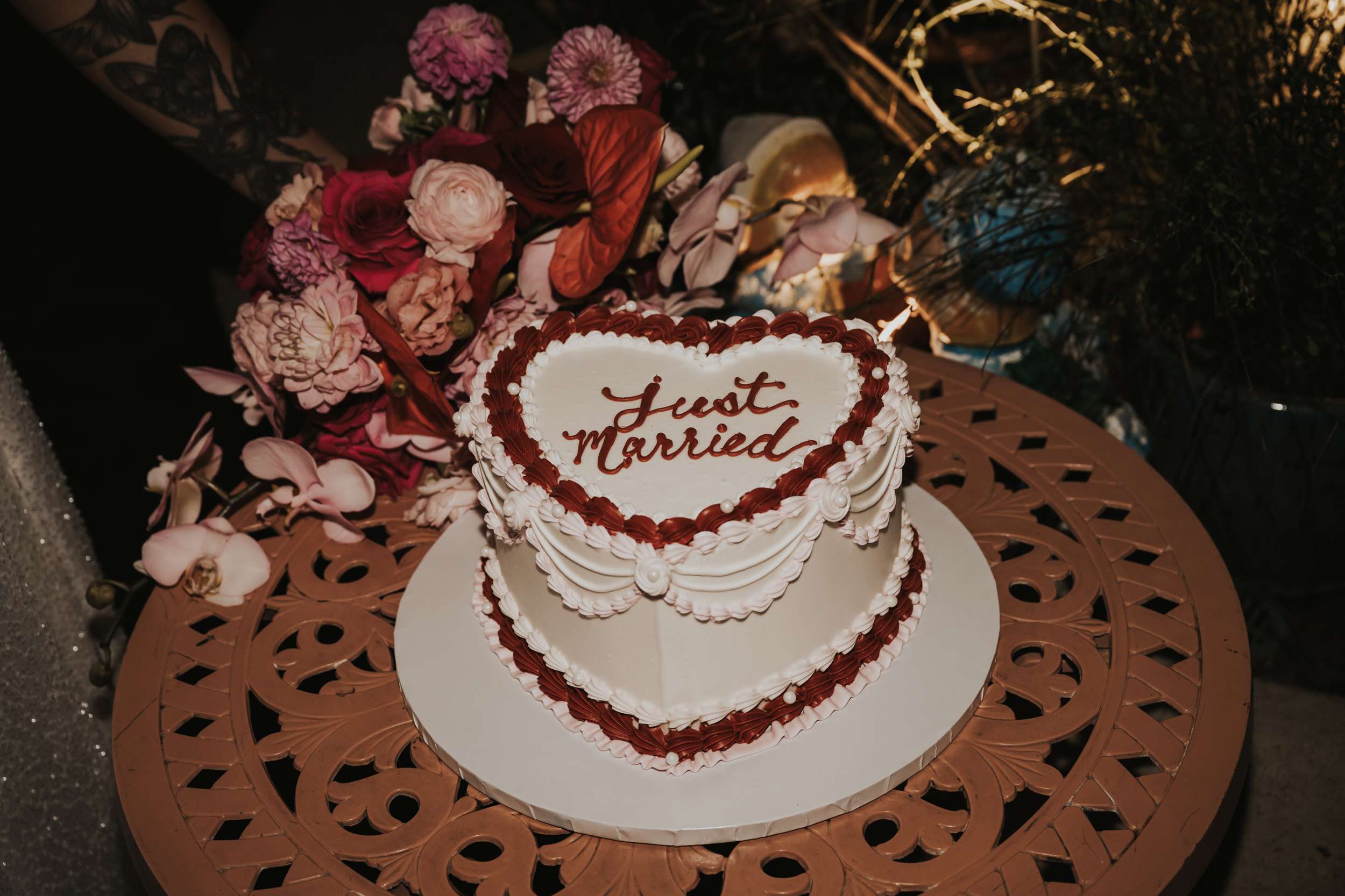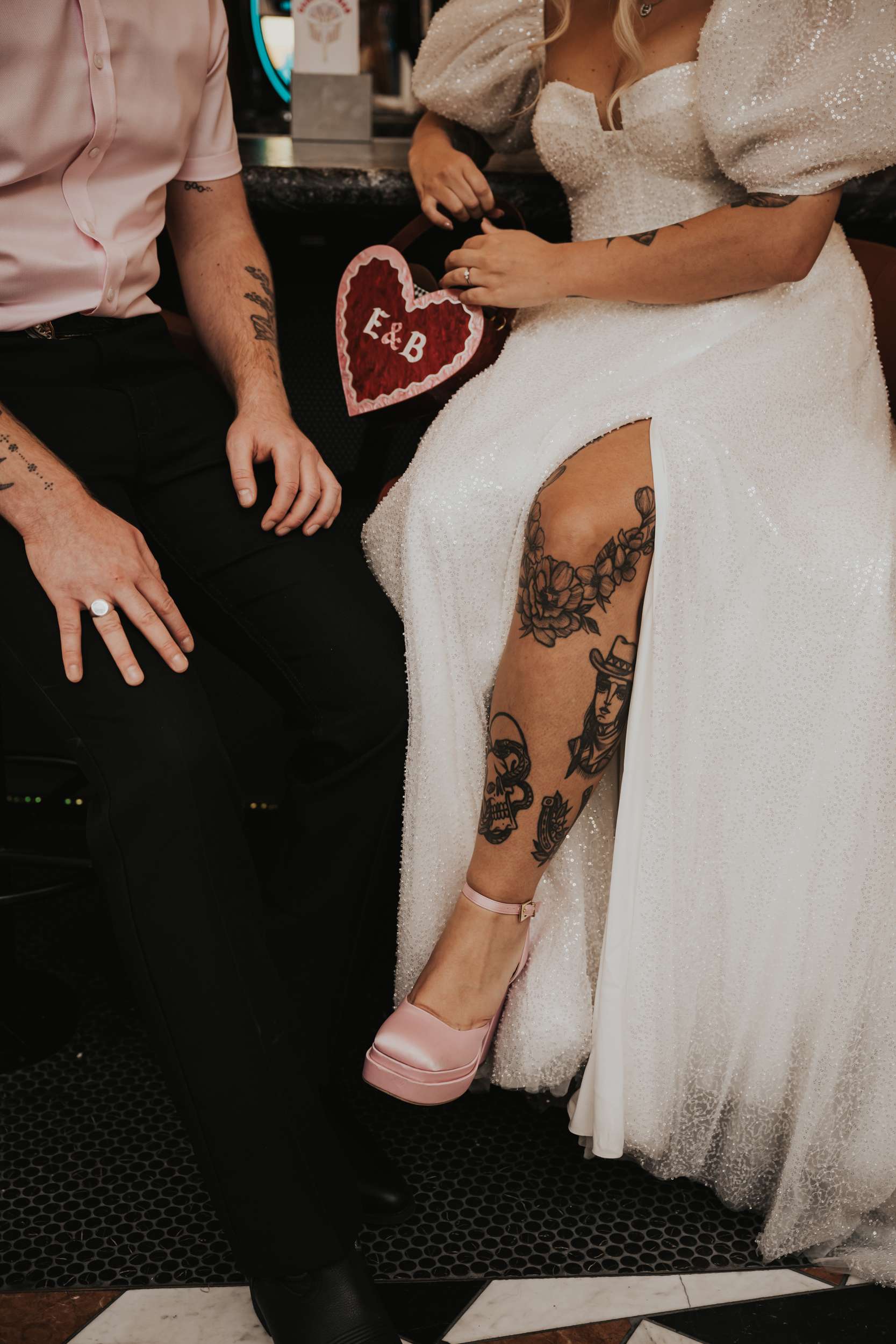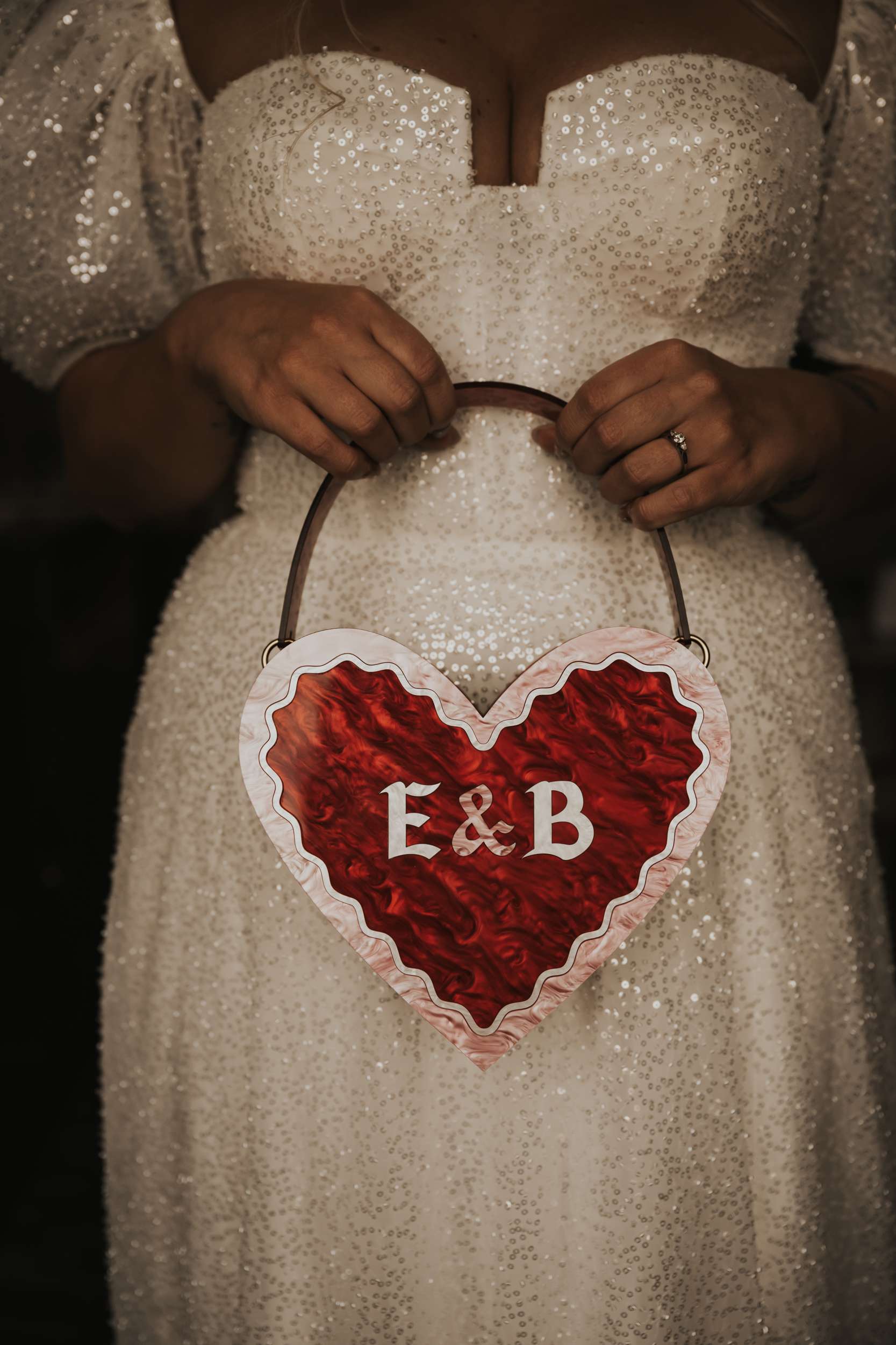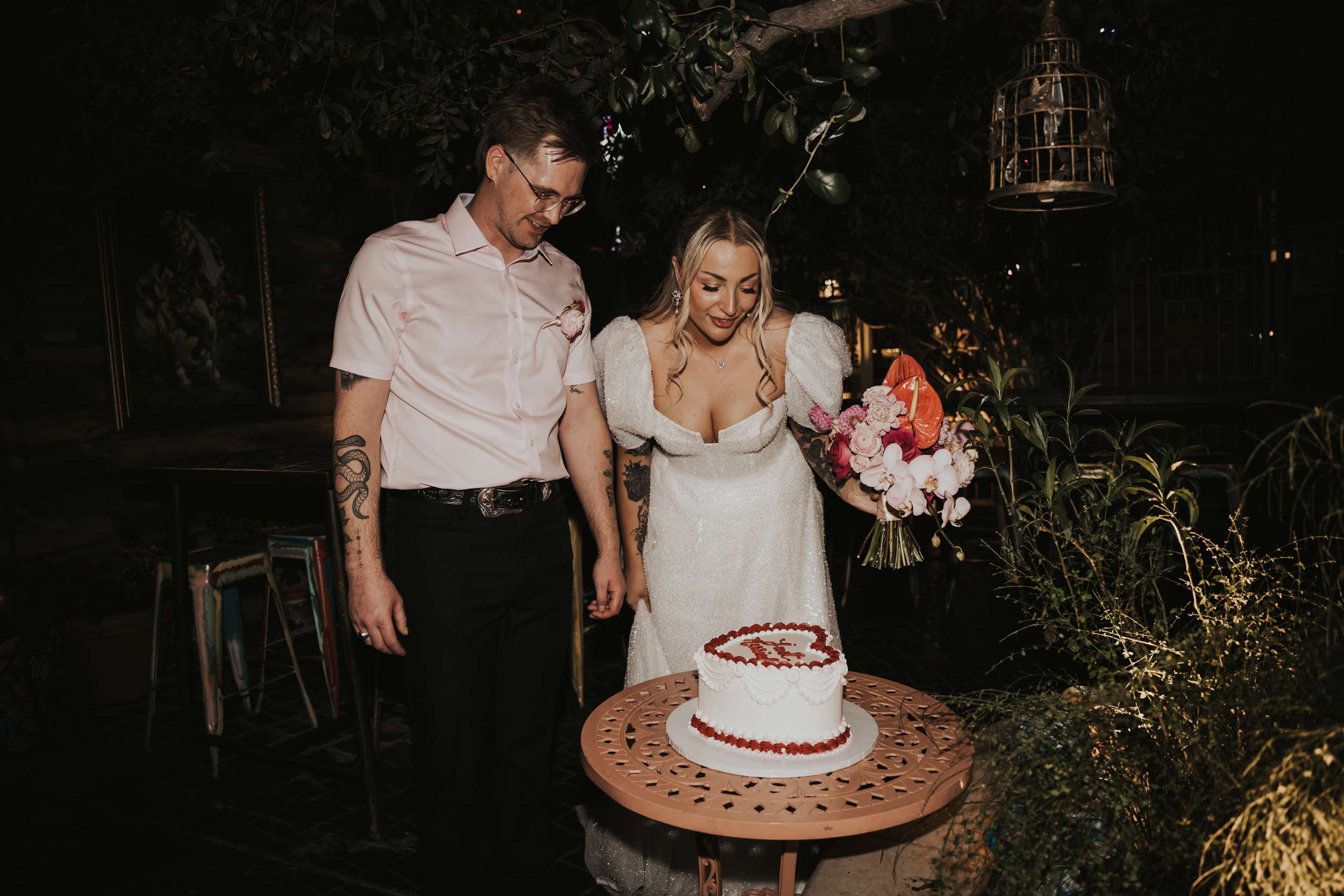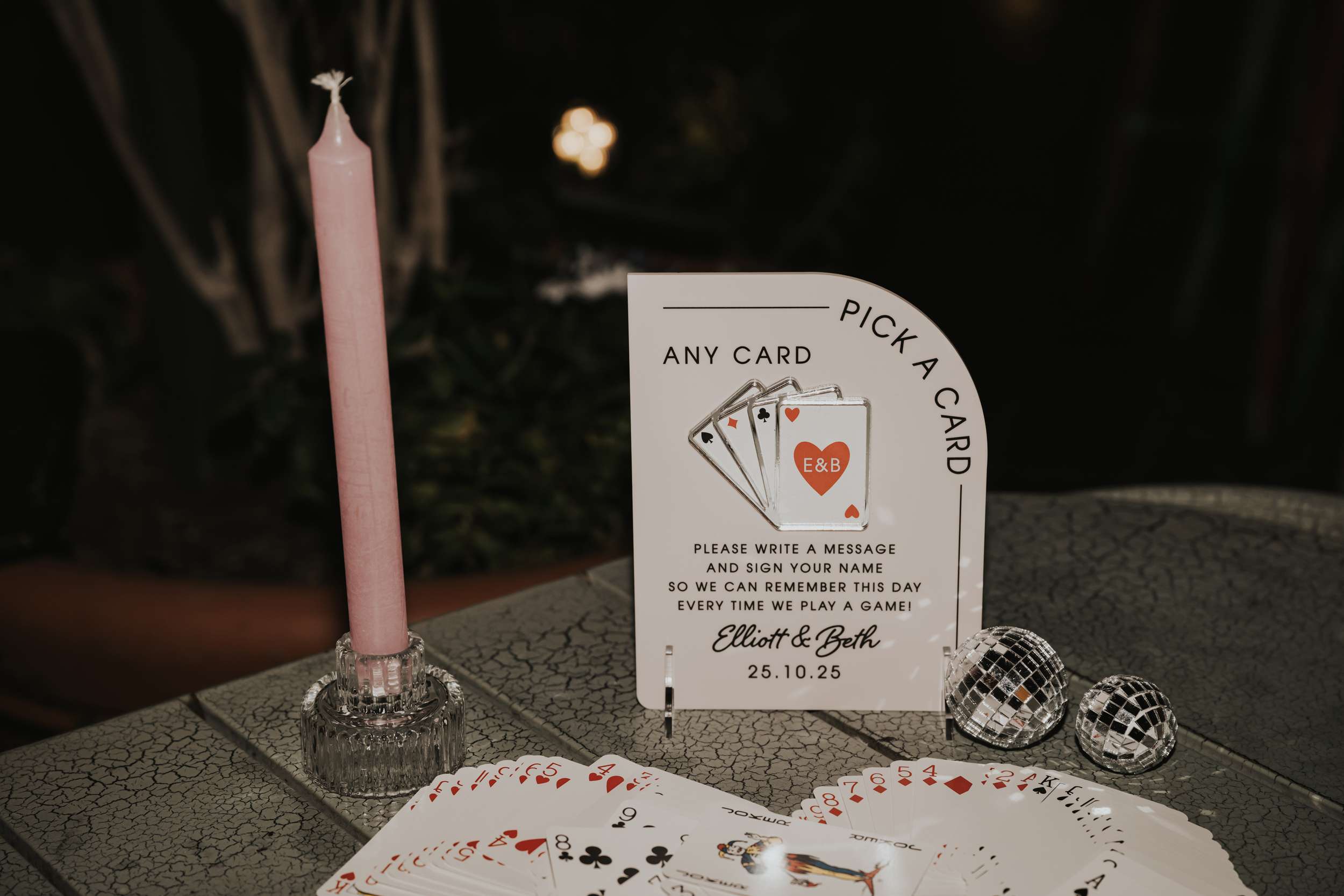 Guests then travelled to the reception on a hired party bus, keeping the party spirit going while giving Elliott and Beth a pocket of time together. They did some photos with their photographer, Jamie Y and then met back up with everyone later. They brought candles, candle holders, a few disco balls and a custom board with playing cards for guests to sign for the space. They also cut a retro themed heart cake and Beth changed into playing card themed cowboy boots!