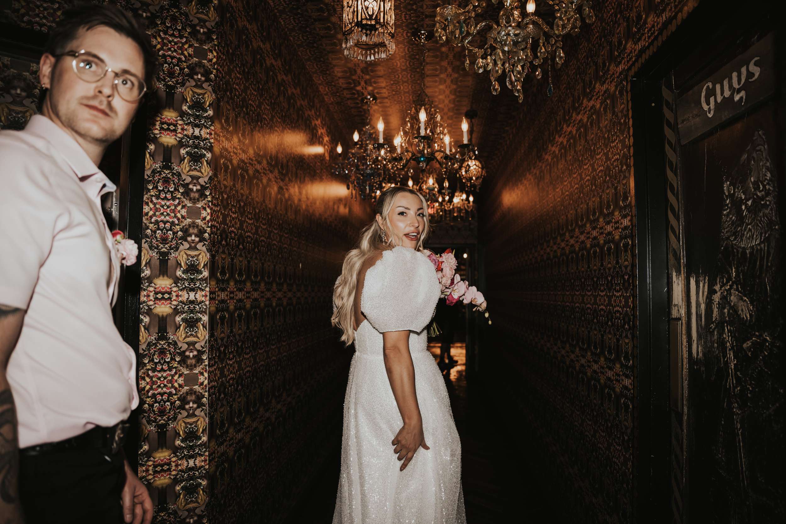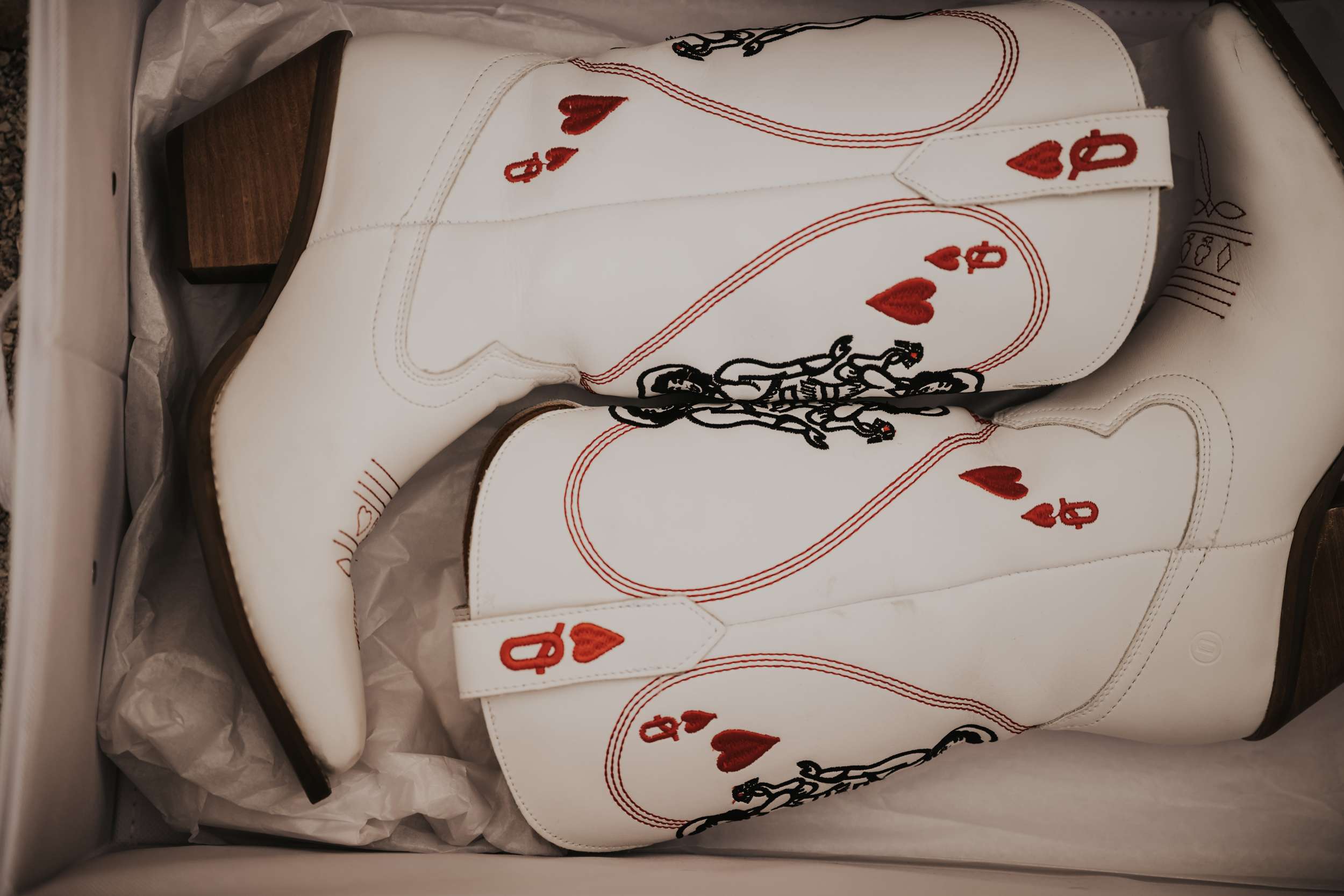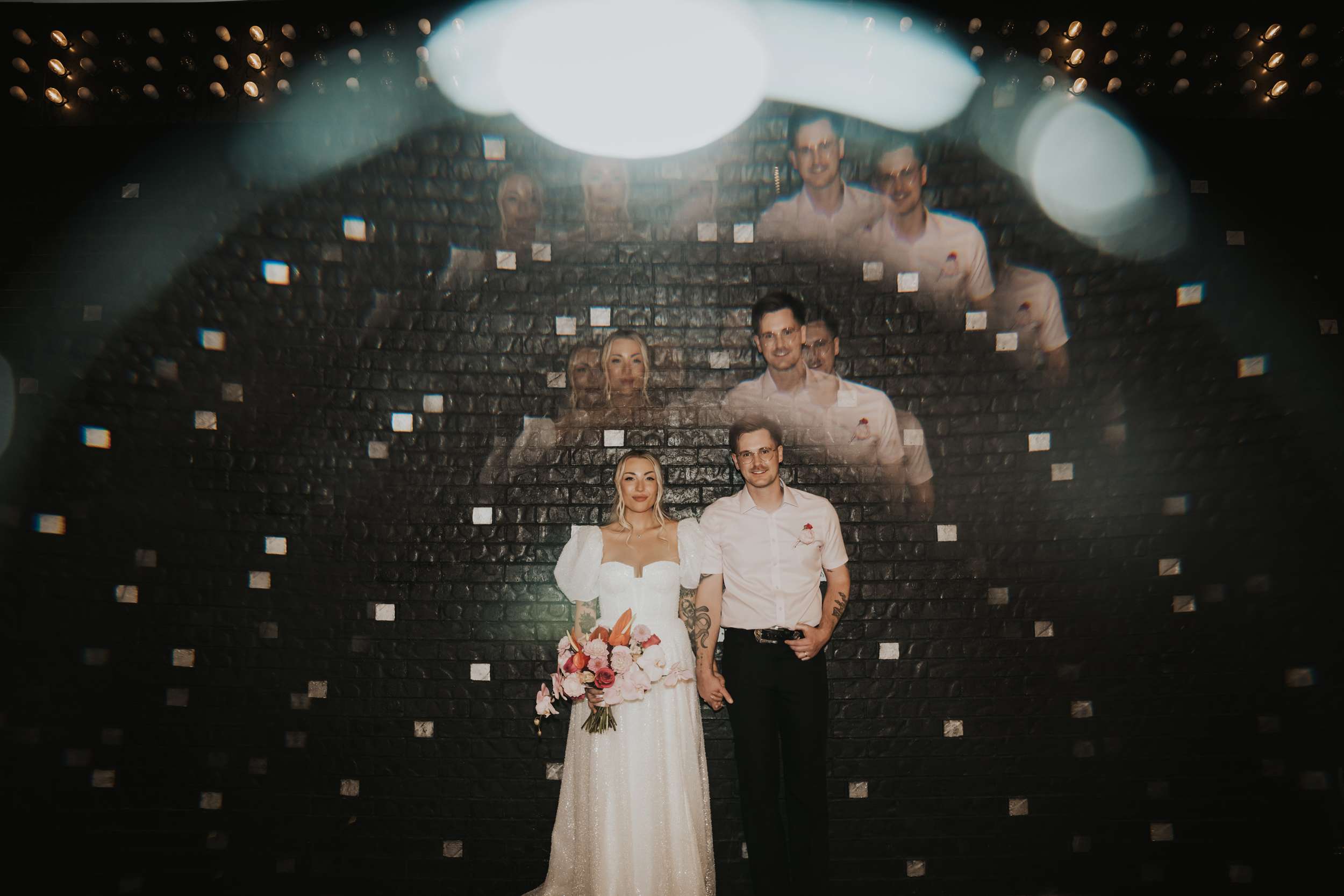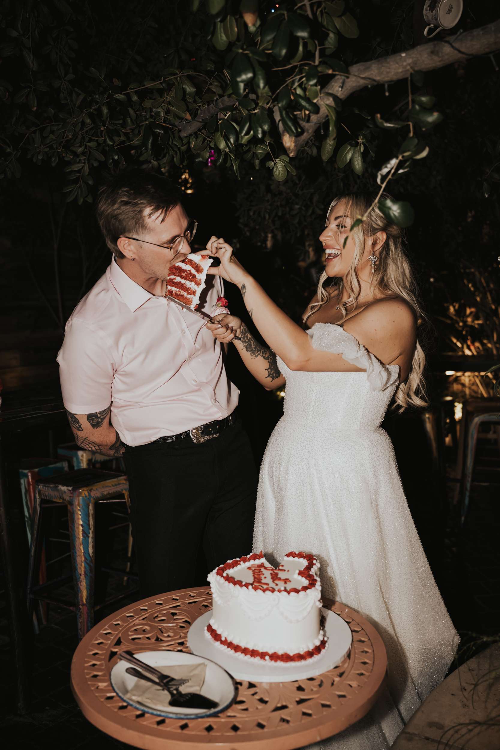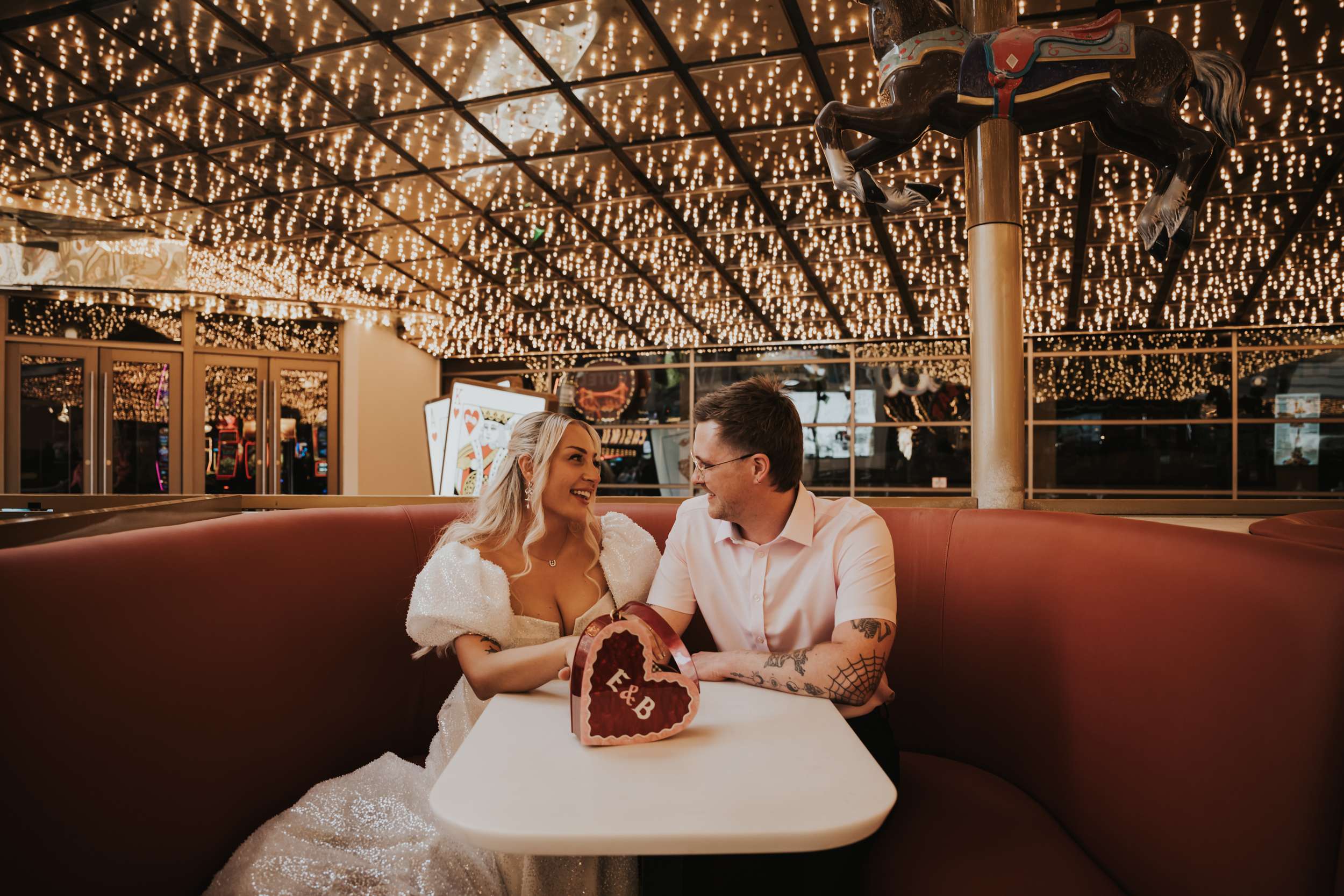 Guests then travelled to the reception on a hired party bus, keeping the party spirit going while giving Elliott and Beth a pocket of time together. They did some photos with their photographer, Jamie Y and then met back up with everyone later. They brought candles, candle holders, a few disco balls and a custom board with playing cards for guests to sign for the space. They also cut a retro themed heart cake and Beth changed into playing card themed cowboy boots!
