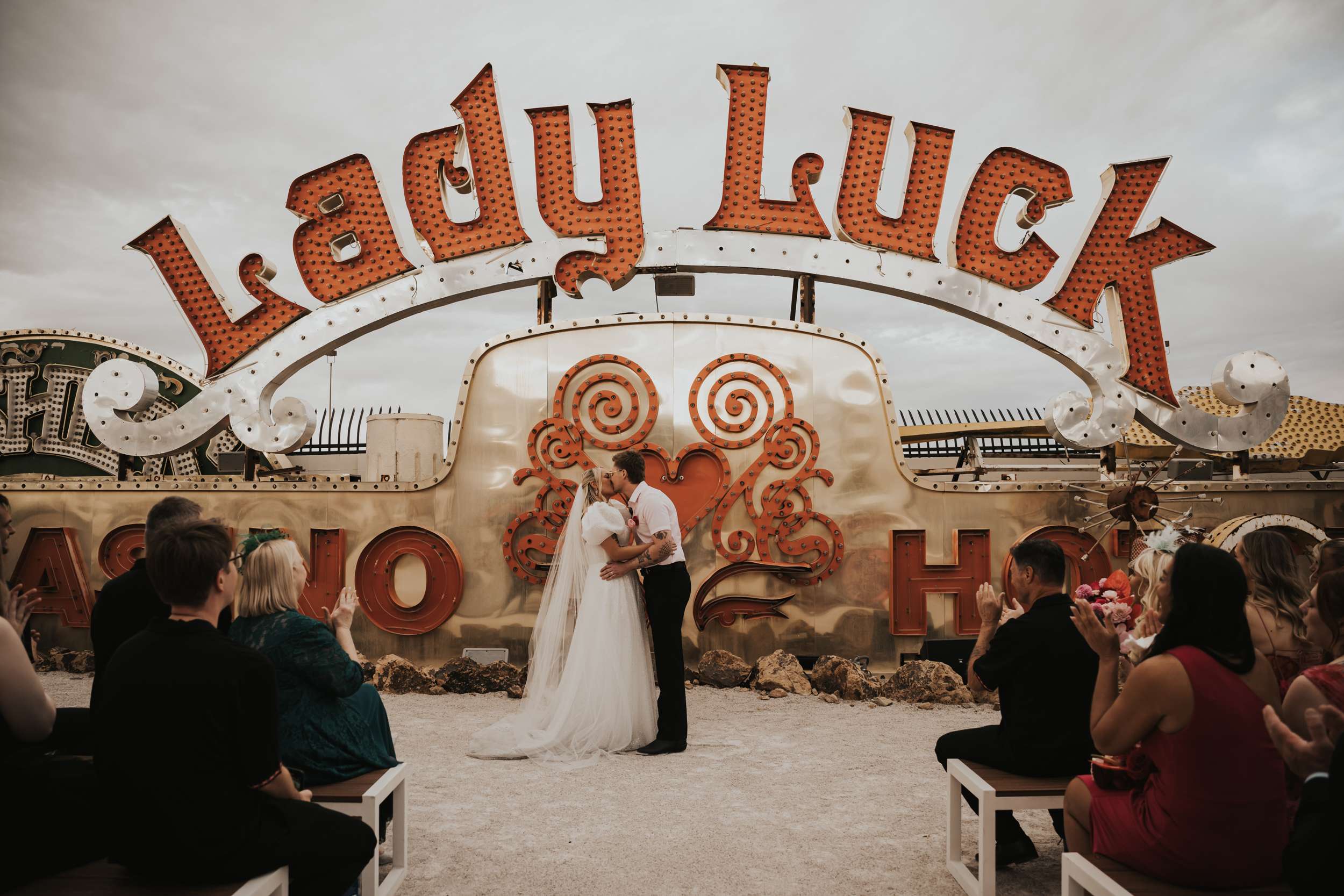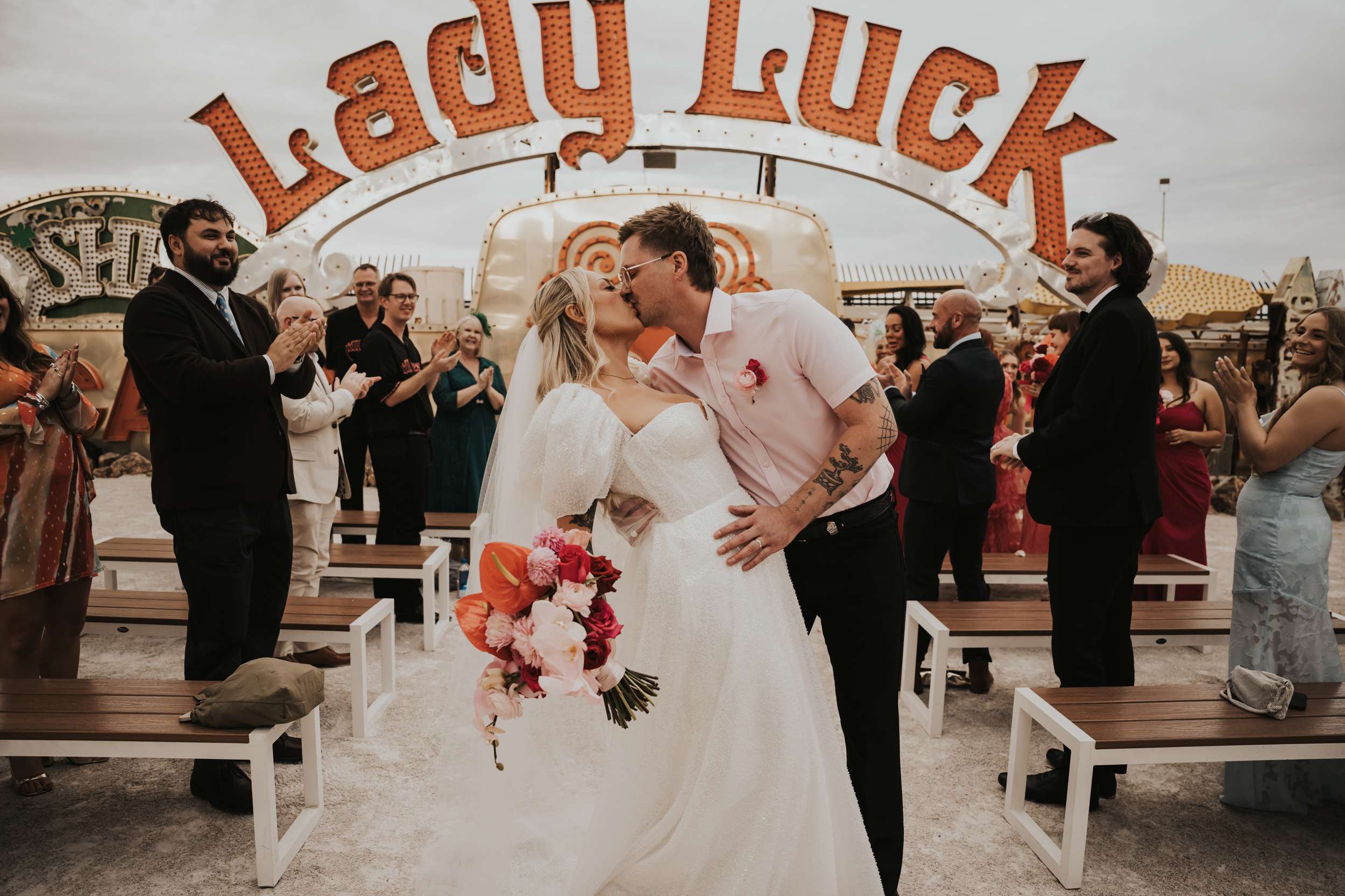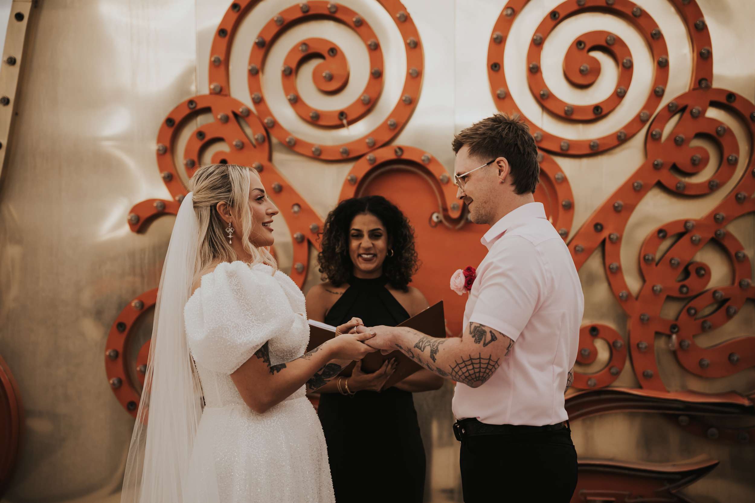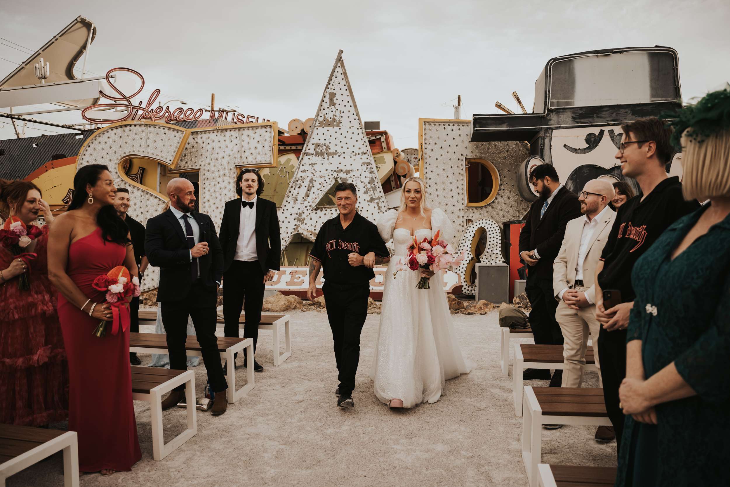 The ceremony, held at the Neon Museum, began with guests being seated to Happily Ever After from the Disney World Magic Kingdom fireworks show. “We are huge Disney people so that was so lovely to hear and share.” Beth then walked down the aisle to Jamie T’s Bonnie & Clyde, a song that supported her through a life changing surgery in the early days of their relationship.